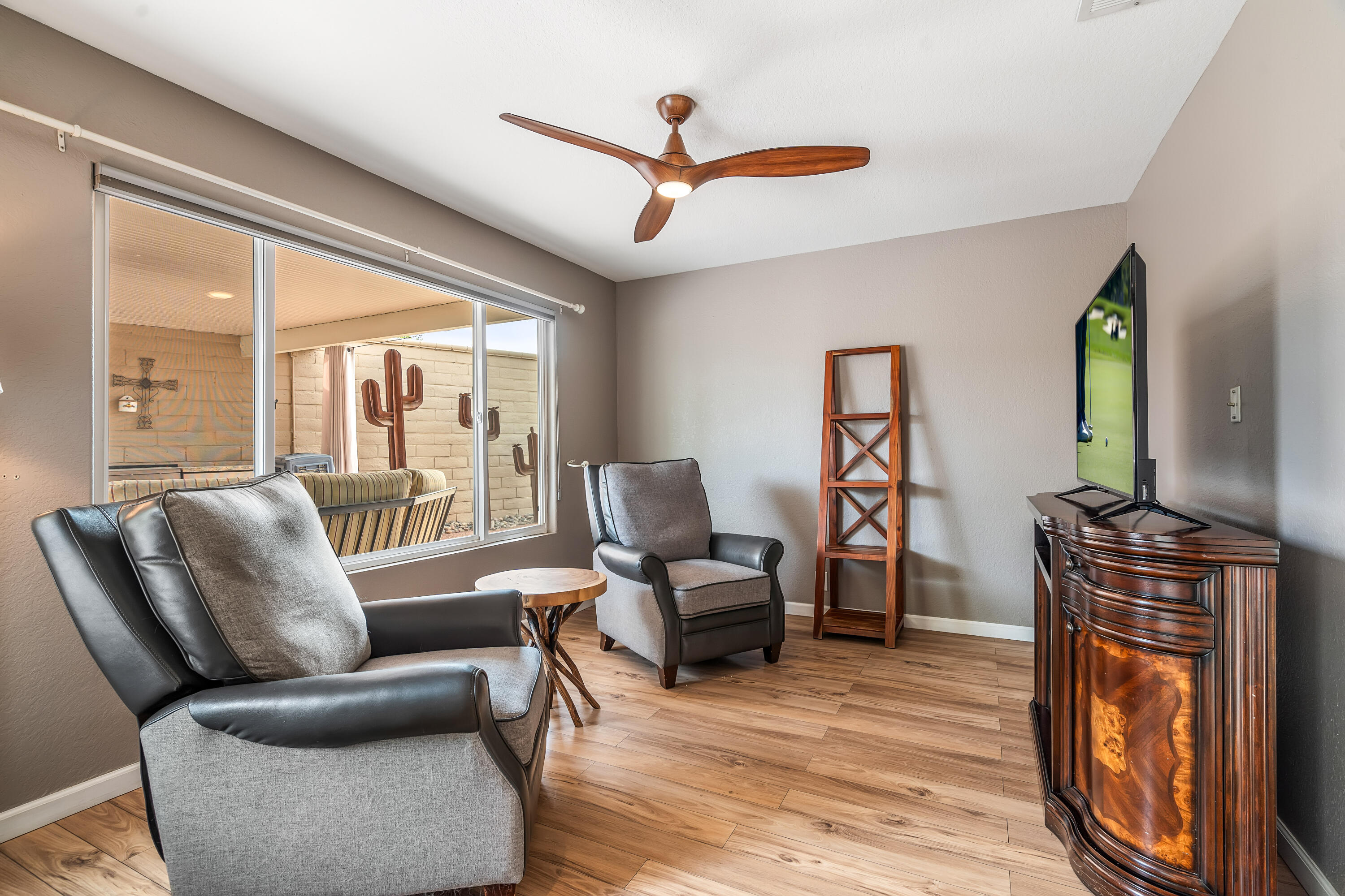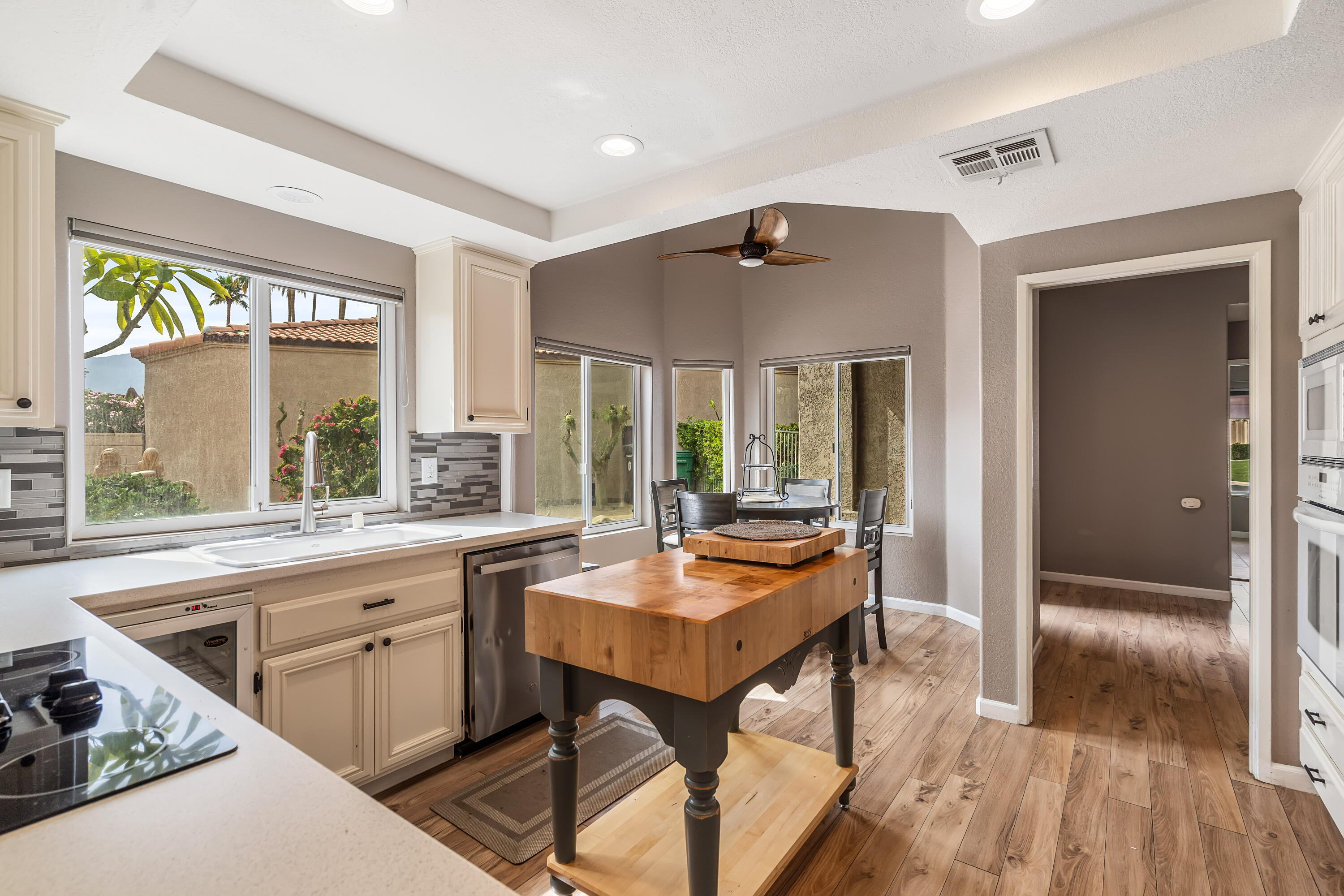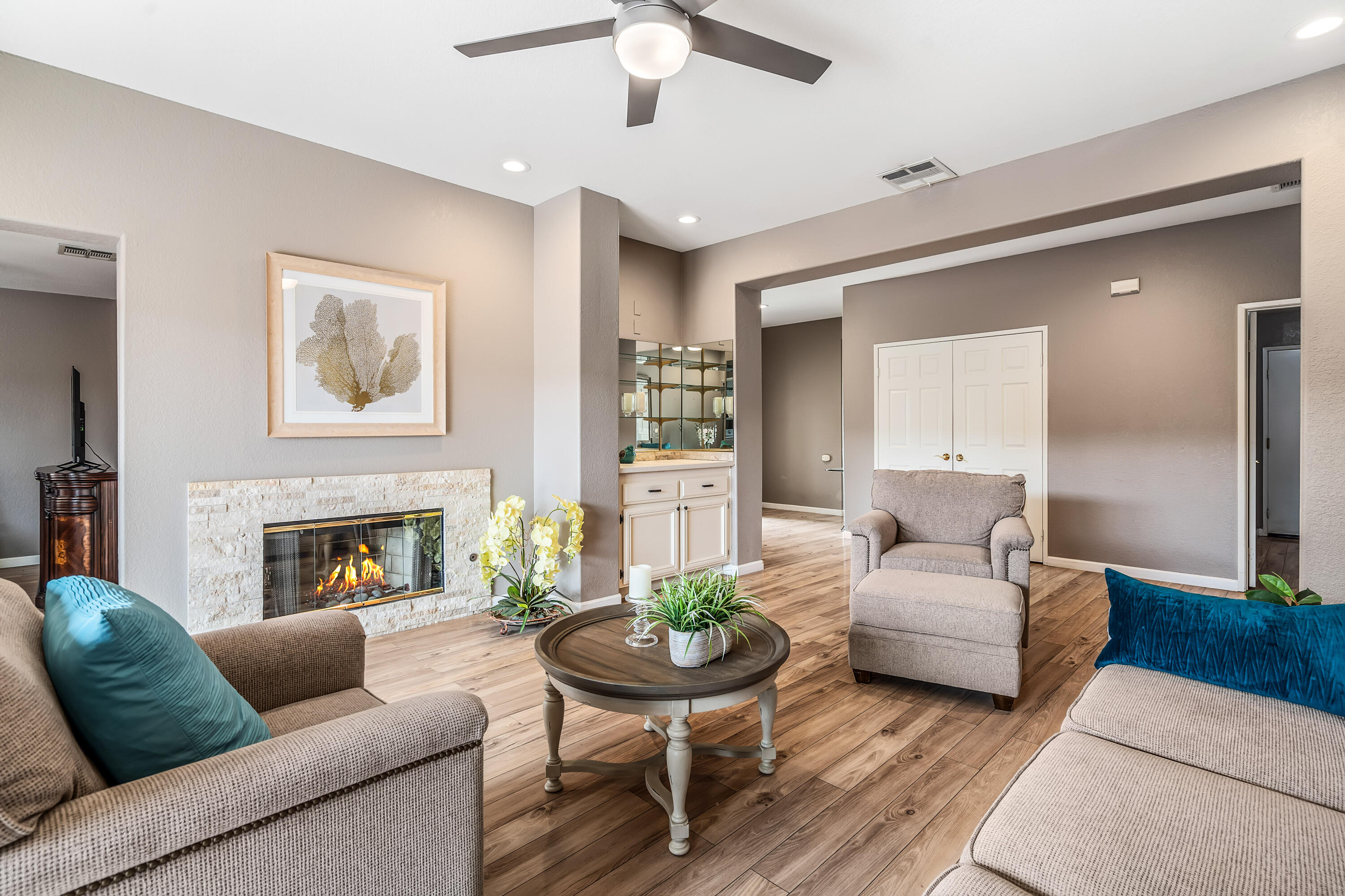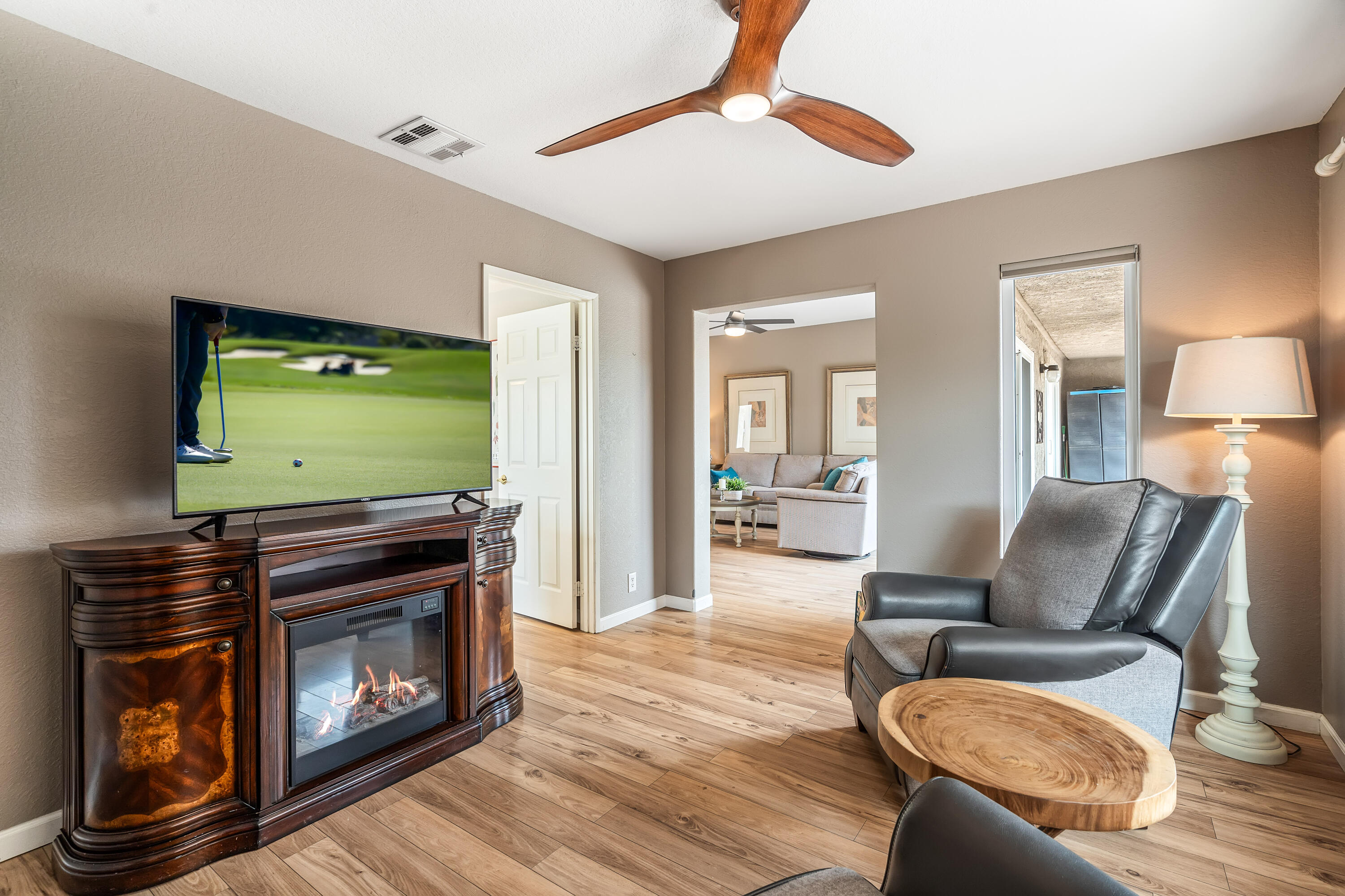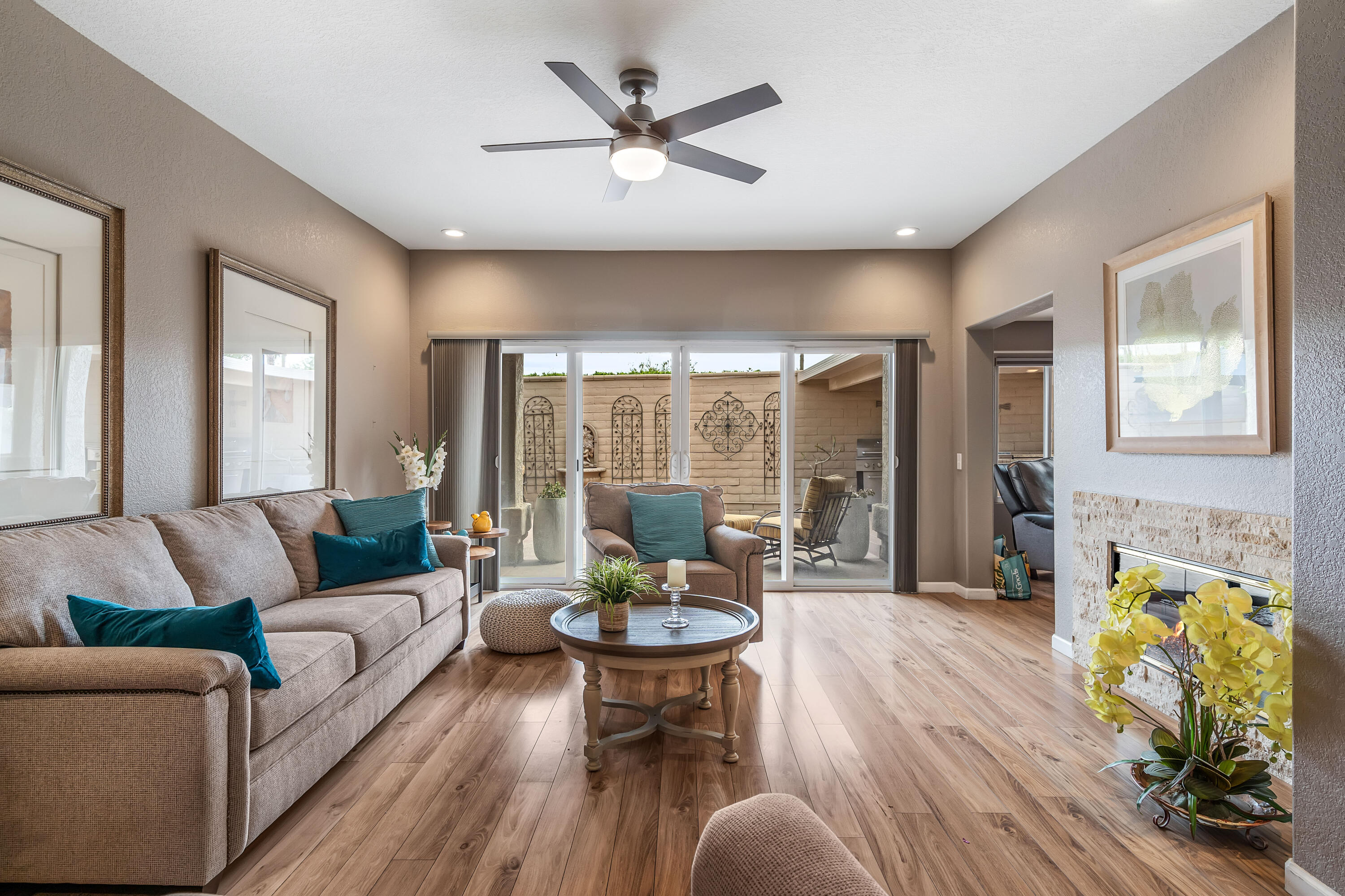 Desert Hideaway in Laguna de la Paz! Situated on a .14 acre lot, this home has an entertainers' backyard complete with BBQ/TV, portable outdoor a/c unit and expansive patio cover. There is also room to add a spool or casita with HOA approval. This spacious 1,852 sq. ft. 3bed/2bath floor plan features many upgrades including energy efficient dual pane windows, custom window shades, vinyl laminate and tile flooring, fresh paint & baseboards as well as recessed lighting throughout! The inviting living room is open to the patio and features a stone gas fireplace. Off the living room, the den/dining area wraps around the patio heading in to the light and bright kitchen featuring a cute eat-in dining area with soaring high ceilings! The primary bedroom is an oasis of it's own with double doors for privacy, a large walk in closet, a separate slider with access to the patio and a huge tiled walk-in dual shower with bench. There are two additional bedrooms on the opposite side of the home with access to a second bath which has also been remodeled, featuring a beautifully tiled shower with bench. The garage houses a Navien Tankless Water Heater for superb efficiency as well as ceiling storage racks & storage cabinets. There are so many community amenities to enjoy including 15 pools and 16 spas, a 5-acre lake with paddle boats outlined by a serene walking path, tennis, pickleball and a fitness center. Less than a mile from the famed La Quinta Resort & Spa. Enjoy close proximity to shopping and theaters as well as the IW Tennis Gardens, El Paseo, Acrisure Arena, plus hiking trails, nationally rated PGA golf resorts and more.Interested in this Listing?
