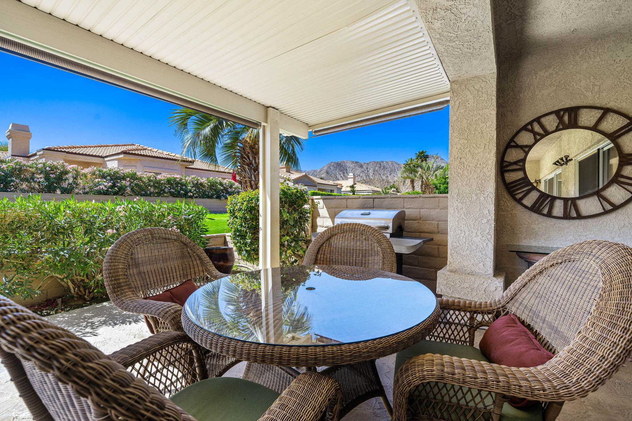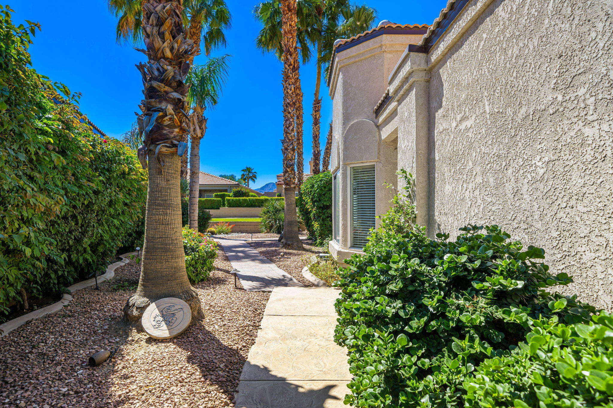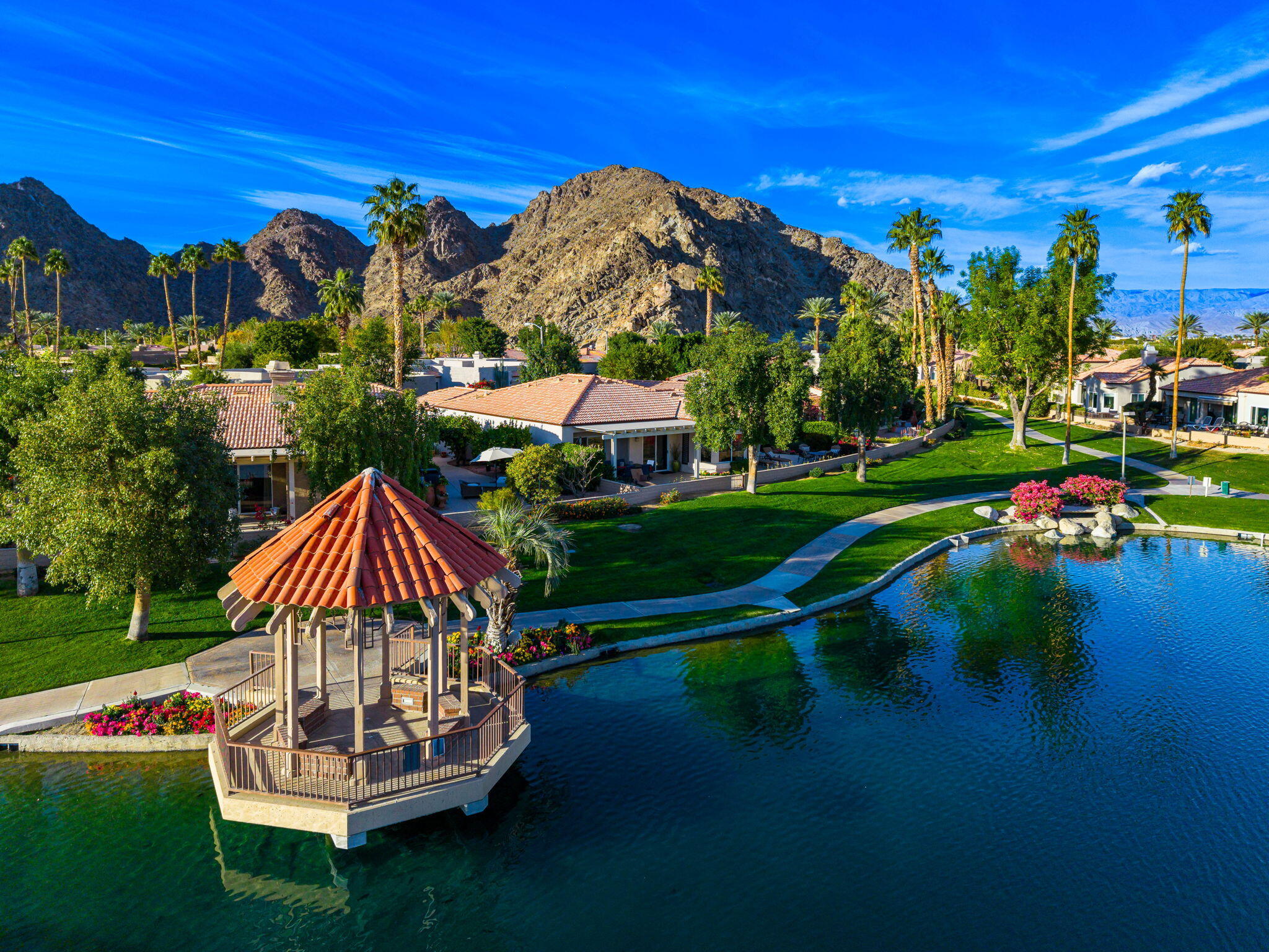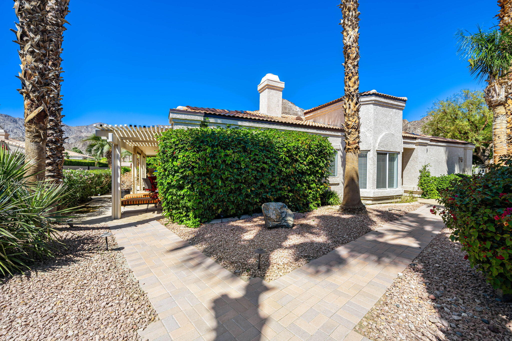 Backing to a beautiful greenbelt and surrounded by up-close views of the Santa Rosa Mountains, this elegantly upgraded La Quinta home presents an outstanding turnkey opportunity. Offering a quiet setting near the back of guard-gated Laguna de la Paz, the single-level residence is a brief stroll from the community pools and spas. Professionally maintained and manicured landscaping elevates grounds that features a gated side entrance and a backyard with large covered patio for the ultimate in outdoor relaxation and socializing. Entertaining indoors is exceptional as well thanks to an open floorplan that measures approximately 1,852 square feet. A formal entry flows directly to three bedrooms, two baths, and a generously proportioned living room that displays an upgraded stacked-stone fireplace, patio access, and a mirrored wet bar with under-cabinet beverage refrigerator. Natural light illuminates an open-concept kitchen with island, white cabinetry including a built-in pantry, granite countertops with full backsplash, upgraded stainless steel KitchenAid appliances, and a casual dining nook with extra-high ceiling and bay window. Custom recessed art lighting, tile flooring, high-end carpet in bedrooms, mirrored wardrobe doors, and custom crown and base molding lend an air of distinction throughout. Opening to the patio, the primary suite is a private sanctuary that reveals a walk-in closet with custom built-in organizers and drawers, two sinks, a soaking tub and separate shower. A convenient laundry room with cabinetry leads to an attached two-car garage. Centered around a shimmering five-acre lake that offers paddle and pontoon boats and catch-and-release fishing, Laguna de la Paz is a true desert oasis. Residents enjoy a luxurious clubhouse, 15 pools, 16 spas, a 24-hour fitness center, scenic trails, and tennis and pickleball courts. Golf courses, shopping centers, restaurants and Old Town La Quinta are minutes away.Interested in this Listing?