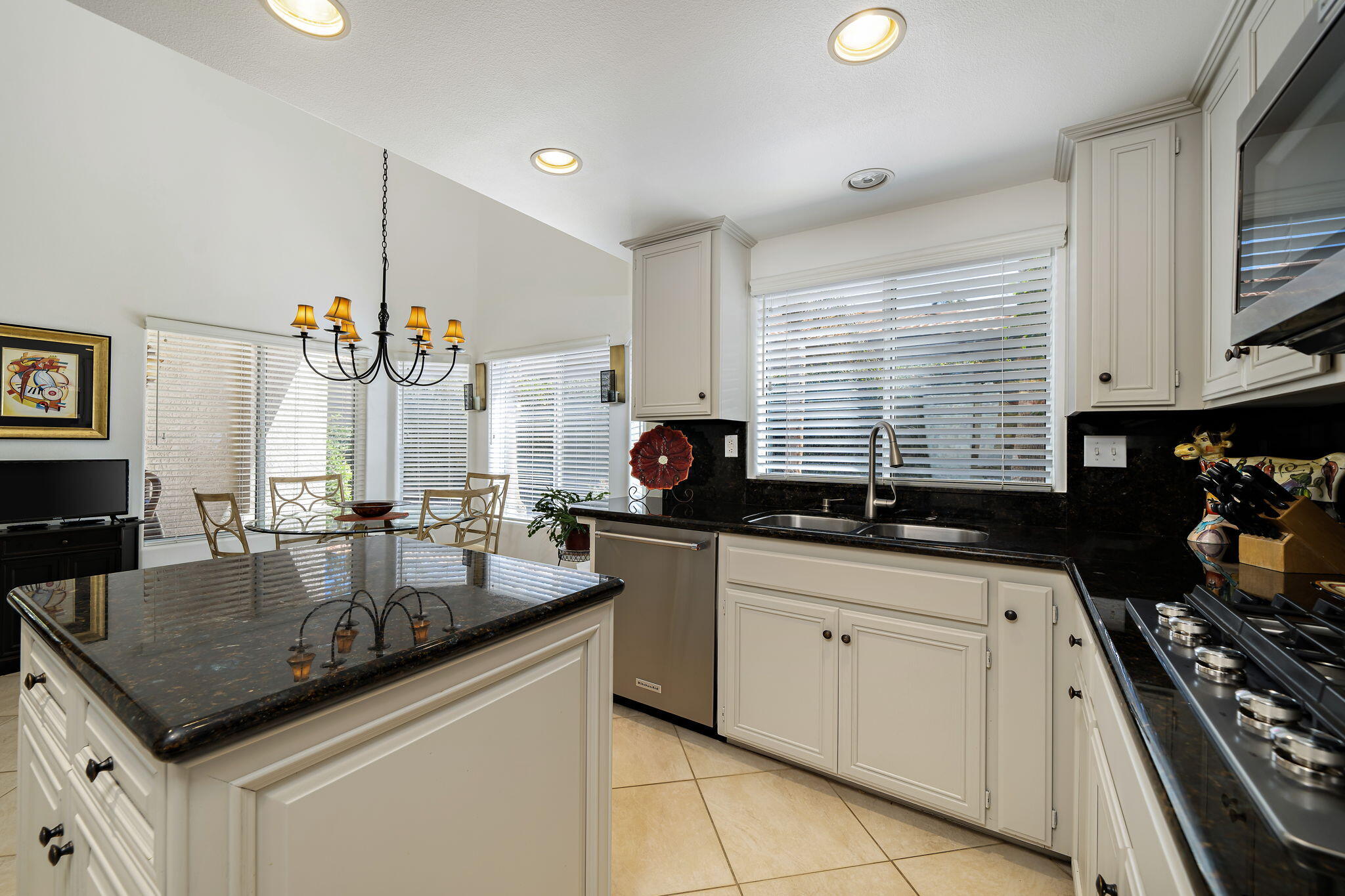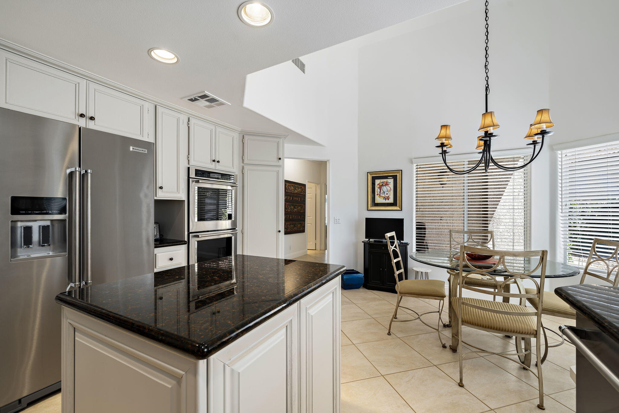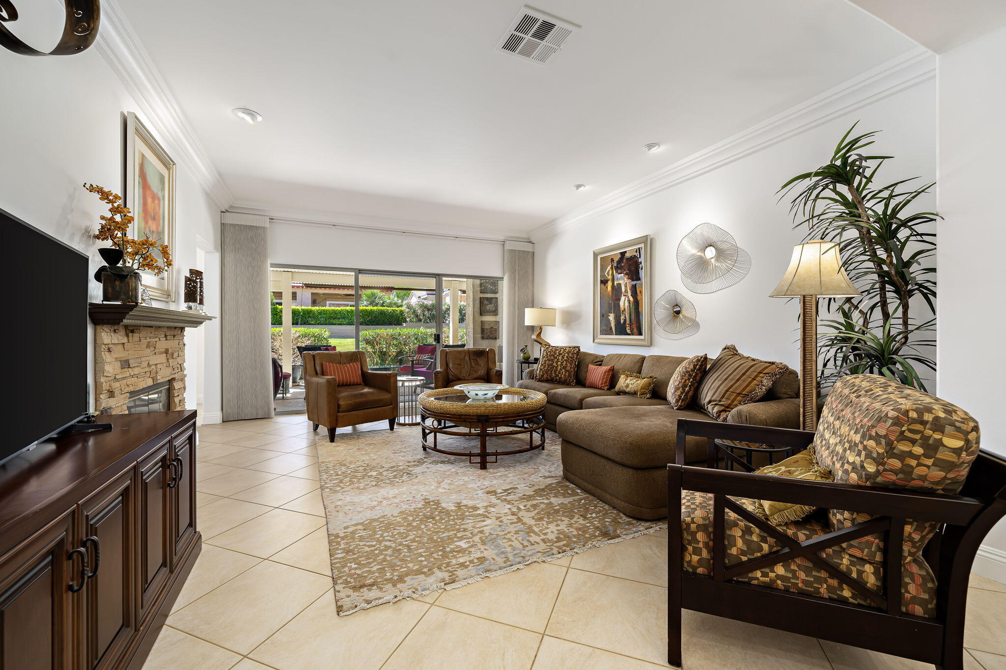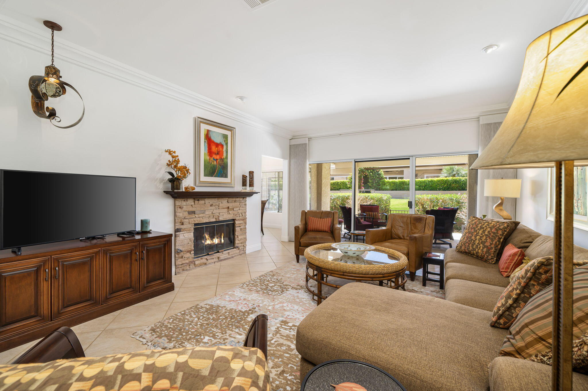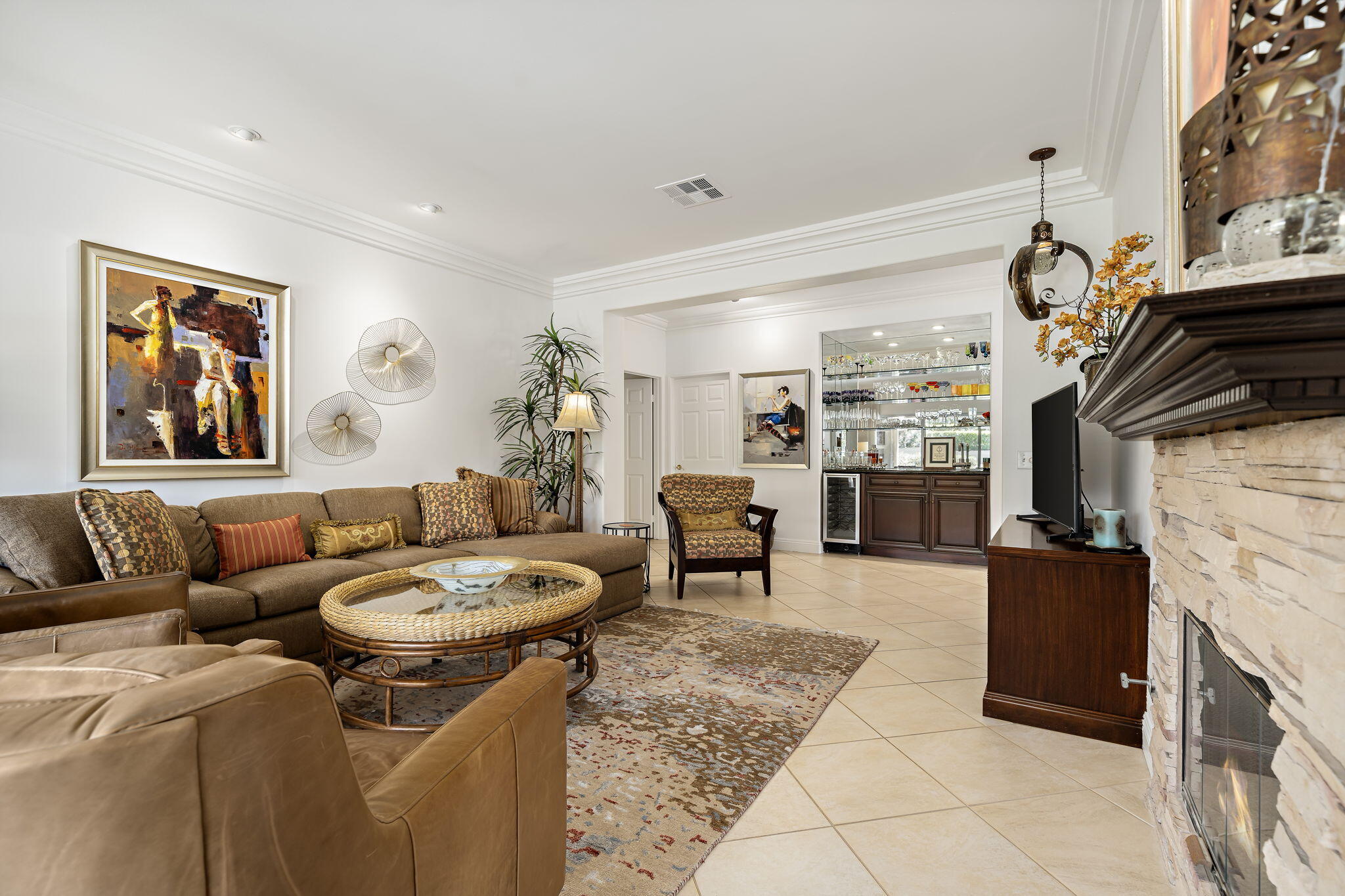 Backing to a beautiful greenbelt and surrounded by up-close views of the Santa Rosa Mountains, this elegantly upgraded La Quinta home presents an outstanding turnkey opportunity. Offering a quiet setting near the back of guard-gated Laguna de la Paz, the single-level residence is a brief stroll from the community pools and spas. Professionally maintained and manicured landscaping elevates grounds that features a gated side entrance and a backyard with large covered patio for the ultimate in outdoor relaxation and socializing. Entertaining indoors is exceptional as well thanks to an open floorplan that measures approximately 1,852 square feet. A formal entry flows directly to three bedrooms, two baths, and a generously proportioned living room that displays an upgraded stacked-stone fireplace, patio access, and a mirrored wet bar with under-cabinet beverage refrigerator. Natural light illuminates an open-concept kitchen with island, white cabinetry including a built-in pantry, granite countertops with full backsplash, upgraded stainless steel KitchenAid appliances, and a casual dining nook with extra-high ceiling and bay window. Custom recessed art lighting, tile flooring, high-end carpet in bedrooms, mirrored wardrobe doors, and custom crown and base molding lend an air of distinction throughout. Opening to the patio, the primary suite is a private sanctuary that reveals a walk-in closet with custom built-in organizers and drawers, two sinks, a soaking tub and separate shower. A convenient laundry room with cabinetry leads to an attached two-car garage. Centered around a shimmering five-acre lake that offers paddle and pontoon boats and catch-and-release fishing, Laguna de la Paz is a true desert oasis. Residents enjoy a luxurious clubhouse, 15 pools, 16 spas, a 24-hour fitness center, scenic trails, and tennis and pickleball courts. Golf courses, shopping centers, restaurants and Old Town La Quinta are minutes away.Interested in this Listing?