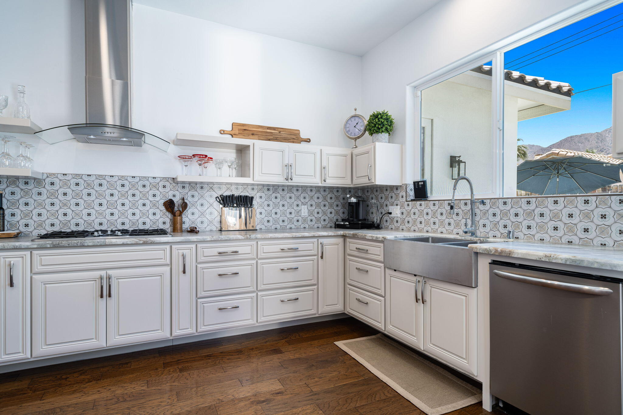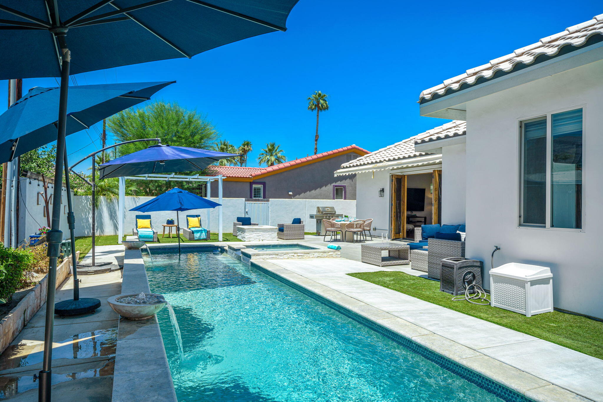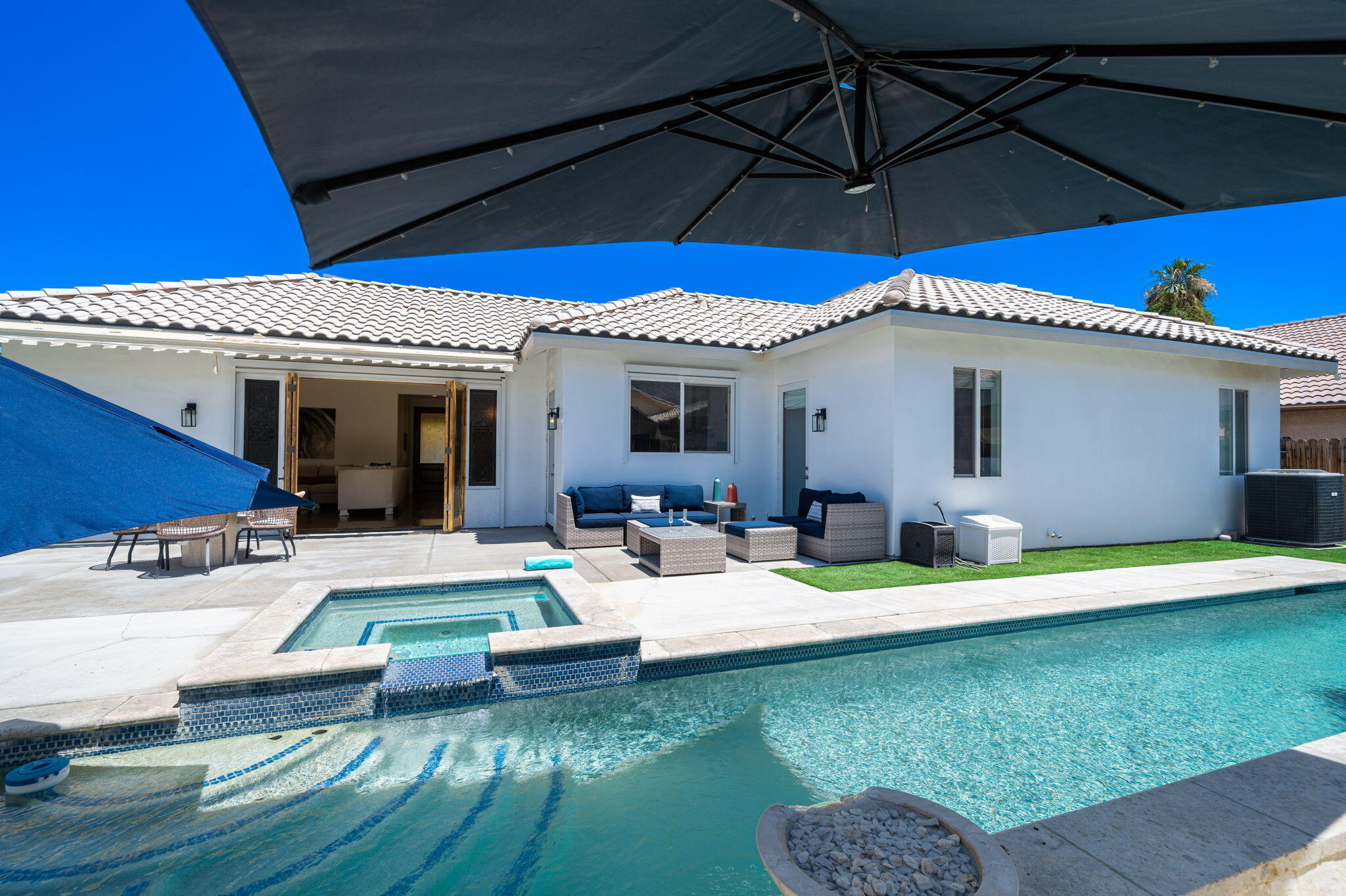 Welcome to your oasis in La Quinta Cove, where luxury seamlessly blends with functionality! This bespoke residence boasts three bedrooms and three bathrooms, offering spacious and comfortable living spaces. Nestled on an expansive lot, this west-facing retreat harmoniously integrates indoor and outdoor living. Step into your paradise featuring a pristine pool and spa--a tranquil haven for relaxation and entertainment. Stay cool during warmer months with the misting system, or cozy under the stars by the inviting gas firepit. The generous main bedroom sanctuary features his and her closets, ensuring ample storage. Indulge in the main bathroom's luxurious amenities, including a soaking tub and a frameless, enclosed marble shower. Unleash your inner chef in the gourmet kitchen, appointed with leathered granite countertops and top-of-the-line appliances. Bi-folding French doors seamlessly connect the indoor and outdoor spaces, inviting in natural light and refreshing breezes. Additional highlights include an oversized garage, abundant storage options, lofty ceilings, a built-in natural gas BBQ grill, and multiple shaded retreats. Enjoy year-round comfort and savings with the paid solar panel system, ensuring energy efficiency and peace of mind. Conveniently situated within walking distance to charming Old Town, this property offers more than just a residence--it presents a lifestyle. Don't let this opportunity slip away--claim your slice of paradise today!Interested in this Listing?