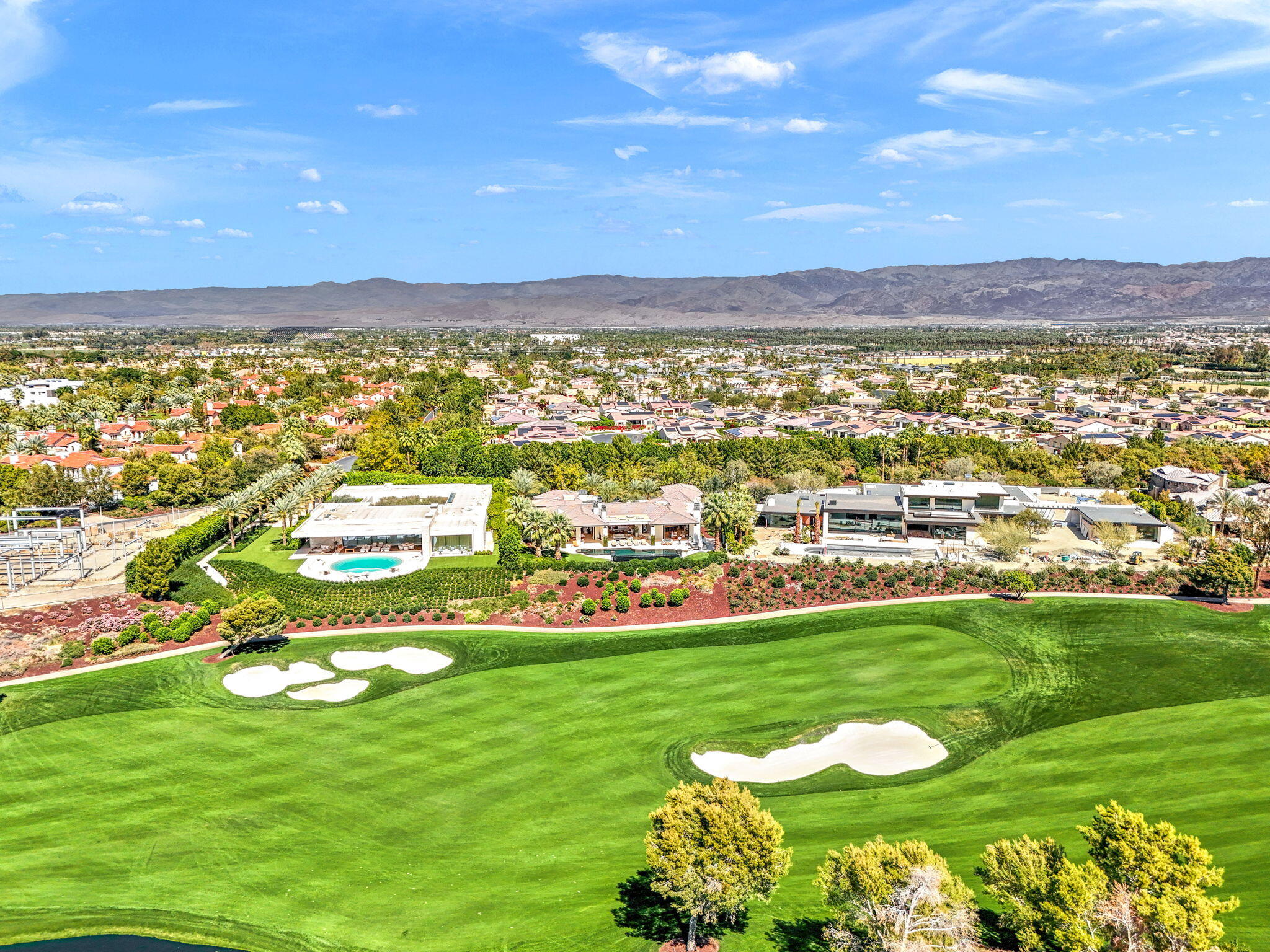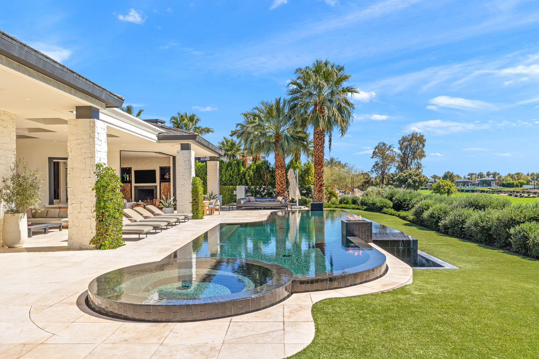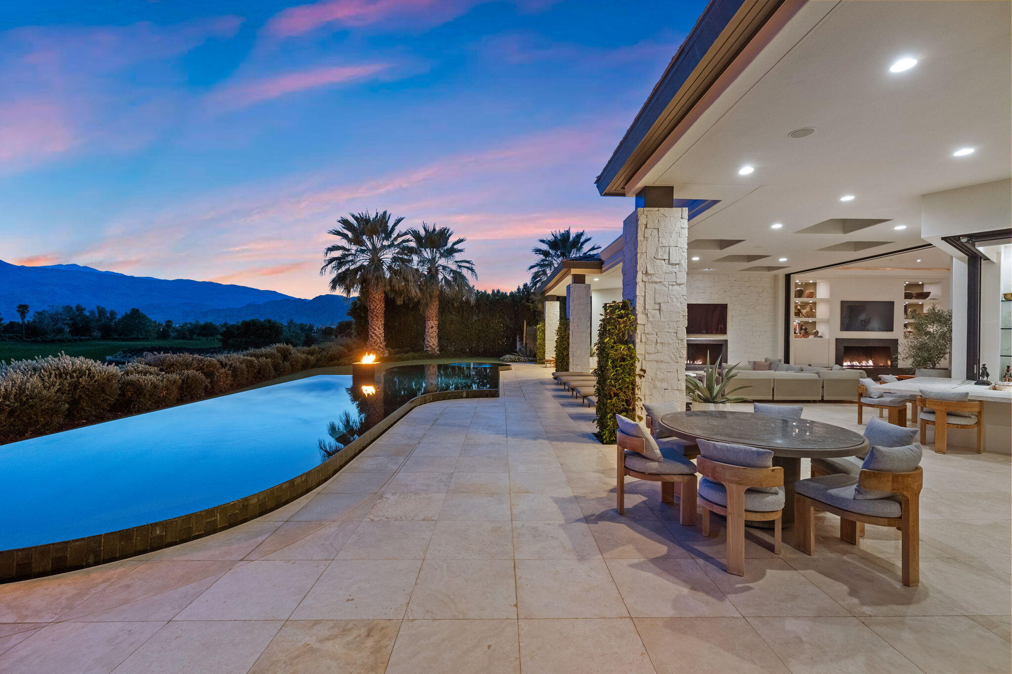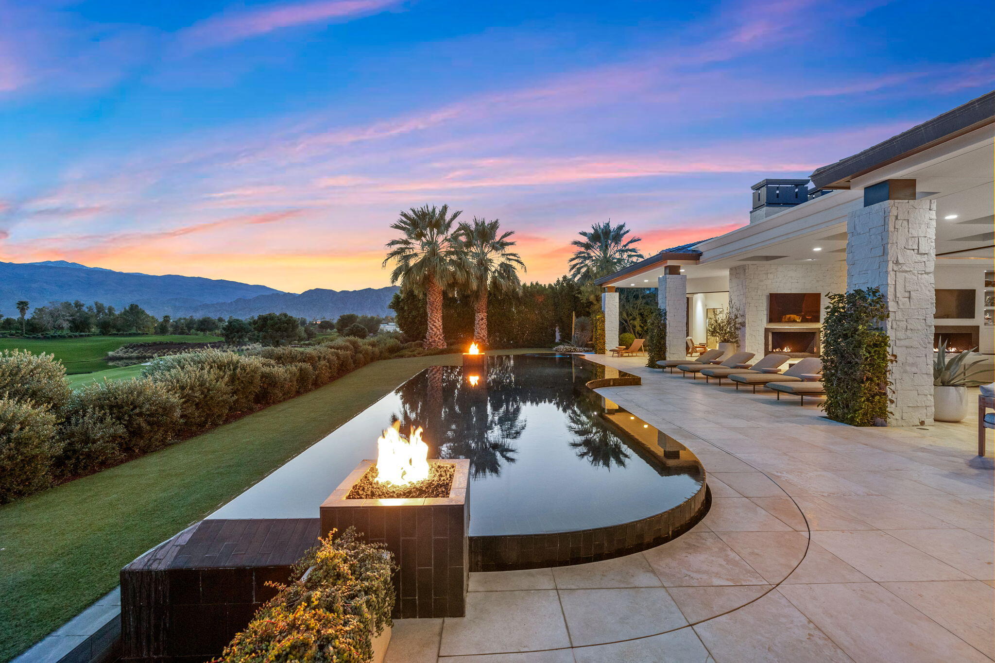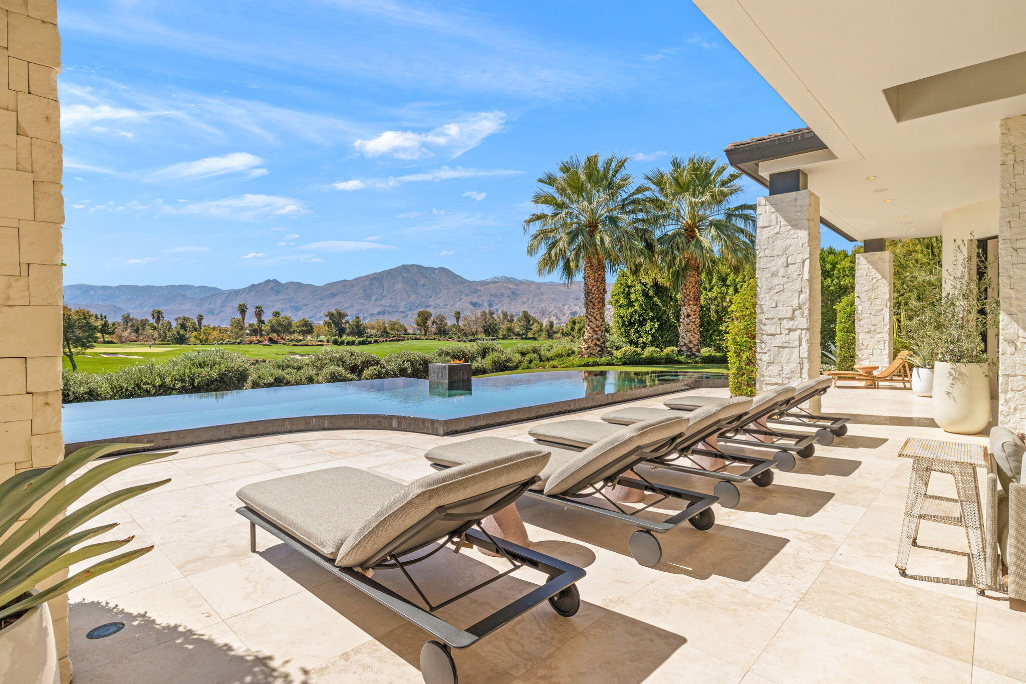 Casual Contemporary Sophistication Amidst Ultra-Exclusive Desert Private Golf Club!Experience the epitome of luxury living at the exclusive Madison Club, the Desert's crown jewel of Private Golf Club Communities. This sophisticated, yet casual, contemporary residence is perched on a premier elevated custom homesite that offers a front-row seat to the renowned Tom Fazio-designed course, overlooking holes 16 and 17 with beautifully contoured lush immaculate fairways and slick pure greens. Southern orientation captures the desert's winter sun and brilliant blue skies and the magnificence of the Santa Rosa Mountains. Floor-to-ceiling glass pocket doors in the living room, family room and primary bedroom that seamlessly blend indoor luxury with breathtaking outdoor panoramic vistas and sparkling infinity pool/spa. Comprising 5,978', this residence features 4 BD/5 BA, formal dining with glass wine-wall, casual dining options, office/media refuge and serene, mature landscapes. The home's interior is a testament to refined taste, with travertine floors, limestone counters and multiple fire features including 5 generous interior and exterior fireplaces and poolside fire pots to capture the essence of warmth and comfort. The elegant primary on-view suite offers ultimate privacy. Three ensuite guest bedrooms, plus shared lounge and multiple tranquil patios, ensure comfort for family and guests. The heart of the home seamlessly joins spacious living areas, epicurean kitchen with butler's pantry and central bar for family enjoyment and intimate gatherings. The Madison Club provides an ultra-exclusive lifestyle with unsurpassed community security. Additionally, Madison Club Members enjoy access to world-class amenities beyond golf and include premium clubhouse concierge services and home care, unparalleled staffing, multiple gourmet dining opportunities, a majestic Club pool, state of the art fitness and spa and a variety of popular racquet sports. Madison Club has establishInterested in this Listing?