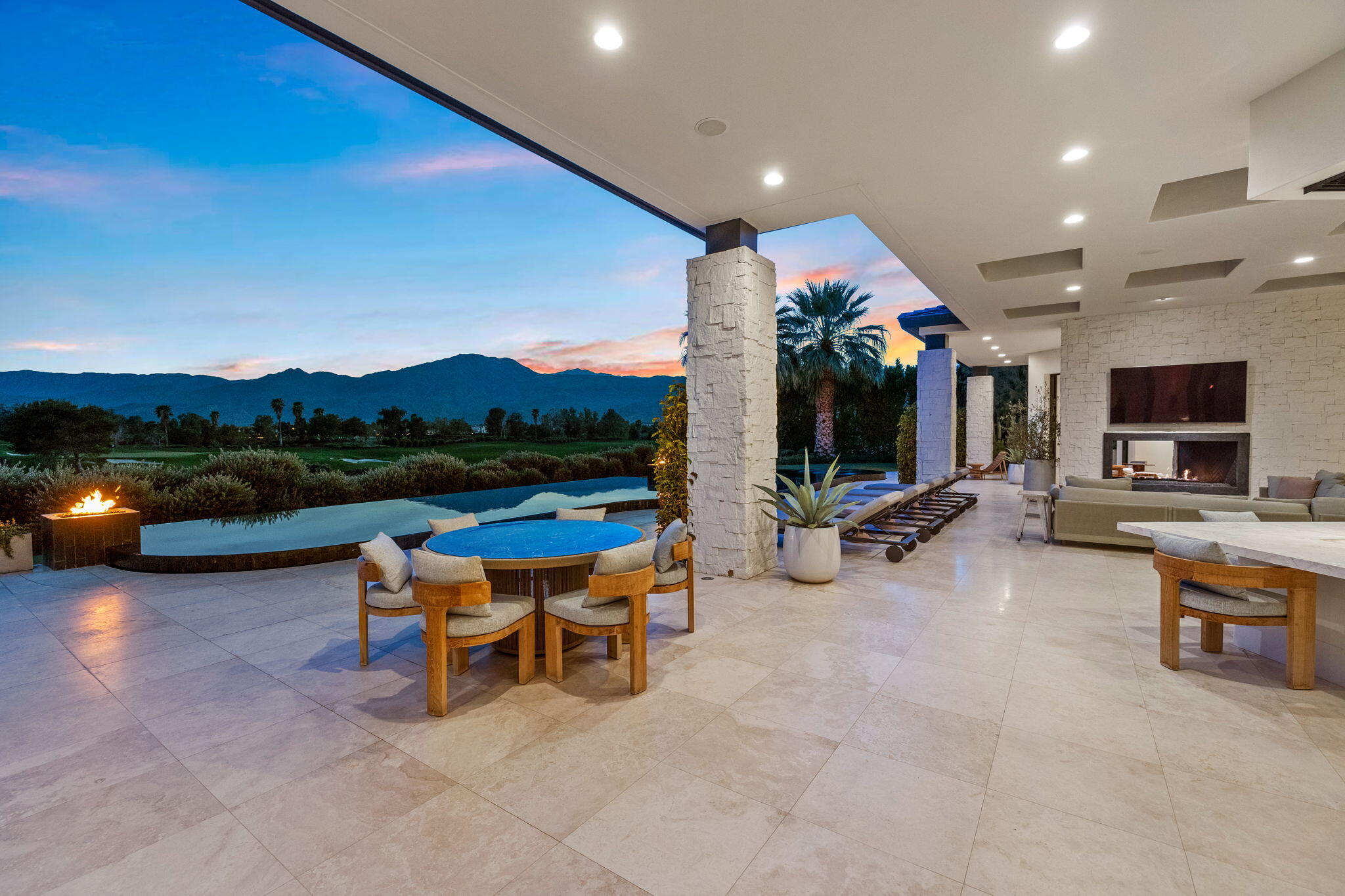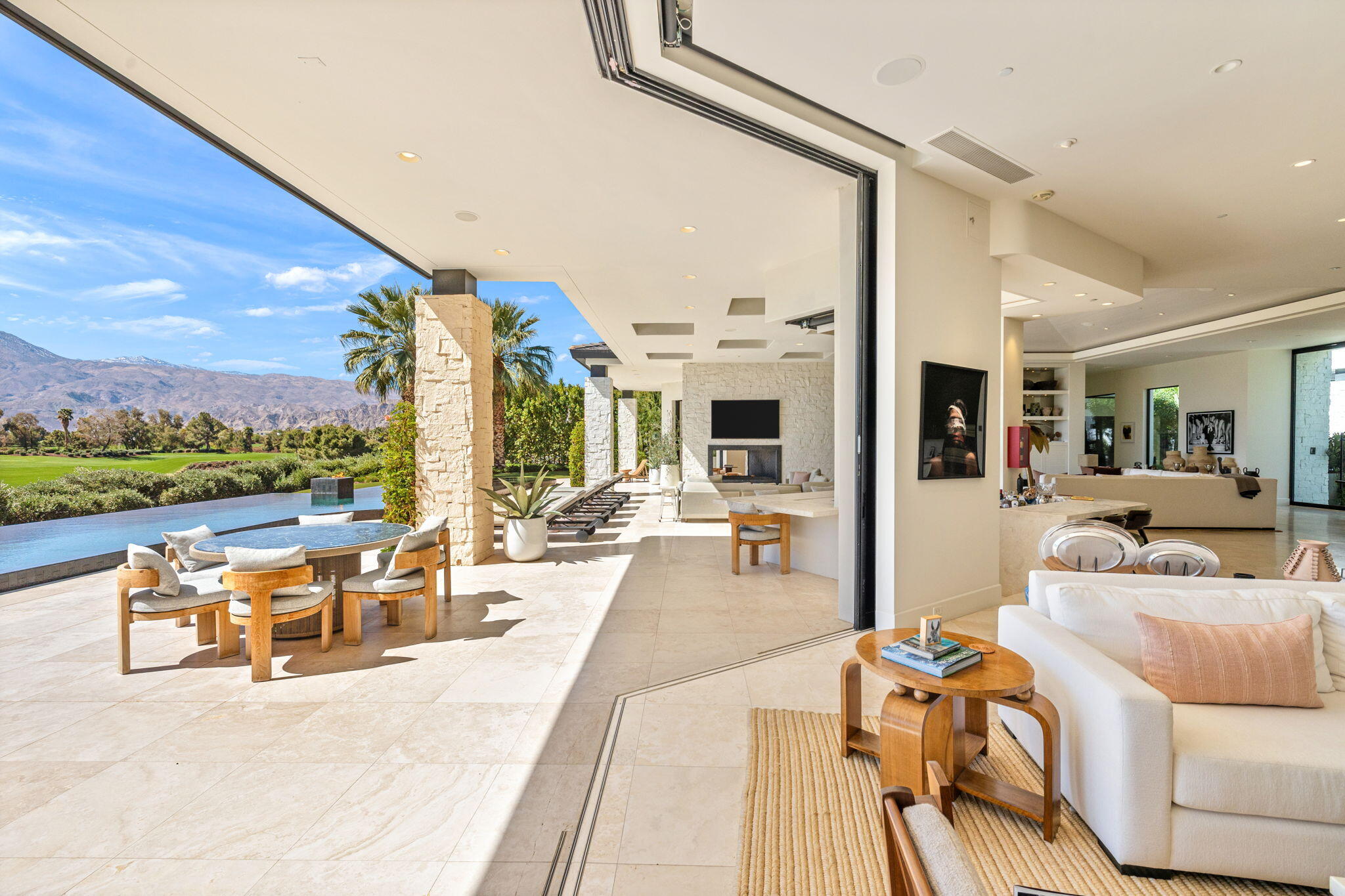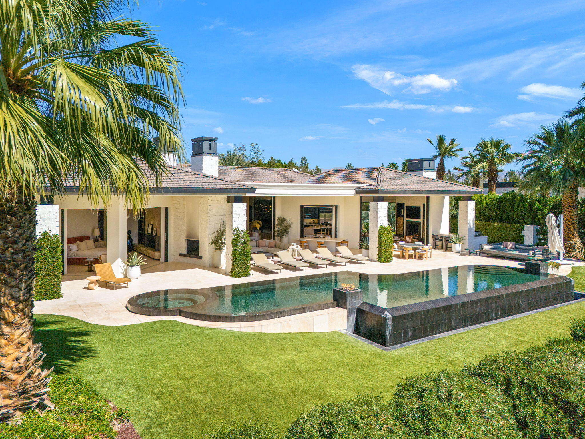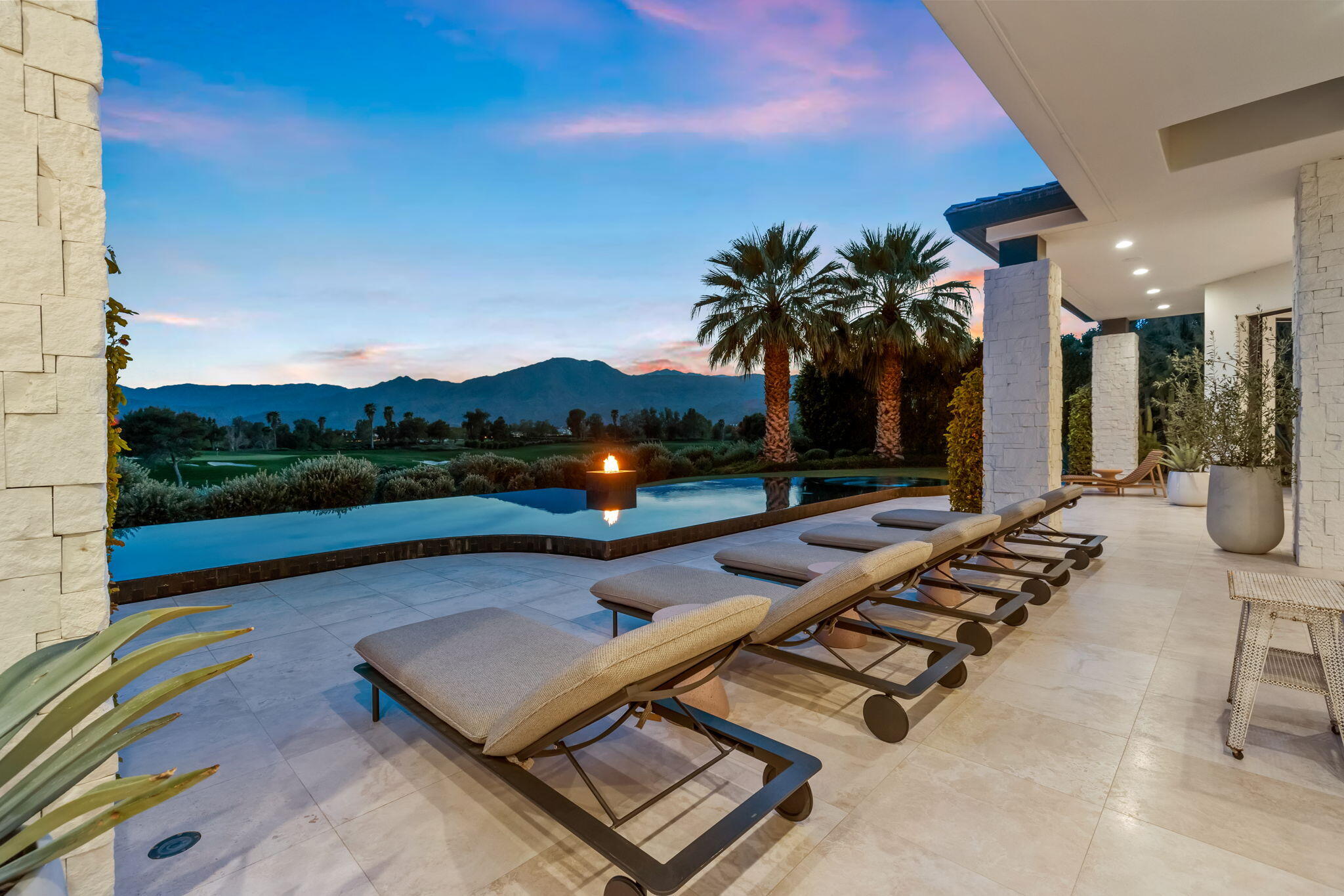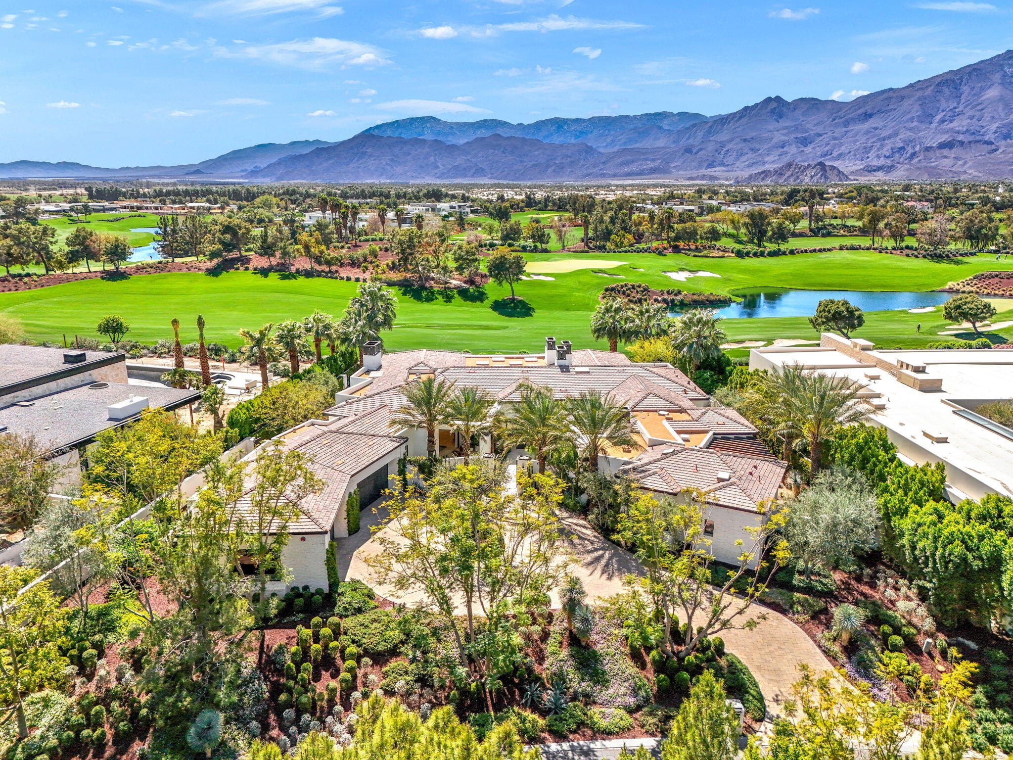Casual Contemporary Sophistication Amidst Ultra-Exclusive Desert Private Golf Club!Experience the epitome of luxury living at the exclusive Madison Club, the Desert's crown jewel of Private Golf Club Communities. This sophisticated, yet casual, contemporary residence is perched on a premier elevated custom homesite that offers a front-row seat to the renowned Tom Fazio-designed course, overlooking holes 16 and 17 with beautifully contoured lush immaculate fairways and slick pure greens. Southern orientation captures the desert's winter sun and brilliant blue skies and the magnificence of the Santa Rosa Mountains. Floor-to-ceiling glass pocket doors in the living room, family room and primary bedroom that seamlessly blend indoor luxury with breathtaking outdoor panoramic vistas and sparkling infinity pool/spa. Comprising 5,978', this residence features 4 BD/5 BA, formal dining with glass wine-wall, casual dining options, office/media refuge and serene, mature landscapes. The home's interior is a testament to refined taste, with travertine floors, limestone counters and multiple fire features including 5 generous interior and exterior fireplaces and poolside fire pots to capture the essence of warmth and comfort. The elegant primary on-view suite offers ultimate privacy. Three ensuite guest bedrooms, plus shared lounge and multiple tranquil patios, ensure comfort for family and guests. The heart of the home seamlessly joins spacious living areas, epicurean kitchen with butler's pantry and central bar for family enjoyment and intimate gatherings. The Madison Club provides an ultra-exclusive lifestyle with unsurpassed community security. Additionally, Madison Club Members enjoy access to world-class amenities beyond golf and include premium clubhouse concierge services and home care, unparalleled staffing, multiple gourmet dining opportunities, a majestic Club pool, state of the art fitness and spa and a variety of popular racquet sports. Madison Club has establishInterested in this Listing?