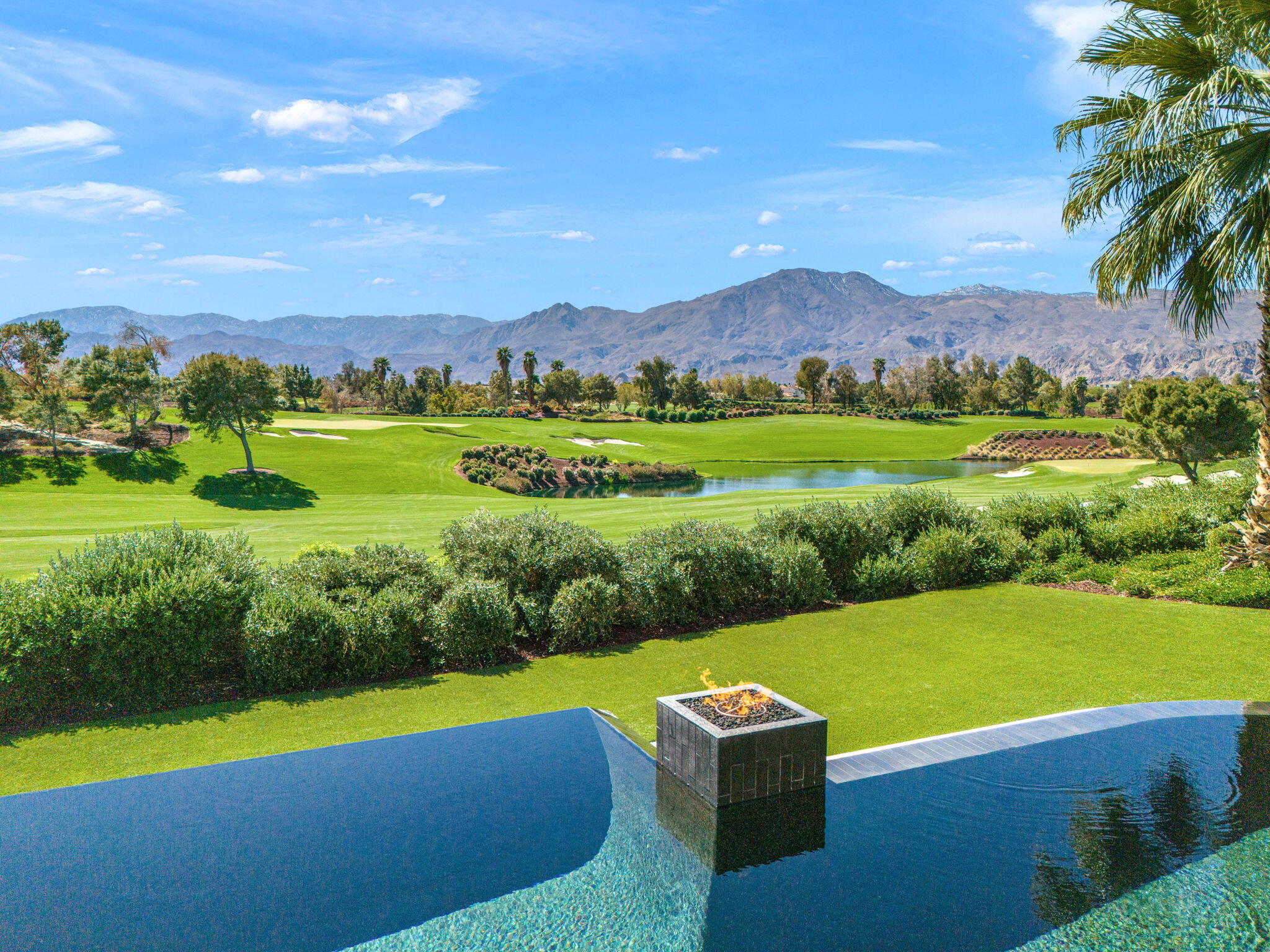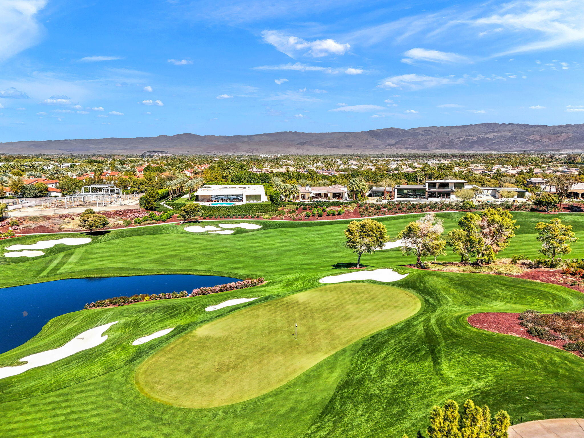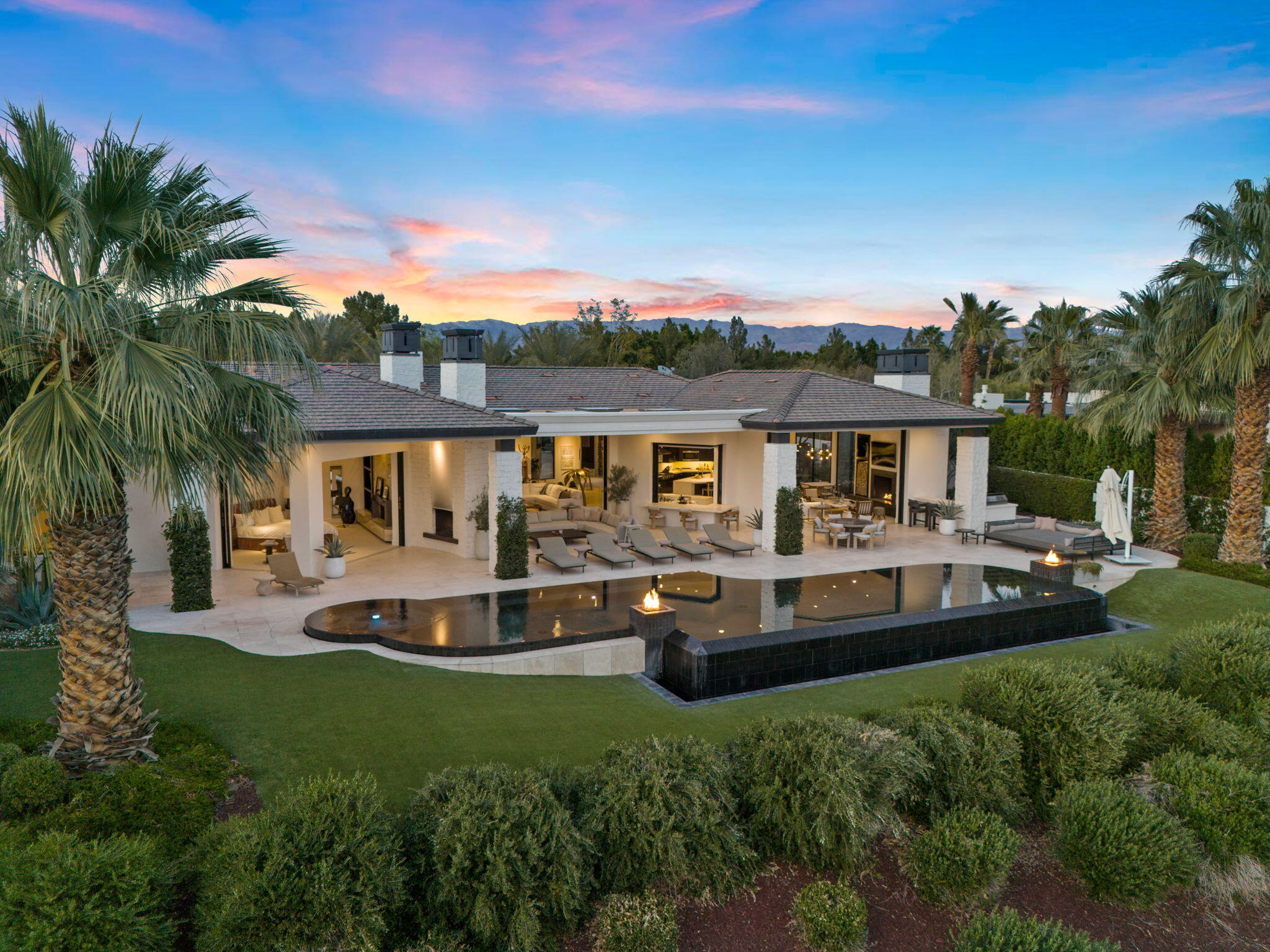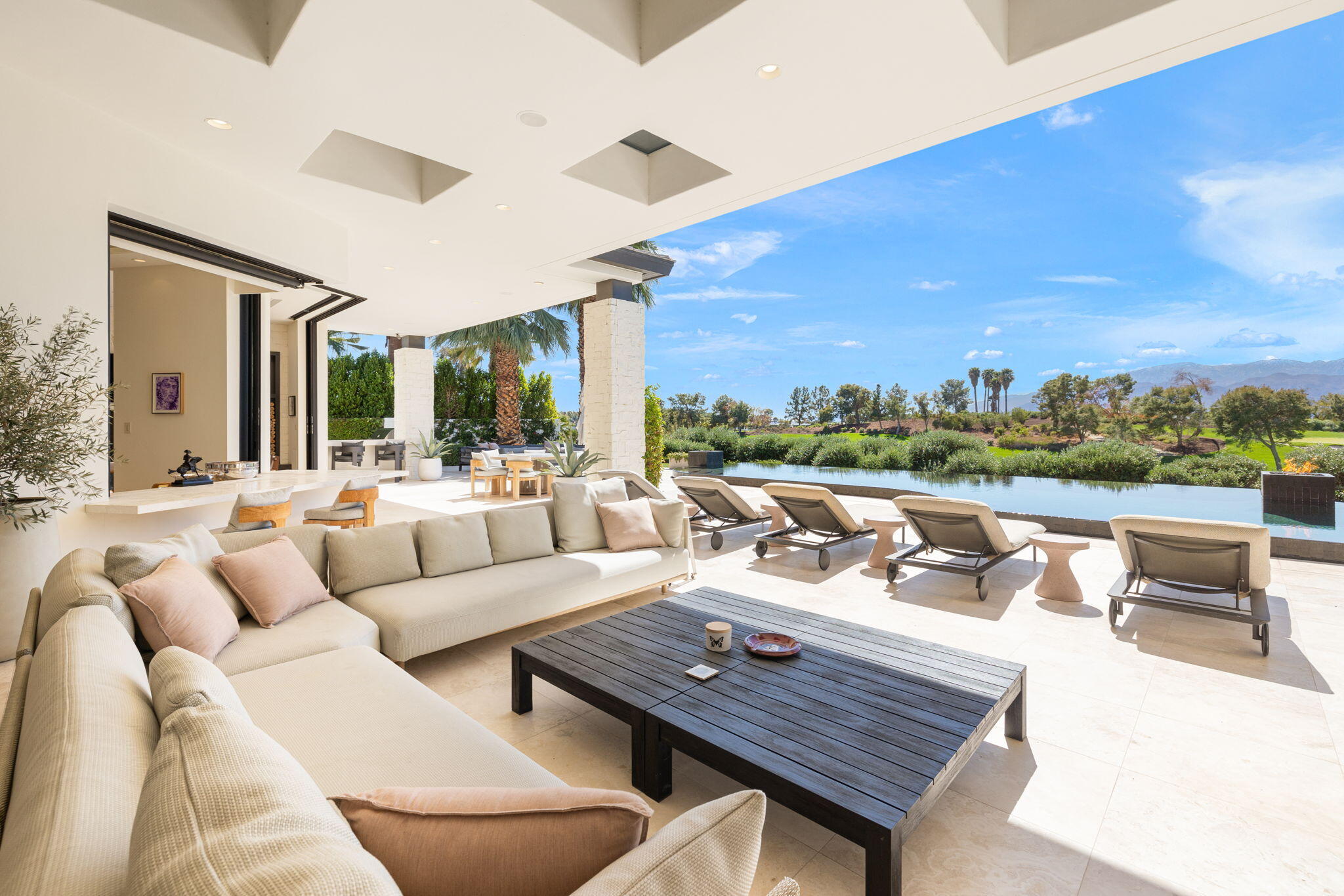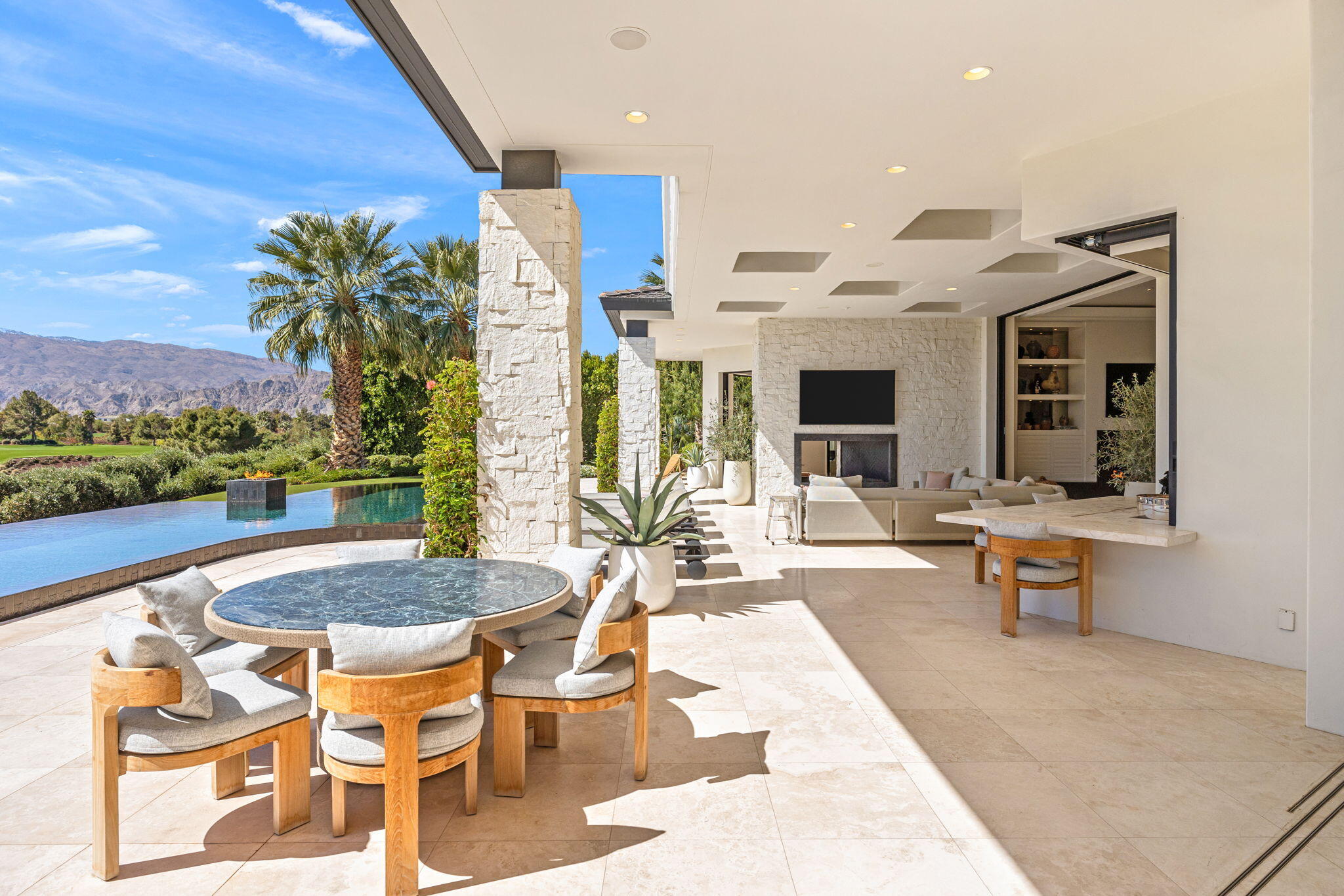 Casual Contemporary Sophistication Amidst Ultra-Exclusive Desert Private Golf Club!Experience the epitome of luxury living at the exclusive Madison Club, the Desert's crown jewel of Private Golf Club Communities. This sophisticated, yet casual, contemporary residence is perched on a premier elevated custom homesite that offers a front-row seat to the renowned Tom Fazio-designed course, overlooking holes 16 and 17 with beautifully contoured lush immaculate fairways and slick pure greens. Southern orientation captures the desert's winter sun and brilliant blue skies and the magnificence of the Santa Rosa Mountains. Floor-to-ceiling glass pocket doors in the living room, family room and primary bedroom that seamlessly blend indoor luxury with breathtaking outdoor panoramic vistas and sparkling infinity pool/spa. Comprising 5,978', this residence features 4 BD/5 BA, formal dining with glass wine-wall, casual dining options, office/media refuge and serene, mature landscapes. The home's interior is a testament to refined taste, with travertine floors, limestone counters and multiple fire features including 5 generous interior and exterior fireplaces and poolside fire pots to capture the essence of warmth and comfort. The elegant primary on-view suite offers ultimate privacy. Three ensuite guest bedrooms, plus shared lounge and multiple tranquil patios, ensure comfort for family and guests. The heart of the home seamlessly joins spacious living areas, epicurean kitchen with butler's pantry and central bar for family enjoyment and intimate gatherings. The Madison Club provides an ultra-exclusive lifestyle with unsurpassed community security. Additionally, Madison Club Members enjoy access to world-class amenities beyond golf and include premium clubhouse concierge services and home care, unparalleled staffing, multiple gourmet dining opportunities, a majestic Club pool, state of the art fitness and spa and a variety of popular racquet sports. Madison Club has establishInterested in this Listing?