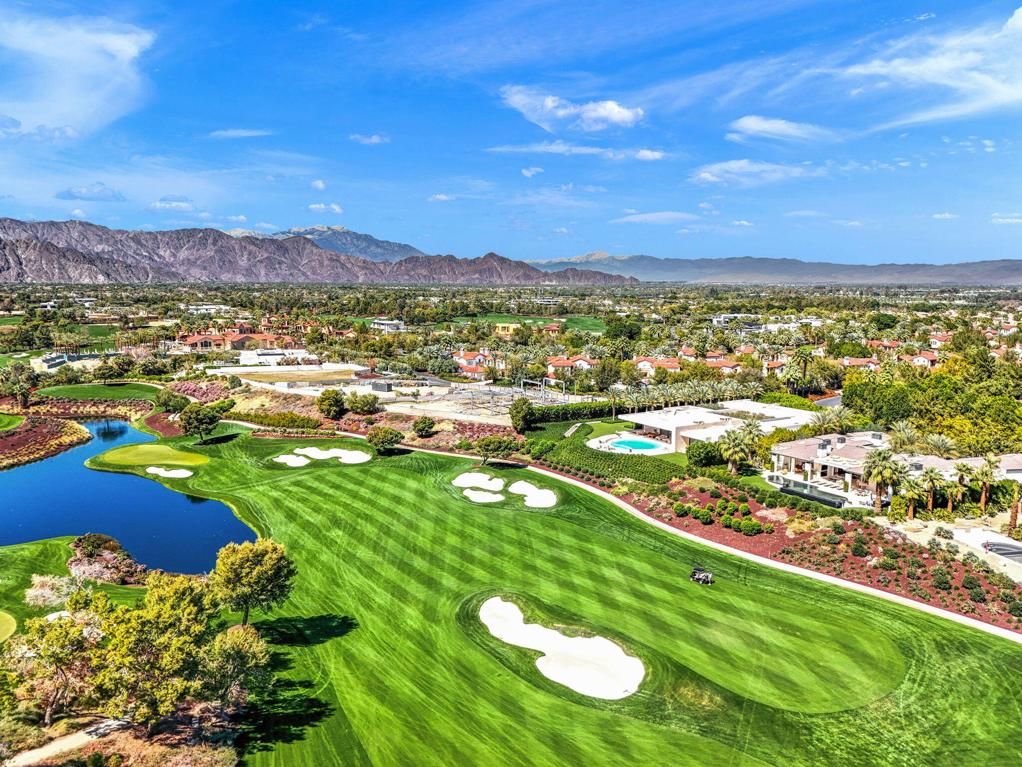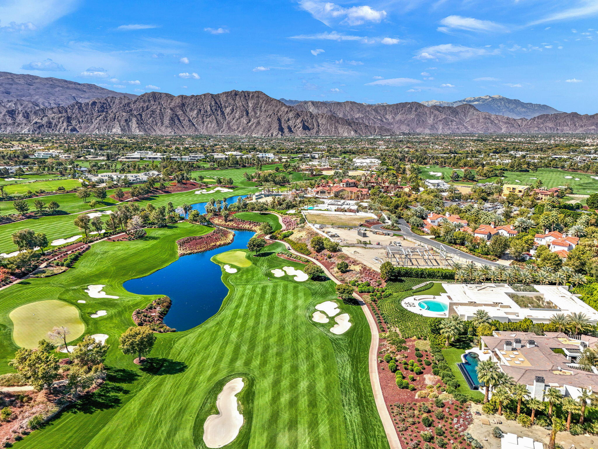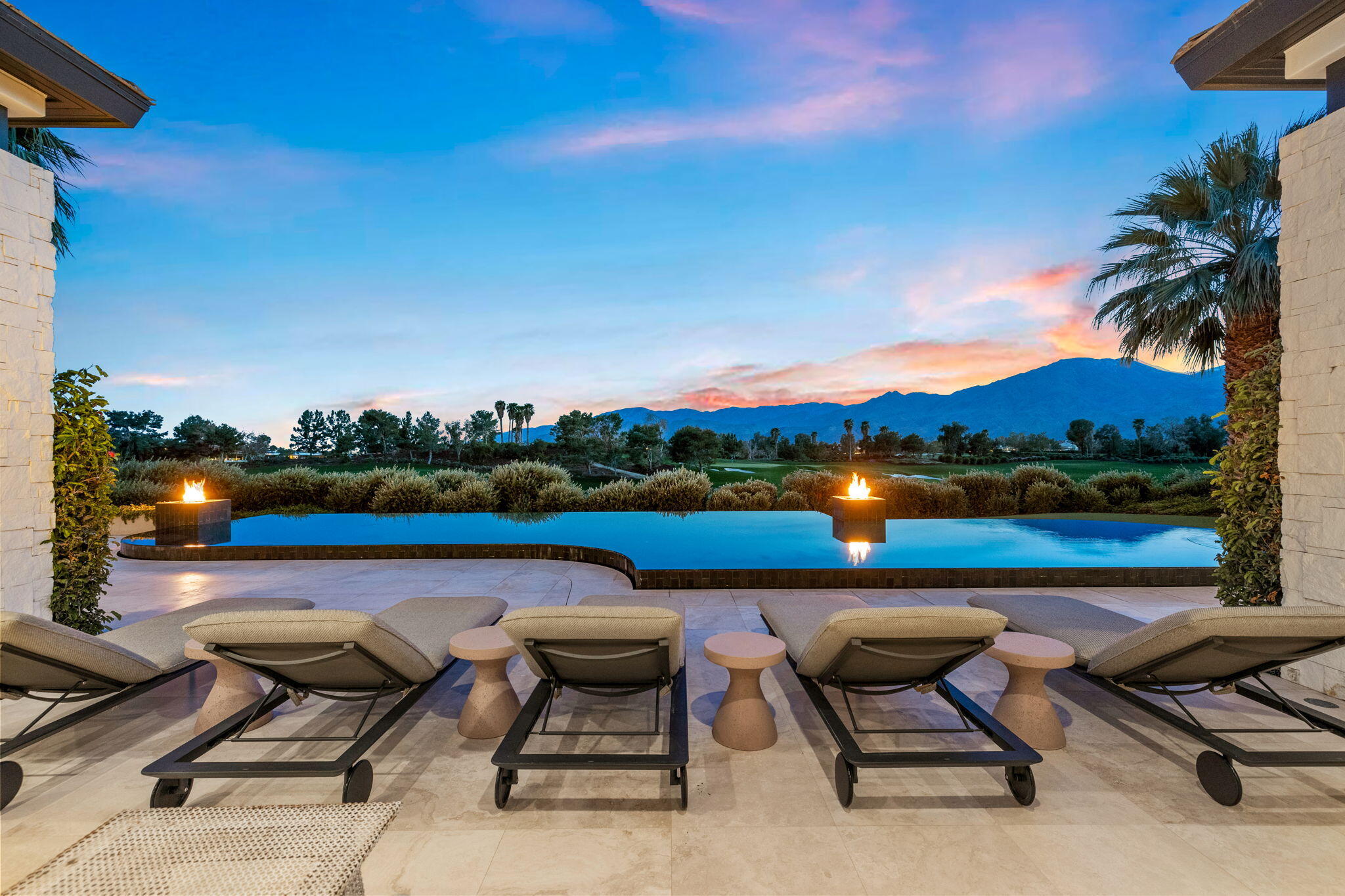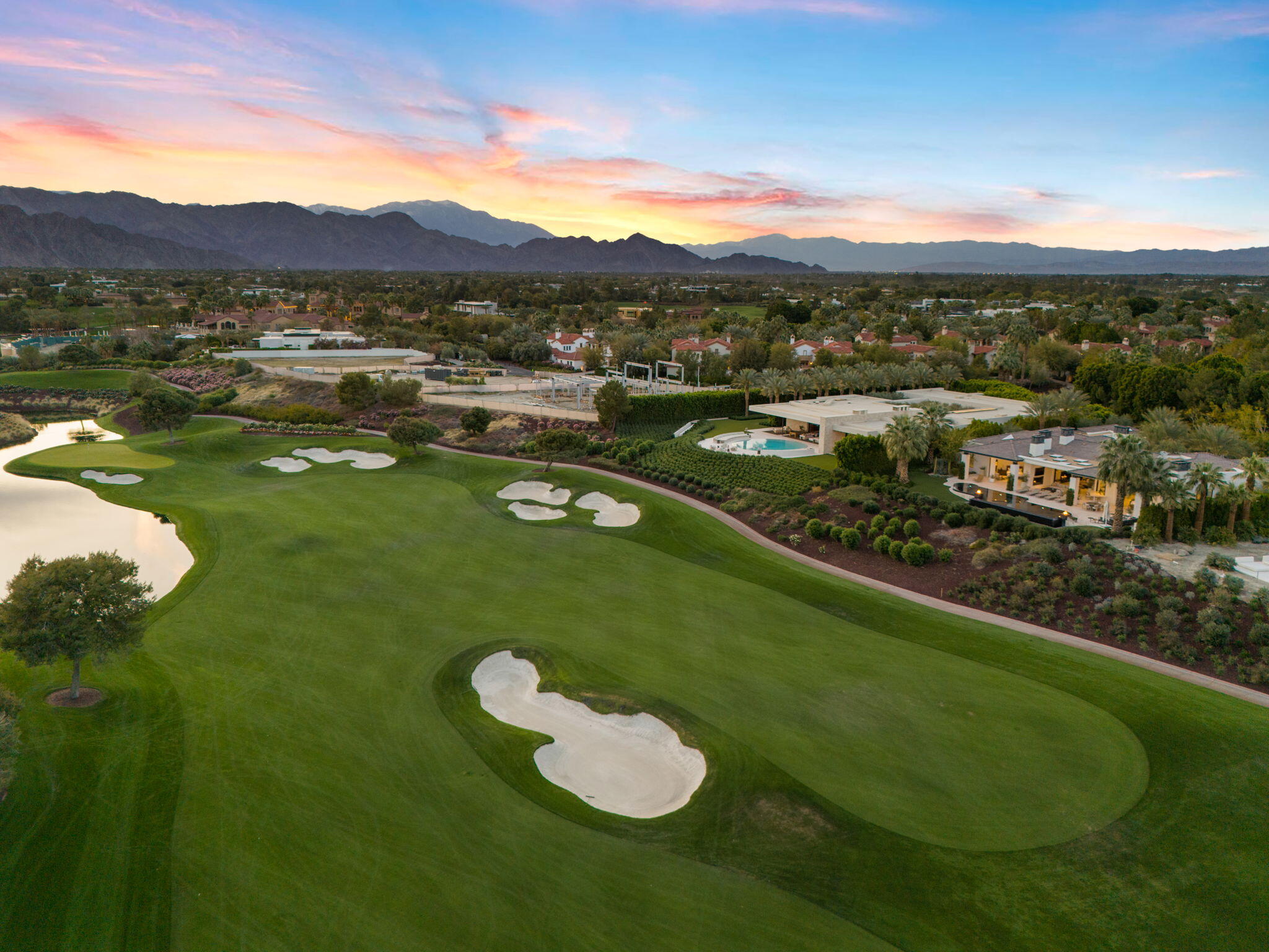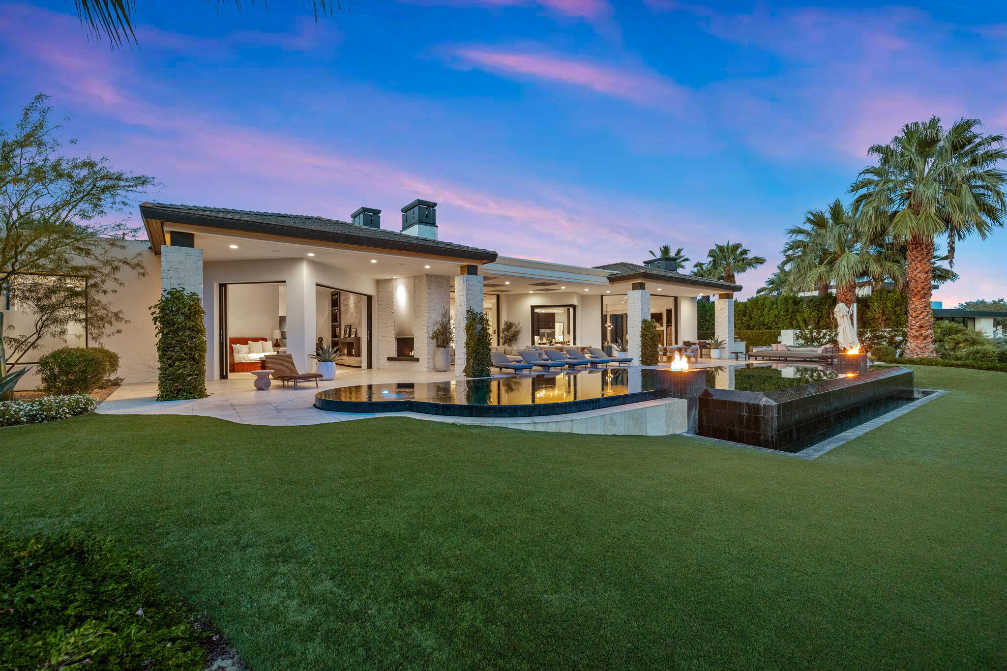 Casual Contemporary Sophistication Amidst Ultra-Exclusive Desert Private Golf Club!Experience the epitome of luxury living at the exclusive Madison Club, the Desert's crown jewel of Private Golf Club Communities. This sophisticated, yet casual, contemporary residence is perched on a premier elevated custom homesite that offers a front-row seat to the renowned Tom Fazio-designed course, overlooking holes 16 and 17 with beautifully contoured lush immaculate fairways and slick pure greens. Southern orientation captures the desert's winter sun and brilliant blue skies and the magnificence of the Santa Rosa Mountains. Floor-to-ceiling glass pocket doors in the living room, family room and primary bedroom that seamlessly blend indoor luxury with breathtaking outdoor panoramic vistas and sparkling infinity pool/spa. Comprising 5,978', this residence features 4 BD/5 BA, formal dining with glass wine-wall, casual dining options, office/media refuge and serene, mature landscapes. The home's interior is a testament to refined taste, with travertine floors, limestone counters and multiple fire features including 5 generous interior and exterior fireplaces and poolside fire pots to capture the essence of warmth and comfort. The elegant primary on-view suite offers ultimate privacy. Three ensuite guest bedrooms, plus shared lounge and multiple tranquil patios, ensure comfort for family and guests. The heart of the home seamlessly joins spacious living areas, epicurean kitchen with butler's pantry and central bar for family enjoyment and intimate gatherings. The Madison Club provides an ultra-exclusive lifestyle with unsurpassed community security. Additionally, Madison Club Members enjoy access to world-class amenities beyond golf and include premium clubhouse concierge services and home care, unparalleled staffing, multiple gourmet dining opportunities, a majestic Club pool, state of the art fitness and spa and a variety of popular racquet sports. Madison Club has establishInterested in this Listing?