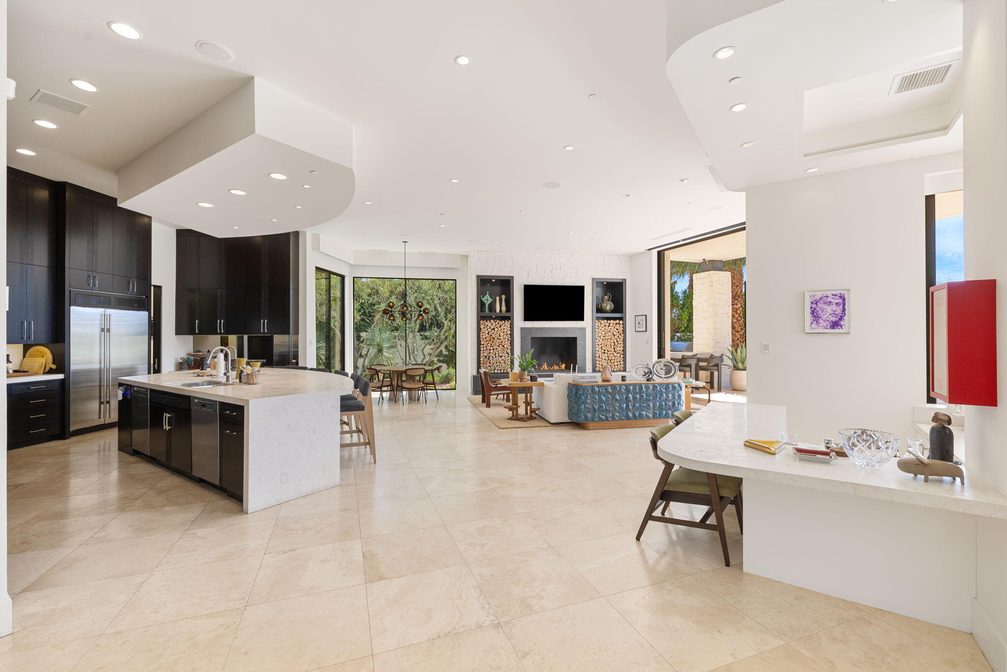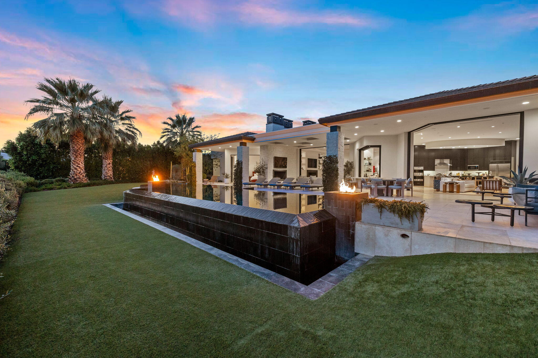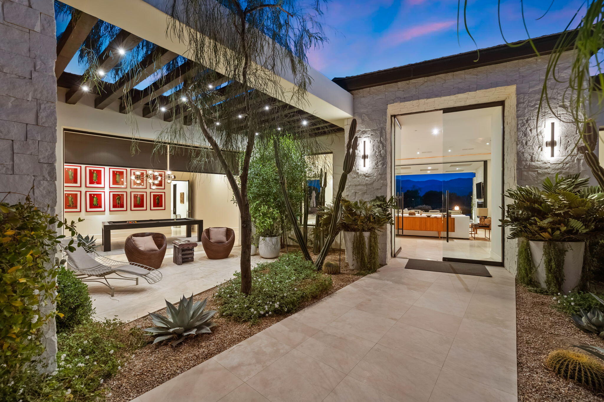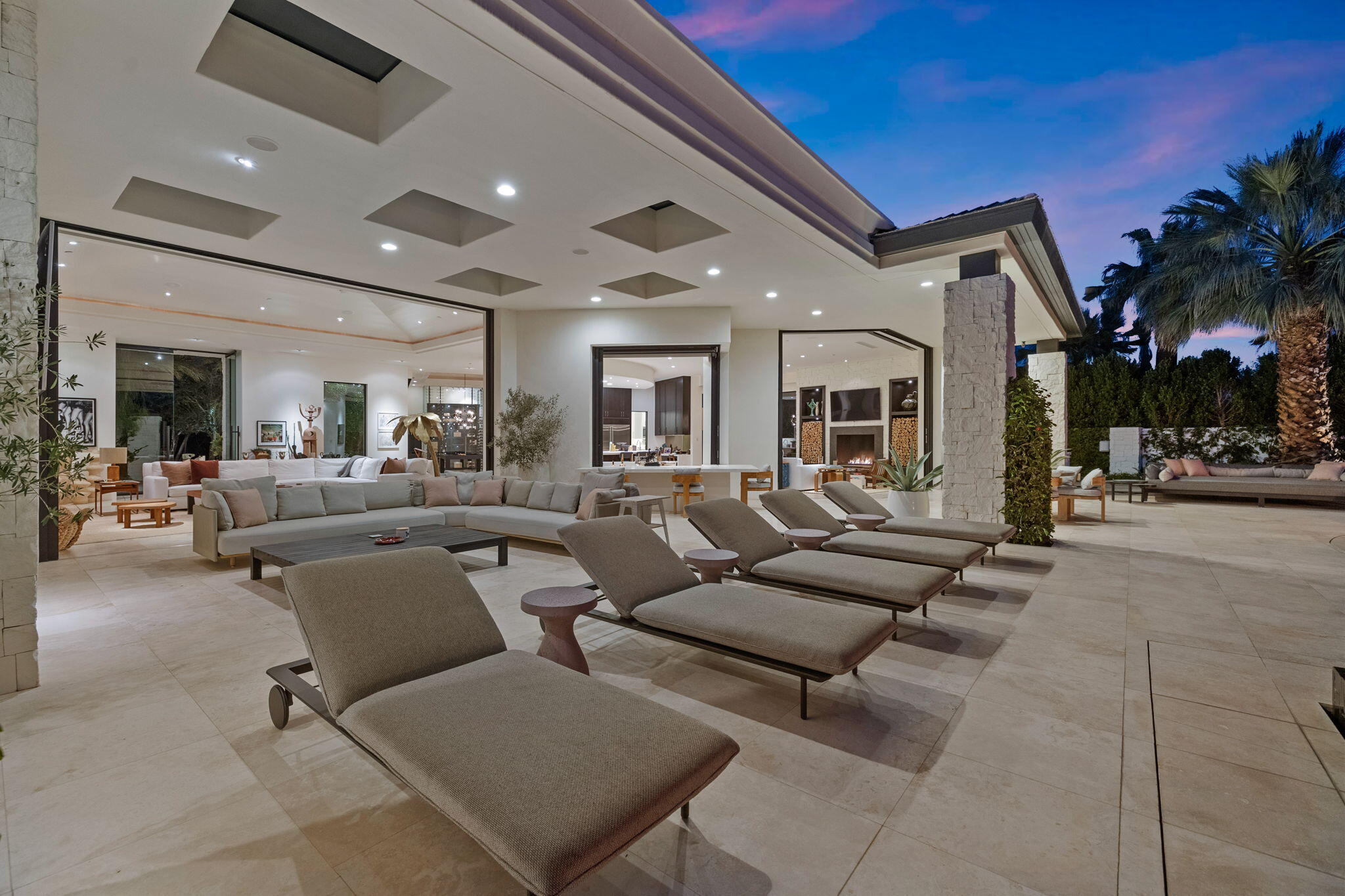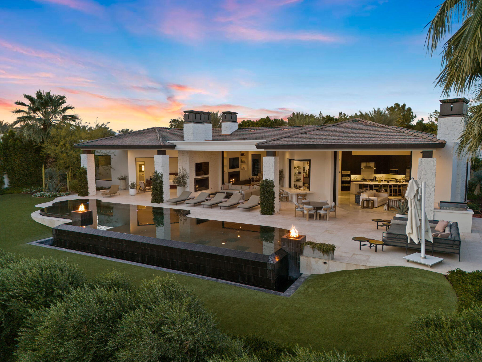 Casual Contemporary Sophistication Amidst Ultra-Exclusive Desert Private Golf Club!Experience the epitome of luxury living at the exclusive Madison Club, the Desert's crown jewel of Private Golf Club Communities. This sophisticated, yet casual, contemporary residence is perched on a premier elevated custom homesite that offers a front-row seat to the renowned Tom Fazio-designed course, overlooking holes 16 and 17 with beautifully contoured lush immaculate fairways and slick pure greens. Southern orientation captures the desert's winter sun and brilliant blue skies and the magnificence of the Santa Rosa Mountains. Floor-to-ceiling glass pocket doors in the living room, family room and primary bedroom that seamlessly blend indoor luxury with breathtaking outdoor panoramic vistas and sparkling infinity pool/spa. Comprising 5,978', this residence features 4 BD/5 BA, formal dining with glass wine-wall, casual dining options, office/media refuge and serene, mature landscapes. The home's interior is a testament to refined taste, with travertine floors, limestone counters and multiple fire features including 5 generous interior and exterior fireplaces and poolside fire pots to capture the essence of warmth and comfort. The elegant primary on-view suite offers ultimate privacy. Three ensuite guest bedrooms, plus shared lounge and multiple tranquil patios, ensure comfort for family and guests. The heart of the home seamlessly joins spacious living areas, epicurean kitchen with butler's pantry and central bar for family enjoyment and intimate gatherings. The Madison Club provides an ultra-exclusive lifestyle with unsurpassed community security. Additionally, Madison Club Members enjoy access to world-class amenities beyond golf and include premium clubhouse concierge services and home care, unparalleled staffing, multiple gourmet dining opportunities, a majestic Club pool, state of the art fitness and spa and a variety of popular racquet sports. Madison Club has establishInterested in this Listing?