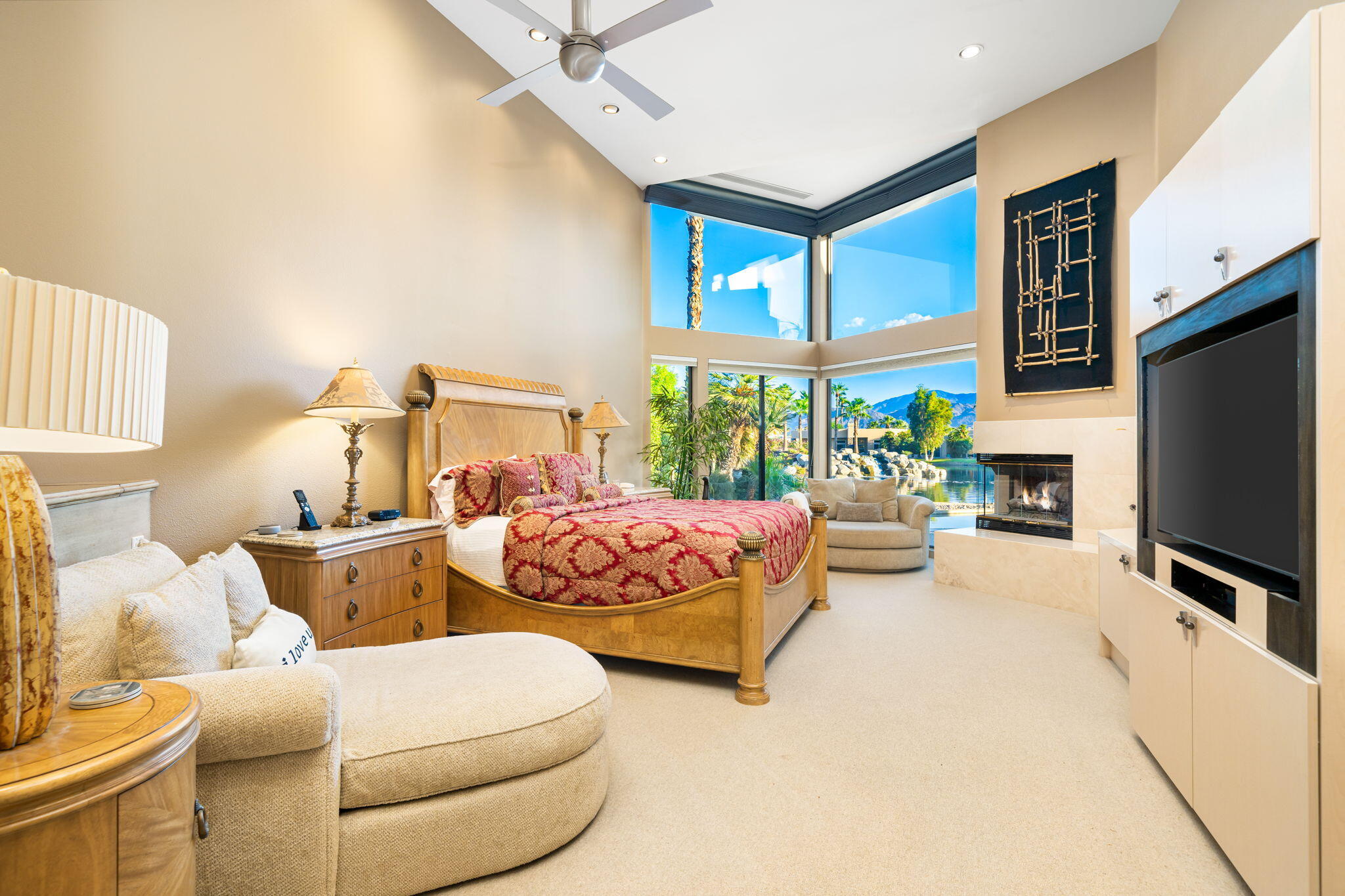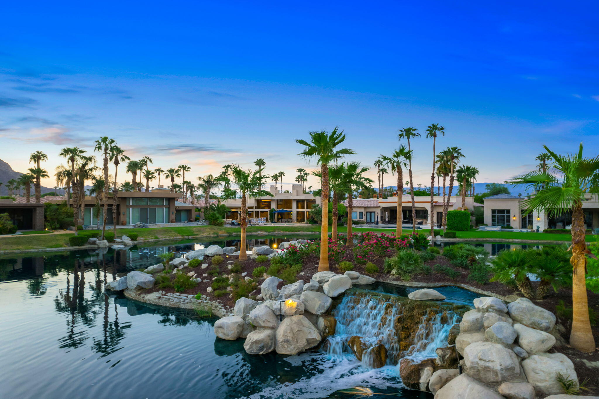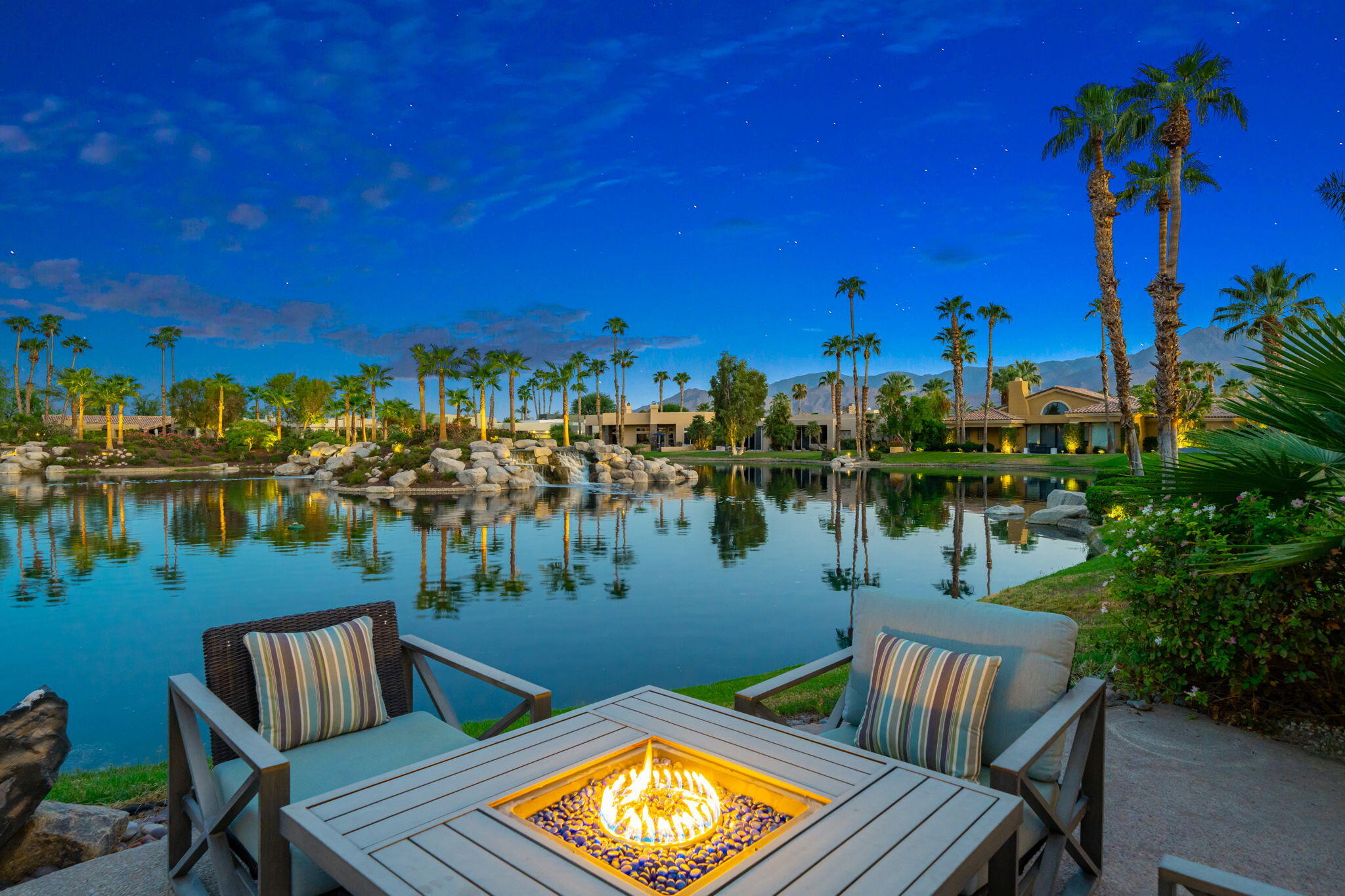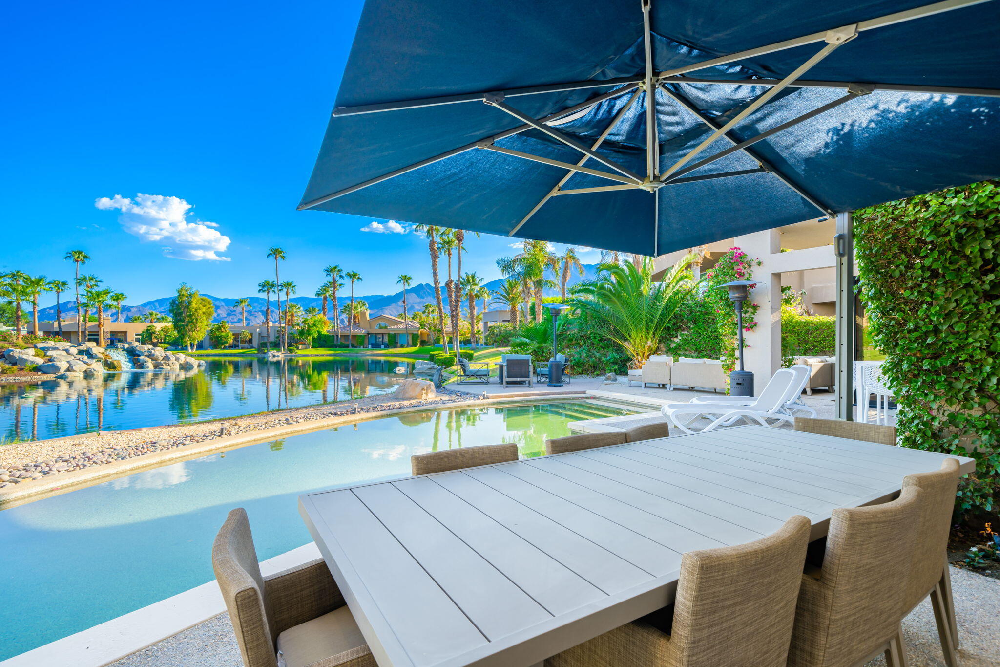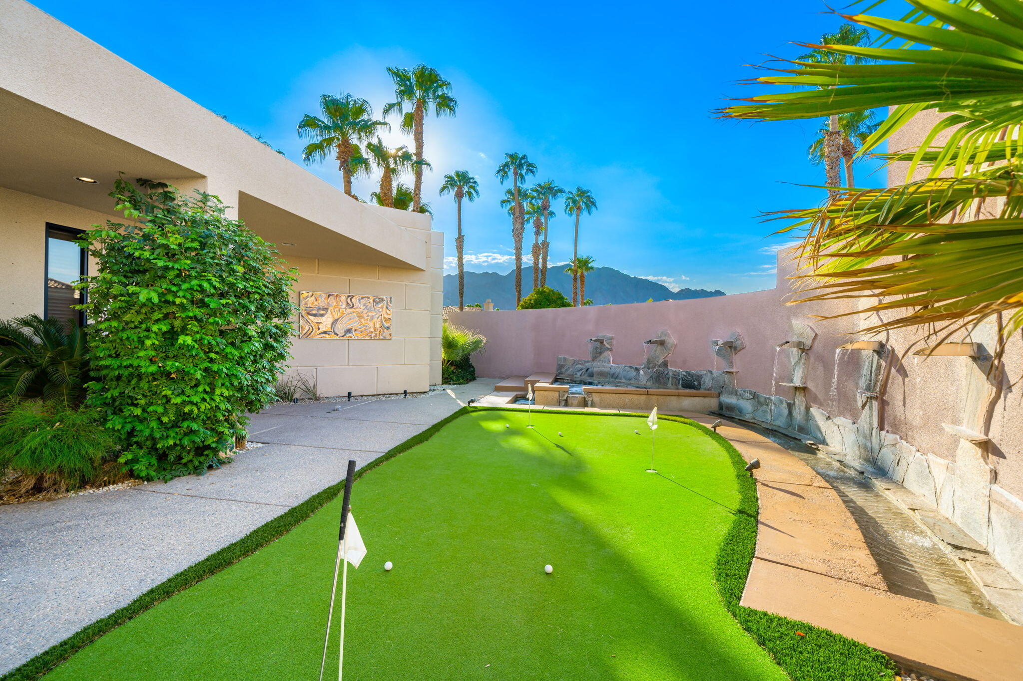 Nestled against the majestic Santa Rosa Mountains, PGA West Paradise offers an extraordinary escape that perfectly blends serenity and elegance. Designed by renowned architect Guy Dreier, this architectural masterpiece features sleek modern glass walls and a signature fireplace, framing breathtaking panoramic views from every room.The primary suite is a private sanctuary, boasting a cozy fireplace, dual-head shower, and a luxurious steam room, offering the ultimate space to unwind and recharge. The expansive living areas showcase picturesque lake and waterfall views, complemented by a seamless indoor-outdoor flow that epitomizes the desert lifestyle.Accommodations include two spacious guest bedrooms with a shared living area, ideal for hosting family or friends, and an office that overlooks a grand courtyard entrance, combining functionality with sophistication.Outside, the property elevates outdoor living with a private putting green, sparkling pool, relaxing spa, and built-in grill, making it perfect for entertaining or enjoying quiet evenings under the desert sky.Situated near world-class golf courses, fine dining, and endless recreational opportunities, PGA West Paradise is more than a home--it's a lifestyle. Don't miss the chance to own this sophisticated oasis. Schedule your private tour today and make this desert dream yours!Interested in this Listing?