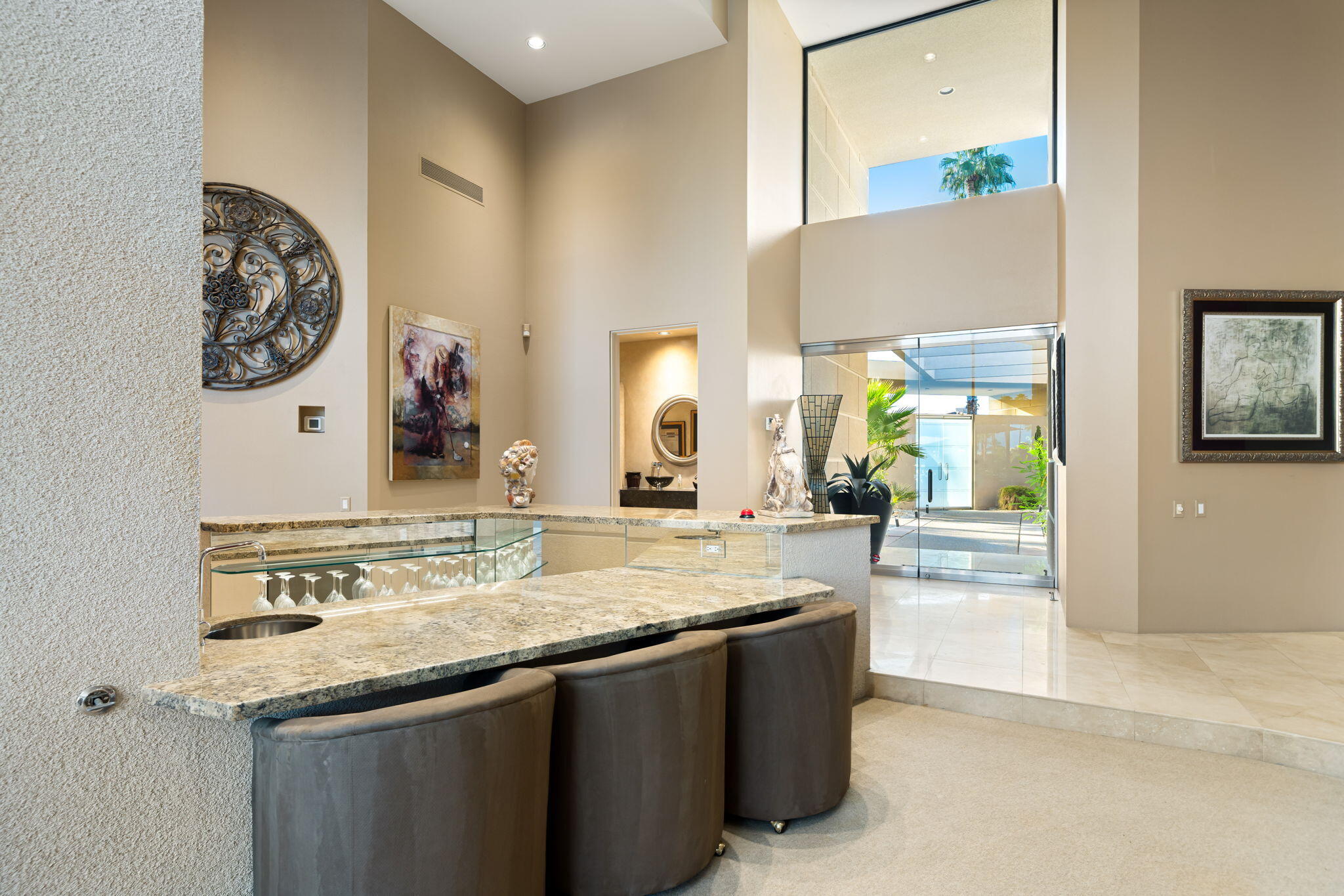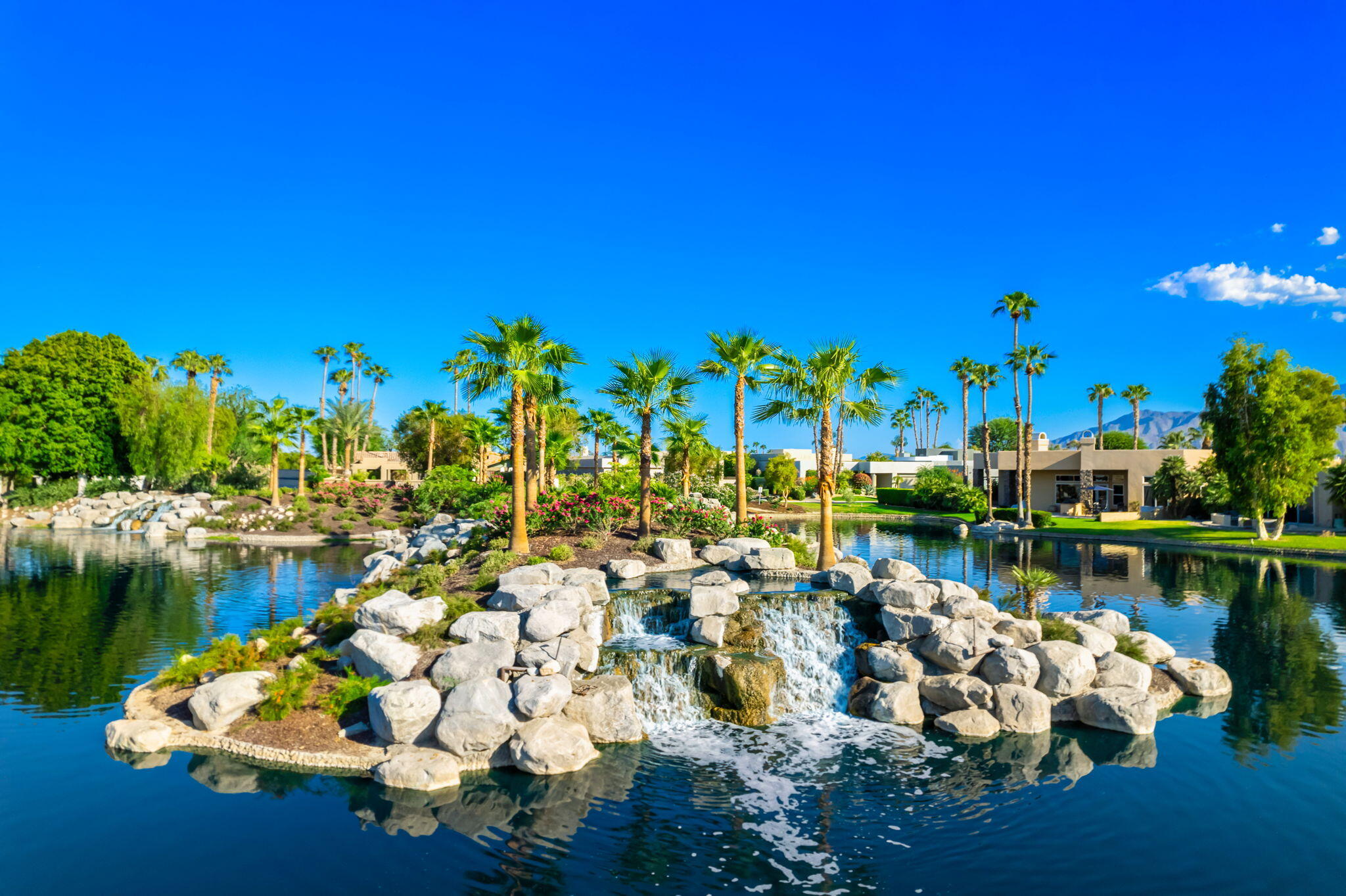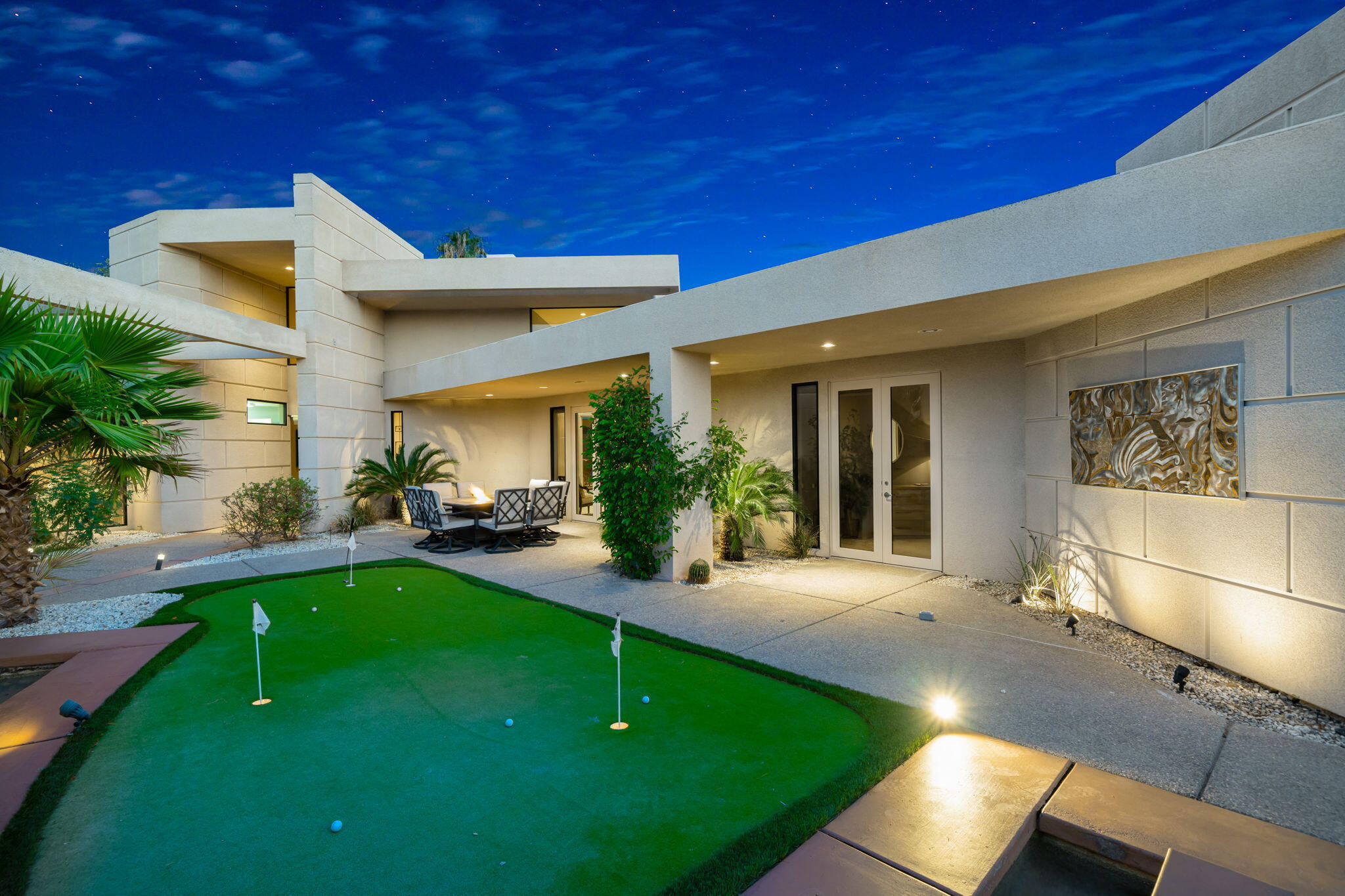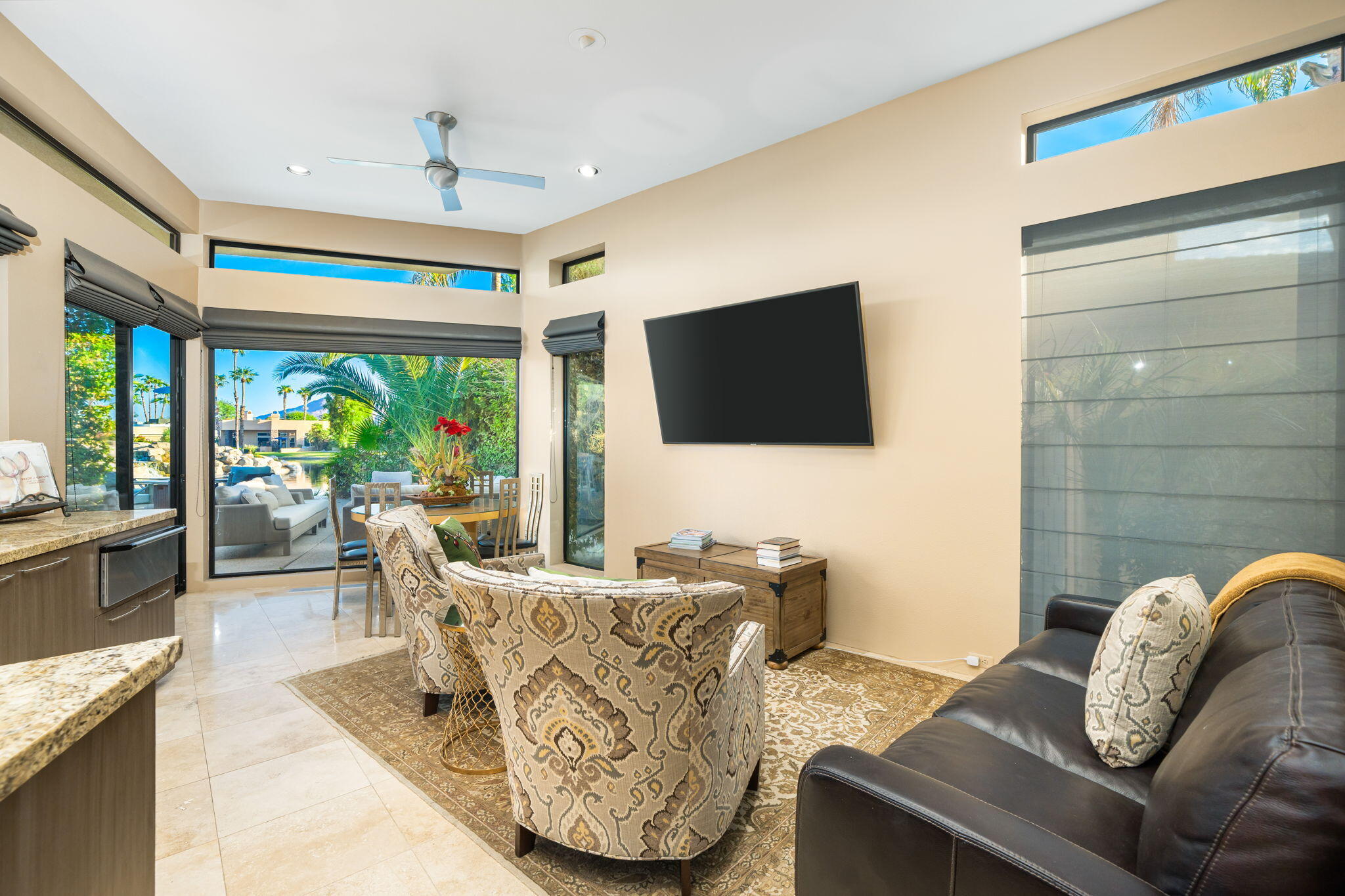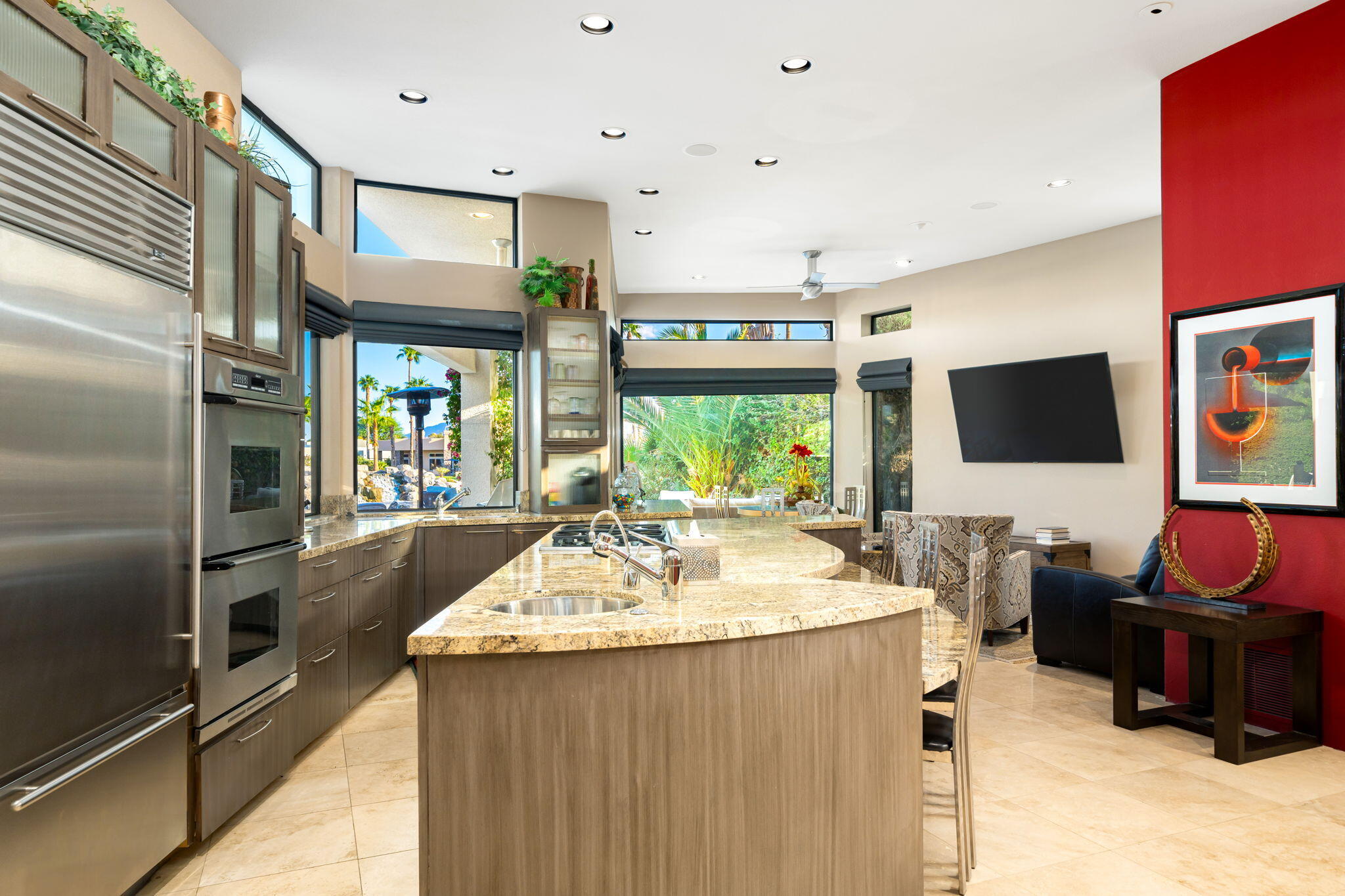 Nestled against the majestic Santa Rosa Mountains, PGA West Paradise offers an extraordinary escape that perfectly blends serenity and elegance. Designed by renowned architect Guy Dreier, this architectural masterpiece features sleek modern glass walls and a signature fireplace, framing breathtaking panoramic views from every room.The primary suite is a private sanctuary, boasting a cozy fireplace, dual-head shower, and a luxurious steam room, offering the ultimate space to unwind and recharge. The expansive living areas showcase picturesque lake and waterfall views, complemented by a seamless indoor-outdoor flow that epitomizes the desert lifestyle.Accommodations include two spacious guest bedrooms with a shared living area, ideal for hosting family or friends, and an office that overlooks a grand courtyard entrance, combining functionality with sophistication.Outside, the property elevates outdoor living with a private putting green, sparkling pool, relaxing spa, and built-in grill, making it perfect for entertaining or enjoying quiet evenings under the desert sky.Situated near world-class golf courses, fine dining, and endless recreational opportunities, PGA West Paradise is more than a home--it's a lifestyle. Don't miss the chance to own this sophisticated oasis. Schedule your private tour today and make this desert dream yours!Interested in this Listing?
