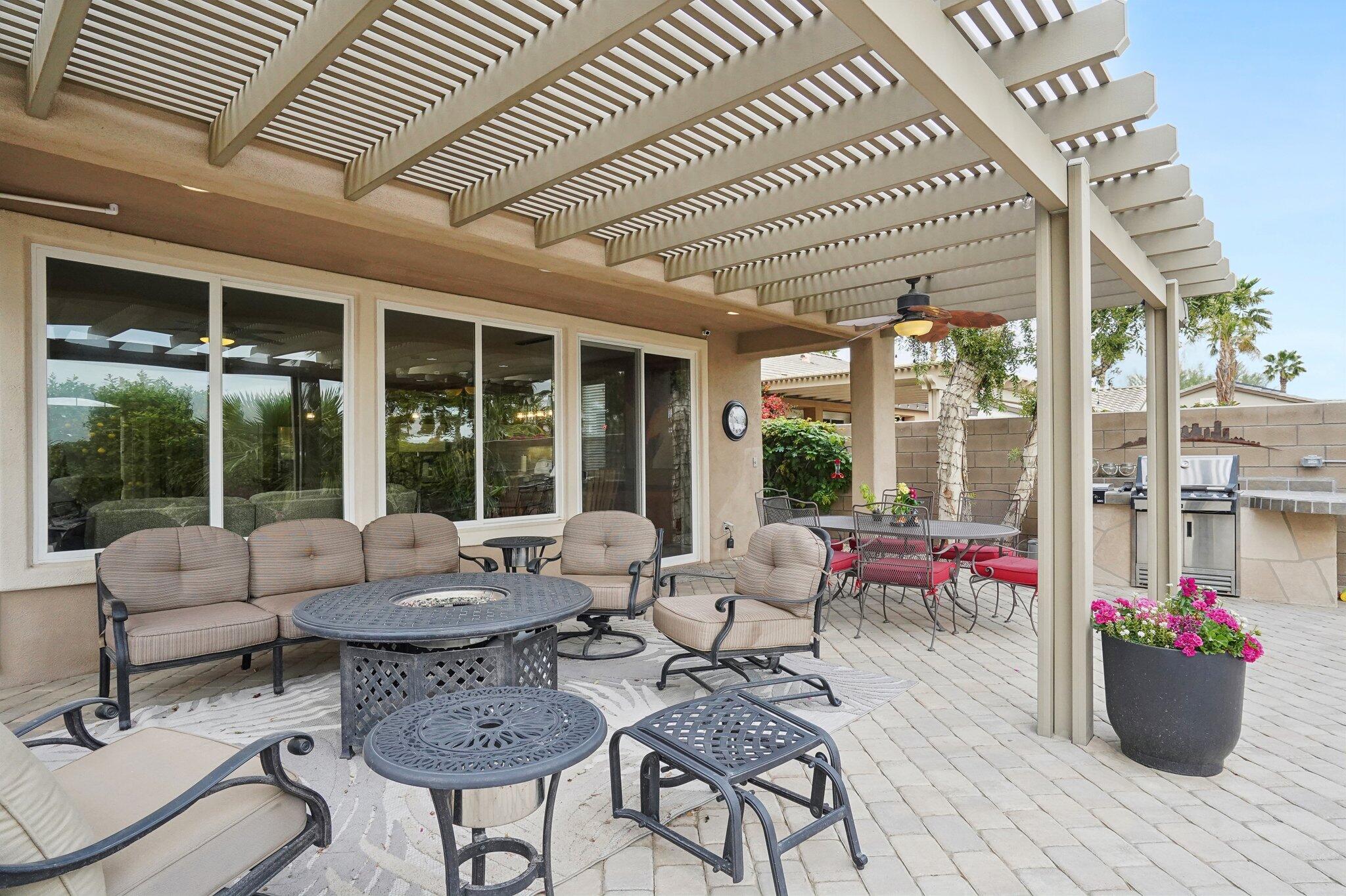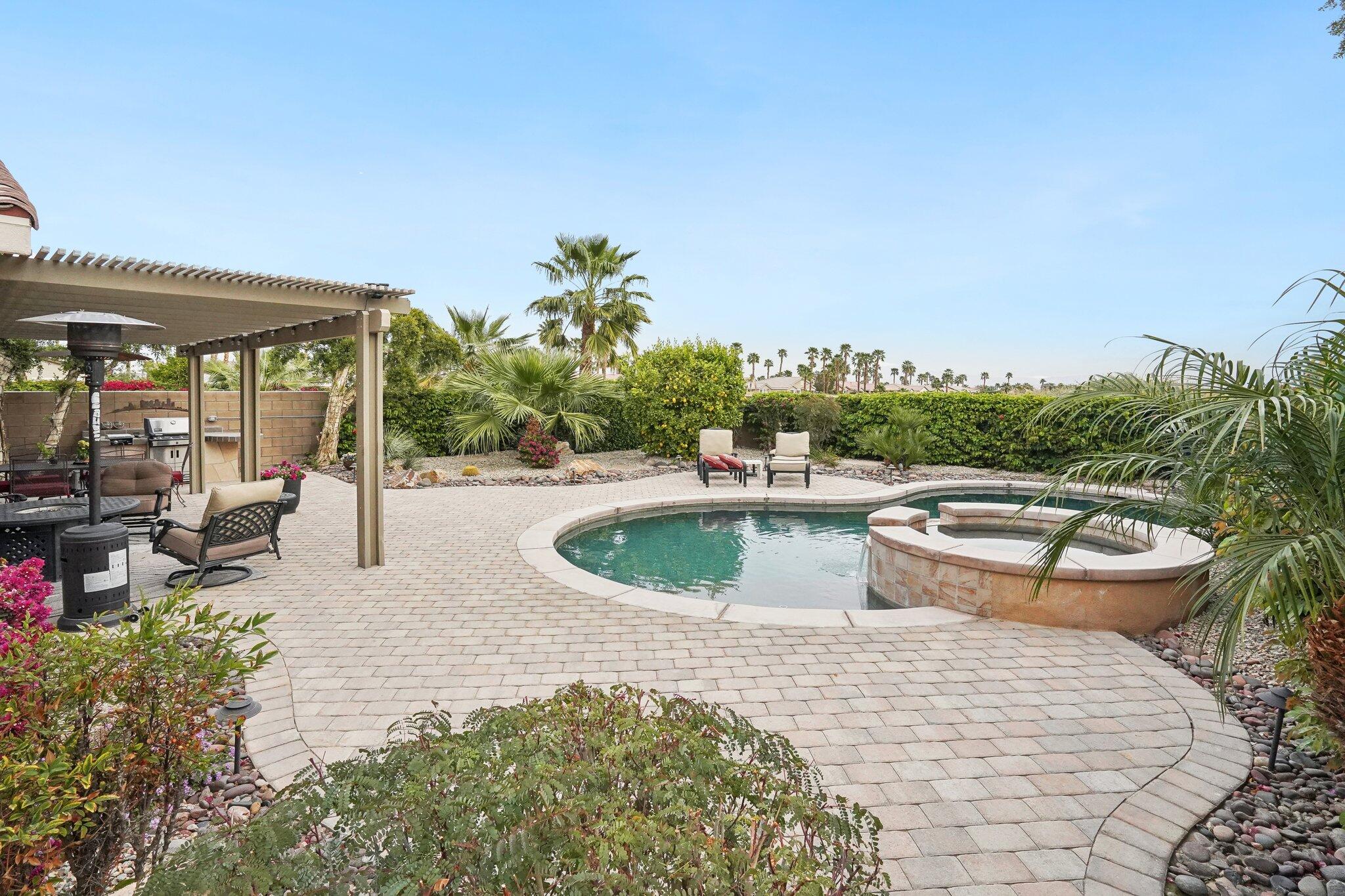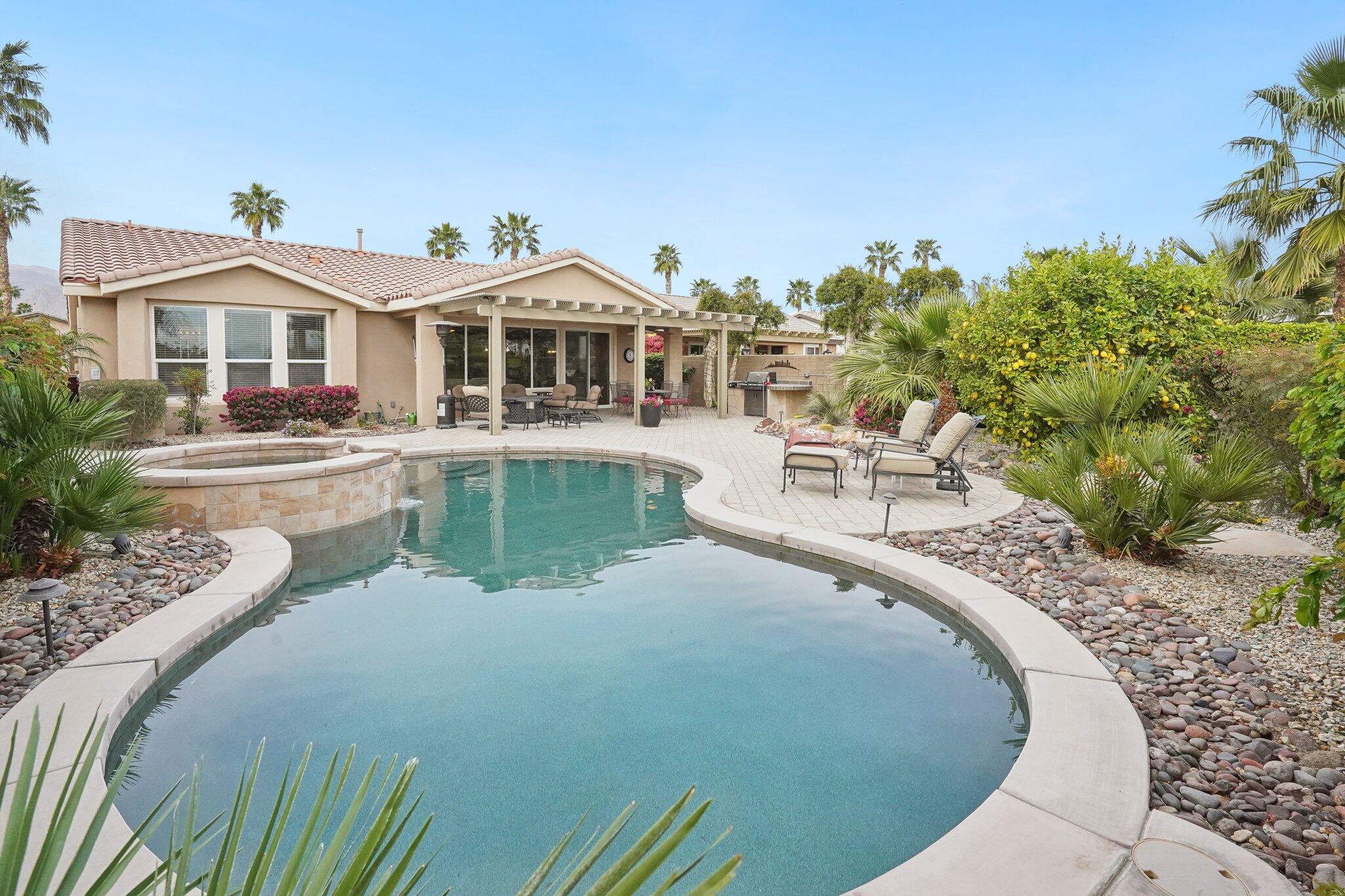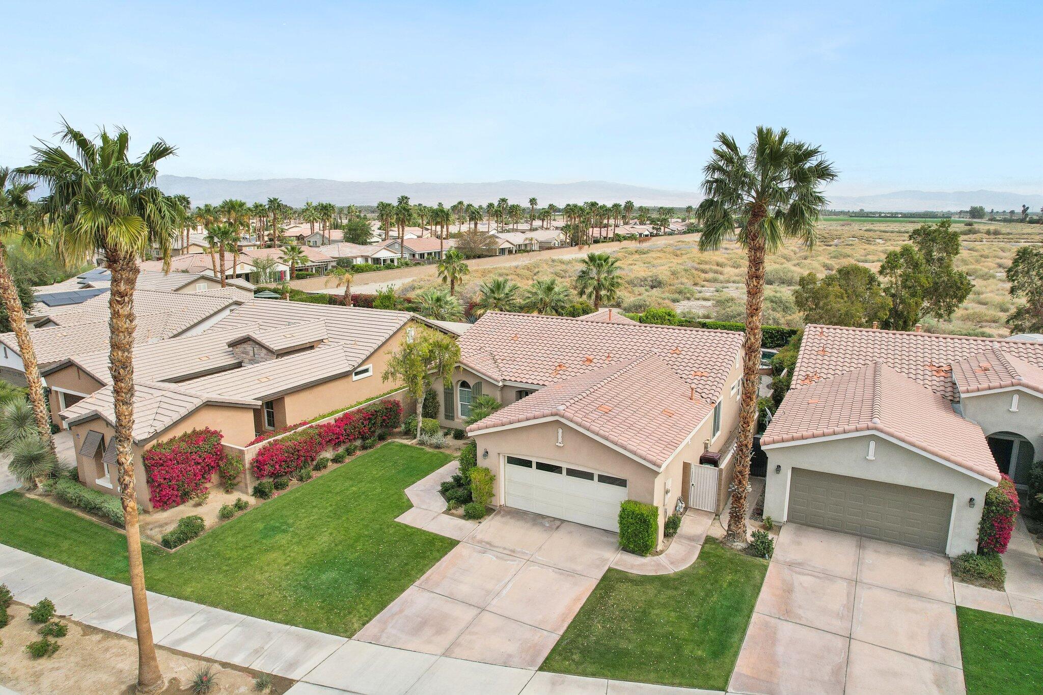 Welcome to the stunning Monterey plan in the exclusive, guard-gated Trilogy La Quinta 55+ resort community! This 1,693 sqft single-family gem boasts 2 bedrooms, 2 baths, and a versatile den/office with a chic barn door that could easily transform into a 3rd bedroom. The spacious great room is the perfect place to unwind, featuring a custom-built media wall with shelves and down-lighting, while the elegant dining area flows seamlessly into the open-concept kitchen, complete with stainless steel appliances, a 5-burner gas range with custom hood, quartz countertops and backsplash, a large prep island with pendant lighting and ample seating, and a convenient pantry. The private guest suite offers a peaceful retreat, with full bath, and the primary bedroom features a bay window, a luxurious en suite with dual sinks, an oversized shower with a bench, and a walk-in closet. Step outside to your own entertainer's paradise, with a large covered patio, expansive paver deck, professionally designed landscaping, and a sparkling Pebble Tec pool with a tanning shelf, umbrella receiver, and a tile-encased spa. The custom BBQ station with bar seating completes this outdoor oasis, all while offering breathtaking views of the Chocolate Mountains! Enjoy close proximity to the Santa Rosa Clubhouse and the myriad of offered amenities.Interested in this Listing?