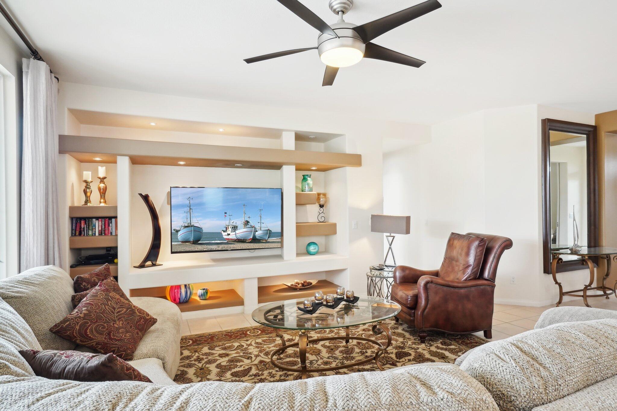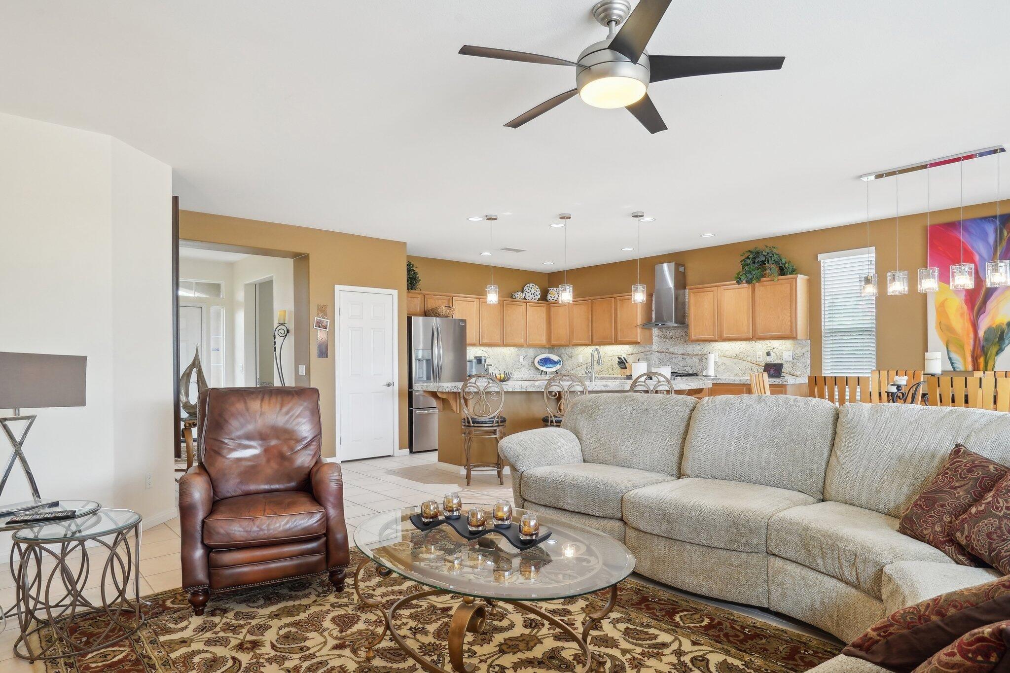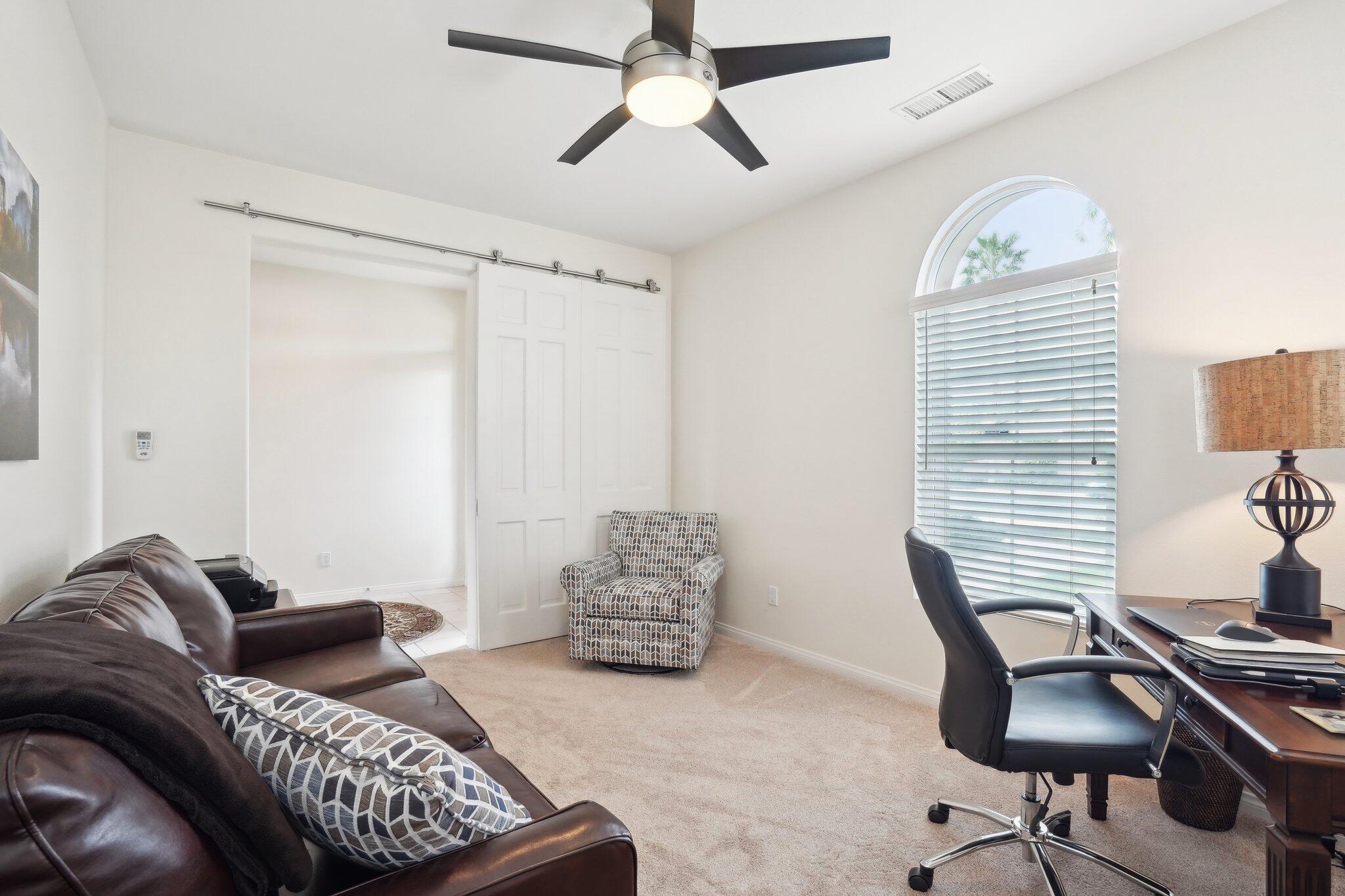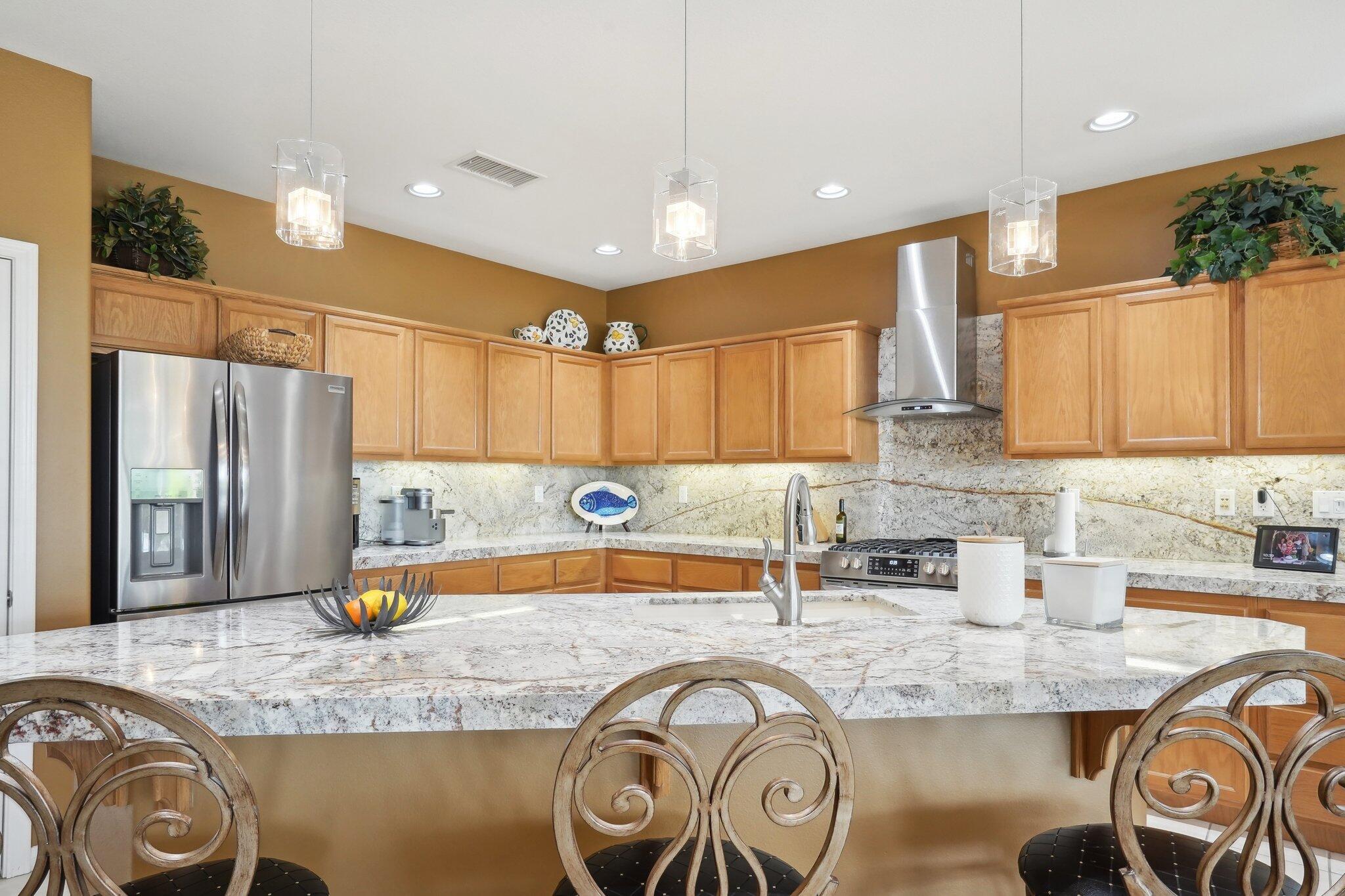 Welcome to the stunning Monterey plan in the exclusive, guard-gated Trilogy La Quinta 55+ resort community! This 1,693 sqft single-family gem boasts 2 bedrooms, 2 baths, and a versatile den/office with a chic barn door that could easily transform into a 3rd bedroom. The spacious great room is the perfect place to unwind, featuring a custom-built media wall with shelves and down-lighting, while the elegant dining area flows seamlessly into the open-concept kitchen, complete with stainless steel appliances, a 5-burner gas range with custom hood, quartz countertops and backsplash, a large prep island with pendant lighting and ample seating, and a convenient pantry. The private guest suite offers a peaceful retreat, with full bath, and the primary bedroom features a bay window, a luxurious en suite with dual sinks, an oversized shower with a bench, and a walk-in closet. Step outside to your own entertainer's paradise, with a large covered patio, expansive paver deck, professionally designed landscaping, and a sparkling Pebble Tec pool with a tanning shelf, umbrella receiver, and a tile-encased spa. The custom BBQ station with bar seating completes this outdoor oasis, all while offering breathtaking views of the Chocolate Mountains! Enjoy close proximity to the Santa Rosa Clubhouse and the myriad of offered amenities.Interested in this Listing?