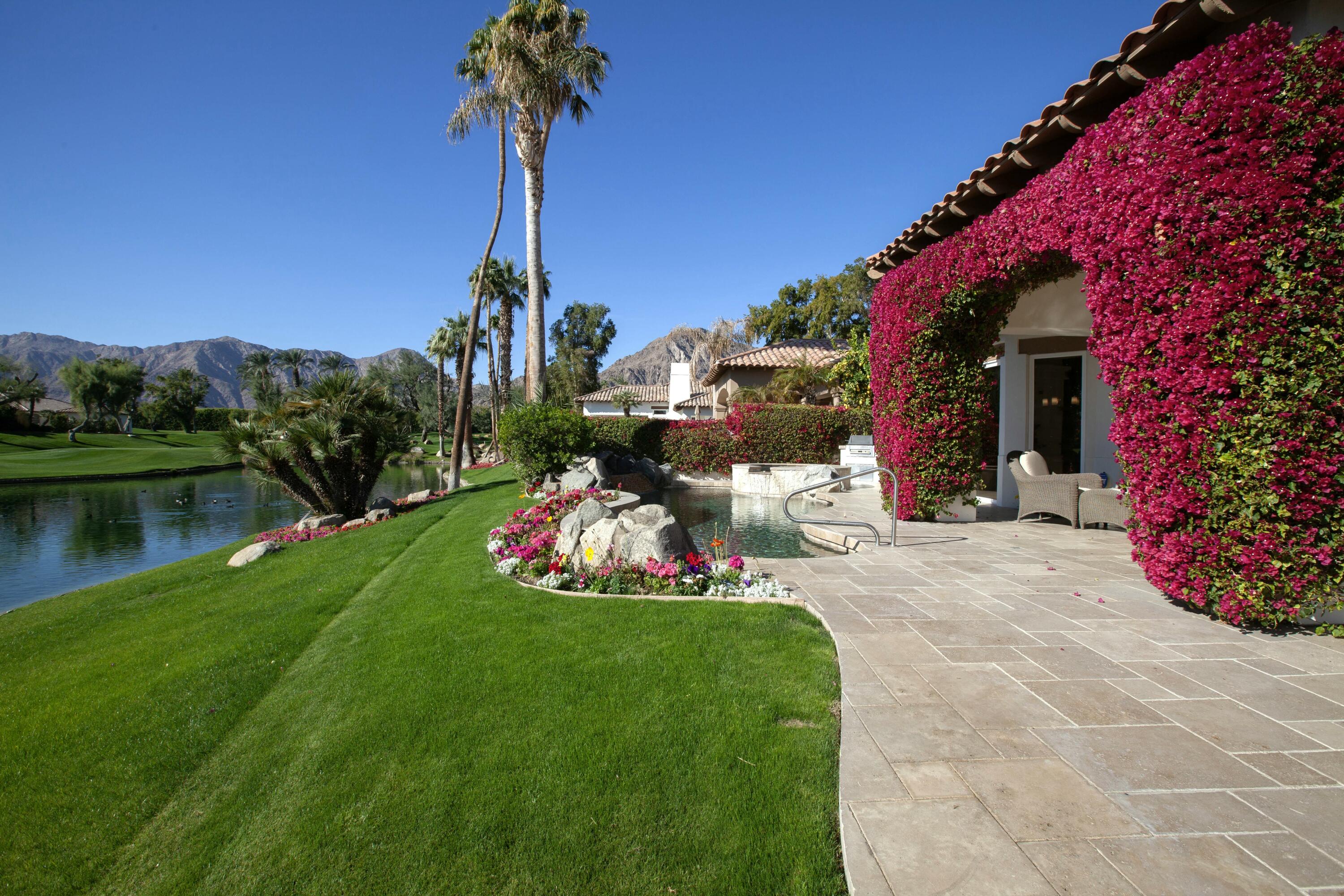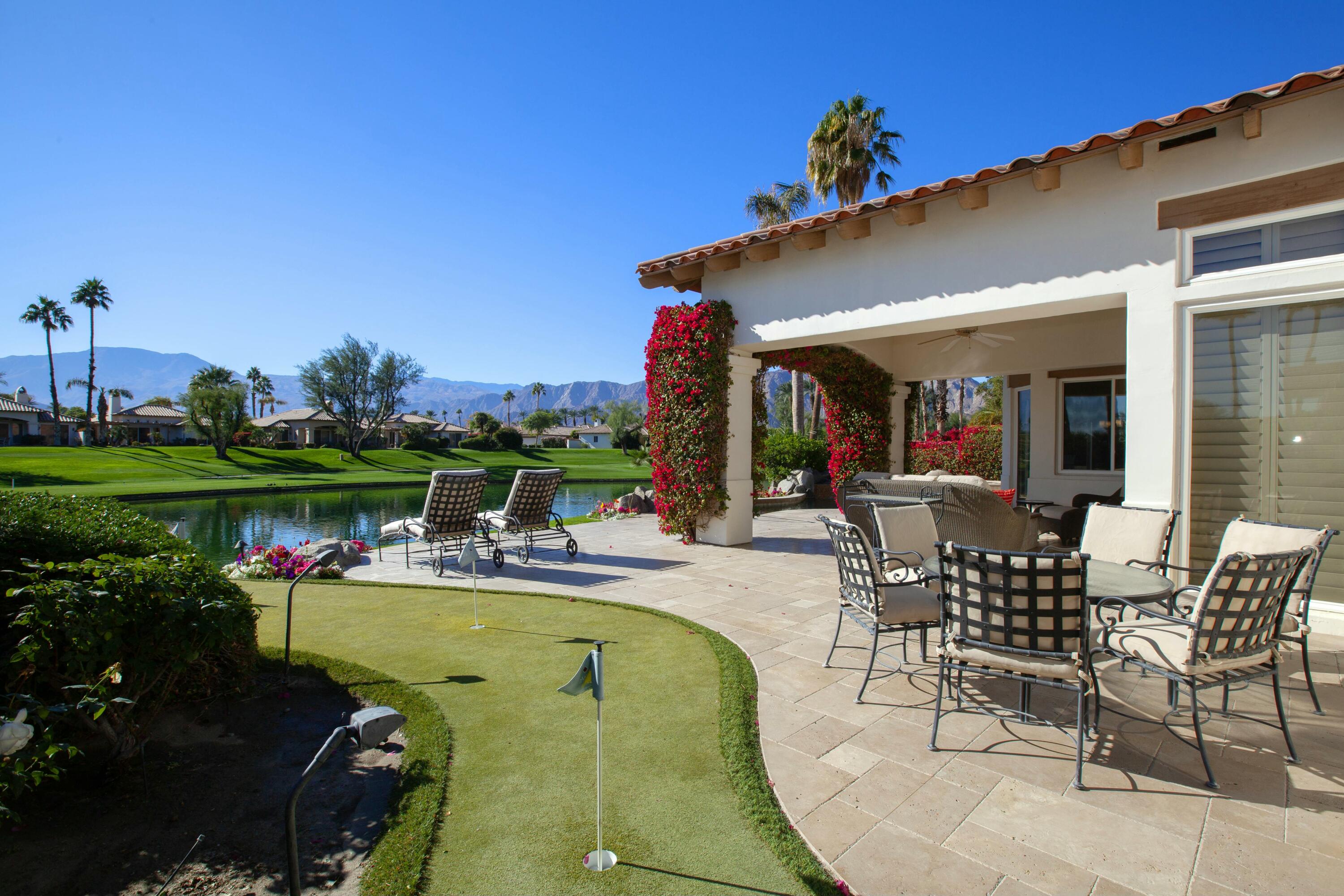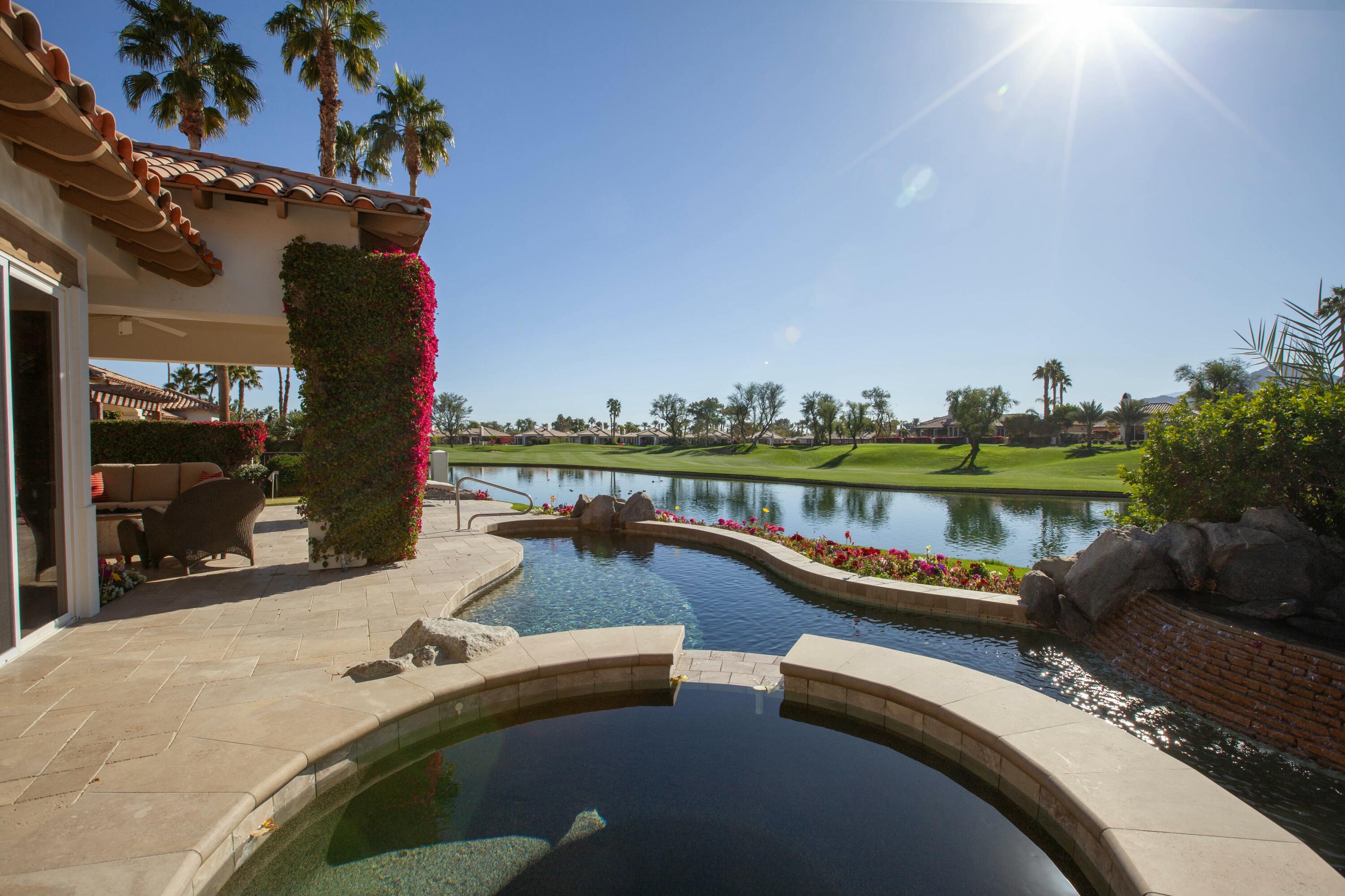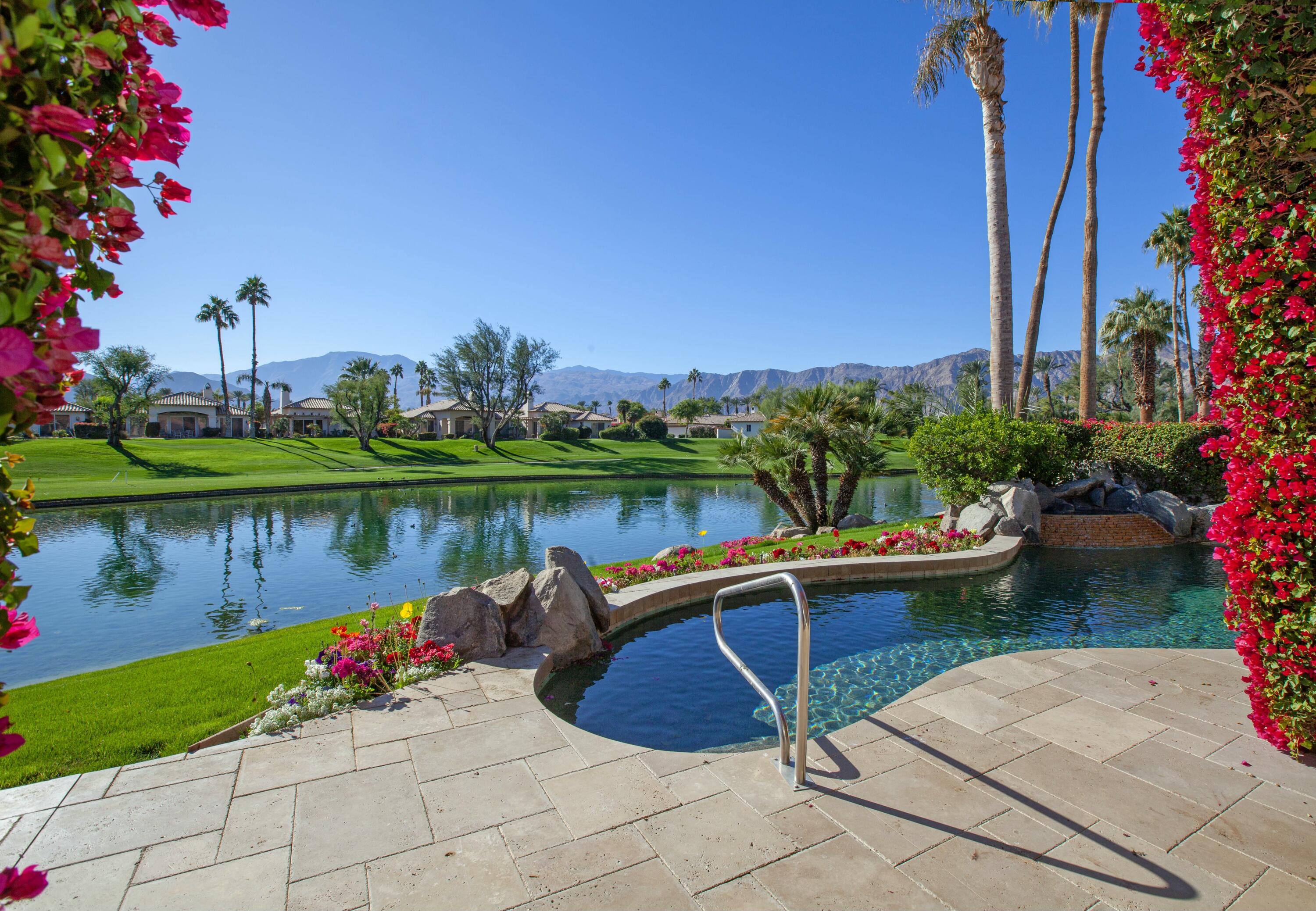 Set before a lake with panoramic South-facing Santa Rosa Mountain views, this incredible Hacienda 2 Plan is the idyllic lakeside setting for seasonal or year-round residents. Set well back from the street and accessed through a private courtyard entry with custom pavers, the home features numerous entertaining and living atmospheres that all take advantage of the incredible lake, golf course and mountain views. Features such as marble flooring, shutters, crown moulding and rich wood millwork create a tone of quality while volume ceilings and large walls of glass invite the outdoors and deliver an open and airy feel. An entertainer will appreciate the custom wetbar and adjacent formal dining room while steps away, one room has been converted into a billiard parlor that overlooks the lake and opens directly to a custom putting green. The chef's kitchen features a large center island, extensive use of granite, lake views and updated appliances - It's here you also find a waterfront morning room that's great for small meals or reading the paper. The main bedroom suite is ultra private and offers shutters, moulding and an incredible media area - steps away the main bath has a jetted tub, dual sinks, private commode and a massive walk-in closet. Additional features include a covered outdoor living area with fireplace and extensive nocce decking; freeform waterfront pool and spa with spectacular mountain views, bbq; detached guest house. New concrete garage floor & epoxy finish. Back on the Market, no fault of the sellers,Interested in this Listing?