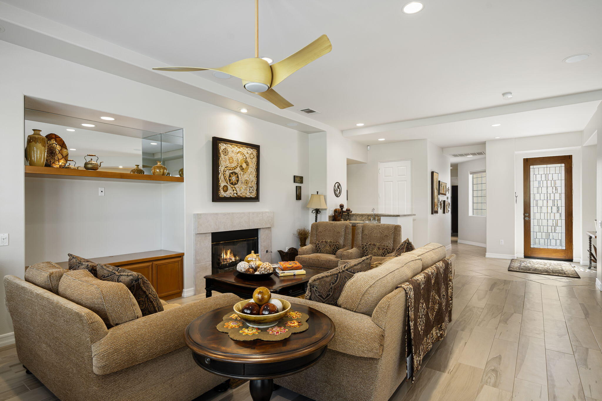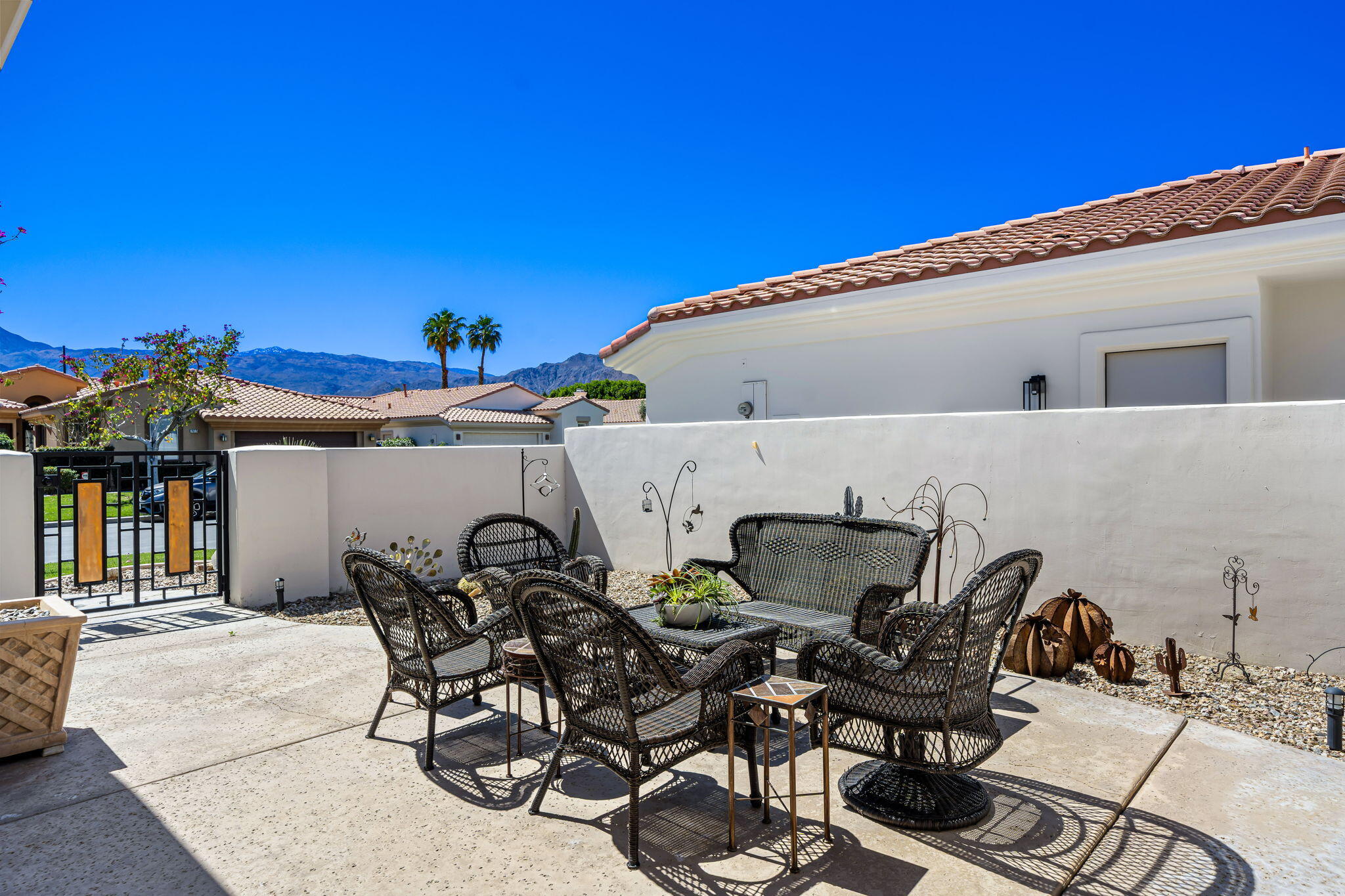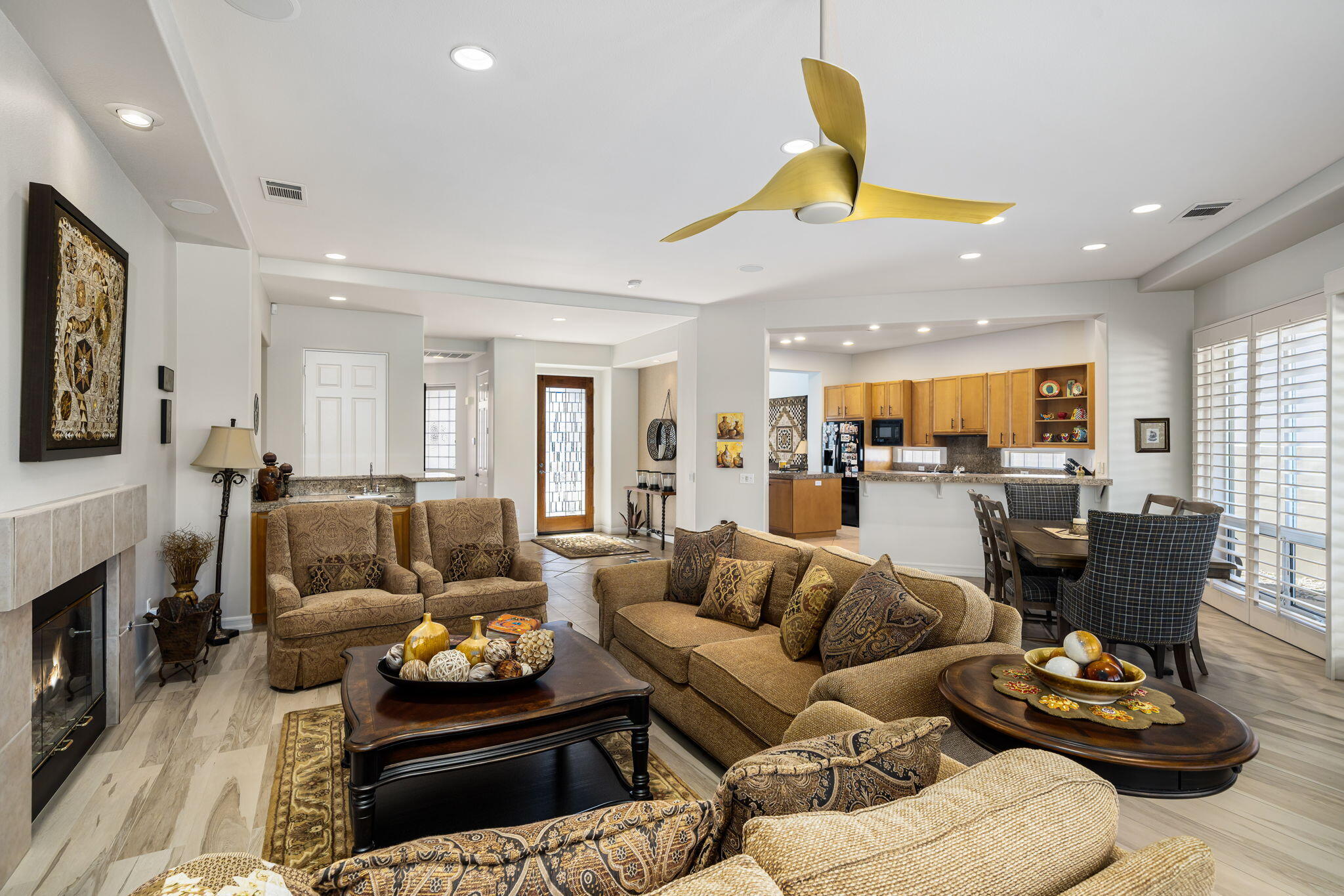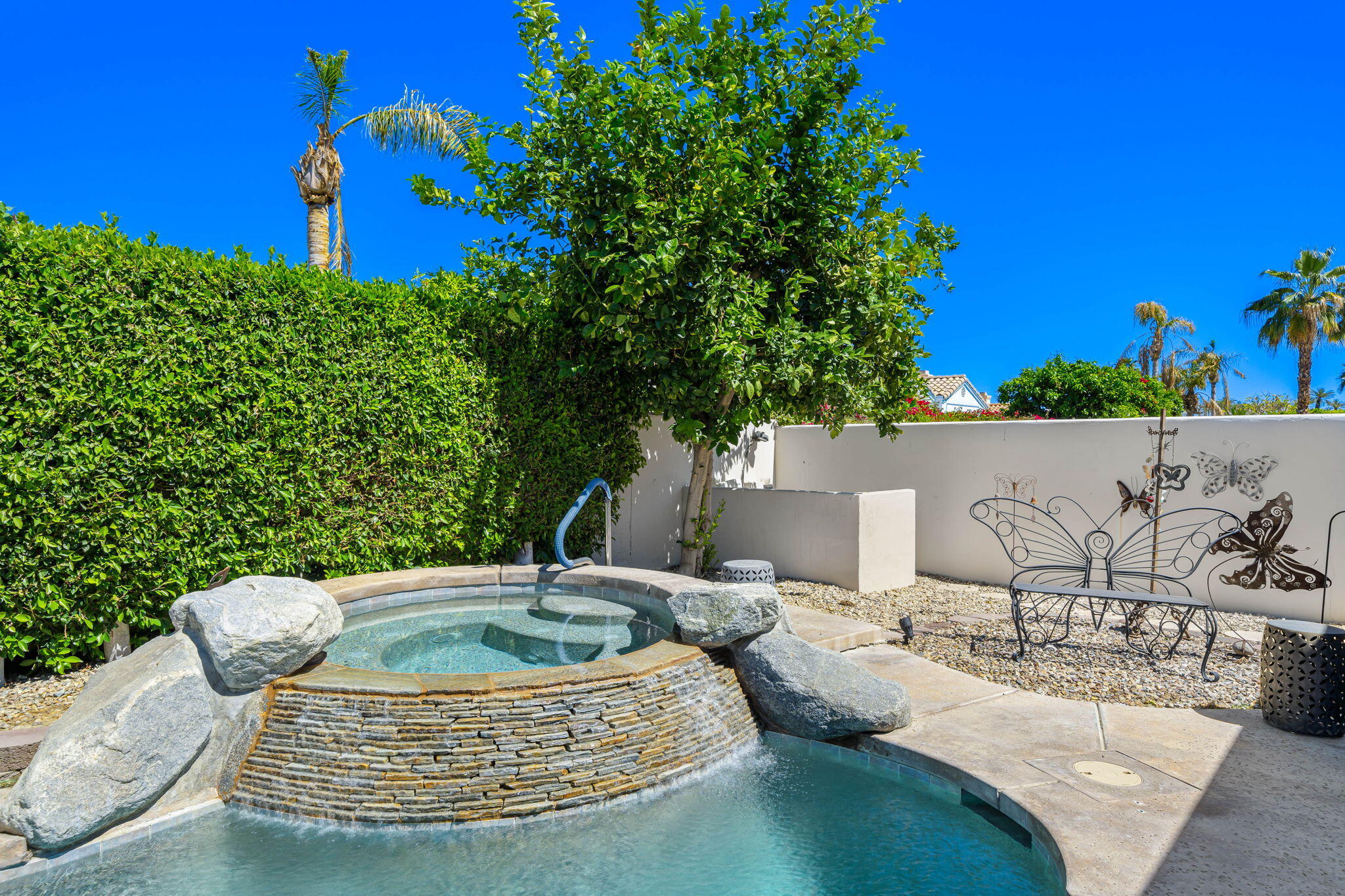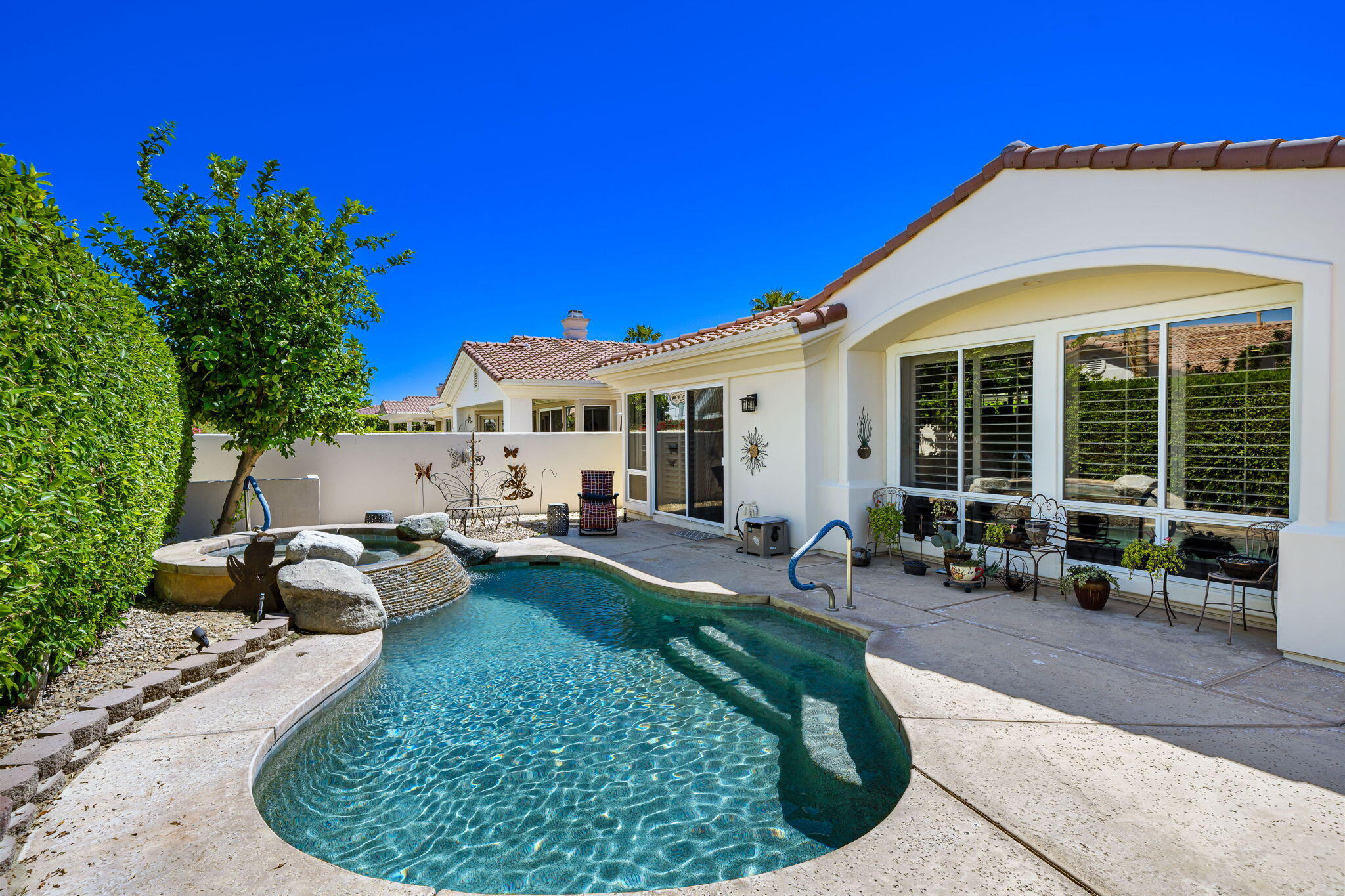 This sought-after floorplan is the largest home currently available in La Quinta Fairways, one of four key associations affiliated with PGA West. The spacious courtyard entry offers stunning south-facing mountain views, creating a warm and inviting first impression. A glass front door welcomes natural light into the foyer and expansive great room beyond.The home features light wood-look porcelain tile flooring, seamlessly blended with diagonal tiles throughout. Painted wood shutters adorn most windows and doors, adding charm and character. Each generously sized bedroom includes an en-suite bath, ensuring comfort and privacy for all. The third bedroom has french doors to the courtyard and can serve as an attached casita. The luxurious primary suite boasts direct access to the backyard, where a pool and spa provide a private retreat. Drift off to sleep with the soothing sound of the spa waterfall just outside your window. The garage is temperature controlled with a mini-split and the flooring is custom installed rubber tiles in shades of gray. Lucky cars! Meticulously maintained, this home is a true gem in La Quinta Fairways, a guard gated community located conveniently in the middle of La Quinta, close to restaurants, groceries and shops.Interested in this Listing?
