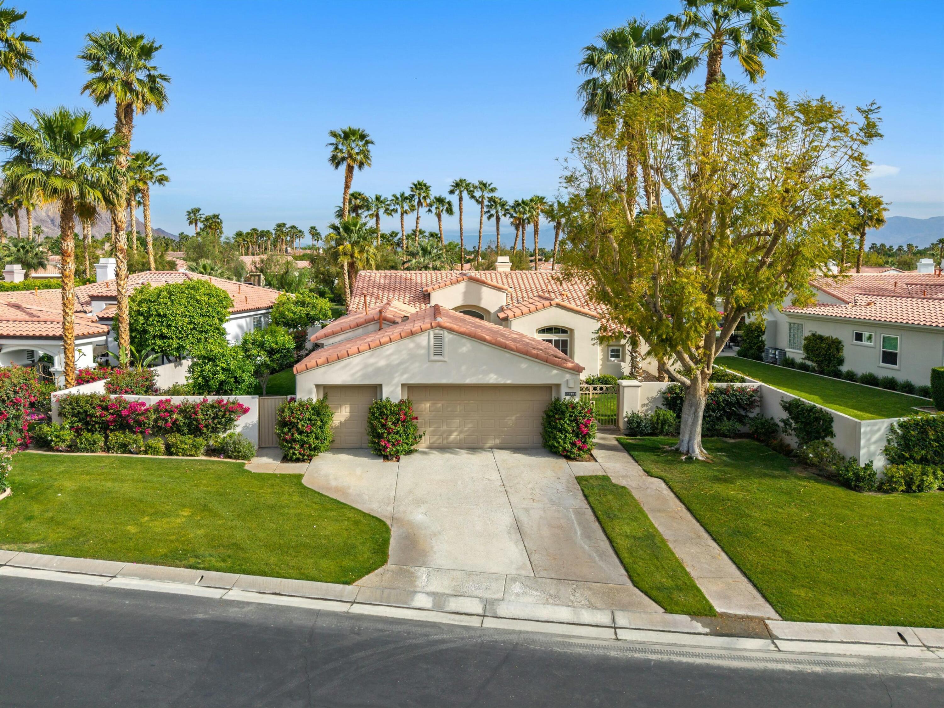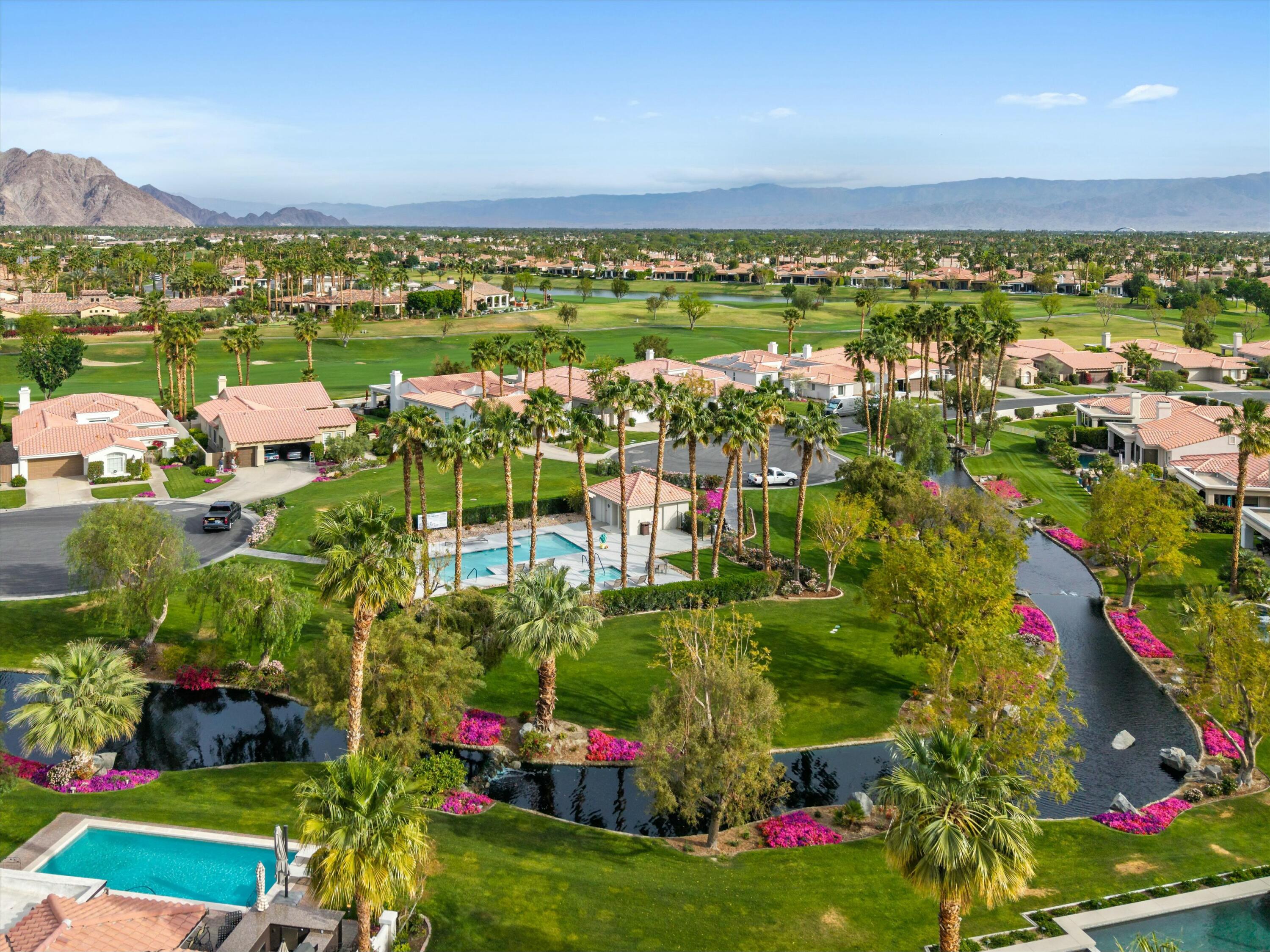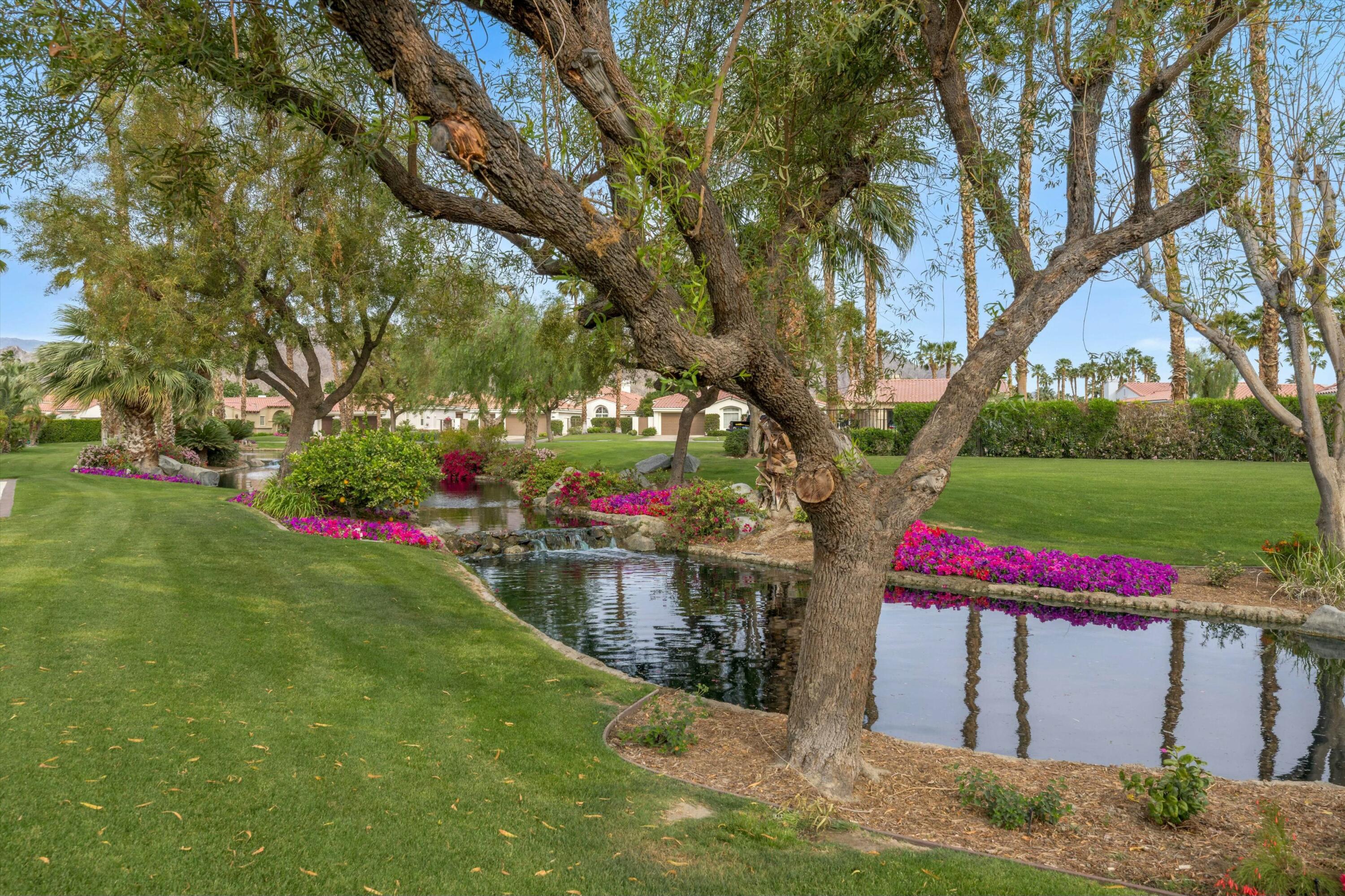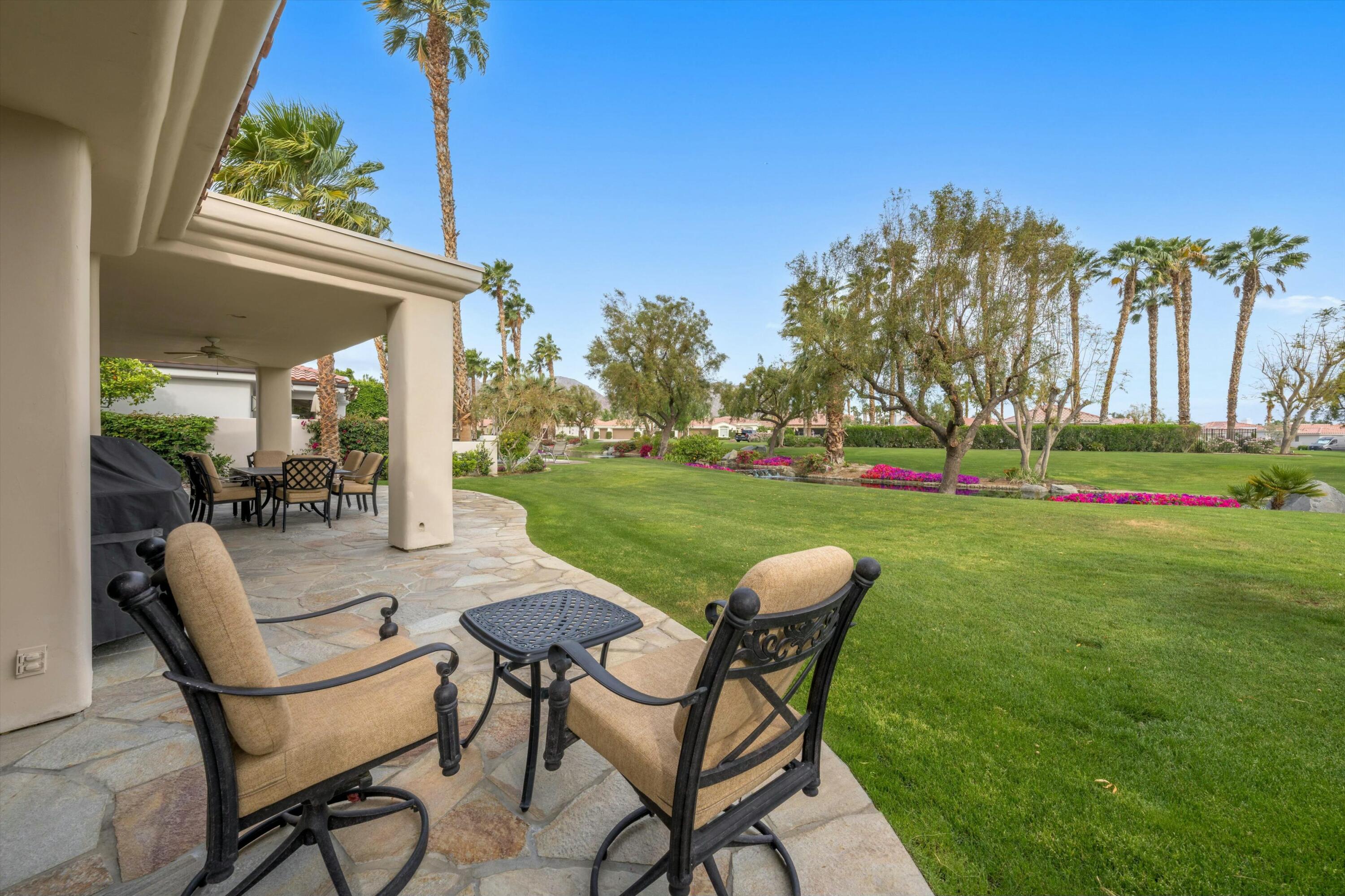 Welcome to the prestigious Weiskopf Residential area inside the gates of the world-famous PGA West. This Ryder One floor plan home features a spacious 2100 sq ft floor plan with 3 bedrooms and 3 baths, situated on a unique and private waterfront setting. The serene water views add to the peaceful ambiance of the beautifully landscaped backyard which boasts lush green grass, mature shade trees, picturesque mountain views and a generously sized side yard. Upon entering, you'll be greeted by an open-concept great room, highlighted by a large quartz center kitchen island and expansive windows that frame the stunning backyard views. The great room also features a wet bar and a dedicated dining area, perfect for entertaining. The primary suite offers a tranquil retreat with direct backyard access through oversized patio door, a spacious walk-in closet, dual vanity, separate tile shower and luxurious soaking tub. The second bedroom includes its own en-suite bathroom, while the 3rd bedroom offers the flexibility to be used as a guest room, den or office. A separate laundry room completes the interior of this very clean home.Residents also enjoy access to a sizable community pool/spa, just a short walk away. PGA West is known as the Western Home of Golf, offering 6 professional golf courses- 3 private and 3 open to the public. The community features three distinct clubhouses, each with its own unique character, along with state-of-the-art sports and fitness center exclusively for members. Additionally nearby attractions include world class equestrian center and renowned polo fields home to the Coachella and Stagecoach Music Festivals. This home has the premium pool sized lot and location to be a very special place to call home.Interested in this Listing?