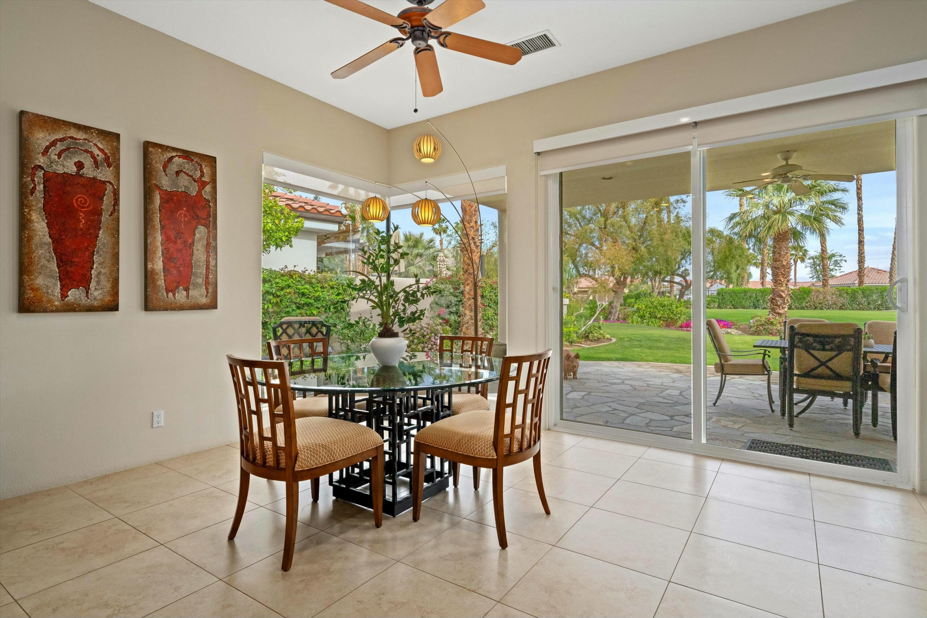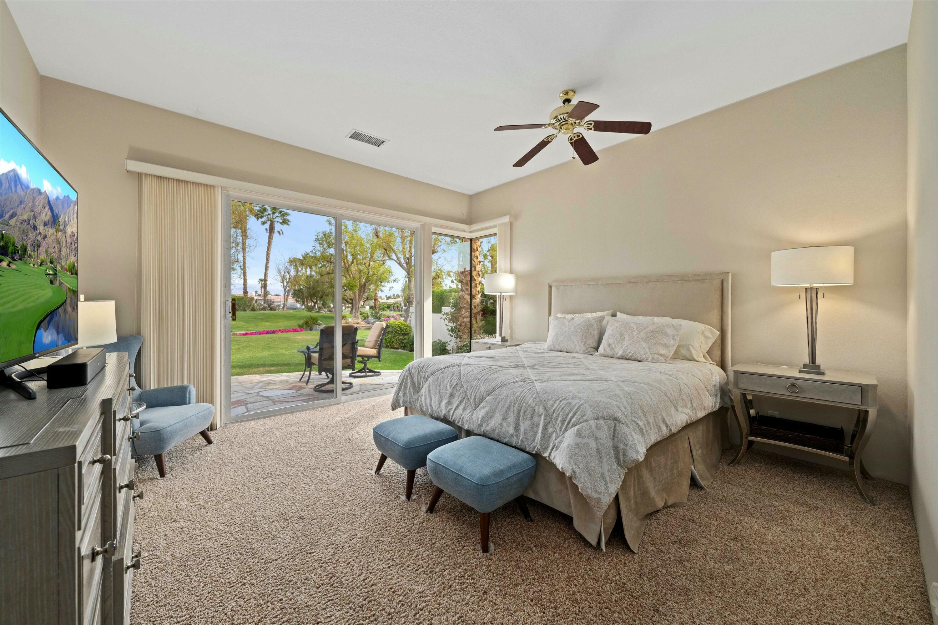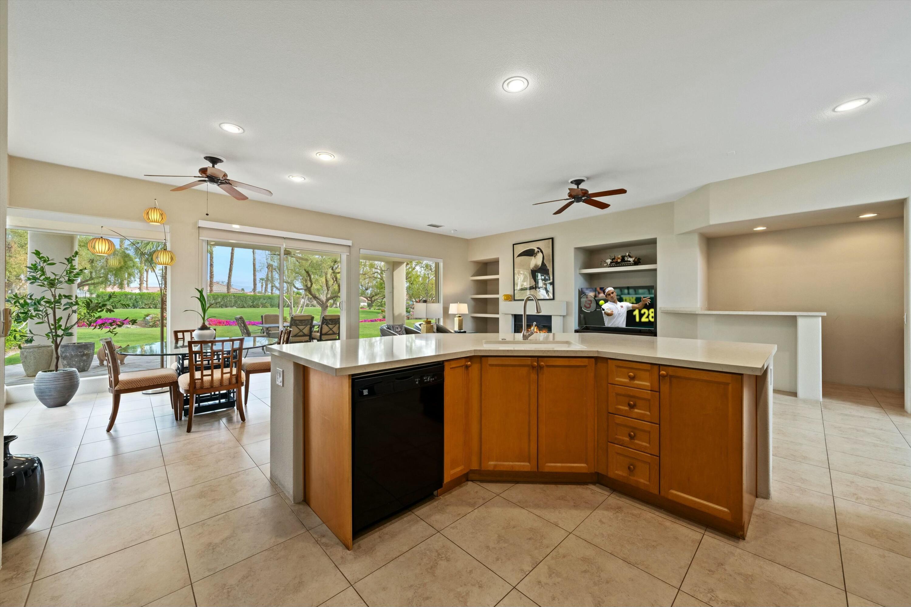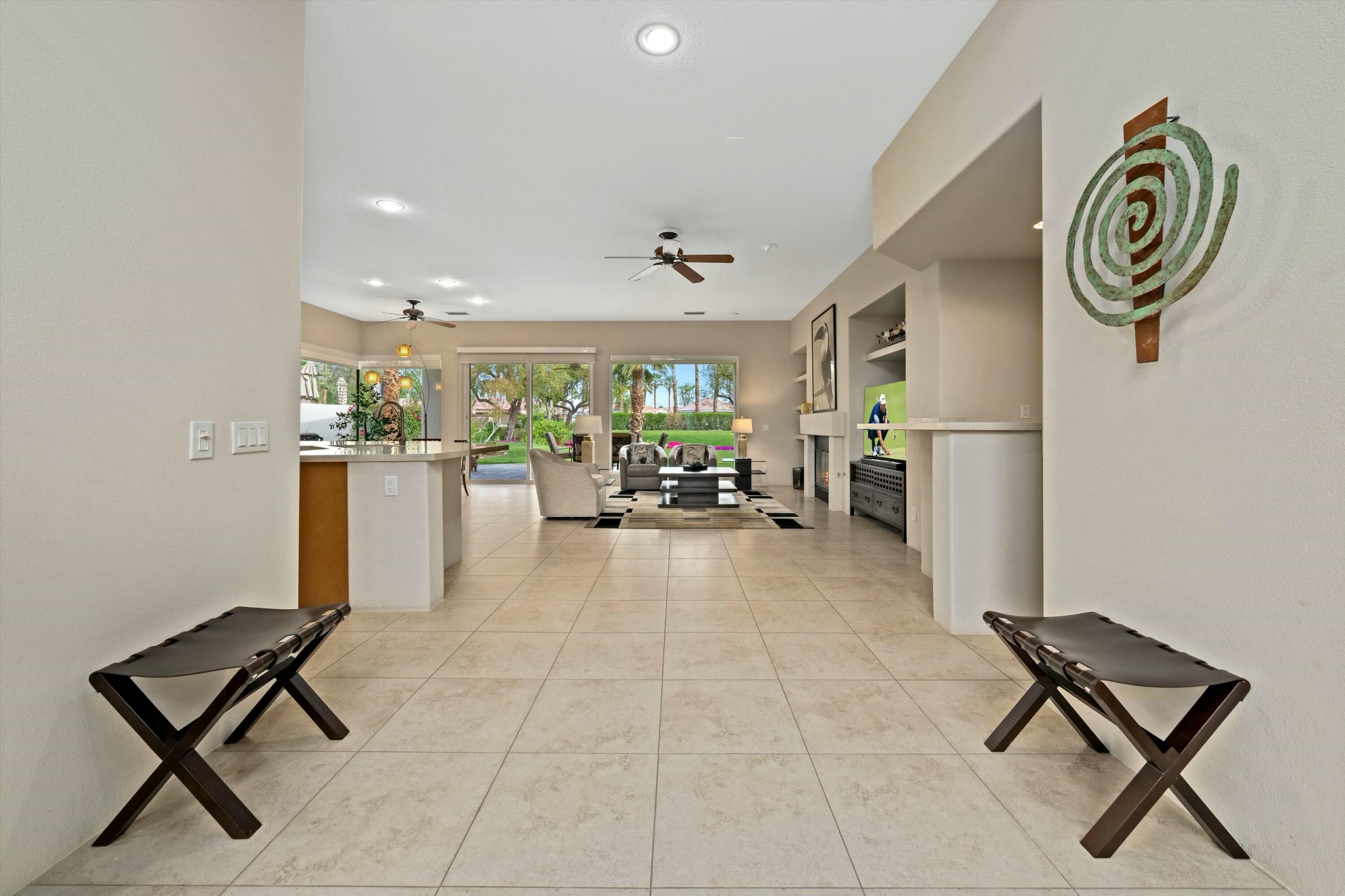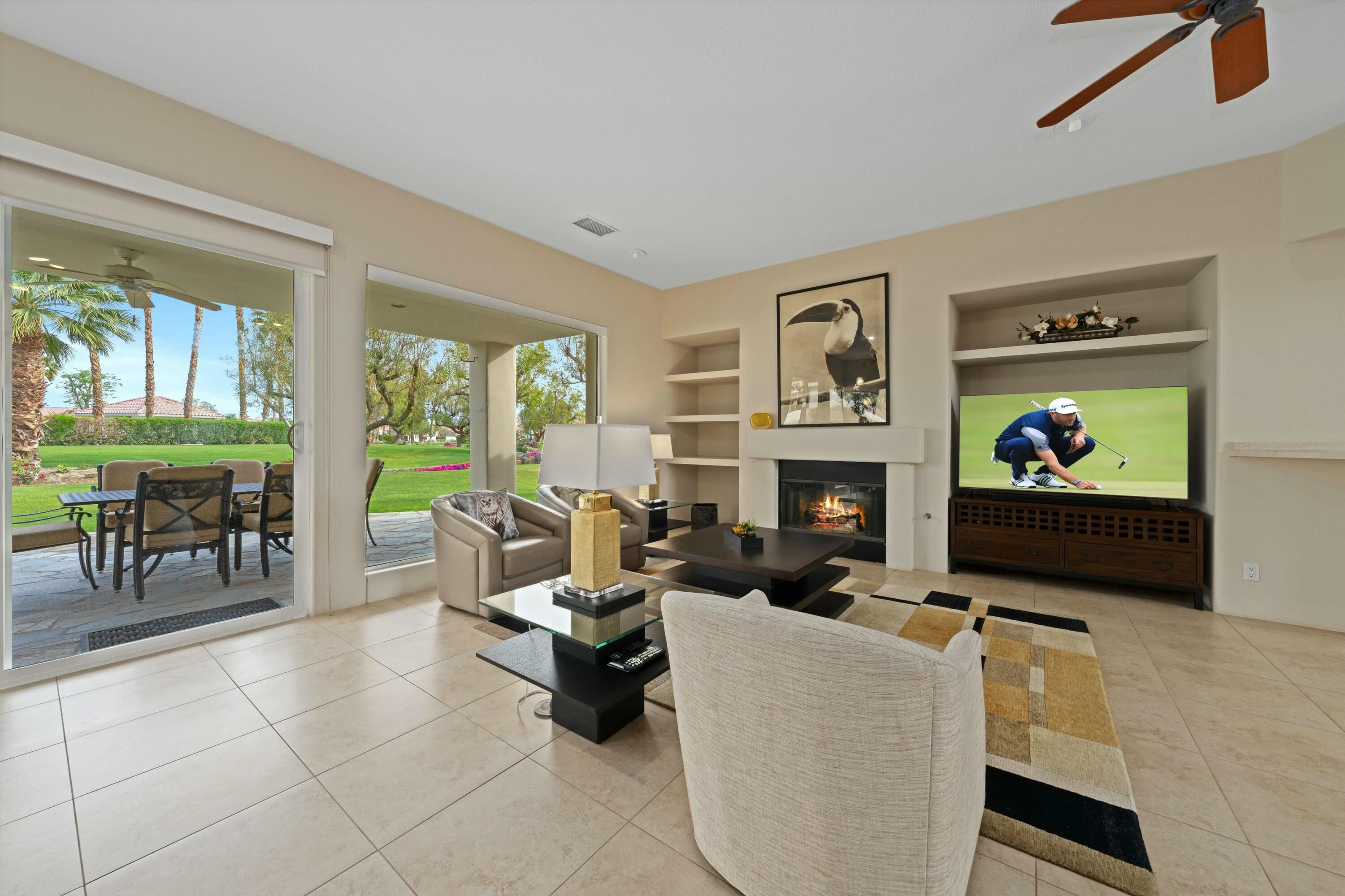 Welcome to the prestigious Weiskopf Residential area inside the gates of the world-famous PGA West. This Ryder One floor plan home features a spacious 2100 sq ft floor plan with 3 bedrooms and 3 baths, situated on a unique and private waterfront setting. The serene water views add to the peaceful ambiance of the beautifully landscaped backyard which boasts lush green grass, mature shade trees, picturesque mountain views and a generously sized side yard. Upon entering, you'll be greeted by an open-concept great room, highlighted by a large quartz center kitchen island and expansive windows that frame the stunning backyard views. The great room also features a wet bar and a dedicated dining area, perfect for entertaining. The primary suite offers a tranquil retreat with direct backyard access through oversized patio door, a spacious walk-in closet, dual vanity, separate tile shower and luxurious soaking tub. The second bedroom includes its own en-suite bathroom, while the 3rd bedroom offers the flexibility to be used as a guest room, den or office. A separate laundry room completes the interior of this very clean home.Residents also enjoy access to a sizable community pool/spa, just a short walk away. PGA West is known as the Western Home of Golf, offering 6 professional golf courses- 3 private and 3 open to the public. The community features three distinct clubhouses, each with its own unique character, along with state-of-the-art sports and fitness center exclusively for members. Additionally nearby attractions include world class equestrian center and renowned polo fields home to the Coachella and Stagecoach Music Festivals. This home has the premium pool sized lot and location to be a very special place to call home.Interested in this Listing?