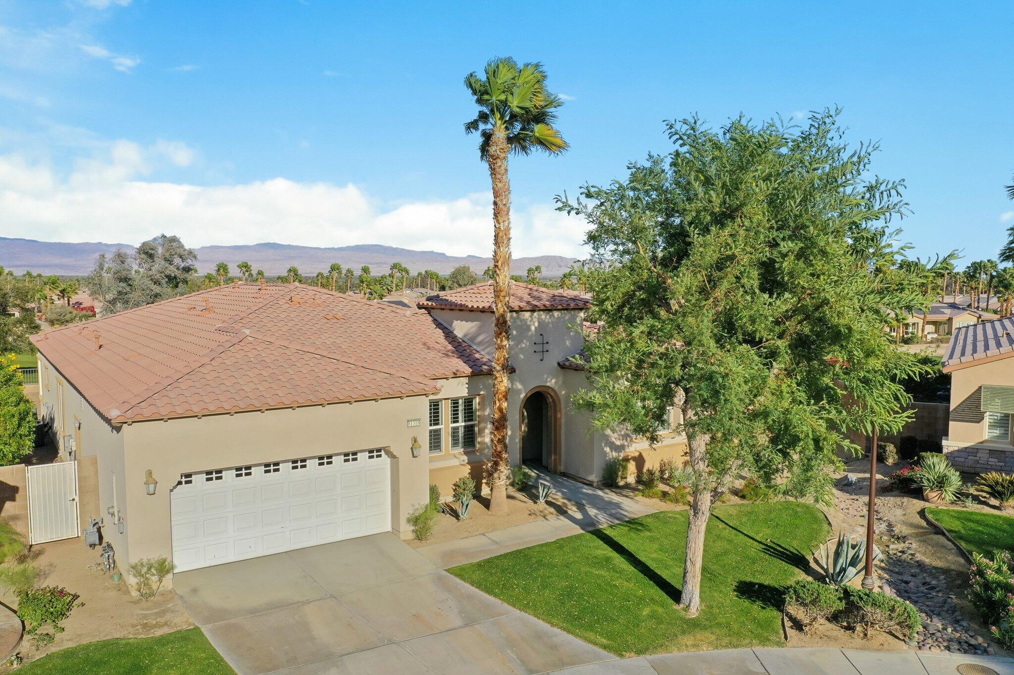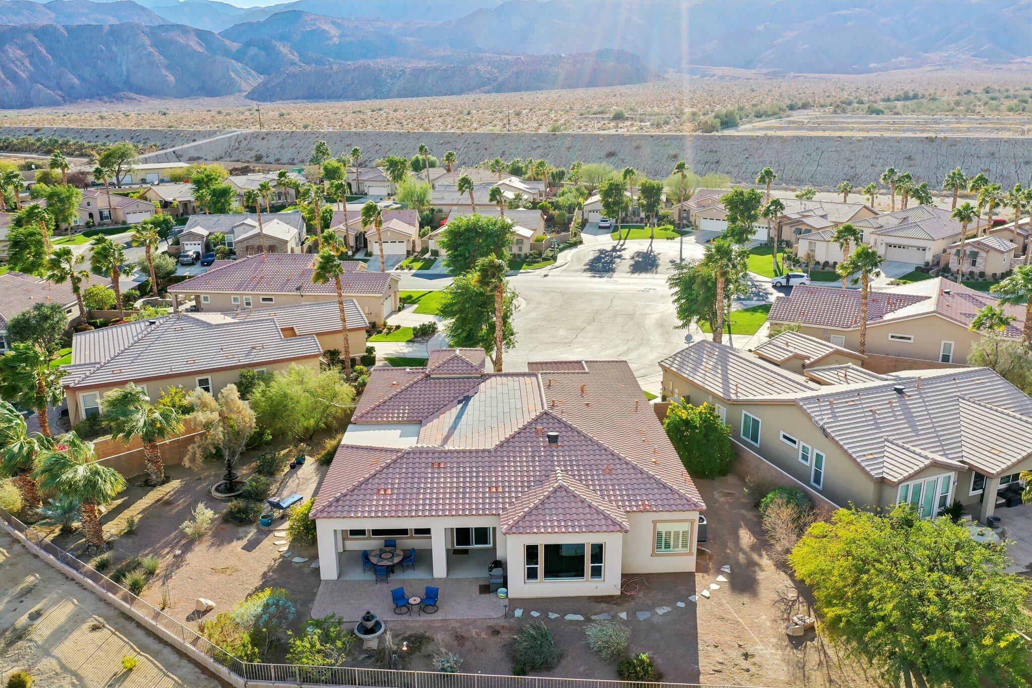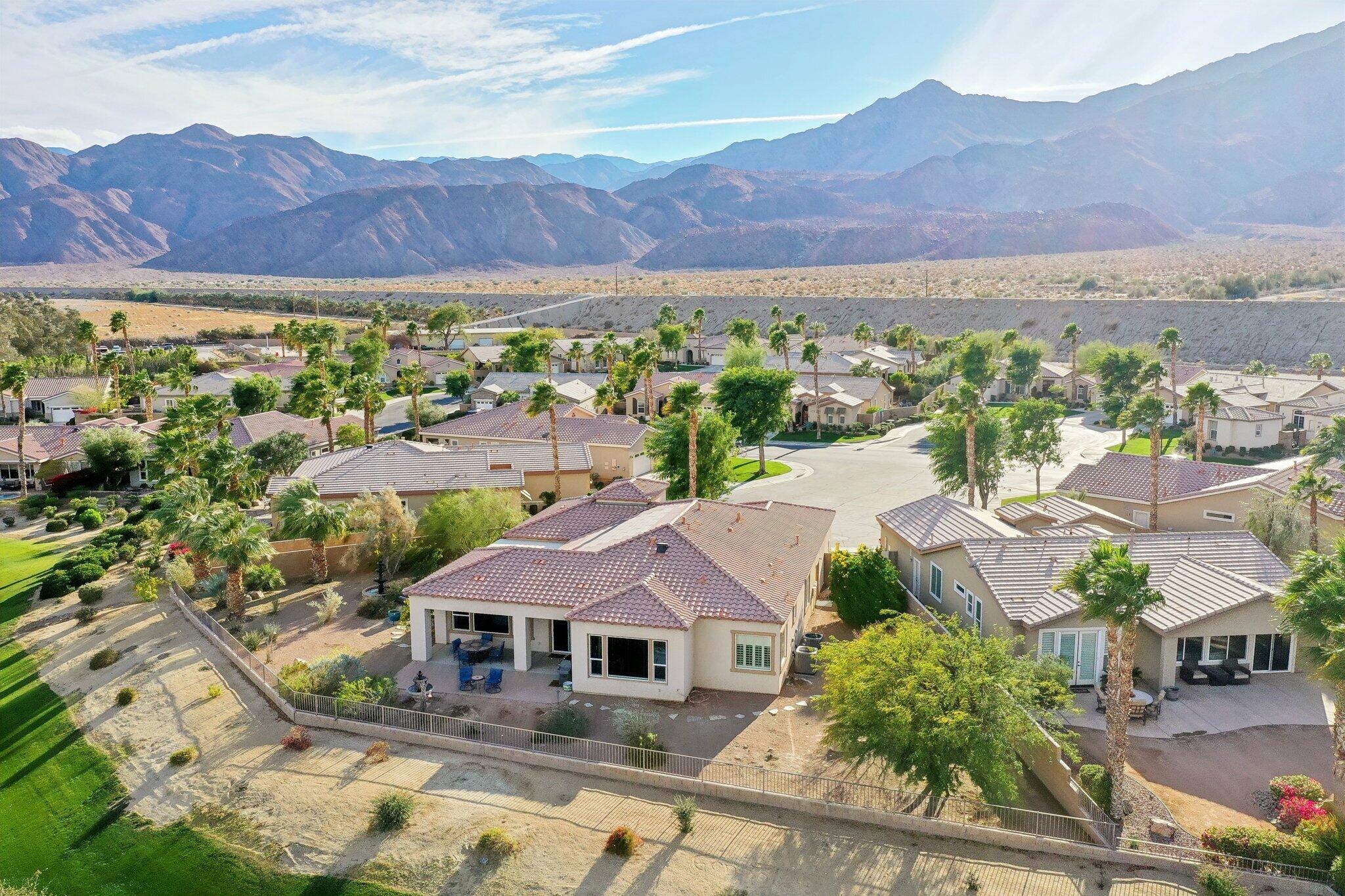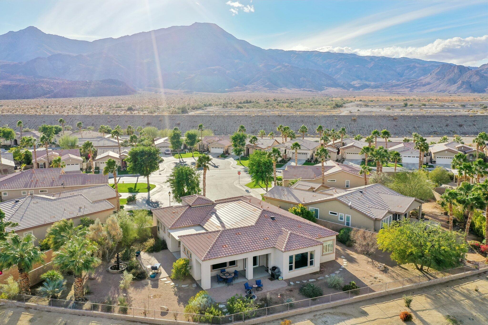 Nestled on a prime cul-de-sac lot (12,197sqft.) off the 5th fairway at the Trilogy Golf Club at La Quinta, this stunning Talea plan home with owned solar offers unparalleled luxury and privacy. Boasting breathtaking wide open, expansive mountain and golf course views, this 2,584 sq. ft. desert retreat features three bedrooms, three baths, plus a versatile den/office of the primary suite. Step through the elegant foyer to discover upgraded tile flooring, a formal dining room, plantation shutters, and custom window treatments. The expansive great room impresses with pocket windows, a TV/media niche, and stunning vistas of the beautifully landscaped backyard. A chef's dream, the gourmet kitchen showcases stainless steel appliances, slab granite counters, a custom tile backsplash, built-in double ovens, dual islands with bar seating, a built-in fridge, and a 6-burner gas cooktop with a stylish hood. The primary suite is a luxurious haven, featuring an en suite bath with bull-nose countertops, dual vanities, a walk-in closet, a spa-like tiled shower, and a soaking tub with a view. Multiple guest accommodations ensure comfort and privacy, while a bonus room offers endless possibilities--home gym, library, or extra office space. Step outside to your private paver patio with a pergola, and deco fountains, the perfect spot to relax and watch the golfers. Best of all, you're just a 5-minute golf cart ride from the amenity-rich Santa Rosa Clubhouse. This is desert living at its finest!Interested in this Listing?