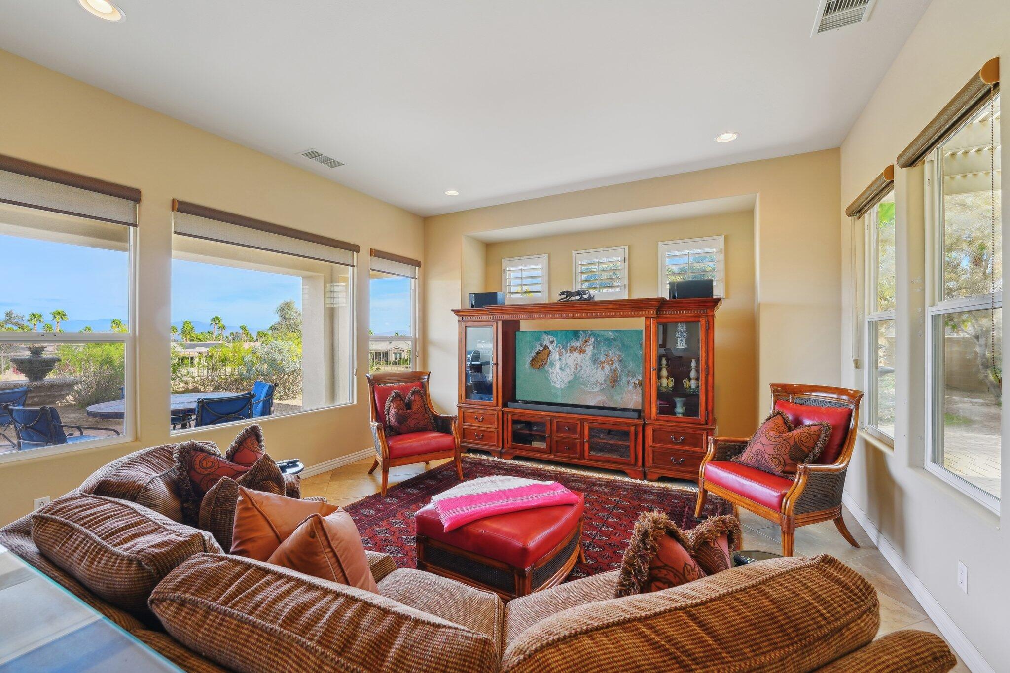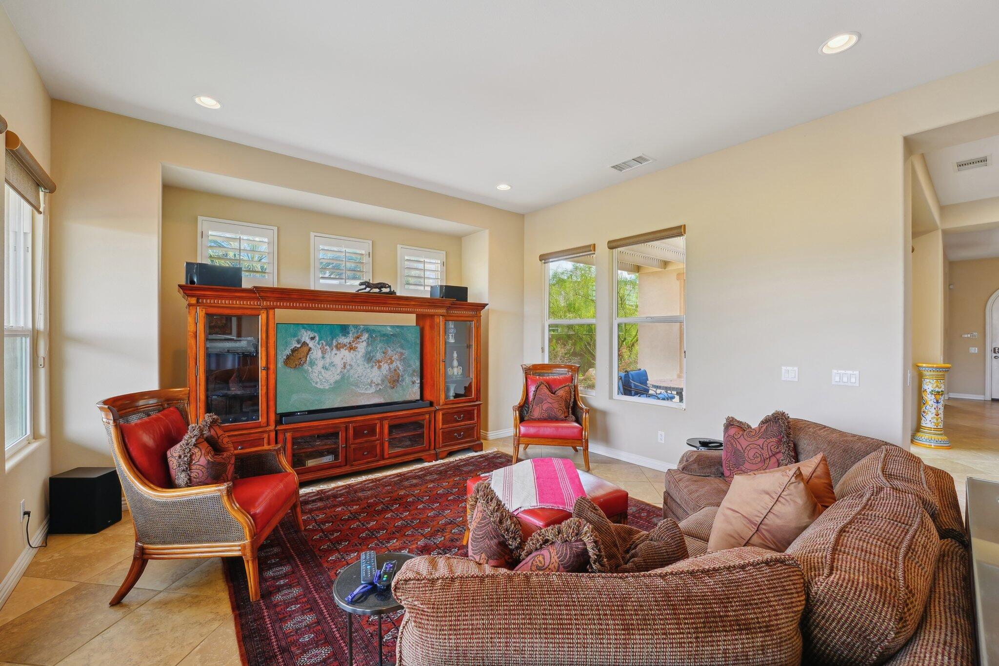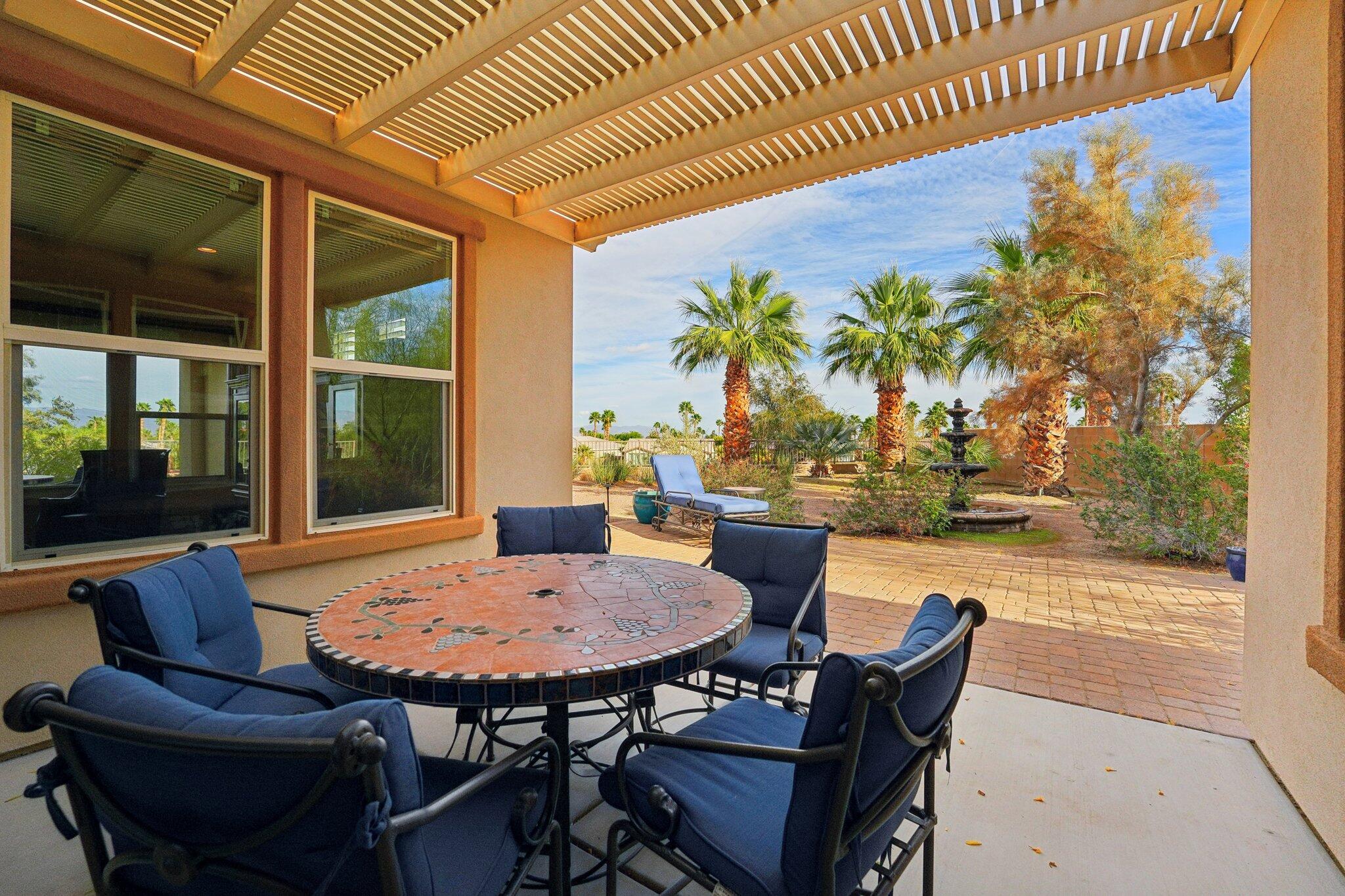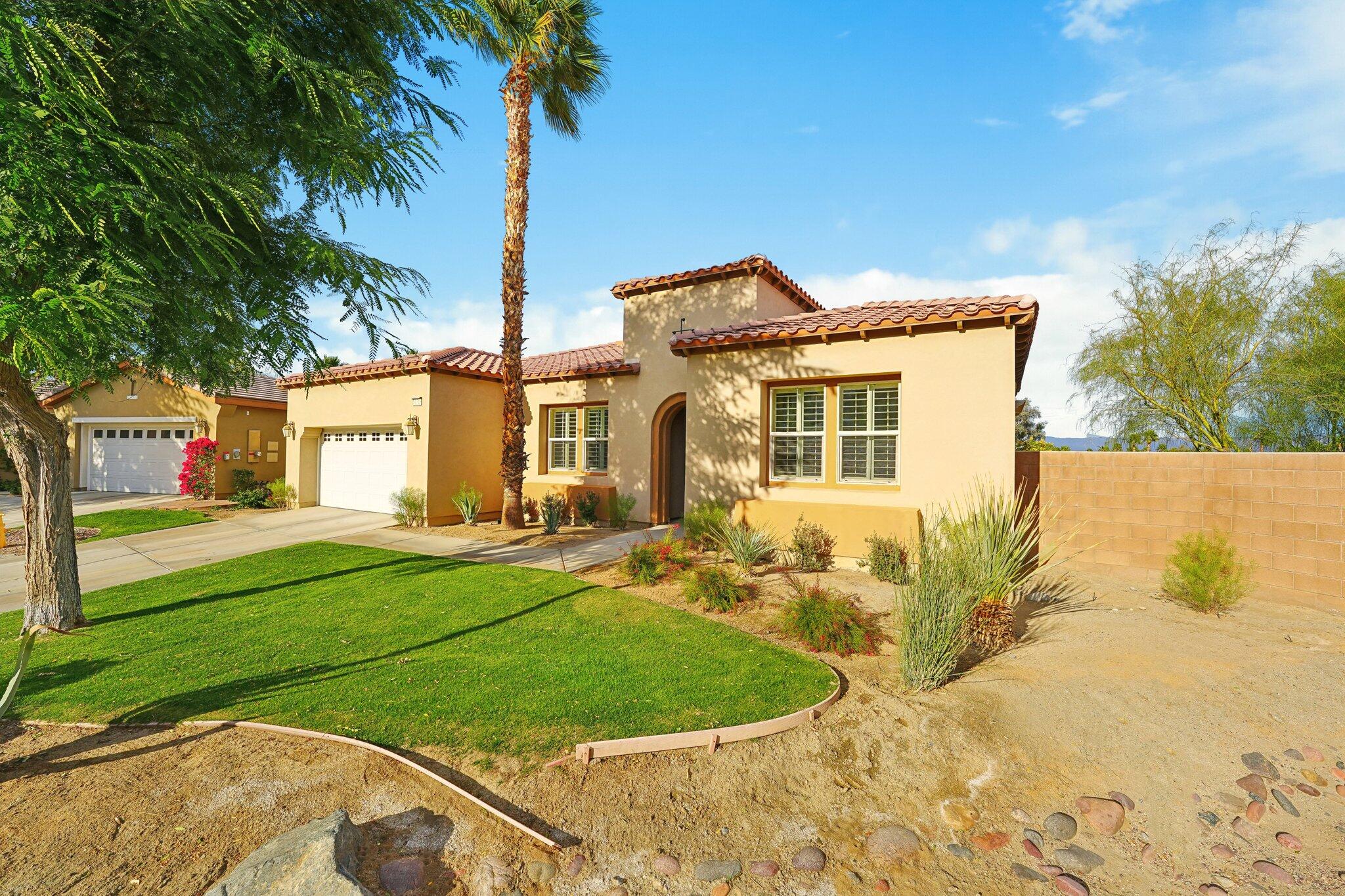 Nestled on a prime cul-de-sac lot (12,197sqft.) off the 5th fairway at the Trilogy Golf Club at La Quinta, this stunning Talea plan home with owned solar offers unparalleled luxury and privacy. Boasting breathtaking wide open, expansive mountain and golf course views, this 2,584 sq. ft. desert retreat features three bedrooms, three baths, plus a versatile den/office of the primary suite. Step through the elegant foyer to discover upgraded tile flooring, a formal dining room, plantation shutters, and custom window treatments. The expansive great room impresses with pocket windows, a TV/media niche, and stunning vistas of the beautifully landscaped backyard. A chef's dream, the gourmet kitchen showcases stainless steel appliances, slab granite counters, a custom tile backsplash, built-in double ovens, dual islands with bar seating, a built-in fridge, and a 6-burner gas cooktop with a stylish hood. The primary suite is a luxurious haven, featuring an en suite bath with bull-nose countertops, dual vanities, a walk-in closet, a spa-like tiled shower, and a soaking tub with a view. Multiple guest accommodations ensure comfort and privacy, while a bonus room offers endless possibilities--home gym, library, or extra office space. Step outside to your private paver patio with a pergola, and deco fountains, the perfect spot to relax and watch the golfers. Best of all, you're just a 5-minute golf cart ride from the amenity-rich Santa Rosa Clubhouse. This is desert living at its finest!Interested in this Listing?