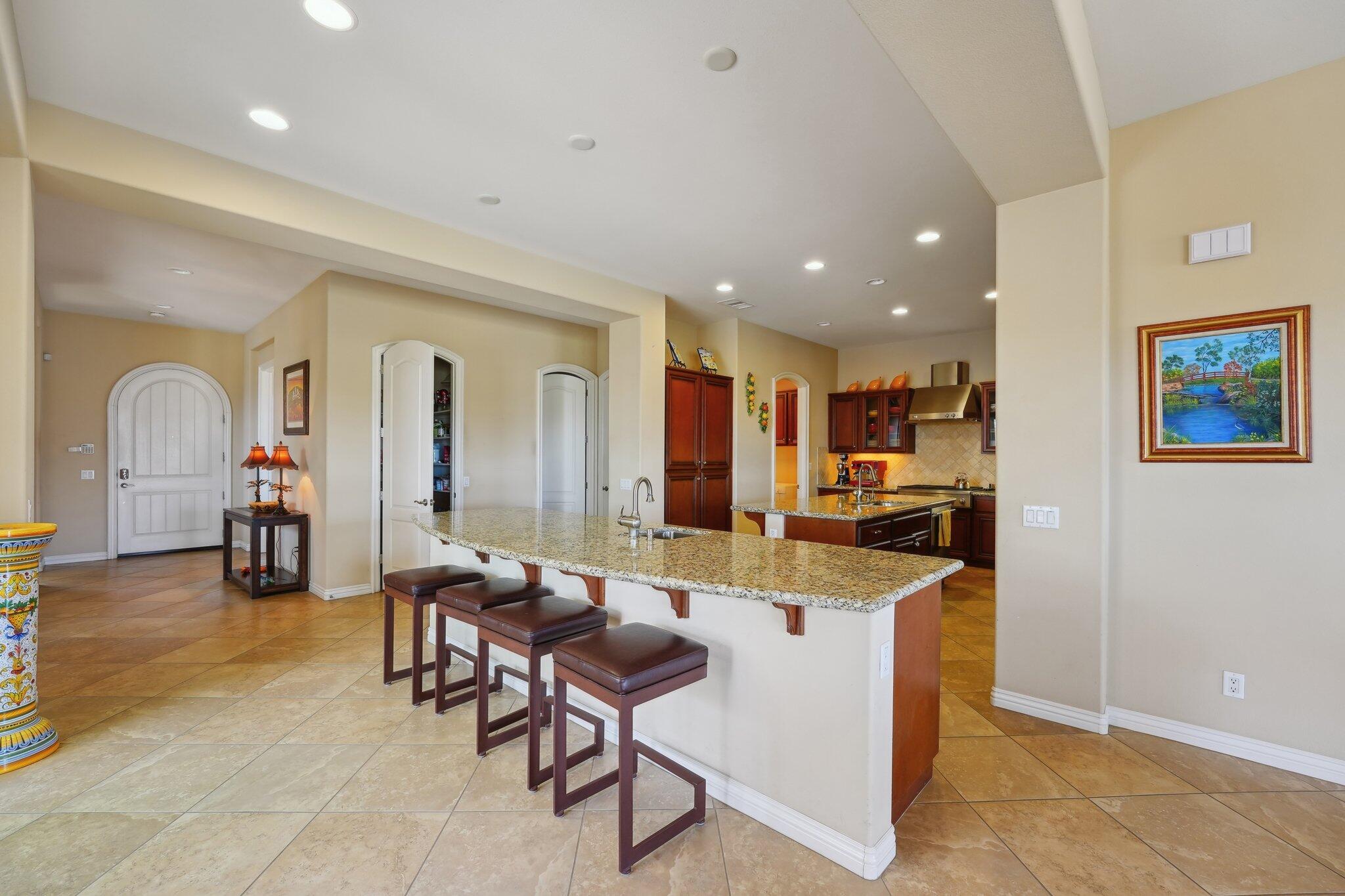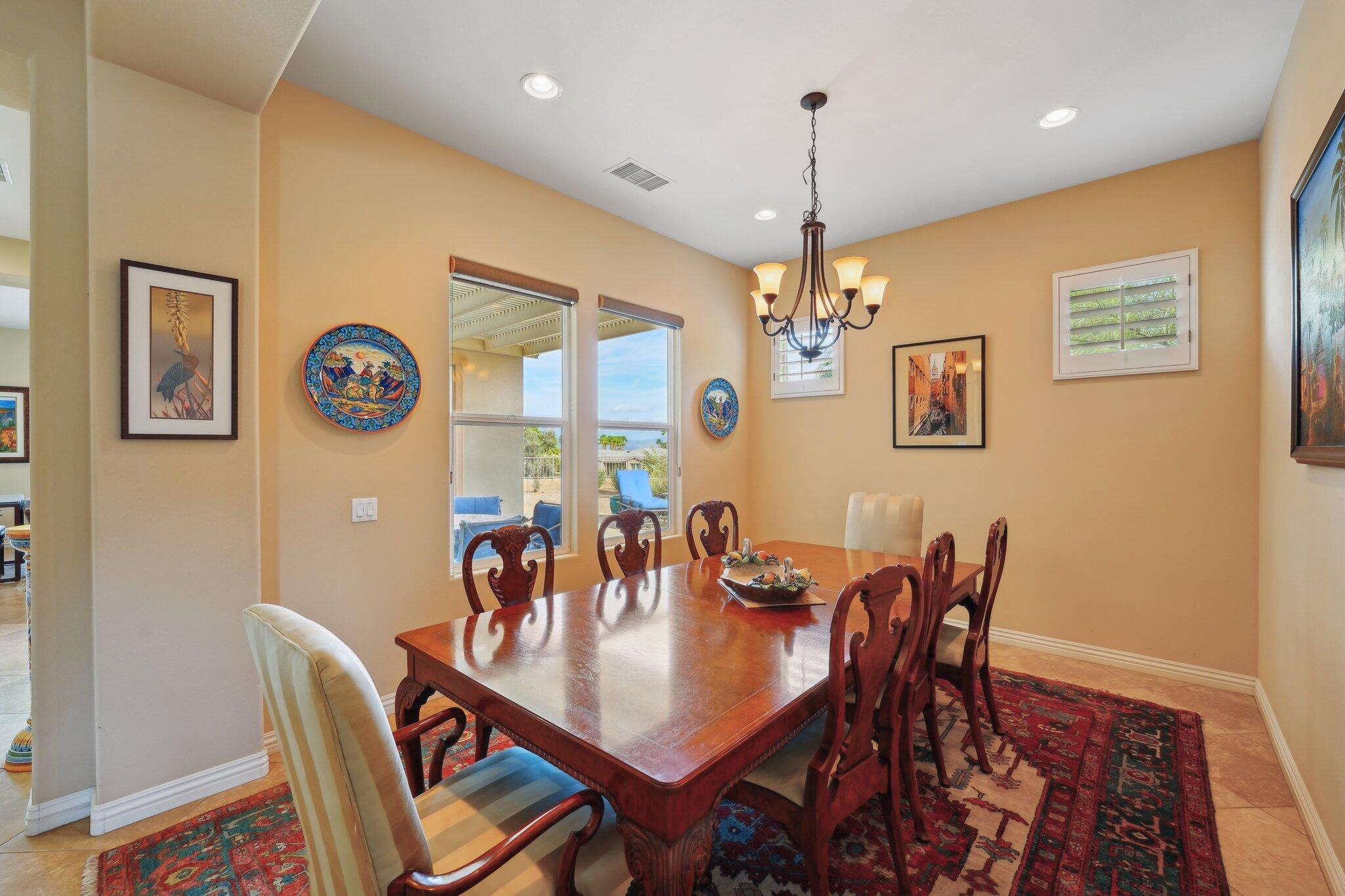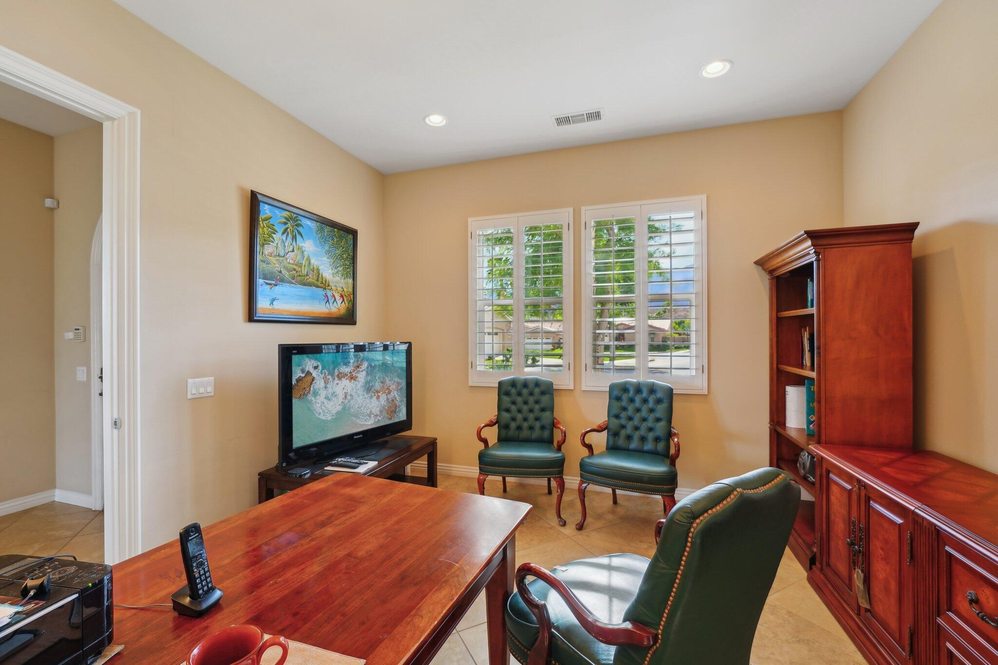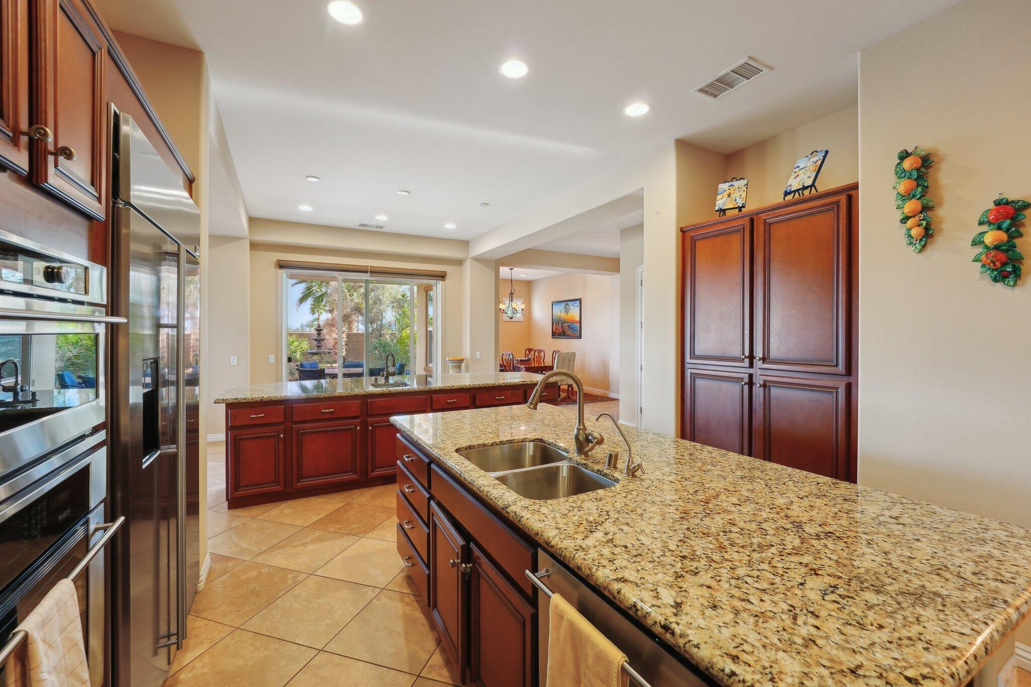 Nestled on a prime cul-de-sac lot (12,197sqft.) off the 5th fairway at the Trilogy Golf Club at La Quinta, this stunning Talea plan home with owned solar offers unparalleled luxury and privacy. Boasting breathtaking wide open, expansive mountain and golf course views, this 2,584 sq. ft. desert retreat features three bedrooms, three baths, plus a versatile den/office of the primary suite. Step through the elegant foyer to discover upgraded tile flooring, a formal dining room, plantation shutters, and custom window treatments. The expansive great room impresses with pocket windows, a TV/media niche, and stunning vistas of the beautifully landscaped backyard. A chef's dream, the gourmet kitchen showcases stainless steel appliances, slab granite counters, a custom tile backsplash, built-in double ovens, dual islands with bar seating, a built-in fridge, and a 6-burner gas cooktop with a stylish hood. The primary suite is a luxurious haven, featuring an en suite bath with bull-nose countertops, dual vanities, a walk-in closet, a spa-like tiled shower, and a soaking tub with a view. Multiple guest accommodations ensure comfort and privacy, while a bonus room offers endless possibilities--home gym, library, or extra office space. Step outside to your private paver patio with a pergola, and deco fountains, the perfect spot to relax and watch the golfers. Best of all, you're just a 5-minute golf cart ride from the amenity-rich Santa Rosa Clubhouse. This is desert living at its finest!Interested in this Listing?