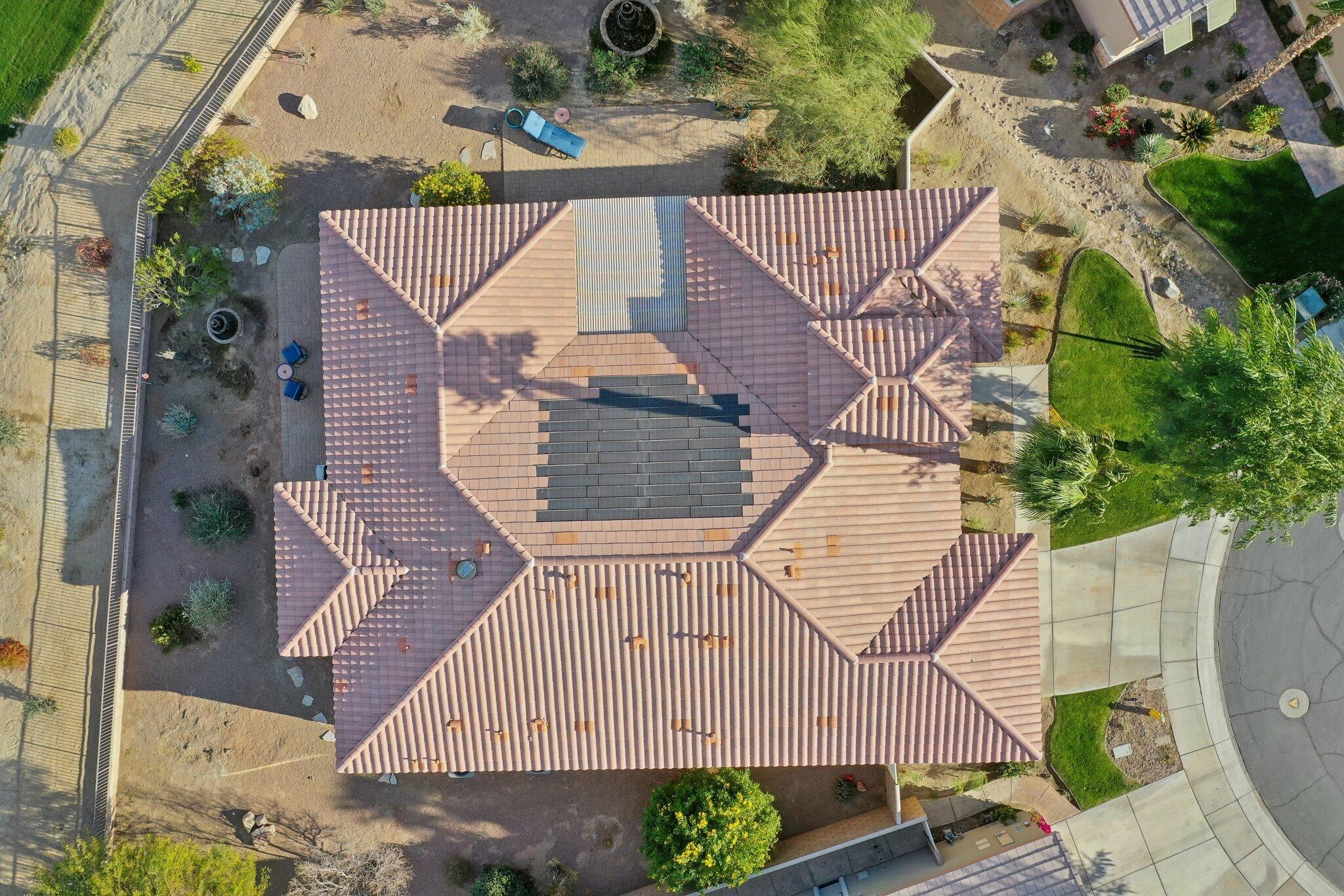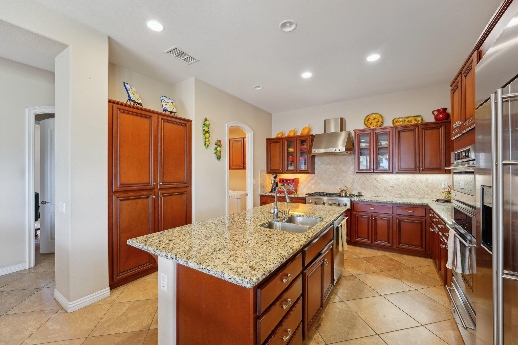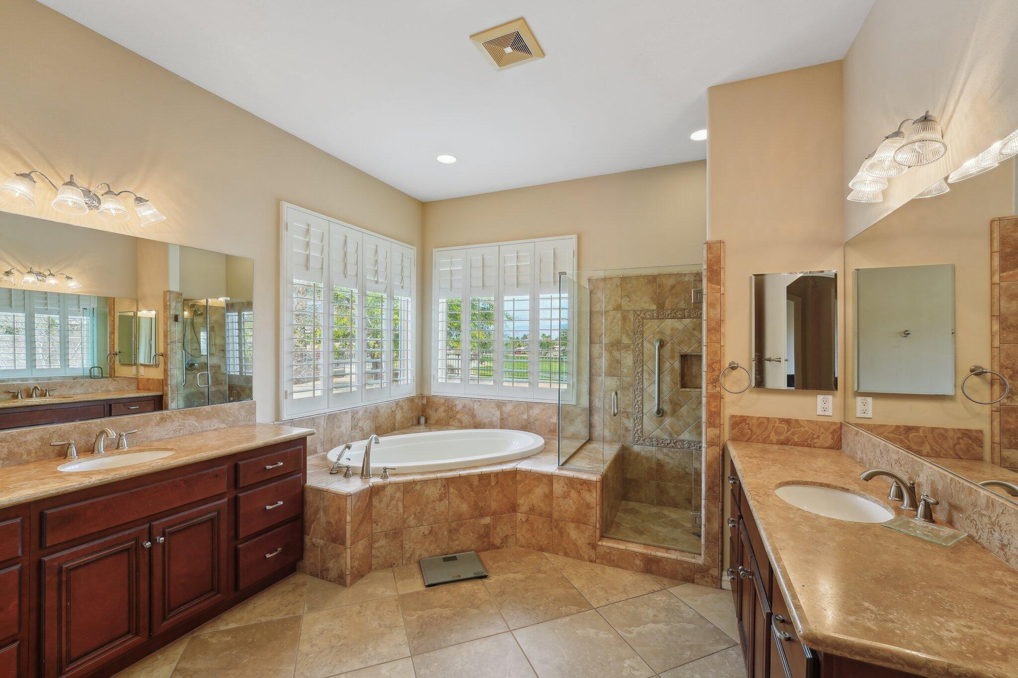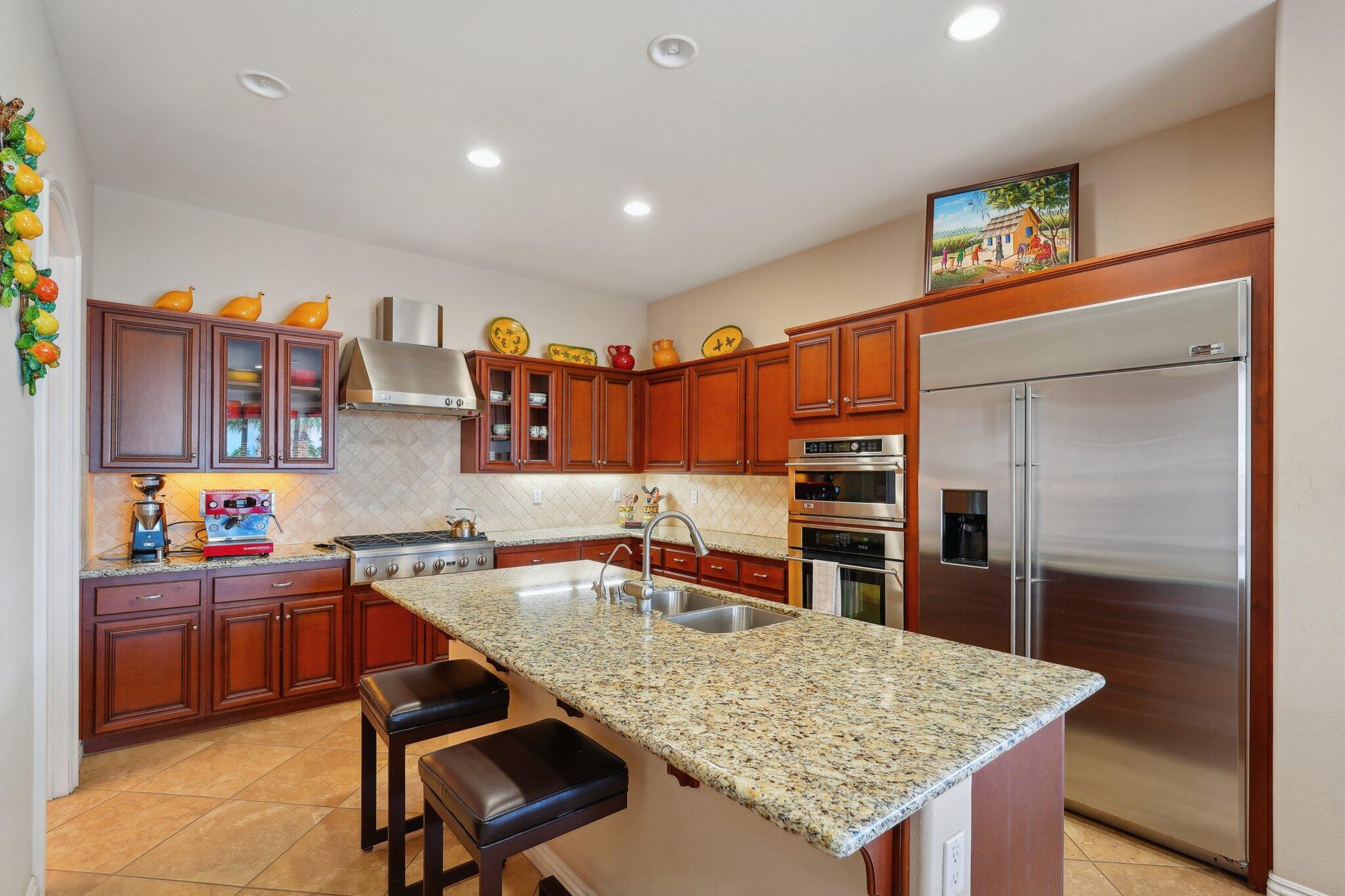 Nestled on a prime cul-de-sac lot (12,197sqft.) off the 5th fairway at the Trilogy Golf Club at La Quinta, this stunning Talea plan home with owned solar offers unparalleled luxury and privacy. Boasting breathtaking wide open, expansive mountain and golf course views, this 2,584 sq. ft. desert retreat features three bedrooms, three baths, plus a versatile den/office of the primary suite. Step through the elegant foyer to discover upgraded tile flooring, a formal dining room, plantation shutters, and custom window treatments. The expansive great room impresses with pocket windows, a TV/media niche, and stunning vistas of the beautifully landscaped backyard. A chef's dream, the gourmet kitchen showcases stainless steel appliances, slab granite counters, a custom tile backsplash, built-in double ovens, dual islands with bar seating, a built-in fridge, and a 6-burner gas cooktop with a stylish hood. The primary suite is a luxurious haven, featuring an en suite bath with bull-nose countertops, dual vanities, a walk-in closet, a spa-like tiled shower, and a soaking tub with a view. Multiple guest accommodations ensure comfort and privacy, while a bonus room offers endless possibilities--home gym, library, or extra office space. Step outside to your private paver patio with a pergola, and deco fountains, the perfect spot to relax and watch the golfers. Best of all, you're just a 5-minute golf cart ride from the amenity-rich Santa Rosa Clubhouse. This is desert living at its finest!Interested in this Listing?