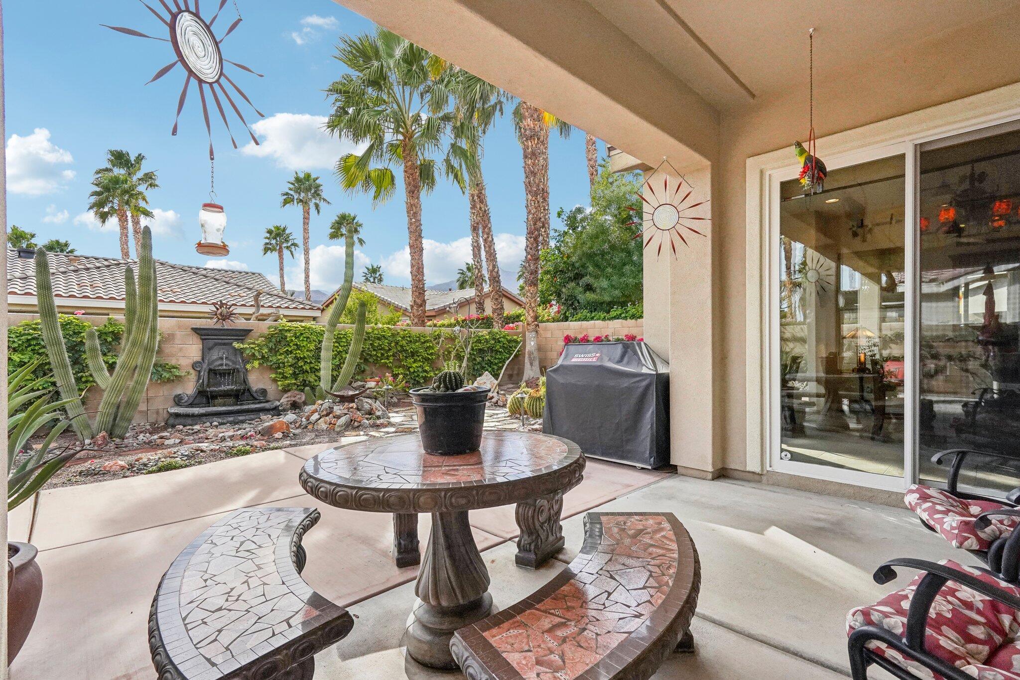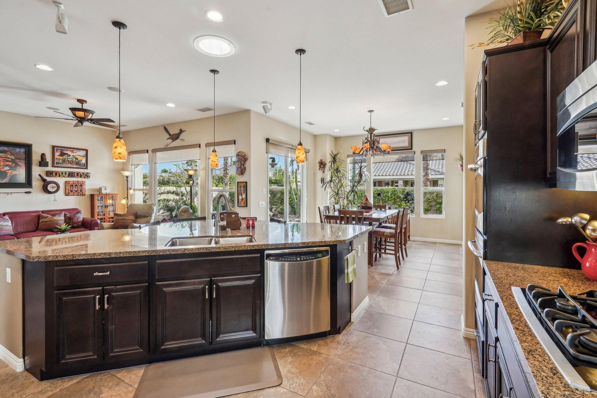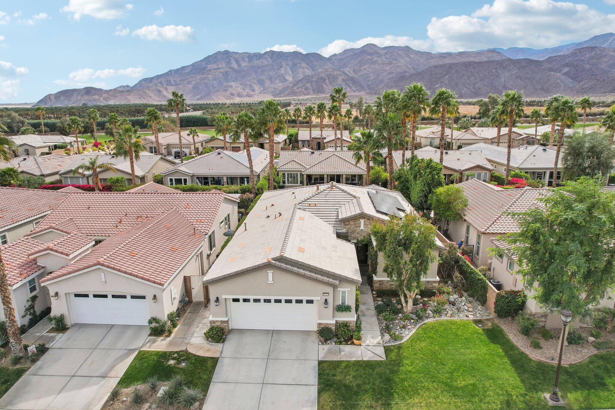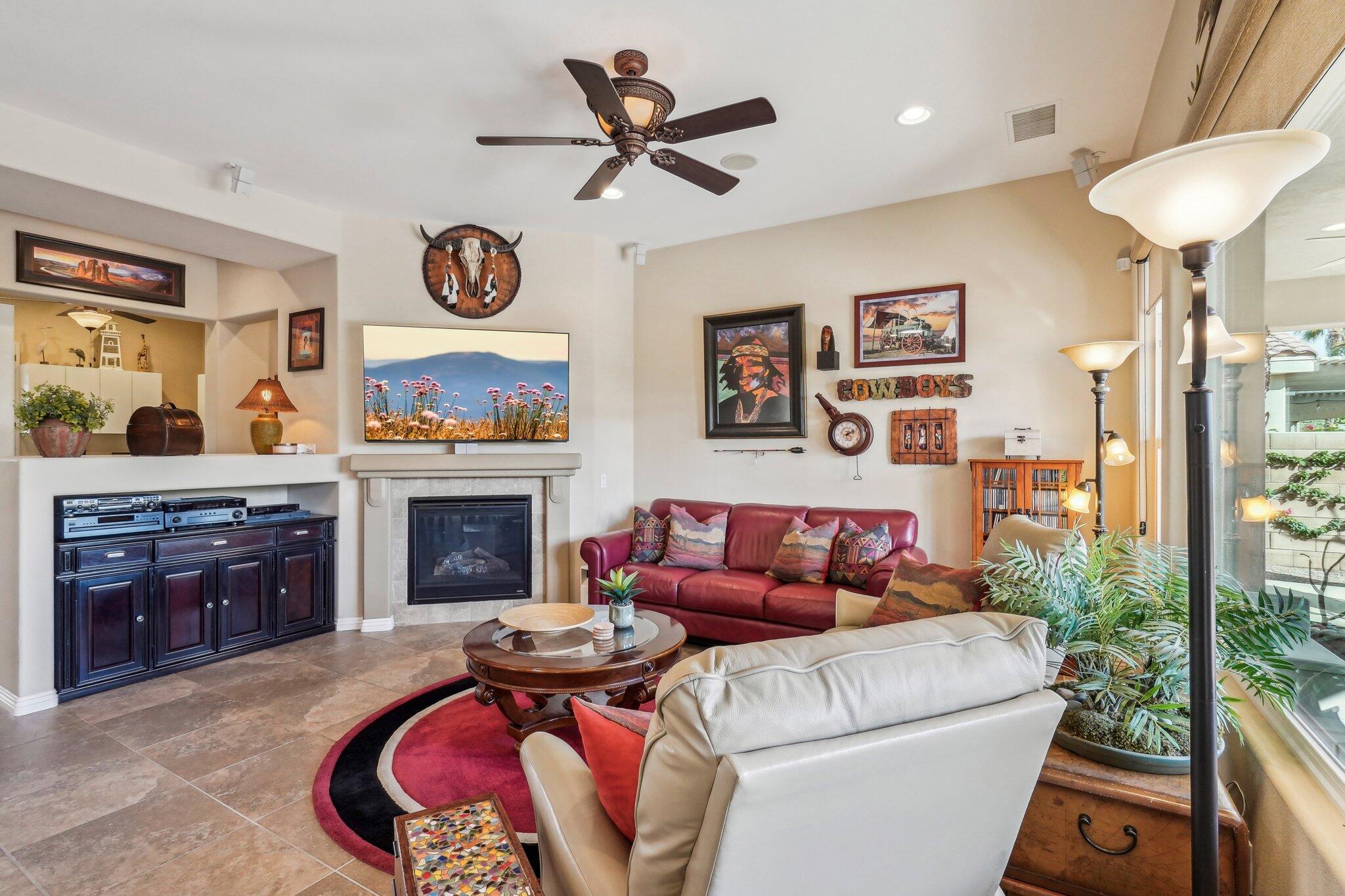 Nestled in the highly sought-after Trilogy La Quinta 55+ Resort Community, this stunning Caspian plan with a Tuscan elevation and energy-efficient solar system is the epitome of desert luxury. From its impressive curb appeal to its thoughtfully designed 1,775 sq. ft. interior, this 2-bedroom, 2-bath home with a versatile den/office offers the perfect blend of elegance and comfort. The inviting great room features a cozy tile-encased fireplace with gas logs, a TV/media niche, and surround sound, all complemented by custom window treatments and sleek tile flooring. The gourmet kitchen is a chef's delight, boasting slab granite counters, stainless appliances, double ovens, gas cooktop, espresso cabinetry with brushed nickel pulls, and a large prep island with bar seating and pendant lighting. The primary suite is a private sanctuary, with French doors leading to the backyard, a spa-inspired en suite with dual vanities, plantation shutters, slab counters, and a tiled shower enclosure. Thoughtfully separated guest quarters ensure privacy for visitors, with a nearby bath featuring travertine tile finishes. Step outside to your serene backyard oasis, complete with a covered patio, expansive concrete deck, and lush professional landscaping--the perfect setting for relaxing or entertaining under the desert skies. Don't forget the extra garage golf cart parking space!!Interested in this Listing?