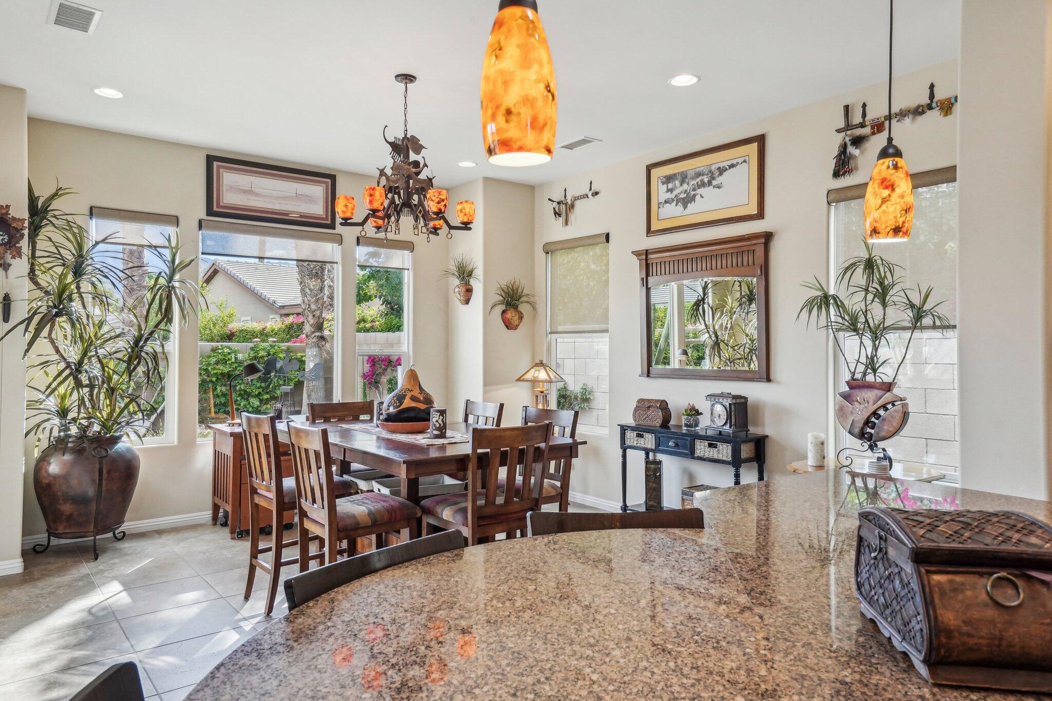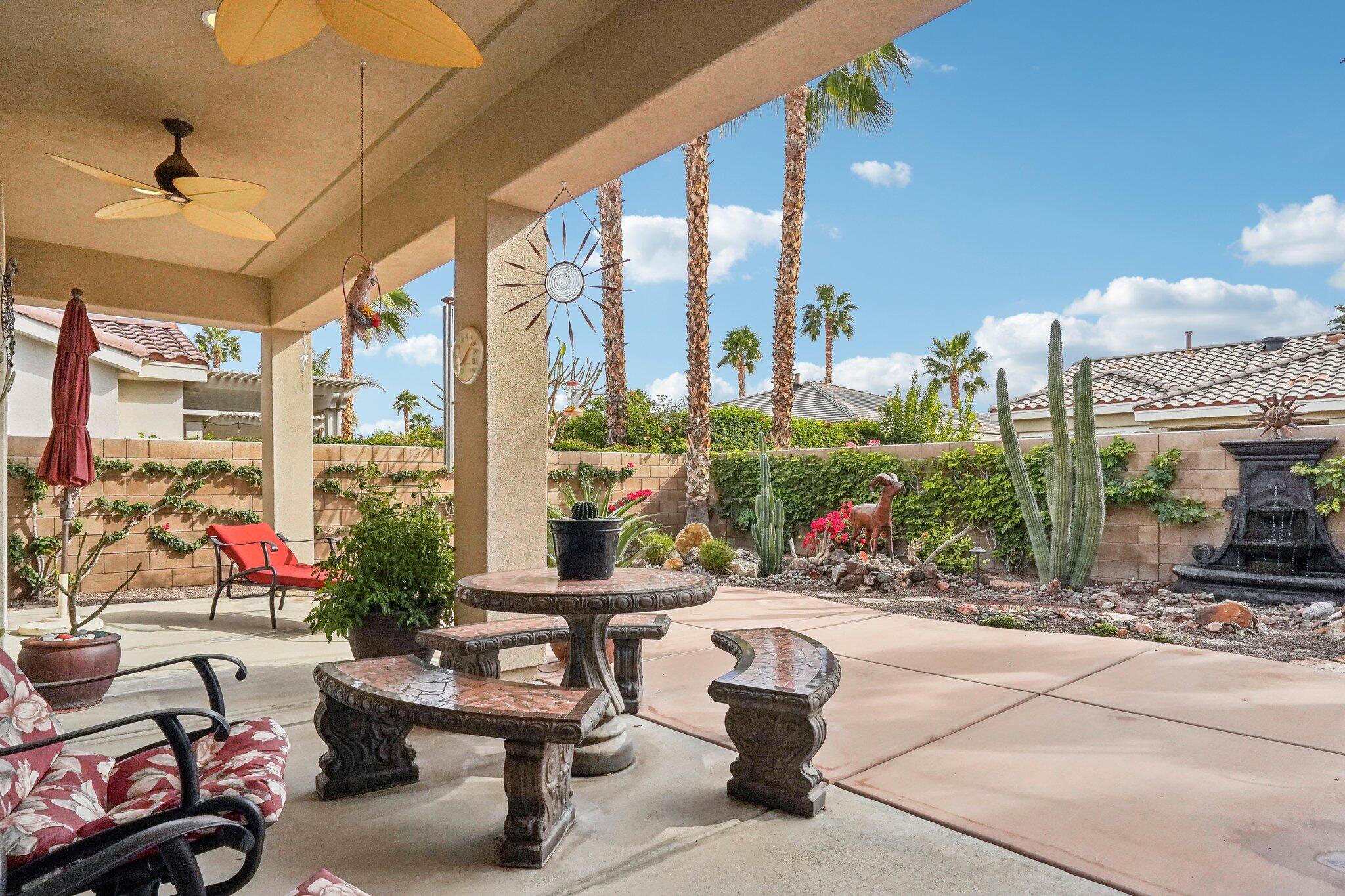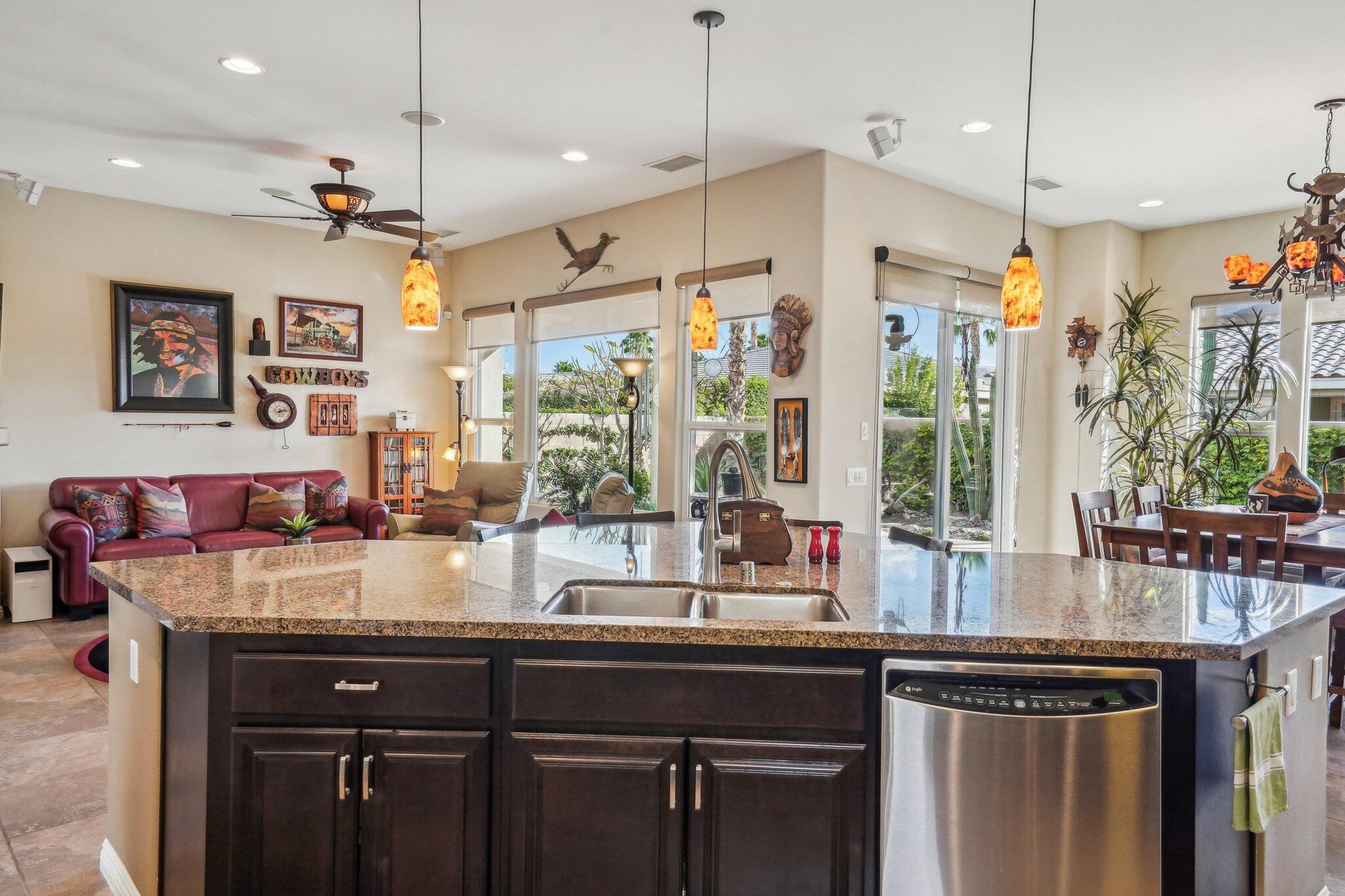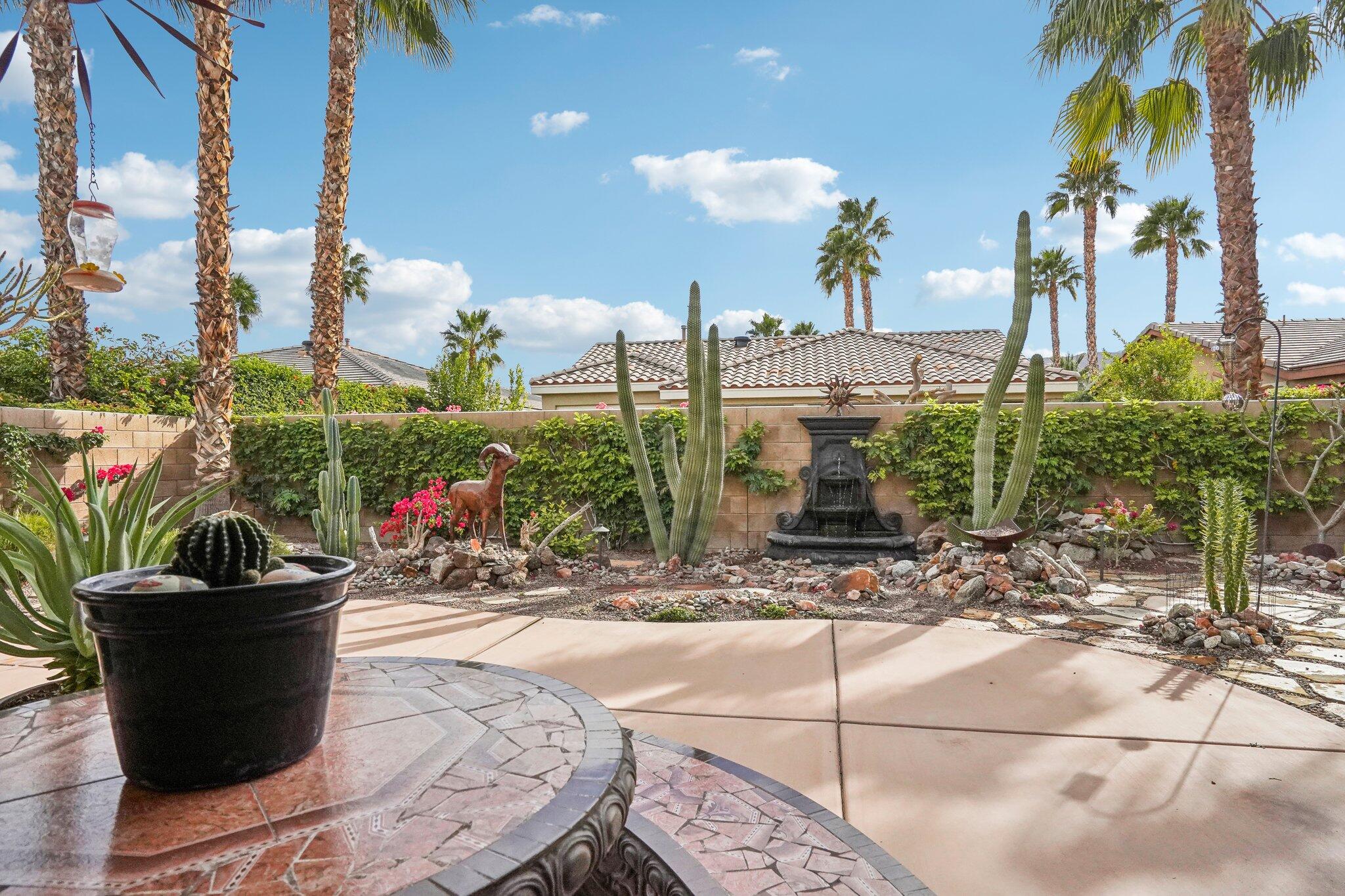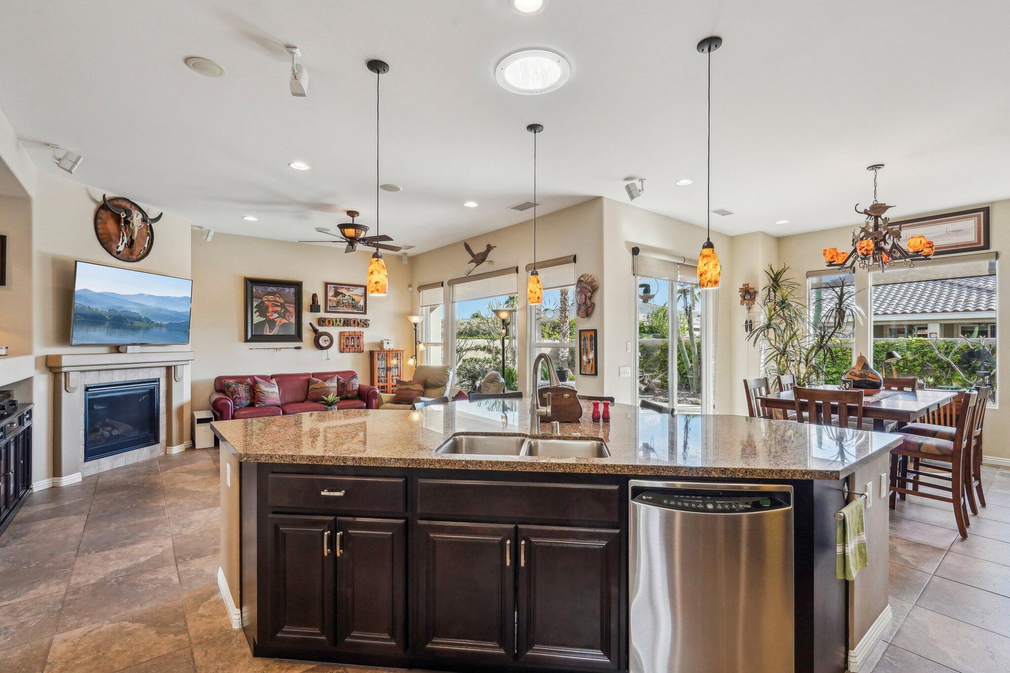 Nestled in the highly sought-after Trilogy La Quinta 55+ Resort Community, this stunning Caspian plan with a Tuscan elevation and energy-efficient solar system is the epitome of desert luxury. From its impressive curb appeal to its thoughtfully designed 1,775 sq. ft. interior, this 2-bedroom, 2-bath home with a versatile den/office offers the perfect blend of elegance and comfort. The inviting great room features a cozy tile-encased fireplace with gas logs, a TV/media niche, and surround sound, all complemented by custom window treatments and sleek tile flooring. The gourmet kitchen is a chef's delight, boasting slab granite counters, stainless appliances, double ovens, gas cooktop, espresso cabinetry with brushed nickel pulls, and a large prep island with bar seating and pendant lighting. The primary suite is a private sanctuary, with French doors leading to the backyard, a spa-inspired en suite with dual vanities, plantation shutters, slab counters, and a tiled shower enclosure. Thoughtfully separated guest quarters ensure privacy for visitors, with a nearby bath featuring travertine tile finishes. Step outside to your serene backyard oasis, complete with a covered patio, expansive concrete deck, and lush professional landscaping--the perfect setting for relaxing or entertaining under the desert skies. Don't forget the extra garage golf cart parking space!!Interested in this Listing?