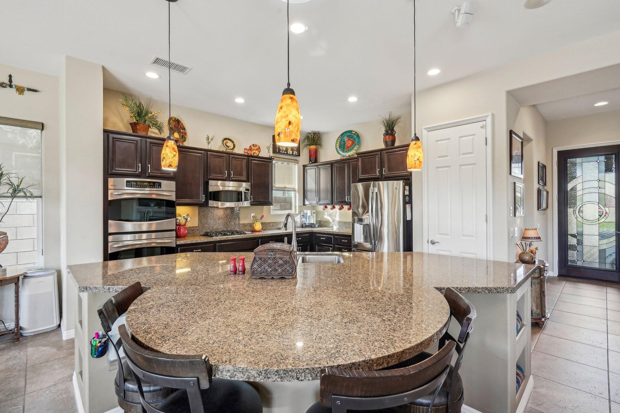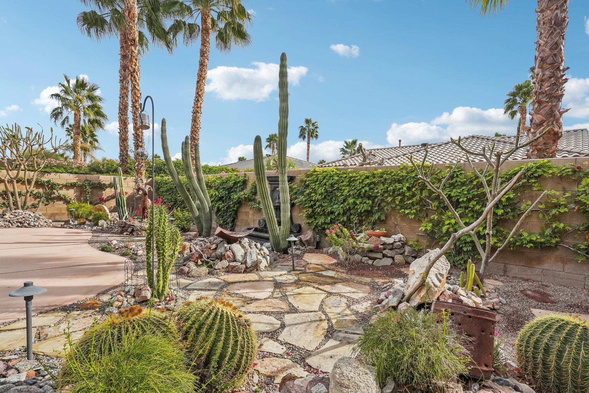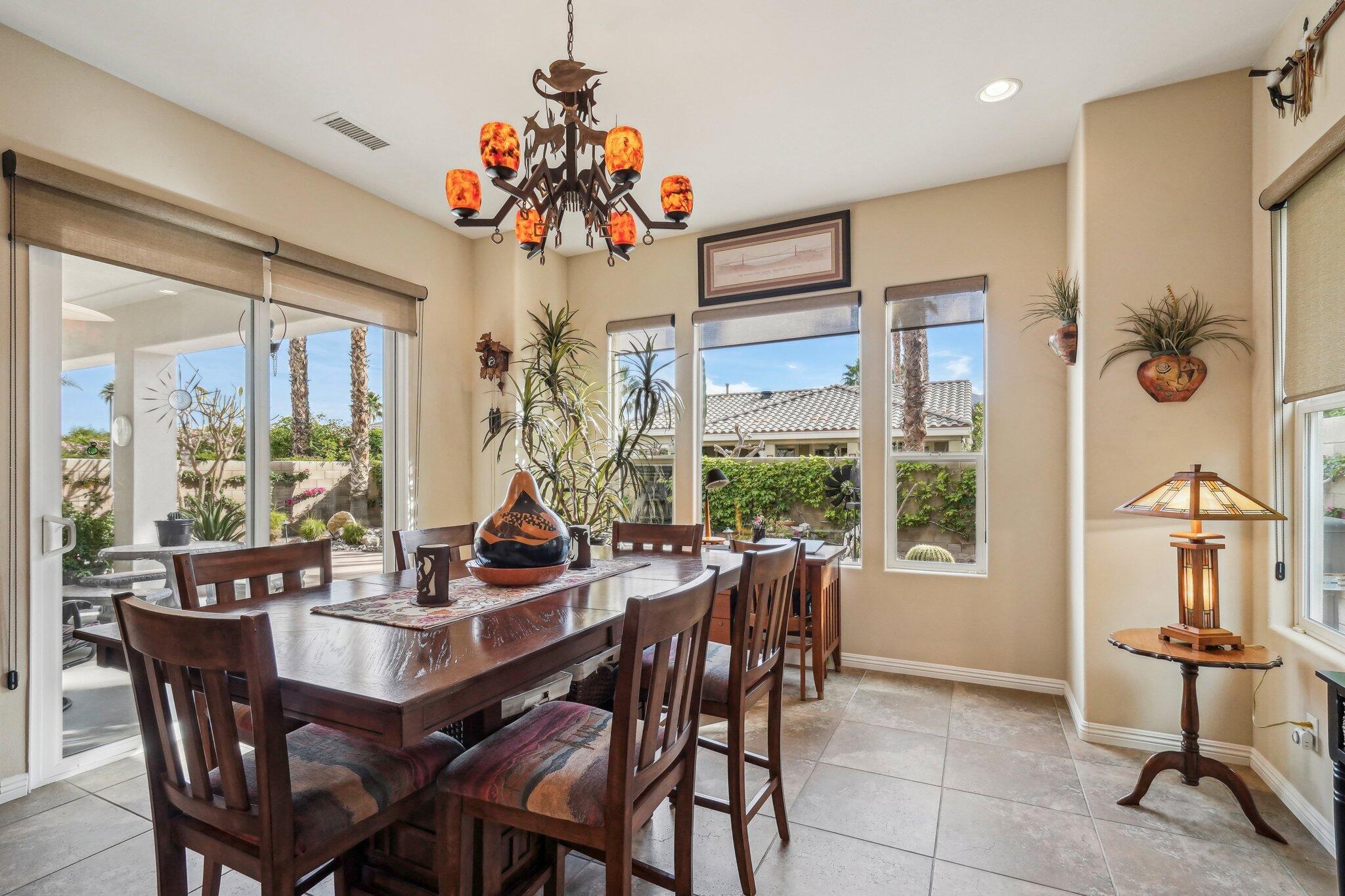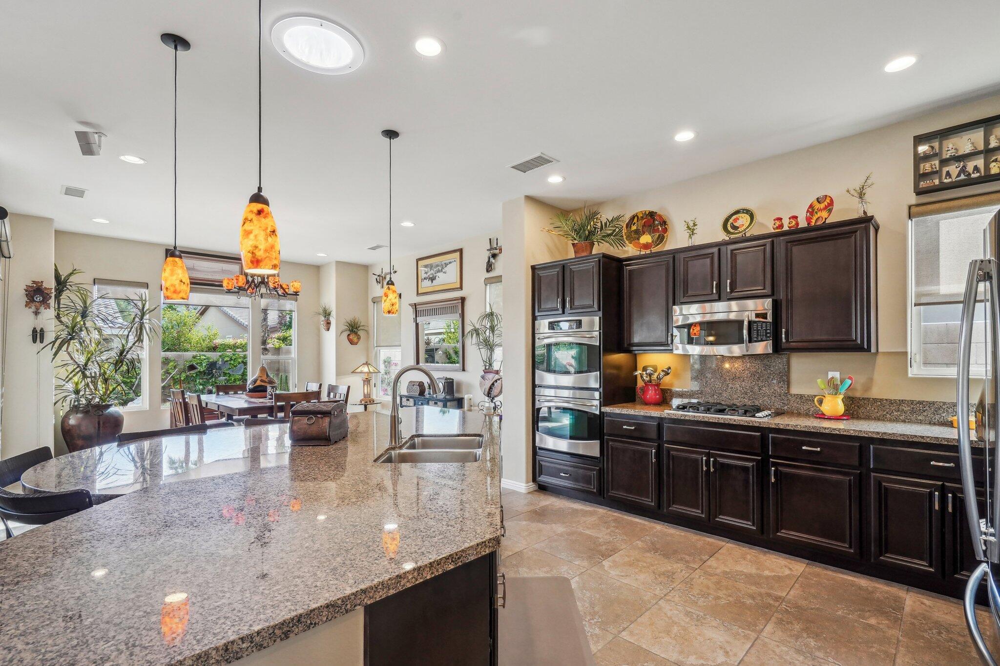 Nestled in the highly sought-after Trilogy La Quinta 55+ Resort Community, this stunning Caspian plan with a Tuscan elevation and energy-efficient solar system is the epitome of desert luxury. From its impressive curb appeal to its thoughtfully designed 1,775 sq. ft. interior, this 2-bedroom, 2-bath home with a versatile den/office offers the perfect blend of elegance and comfort. The inviting great room features a cozy tile-encased fireplace with gas logs, a TV/media niche, and surround sound, all complemented by custom window treatments and sleek tile flooring. The gourmet kitchen is a chef's delight, boasting slab granite counters, stainless appliances, double ovens, gas cooktop, espresso cabinetry with brushed nickel pulls, and a large prep island with bar seating and pendant lighting. The primary suite is a private sanctuary, with French doors leading to the backyard, a spa-inspired en suite with dual vanities, plantation shutters, slab counters, and a tiled shower enclosure. Thoughtfully separated guest quarters ensure privacy for visitors, with a nearby bath featuring travertine tile finishes. Step outside to your serene backyard oasis, complete with a covered patio, expansive concrete deck, and lush professional landscaping--the perfect setting for relaxing or entertaining under the desert skies. Don't forget the extra garage golf cart parking space!!Interested in this Listing?