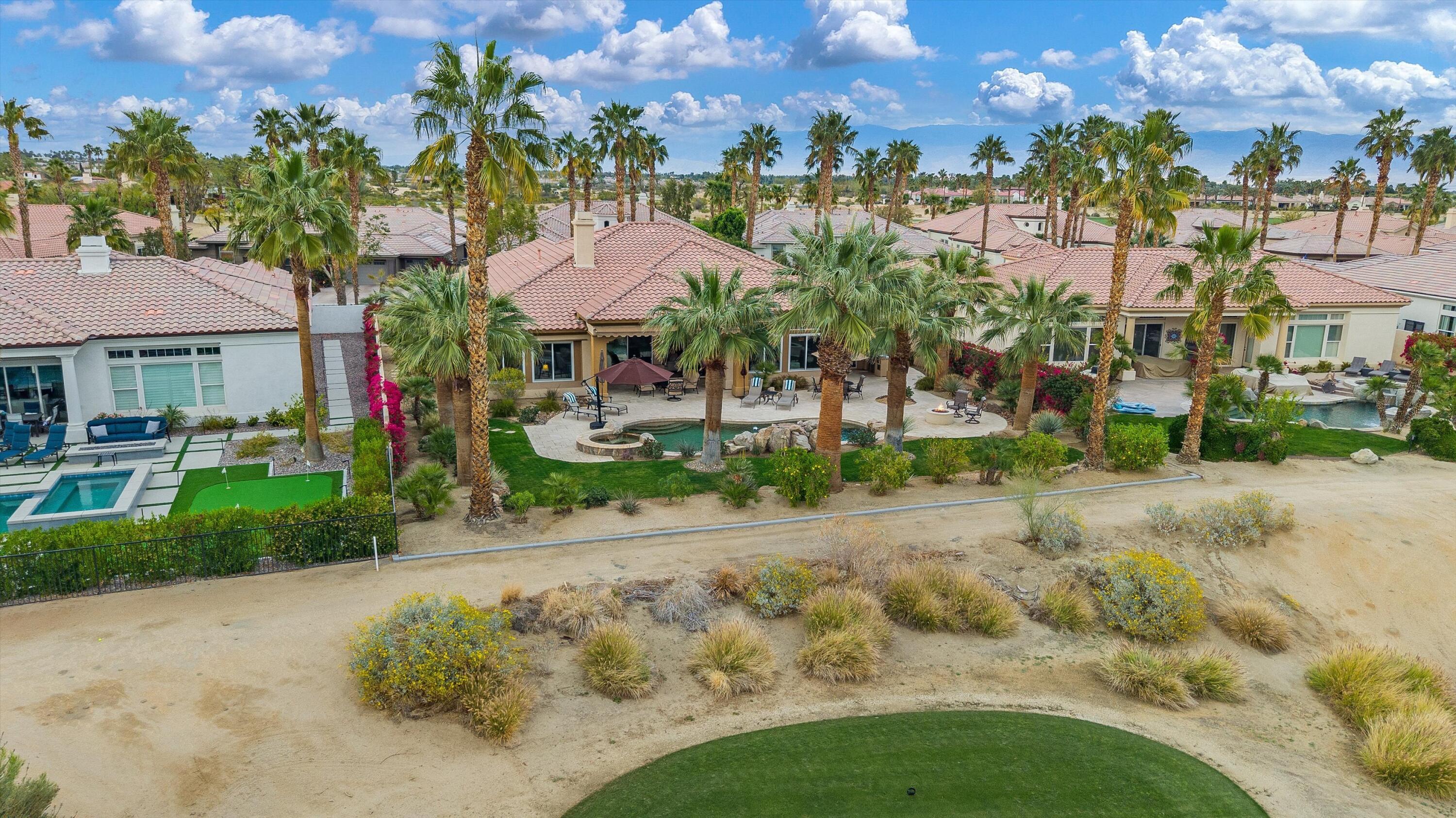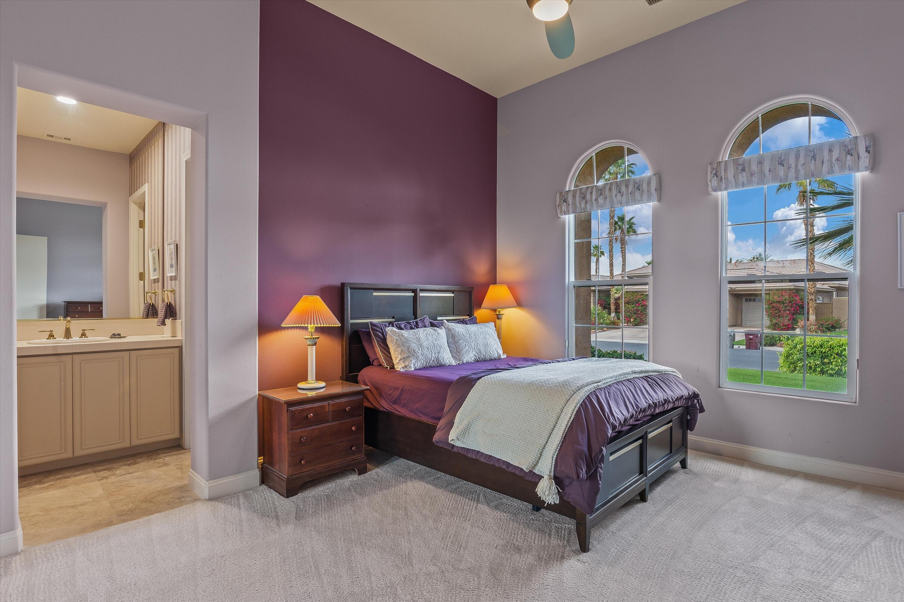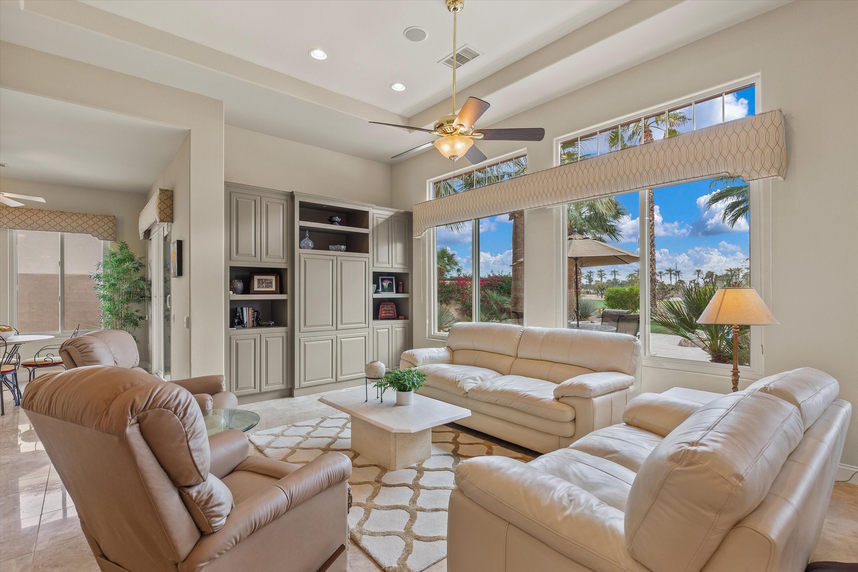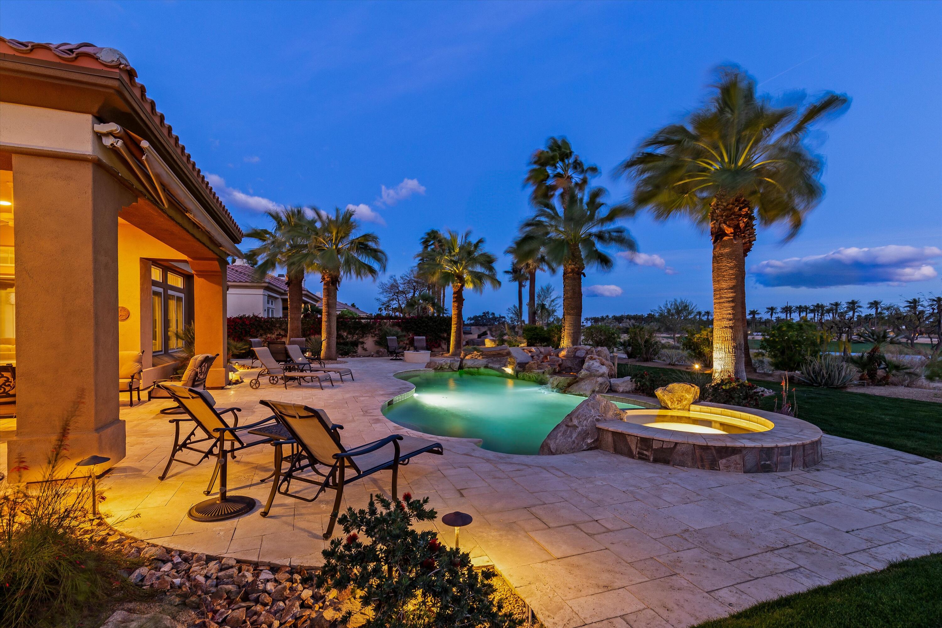 This specially cared for PGA West home sits on a secluded lot that measures over a third of an acre, and is situated ABOVE the 14th tee box with sweeping SOUTHERN double fairway VIEWS of the Greg Norman Golf Course and Santa Rosa Mountains. The backyard has been completely REMODELED with travertine stone decking, mature palms, native plants, pebble tech pool with waterfall, spa and two heaters, fire chat area, built-in barbecue, California room with recessed overhead, infra red heaters, automated awning and misters for YEAR-ROUND OUTDOOR ENJOYMENT. The Toll Brothers Mendocino plan is a spectacular home that begins with a welcoming porch and calming fountain leading into a grand foyer of polished travertine. Its unique floor plan feels open and spacious with its 12' high ceilings, offering VIEWS out to the yard and pool, and flows easily from one space to the next: A formal dining area with a dramatic 20' high skylight, an inviting living room anchored by a grand fireplace, an entertainer's wet bar with ample seating, a casual lounge area with built in book case and TV, and of course, a gourmet kitchen with island, walk-in pantry, and breakfast area. The primary suite also overlooks the pool and views of the golf course and has its own backyard access. It includes an en suite bath featuring a luxurious Roman therapeutic whirlpool tub, separate shower and dual vanities, plus walk in closet with built-ins. There is a 2-car garage plus adjacent golf cart garage so you can easily commute to all 6 world-renowned golf courses within the community. HOA includes 24-hour attended security gate, front & backyard landscaping and water, front yard lighting, expanded cable & Internet package.Interested in this Listing?