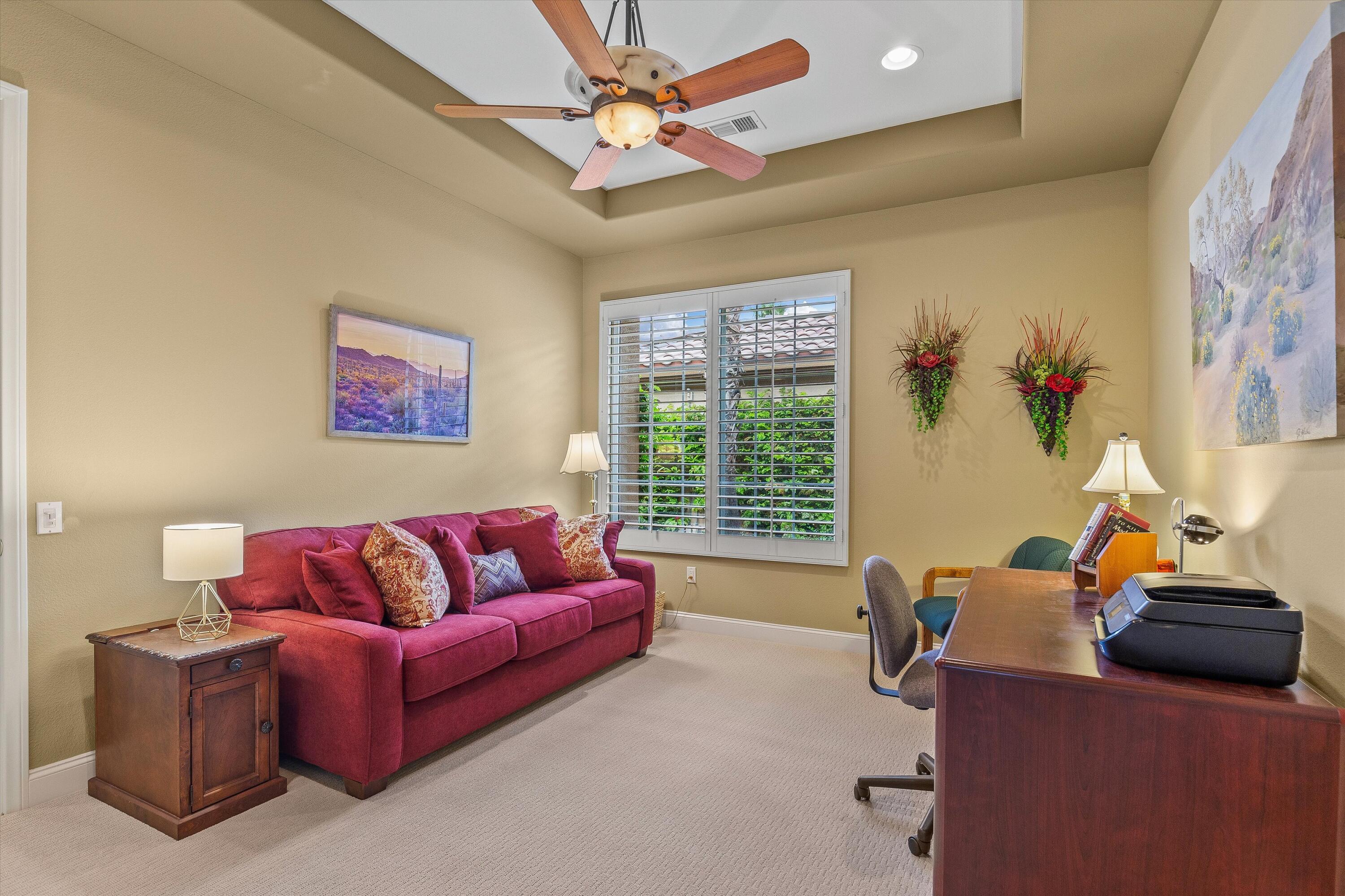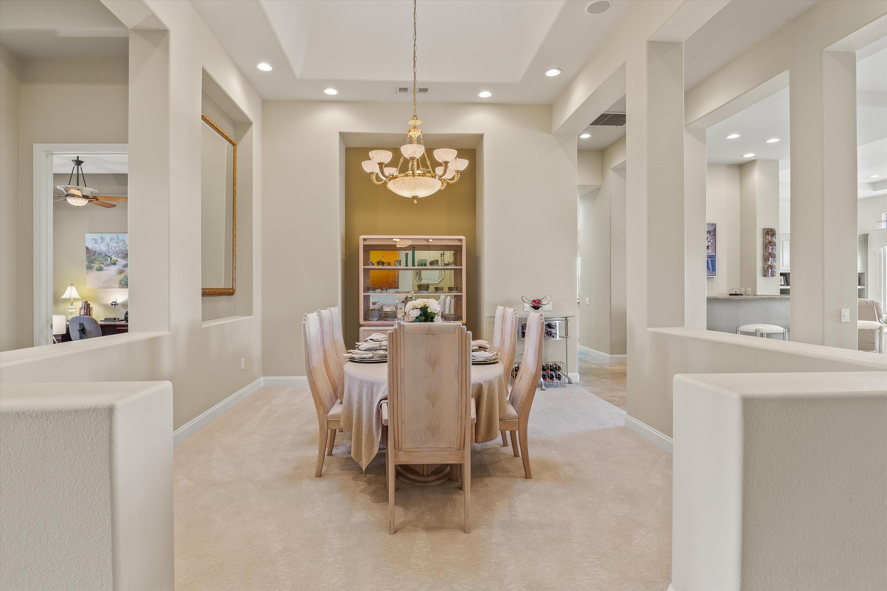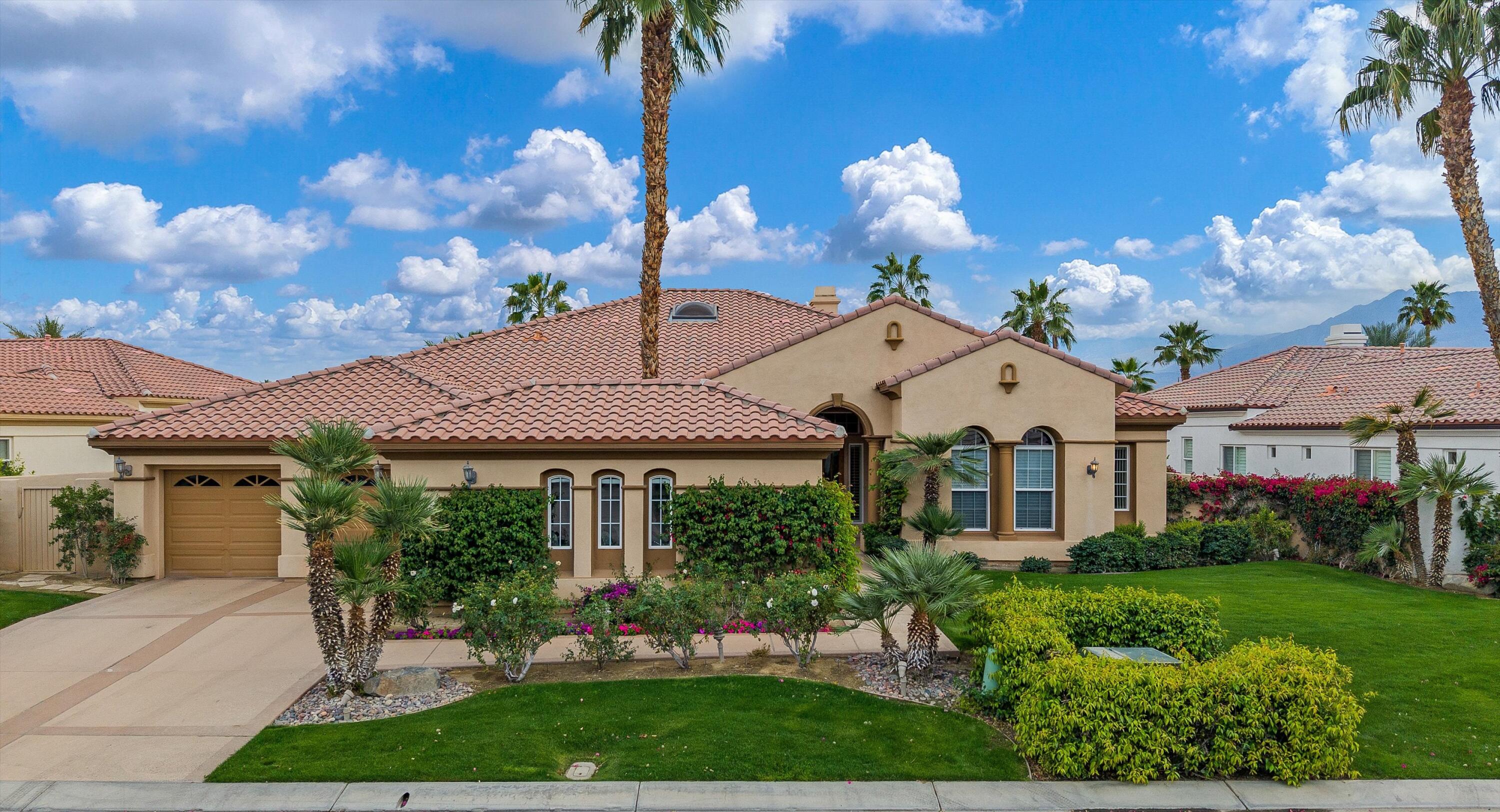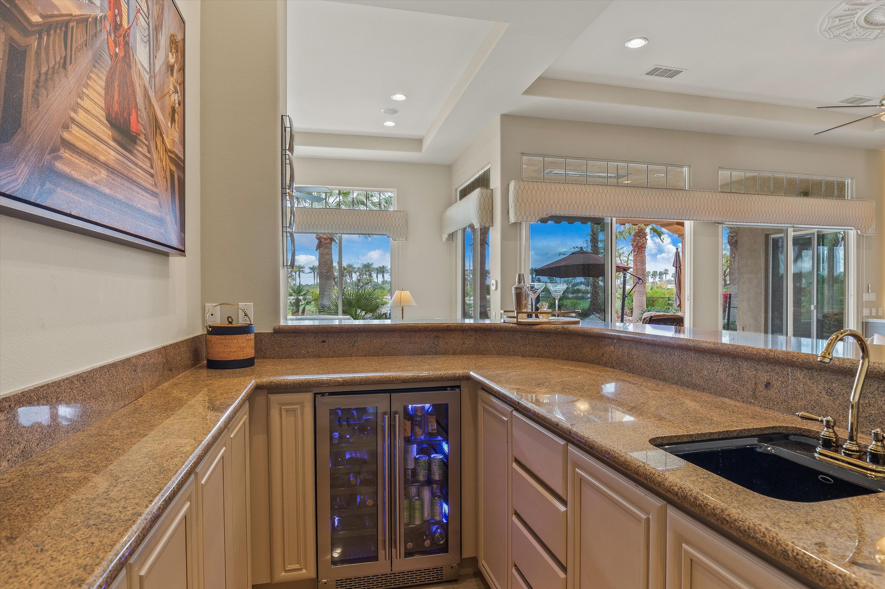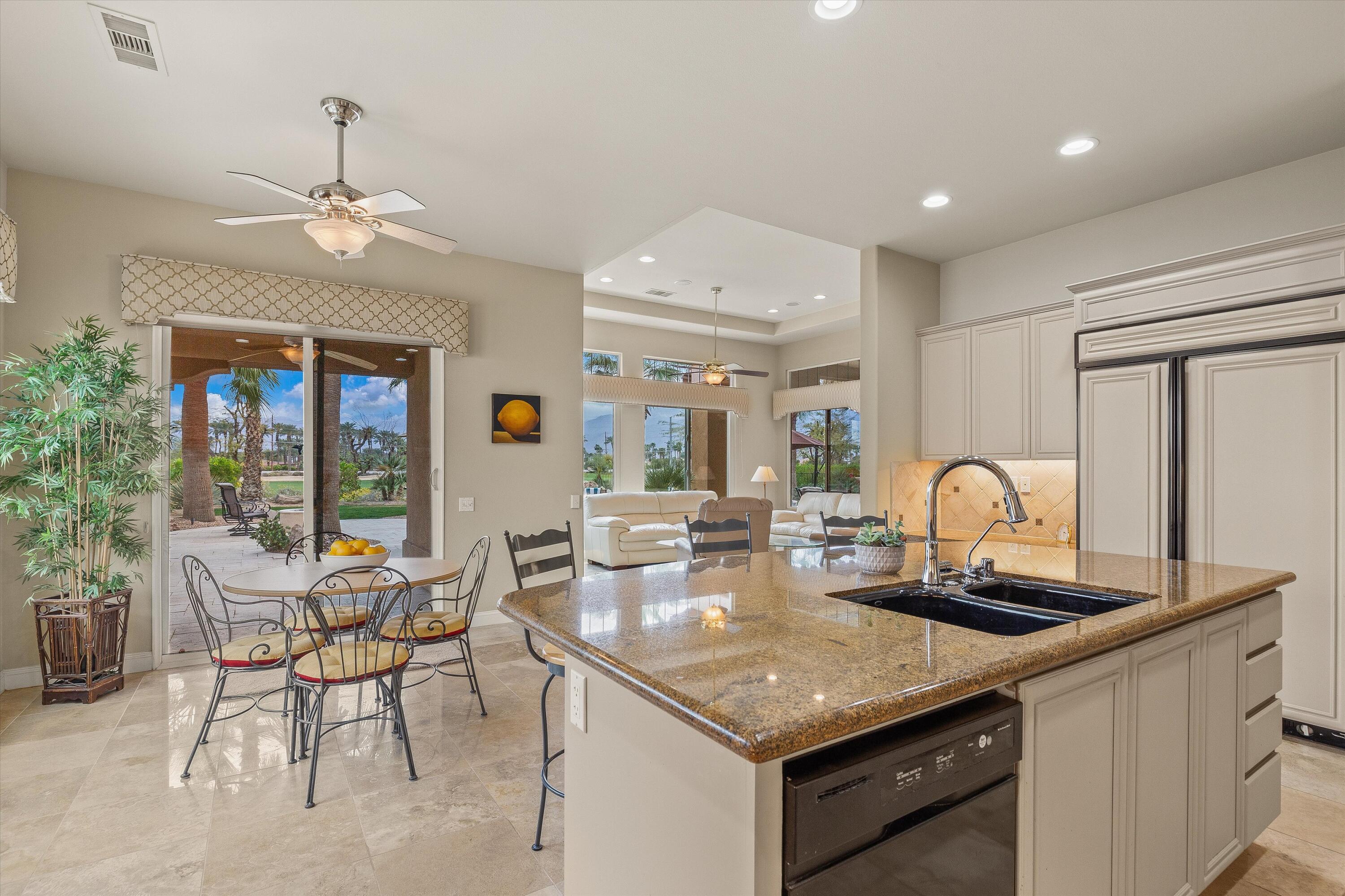 This specially cared for PGA West home sits on a secluded lot that measures over a third of an acre, and is situated ABOVE the 14th tee box with sweeping SOUTHERN double fairway VIEWS of the Greg Norman Golf Course and Santa Rosa Mountains. The backyard has been completely REMODELED with travertine stone decking, mature palms, native plants, pebble tech pool with waterfall, spa and two heaters, fire chat area, built-in barbecue, California room with recessed overhead, infra red heaters, automated awning and misters for YEAR-ROUND OUTDOOR ENJOYMENT. The Toll Brothers Mendocino plan is a spectacular home that begins with a welcoming porch and calming fountain leading into a grand foyer of polished travertine. Its unique floor plan feels open and spacious with its 12' high ceilings, offering VIEWS out to the yard and pool, and flows easily from one space to the next: A formal dining area with a dramatic 20' high skylight, an inviting living room anchored by a grand fireplace, an entertainer's wet bar with ample seating, a casual lounge area with built in book case and TV, and of course, a gourmet kitchen with island, walk-in pantry, and breakfast area. The primary suite also overlooks the pool and views of the golf course and has its own backyard access. It includes an en suite bath featuring a luxurious Roman therapeutic whirlpool tub, separate shower and dual vanities, plus walk in closet with built-ins. There is a 2-car garage plus adjacent golf cart garage so you can easily commute to all 6 world-renowned golf courses within the community. HOA includes 24-hour attended security gate, front & backyard landscaping and water, front yard lighting, expanded cable & Internet package.Interested in this Listing?