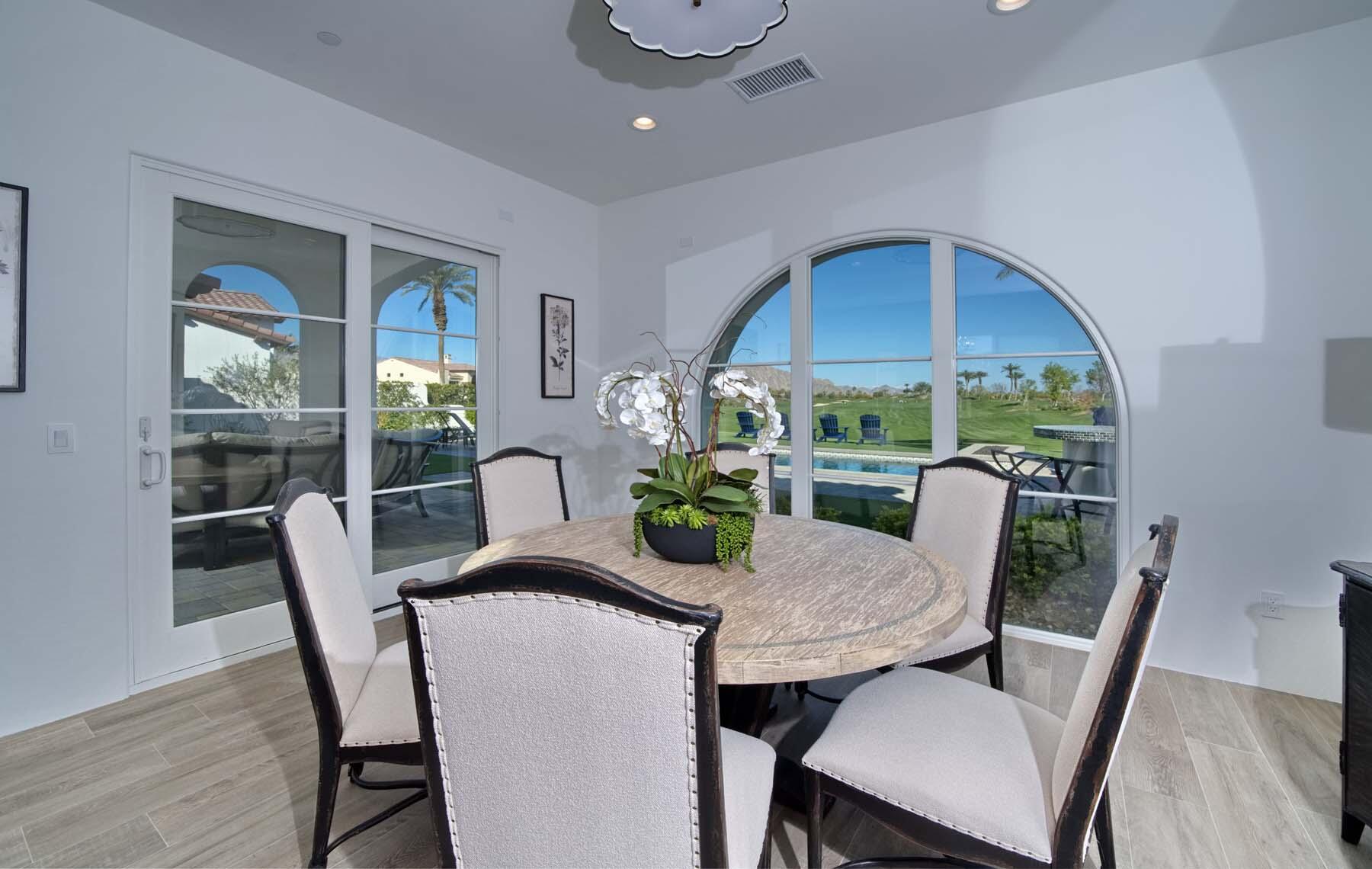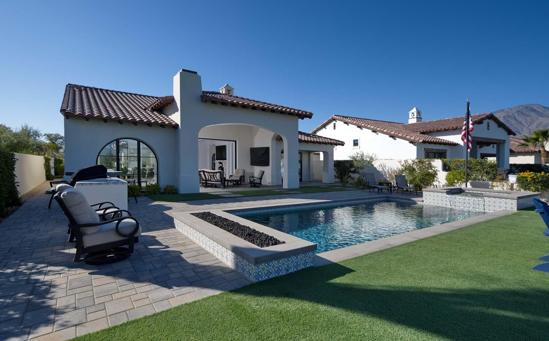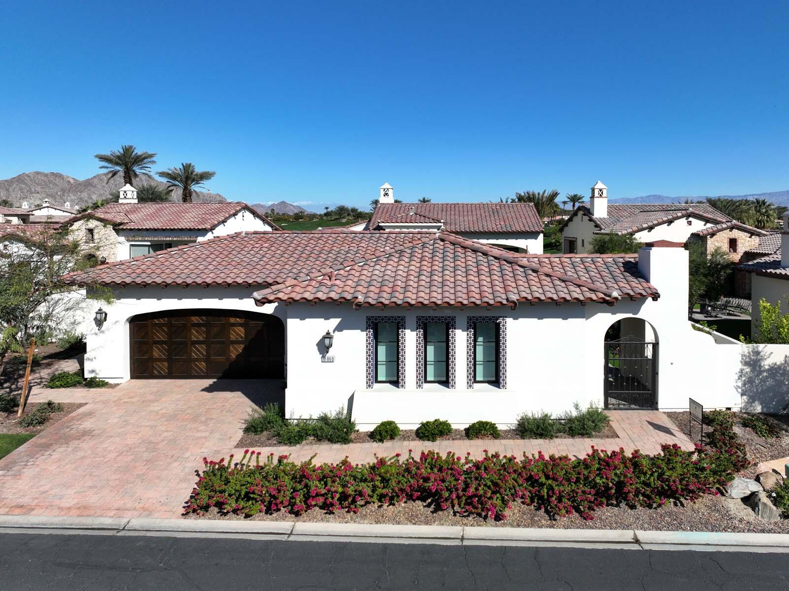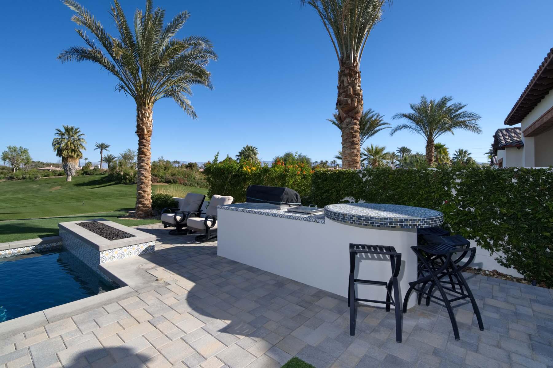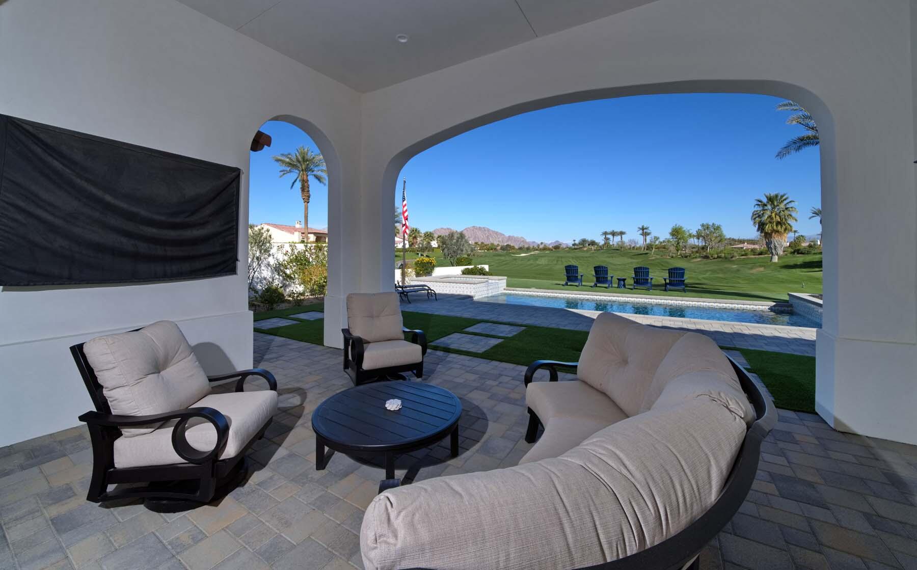 This highly upgraded Plan 322 at Andalusia Country Club offers 3,560 sq. ft. of exquisite desert living, perfectly positioned with stunning views down the 6th fairway and the Santa Rosa Mountains beyond. Impeccably furnished, this home combines luxury and comfort with every detail thoughtfully curated. The open-concept great room seamlessly flows into the gourmet kitchen, while a separate morning room provides an inviting space for casual dining, all opening to a private covered patio and expansive interior courtyard. Disappearing sliding glass doors enhance the home's airy feel and effortless transition between indoor and outdoor spaces. A wet bar with seating serves both the great room and patio, ideal for hosting gatherings. The master suite is a true retreat, featuring a freestanding tub, separate shower, and dual walk-in closets. A private casita with its own entrance offers the perfect space for guests or a home office. Throughout the home, you'll find high-end finishes, custom lighting, and a sophisticated design that creates an atmosphere of effortless elegance. The backyard is an entertainer's paradise, with a custom pool and spa offering a serene outdoor living experience. Blending modern design with desert charm, this home exemplifies the ultimate in luxury living. Turnkey furnished per inventory.Interested in this Listing?