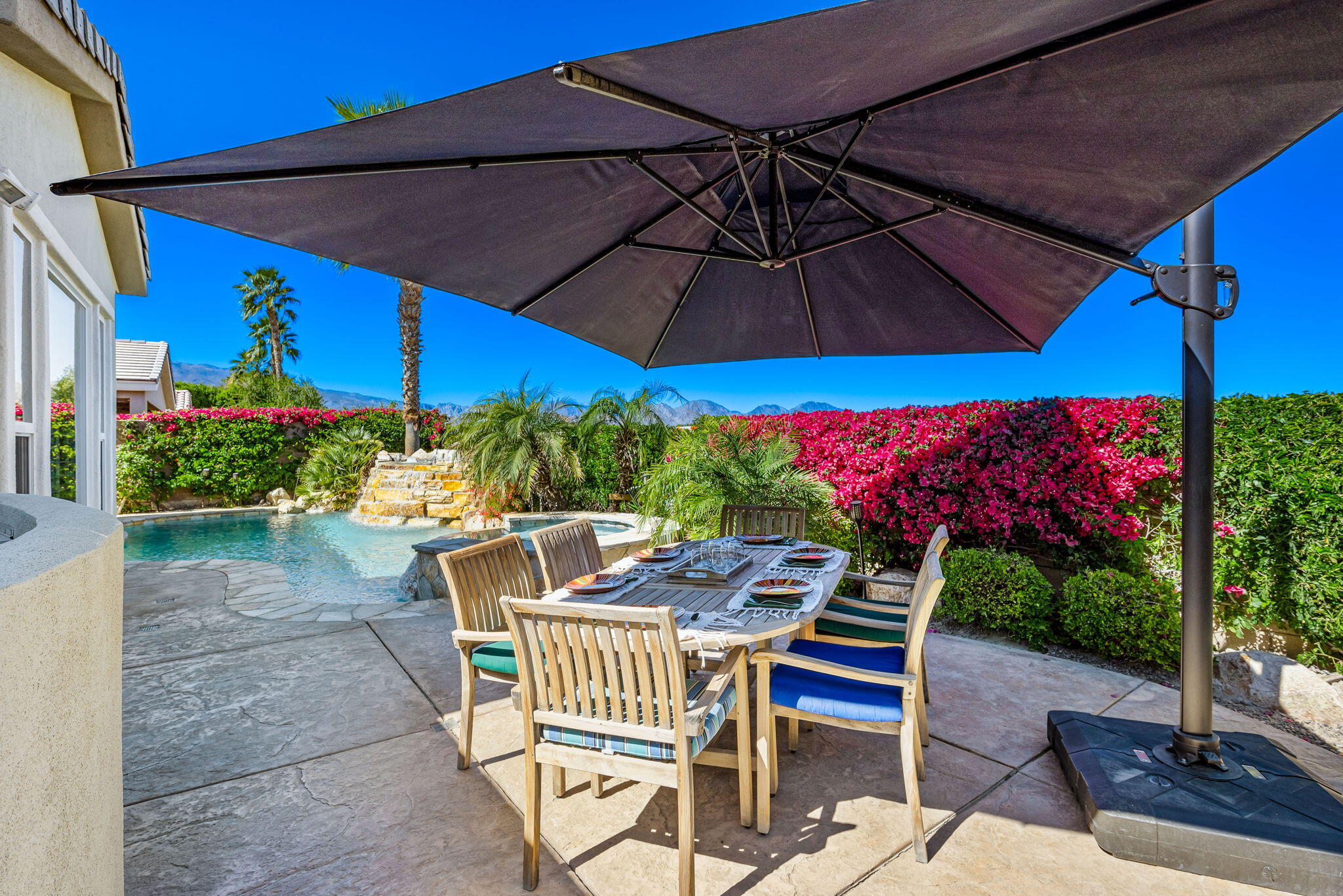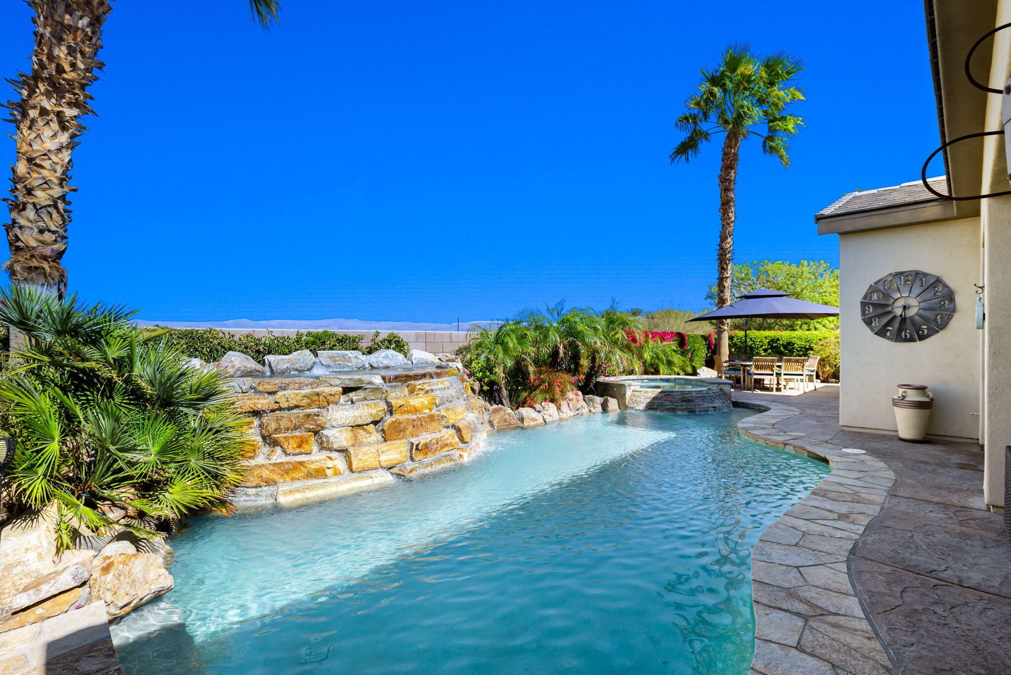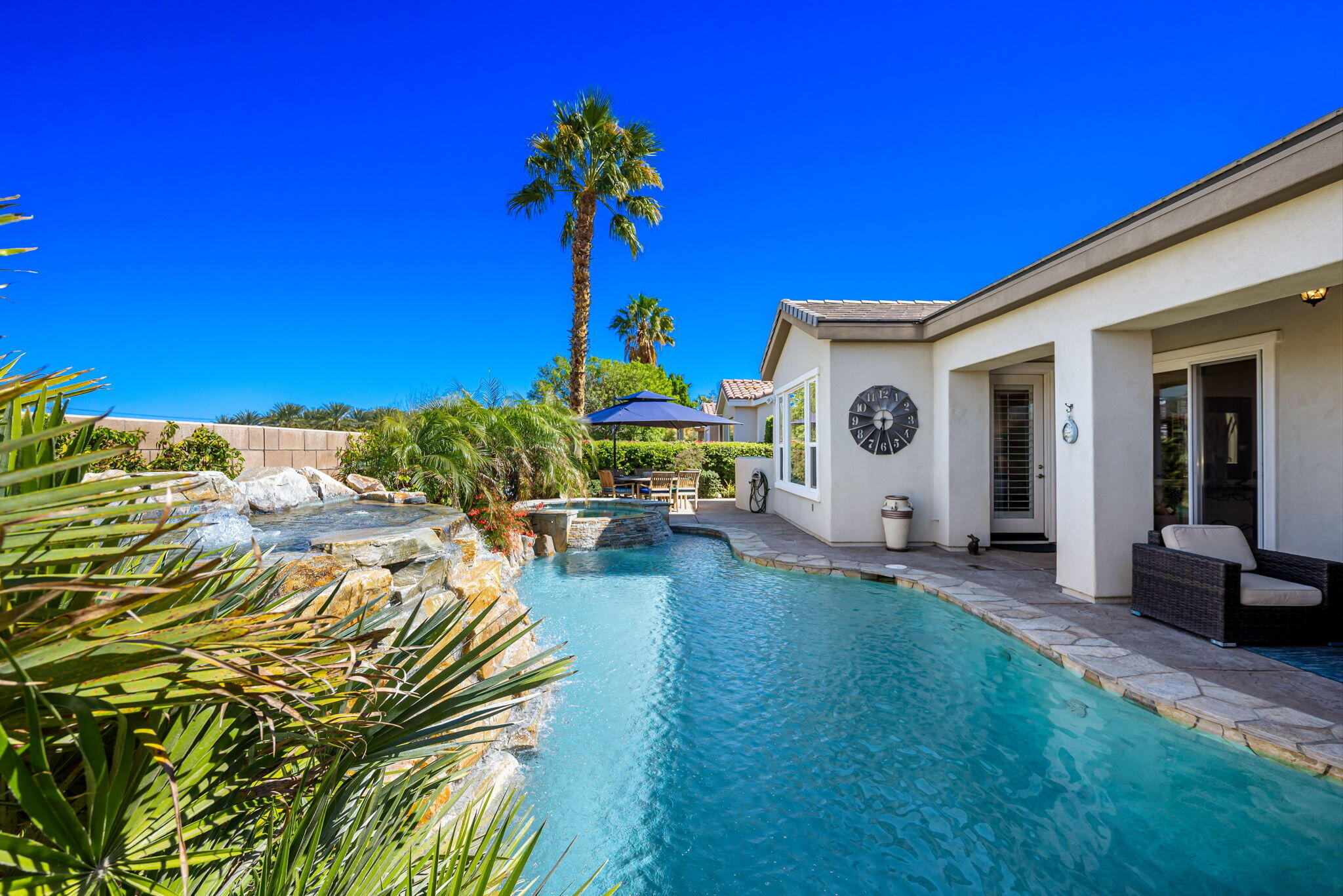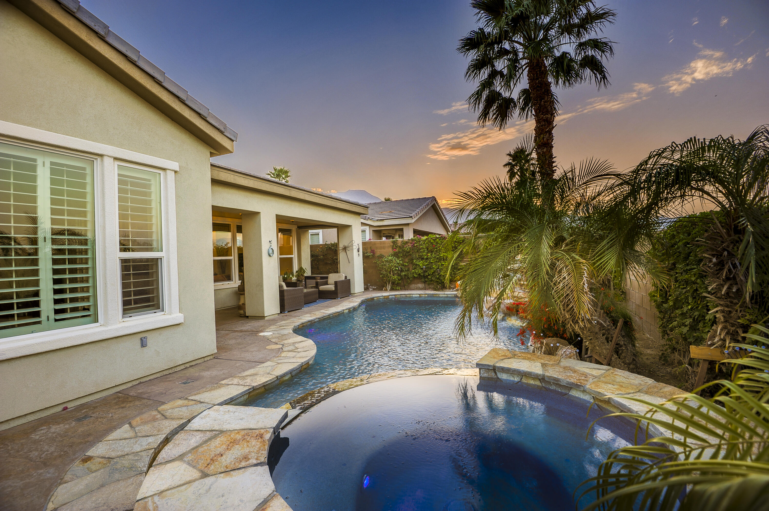 Quality, Artful Elegance, Privacy...the Perfect Desert Retreat! Indoor and outdoor living at its best, the home is a spacious 2,584 SQ FT, with 3-bedrooms, each with an ensuite full bath, a formal dining room, two covered outdoor patios, one with a custom BBQ Station, a gourmet kitchen, and a primary bedroom retreat to love. Bask in the sun, and delight in the soothing sounds of the grand waterfalls and elevated stack-stone spa as they cascade into the salt water pebble-tec pool. At twilight soothe in the spa, and dine outside while enjoying the bold colors of sunset as the sun dips below the mountains. Inside, delight in the ten-foot ceilings, cool tile floors, expansive windows with custom coverings, and plantation shutters in all three bedrooms. The Gourmet kitchen features dual slab-granite islands, one for cooking and prep work, the other a large dining and entertainment island with seating for five, a sink and wine/beverage cooler. Upgraded stainless steel appliances include: refrigerator with filtered water and ice-maker, a five-burner cooktop and range hood, double oven, and dishwasher. Gorgeous smooth slab granite graces the countertops and the travertine backsplash elevates the warmth and beauty of the custom wood cabinets. Make special memories with family and friends in the formal dining room. A dreamy Primary Bedroom Retreat features direct access to the patio and spa, two closets one, a large walk-in, and a mirrored wall closet. The spacious zen-like bathroom offers dual vanities, a soaking tub, and a large walk-in shower all enveloped in creamy custom granite and stone. A bonus room adds space for an office, fitness, or craft room.The garage fits two vehicles and golf cart, with room for storage, bikes, and other toys. Come see it and fall in love!Interested in this Listing?