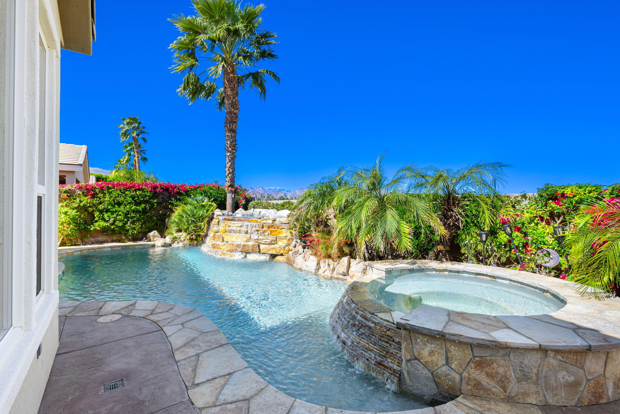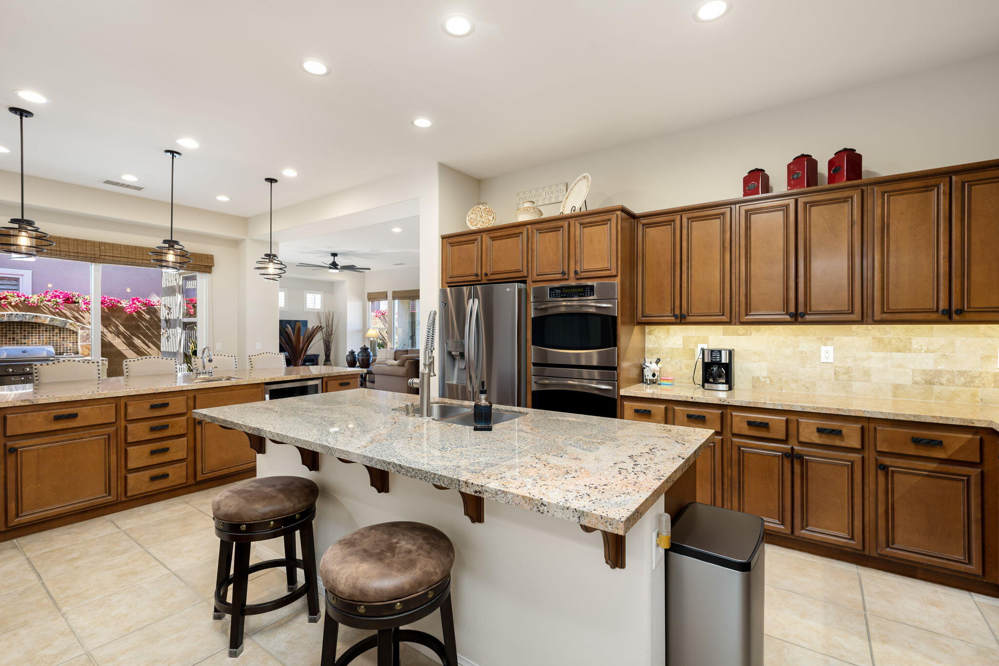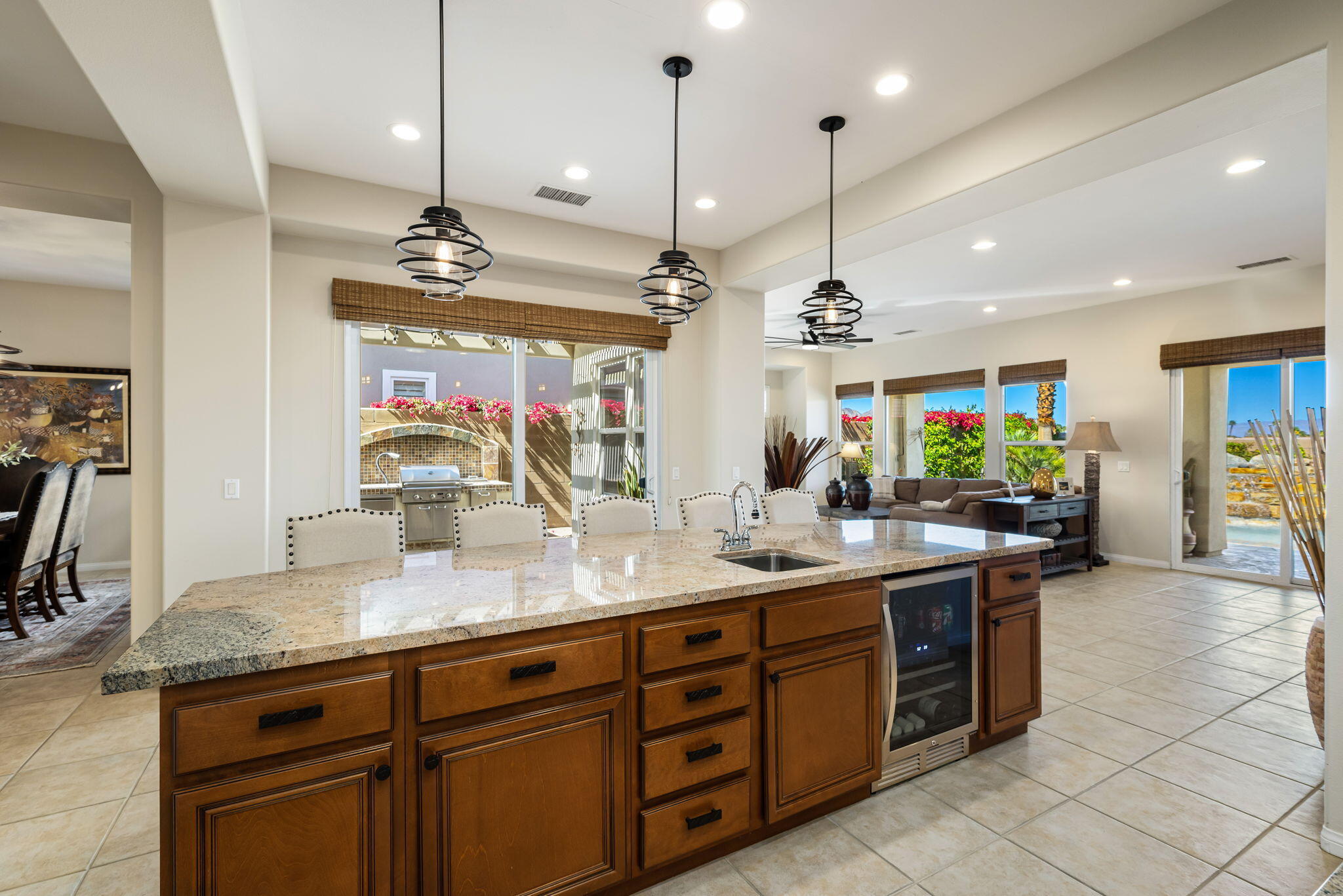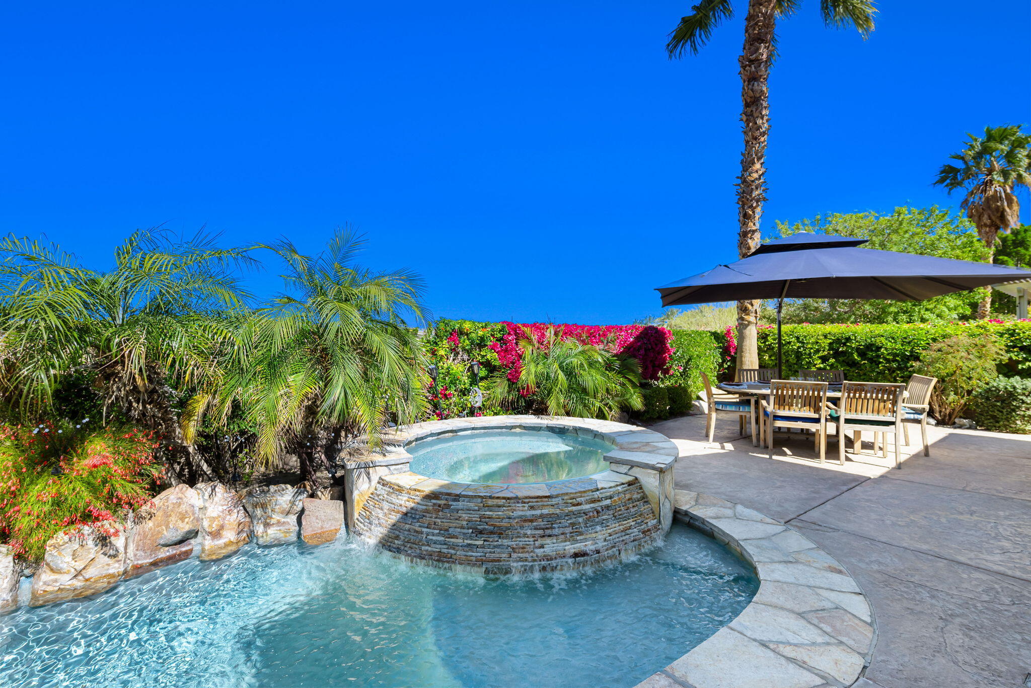 Quality, Artful Elegance, Privacy...the Perfect Desert Retreat! Indoor and outdoor living at its best, the home is a spacious 2,584 SQ FT, with 3-bedrooms, each with an ensuite full bath, a formal dining room, two covered outdoor patios, one with a custom BBQ Station, a gourmet kitchen, and a primary bedroom retreat to love. Bask in the sun, and delight in the soothing sounds of the grand waterfalls and elevated stack-stone spa as they cascade into the salt water pebble-tec pool. At twilight soothe in the spa, and dine outside while enjoying the bold colors of sunset as the sun dips below the mountains. Inside, delight in the ten-foot ceilings, cool tile floors, expansive windows with custom coverings, and plantation shutters in all three bedrooms. The Gourmet kitchen features dual slab-granite islands, one for cooking and prep work, the other a large dining and entertainment island with seating for five, a sink and wine/beverage cooler. Upgraded stainless steel appliances include: refrigerator with filtered water and ice-maker, a five-burner cooktop and range hood, double oven, and dishwasher. Gorgeous smooth slab granite graces the countertops and the travertine backsplash elevates the warmth and beauty of the custom wood cabinets. Make special memories with family and friends in the formal dining room. A dreamy Primary Bedroom Retreat features direct access to the patio and spa, two closets one, a large walk-in, and a mirrored wall closet. The spacious zen-like bathroom offers dual vanities, a soaking tub, and a large walk-in shower all enveloped in creamy custom granite and stone. A bonus room adds space for an office, fitness, or craft room.The garage fits two vehicles and golf cart, with room for storage, bikes, and other toys. Come see it and fall in love!Interested in this Listing?