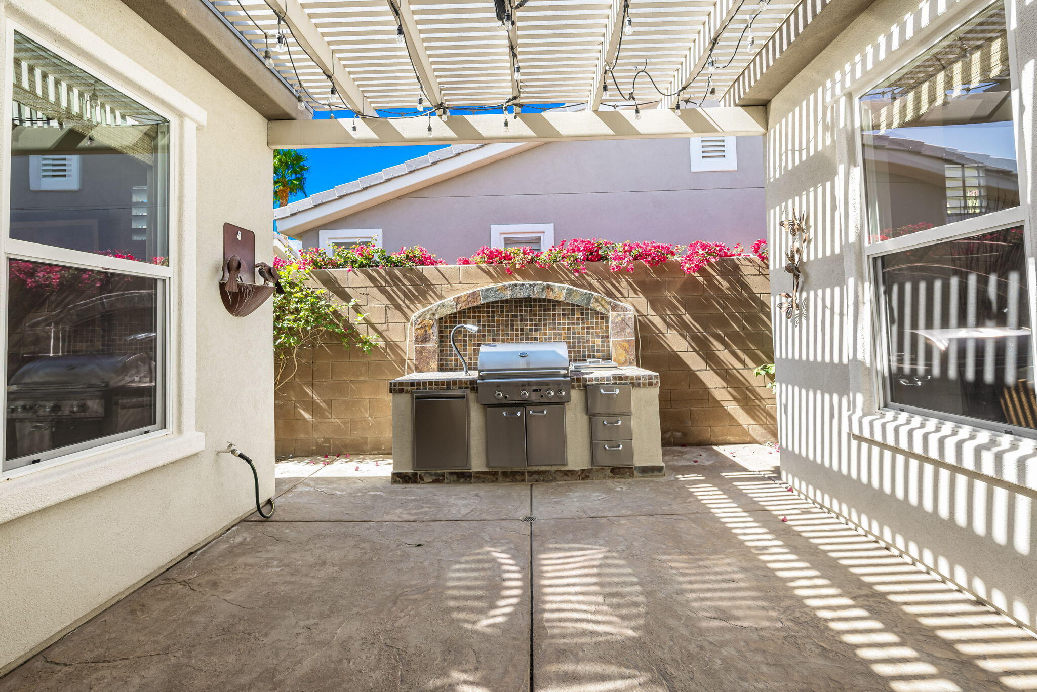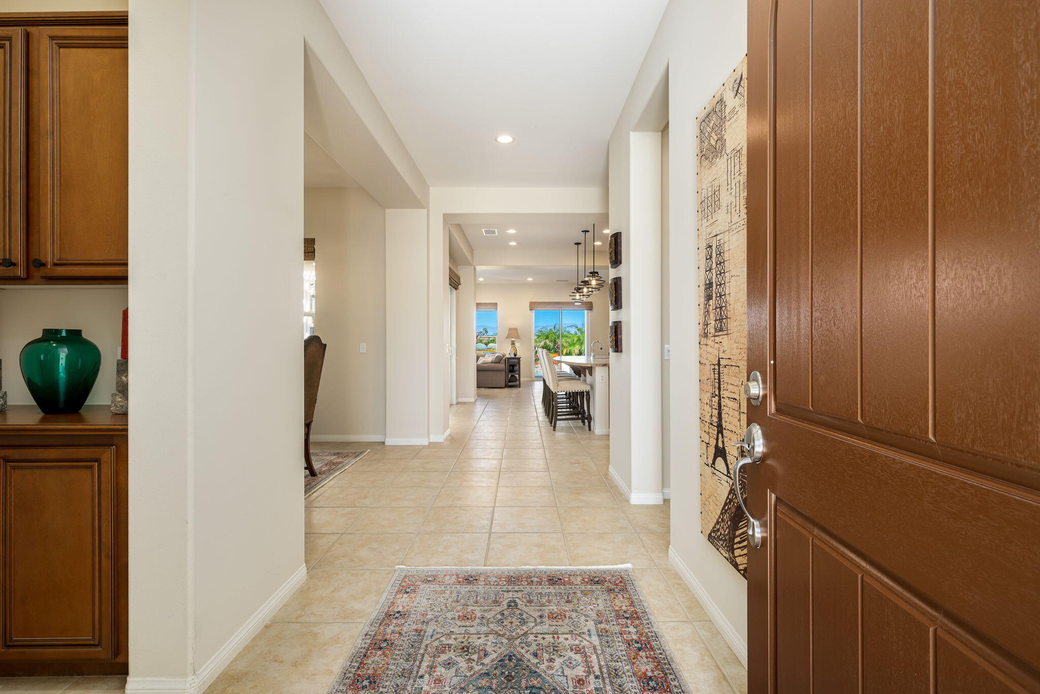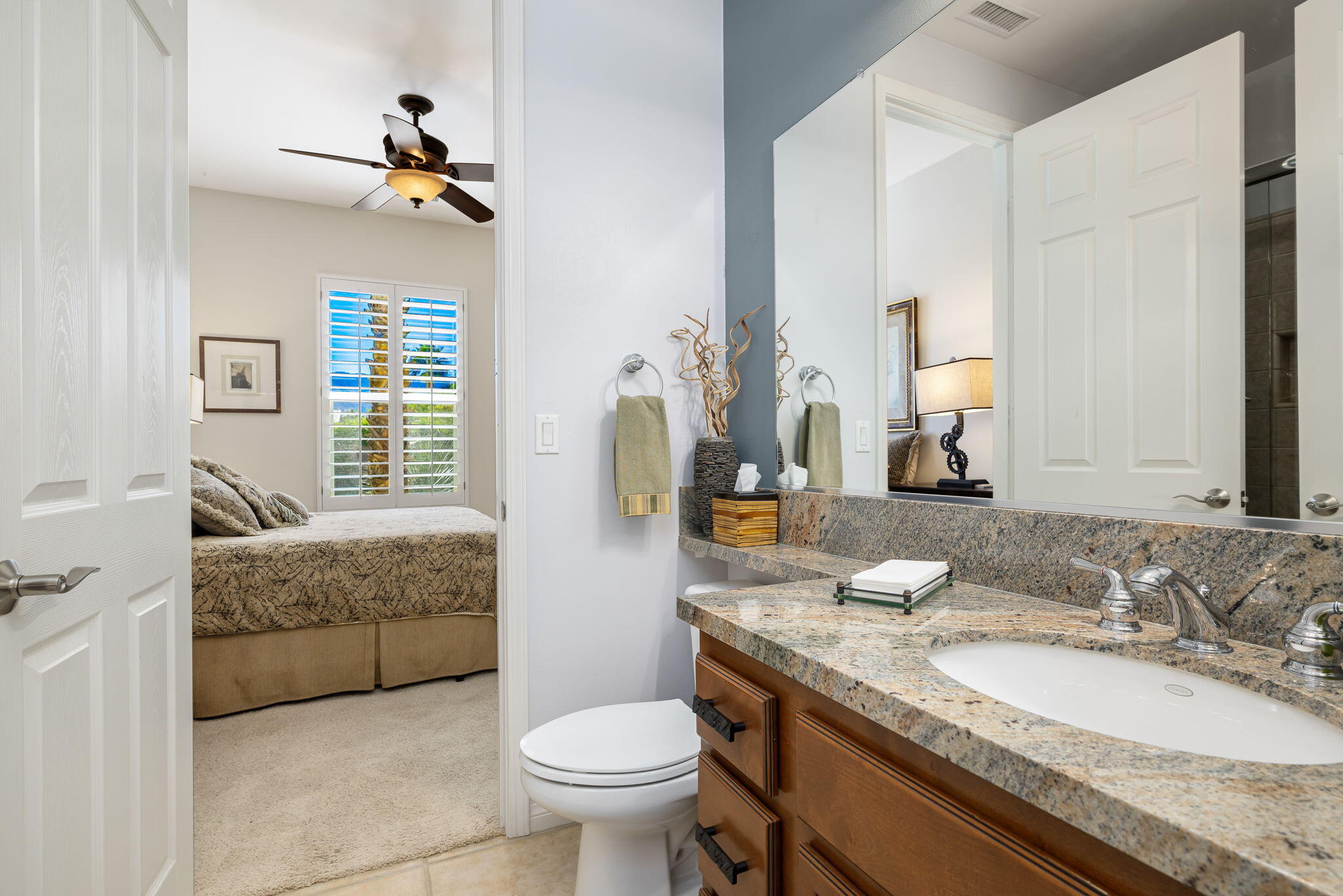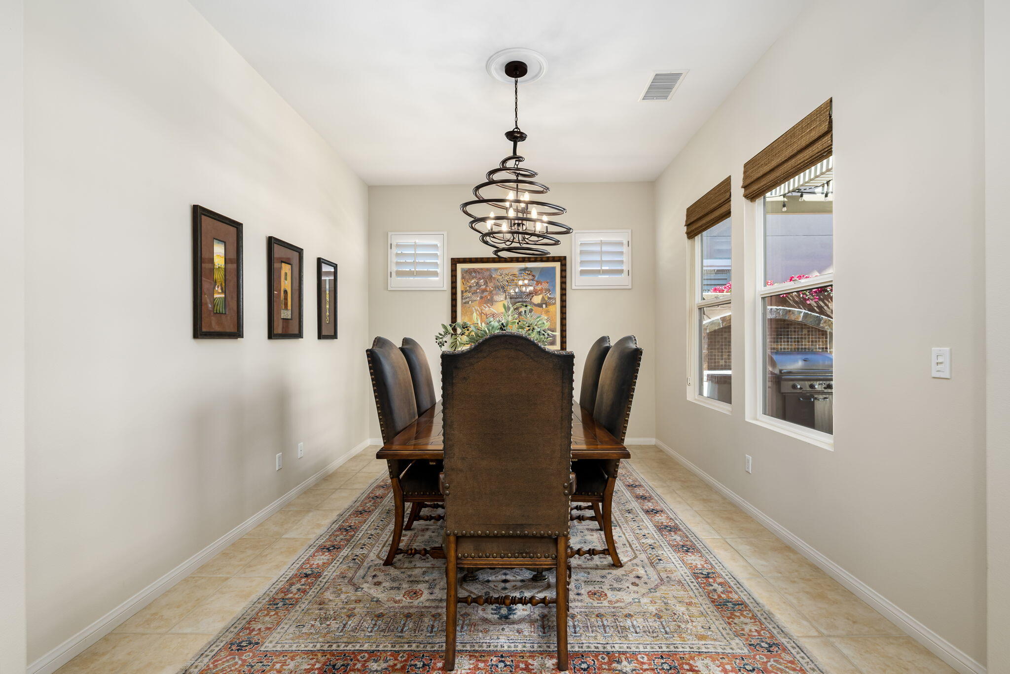 Quality, Artful Elegance, Privacy...the Perfect Desert Retreat! Indoor and outdoor living at its best, the home is a spacious 2,584 SQ FT, with 3-bedrooms, each with an ensuite full bath, a formal dining room, two covered outdoor patios, one with a custom BBQ Station, a gourmet kitchen, and a primary bedroom retreat to love. Bask in the sun, and delight in the soothing sounds of the grand waterfalls and elevated stack-stone spa as they cascade into the salt water pebble-tec pool. At twilight soothe in the spa, and dine outside while enjoying the bold colors of sunset as the sun dips below the mountains. Inside, delight in the ten-foot ceilings, cool tile floors, expansive windows with custom coverings, and plantation shutters in all three bedrooms. The Gourmet kitchen features dual slab-granite islands, one for cooking and prep work, the other a large dining and entertainment island with seating for five, a sink and wine/beverage cooler. Upgraded stainless steel appliances include: refrigerator with filtered water and ice-maker, a five-burner cooktop and range hood, double oven, and dishwasher. Gorgeous smooth slab granite graces the countertops and the travertine backsplash elevates the warmth and beauty of the custom wood cabinets. Make special memories with family and friends in the formal dining room. A dreamy Primary Bedroom Retreat features direct access to the patio and spa, two closets one, a large walk-in, and a mirrored wall closet. The spacious zen-like bathroom offers dual vanities, a soaking tub, and a large walk-in shower all enveloped in creamy custom granite and stone. A bonus room adds space for an office, fitness, or craft room.The garage fits two vehicles and golf cart, with room for storage, bikes, and other toys. Come see it and fall in love!Interested in this Listing?