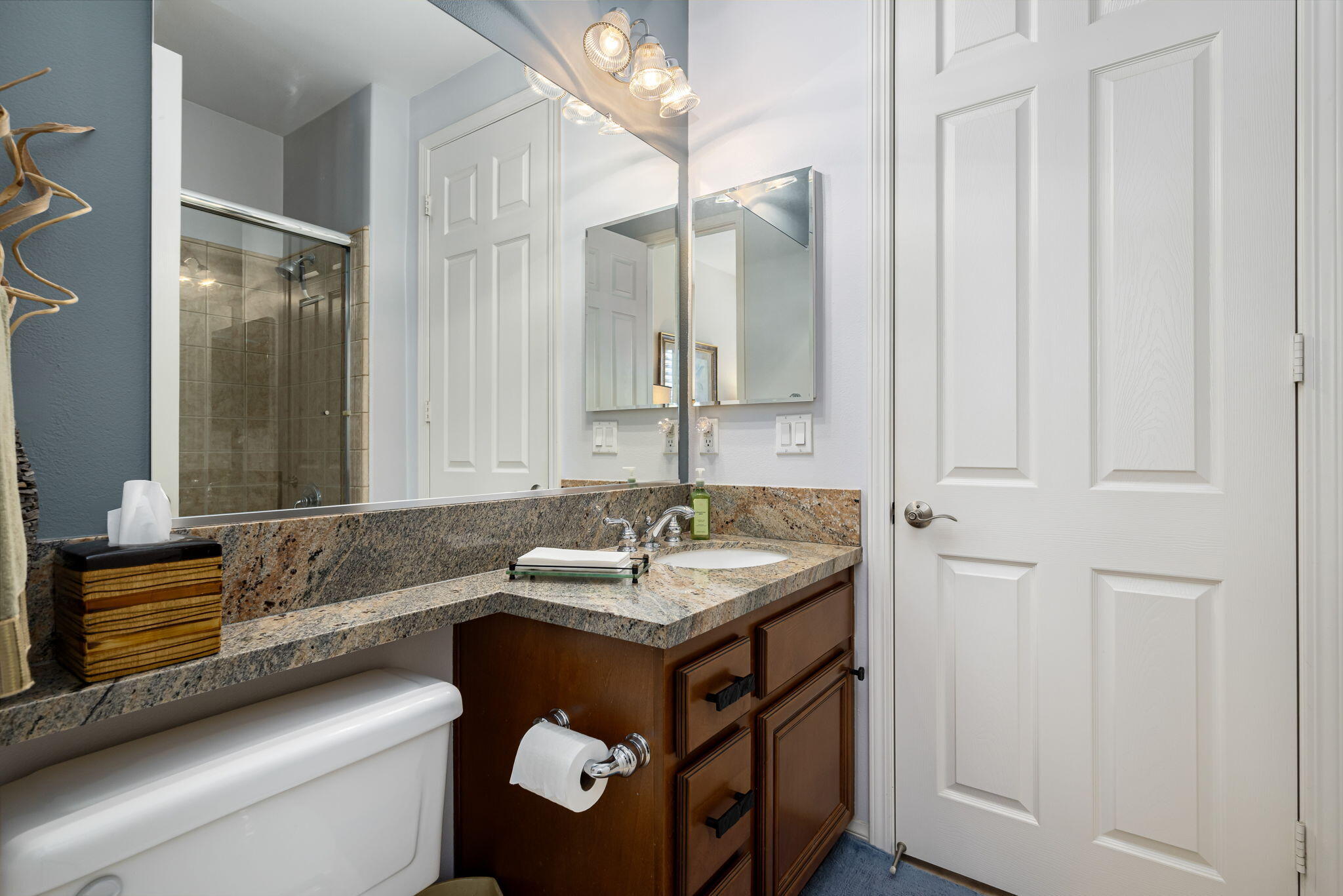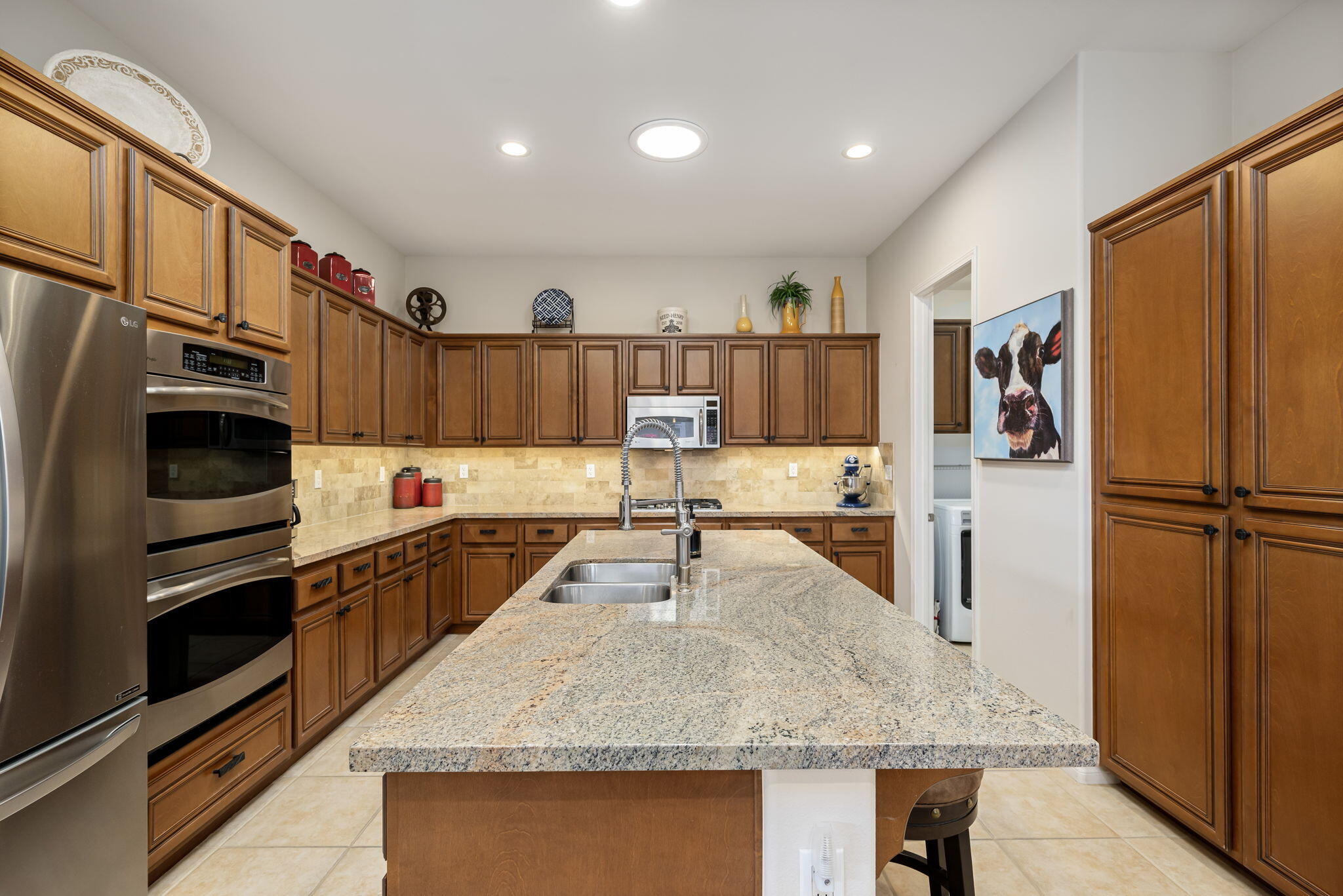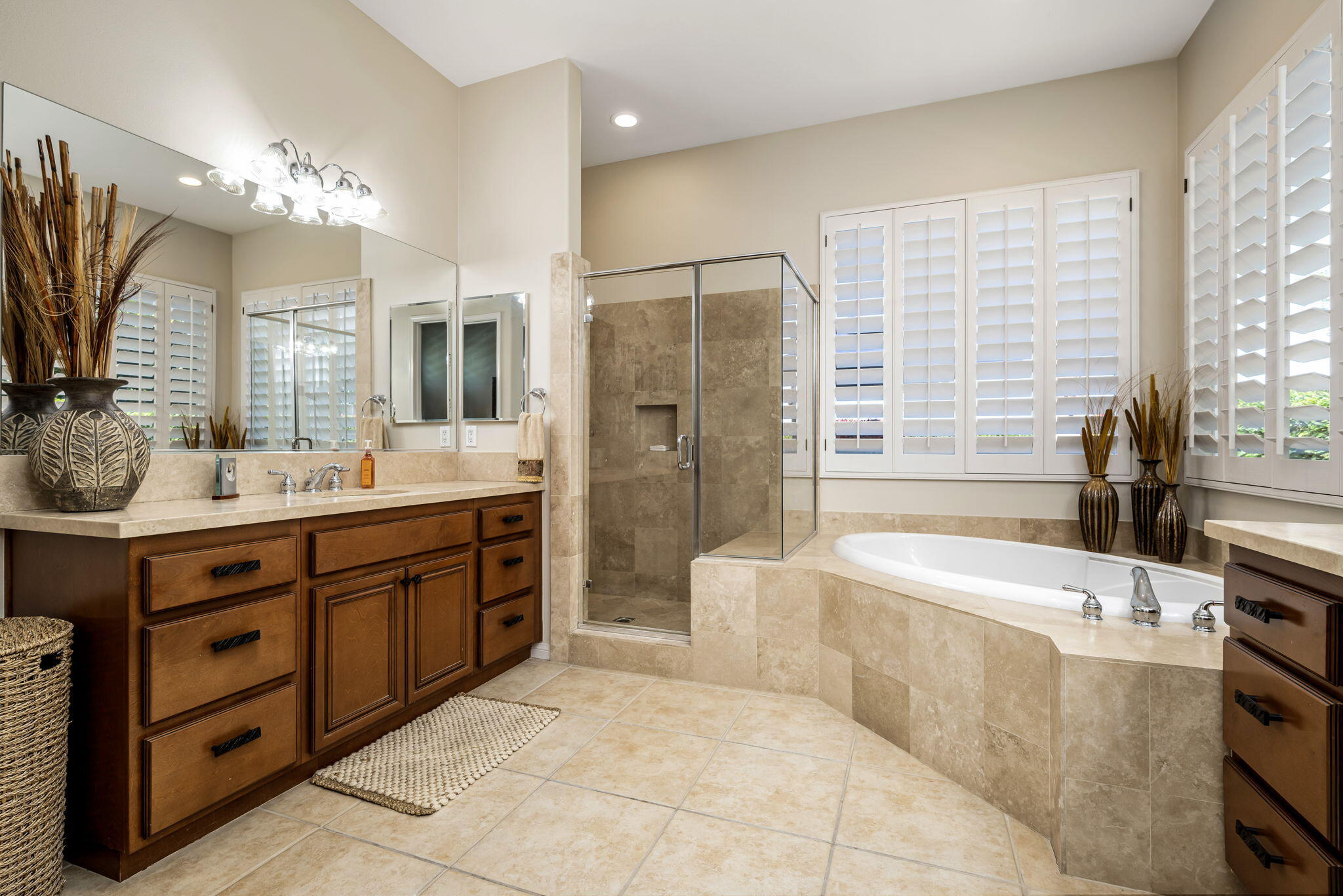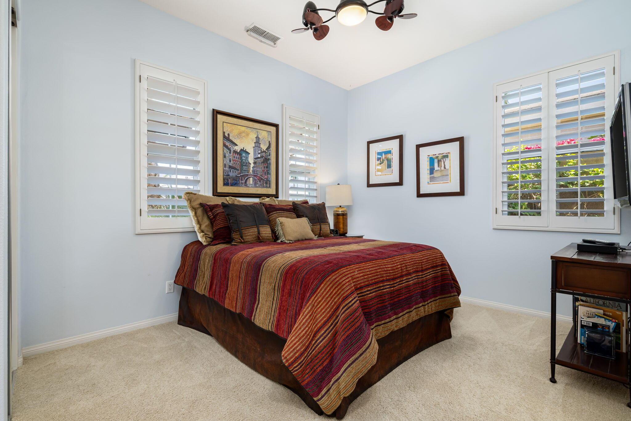 Quality, Artful Elegance, Privacy...the Perfect Desert Retreat! Indoor and outdoor living at its best, the home is a spacious 2,584 SQ FT, with 3-bedrooms, each with an ensuite full bath, a formal dining room, two covered outdoor patios, one with a custom BBQ Station, a gourmet kitchen, and a primary bedroom retreat to love. Bask in the sun, and delight in the soothing sounds of the grand waterfalls and elevated stack-stone spa as they cascade into the salt water pebble-tec pool. At twilight soothe in the spa, and dine outside while enjoying the bold colors of sunset as the sun dips below the mountains. Inside, delight in the ten-foot ceilings, cool tile floors, expansive windows with custom coverings, and plantation shutters in all three bedrooms. The Gourmet kitchen features dual slab-granite islands, one for cooking and prep work, the other a large dining and entertainment island with seating for five, a sink and wine/beverage cooler. Upgraded stainless steel appliances include: refrigerator with filtered water and ice-maker, a five-burner cooktop and range hood, double oven, and dishwasher. Gorgeous smooth slab granite graces the countertops and the travertine backsplash elevates the warmth and beauty of the custom wood cabinets. Make special memories with family and friends in the formal dining room. A dreamy Primary Bedroom Retreat features direct access to the patio and spa, two closets one, a large walk-in, and a mirrored wall closet. The spacious zen-like bathroom offers dual vanities, a soaking tub, and a large walk-in shower all enveloped in creamy custom granite and stone. A bonus room adds space for an office, fitness, or craft room.The garage fits two vehicles and golf cart, with room for storage, bikes, and other toys. Come see it and fall in love!Interested in this Listing?