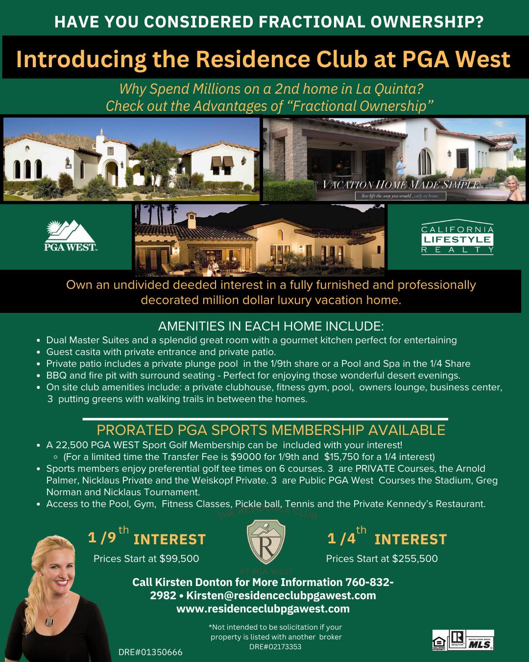 $33,000 PGA SPORT GOLF MEMBERSHIP INCLUDED WITH YOUR INTERESTTHE DESERT'S ONLY WAY TO OWN A SECOND HOME!! You will own a 1/9th undivided deeded interest in a luxury vacation home at the Residence Club at PGA West. Your 3,365 SQ FT luxury vacation home is fully furnished and professionally decorated. Each home boasts dual master suites, a guest casita with private entrance with its own private patio. A gourmet kitchen, turnkey entertainment systems and high-speed Internet. A splendid great room is perfect for entertaining family or friends. Your private patio includes a plunge pool with a natural gas outdoor fire pit!! Perfect for enjoying those wonderful desert evenings. On site club amenities include a private clubhouse with fitness, pool, spa, owners lounge, business center and 3 putting greens with walking trails, in between the Villas. Owners will enjoy preferential golf tee times at 6 courses 3 of them private, at PGA WEST! Tennis, additional fitness and at PGA WEST!Interested in this Listing?