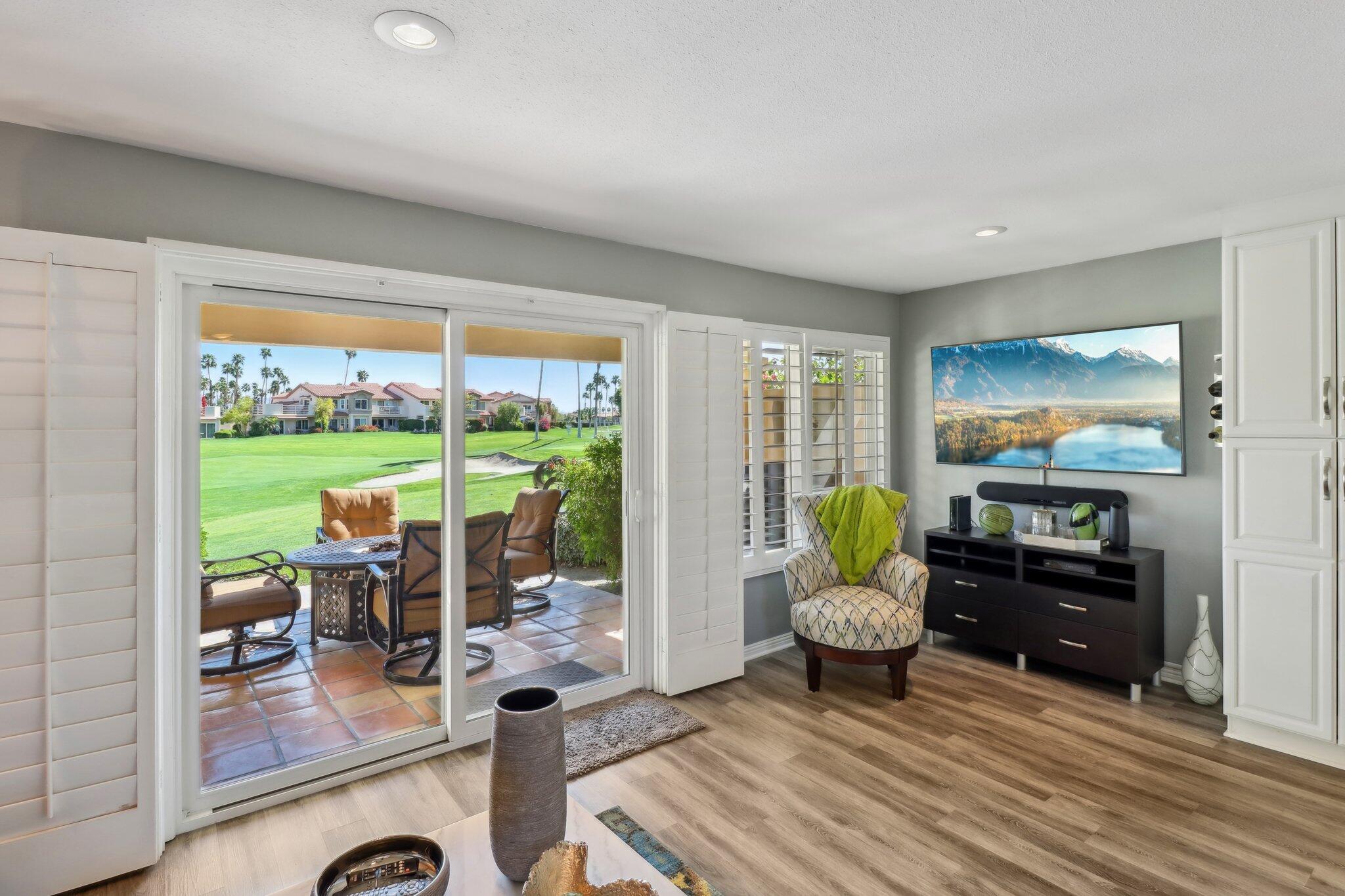 Nestled in the heart of Palm Royale, this exquisitely upgraded lower-level TURNKEY furnished condo is a true desert gem, offering breathtaking south/east-facing views of the majestic mountains and pristine golf course. Boasting 763 sq. ft. of refined living space, this 1-bedroom, 1-bath retreat is perfectly positioned across from the world-famous Indian Wells Tennis Garden--home to the prestigious BNP Paribas Open. Designed for both full-time living and luxurious seasonal escapes, this residence dazzles with a Chef's kitchen featuring stainless steel appliances, slab granite countertops, a stylish subway tile prep island, and chic pendant lighting. The open concept living and dining areas are enhanced by luxury vinyl plank flooring, plantation shutters, and a TV/media niche. A tranquil primary retreat leads to a spa-inspired bath with a vessel sink, granite counters, and a beautifully tiled shower. Beyond the interiors, enjoy resort-style amenities, including unlimited golf on the Ted Robinson-designed par-3 course, tennis and pickleball courts, and six sparkling pools. Step onto the inviting rear covered patio, where charming Saltillo tile sets the stage for a serene desert retreat. Take in the breathtaking, tranquil views that create the perfect backdrop for morning coffee, sunset cocktails, or simply unwinding in your own private oasis. Truly a great investment opportunity, particularly seasonally. HOA dues cover essential utilities, including cable and internet, making this the ultimate worry-free desert getaway!Interested in this Listing?