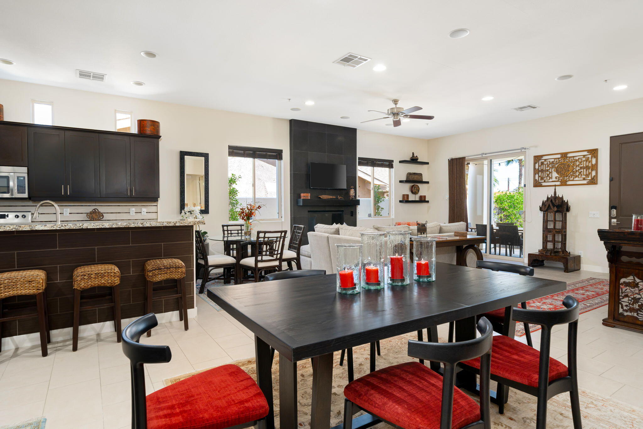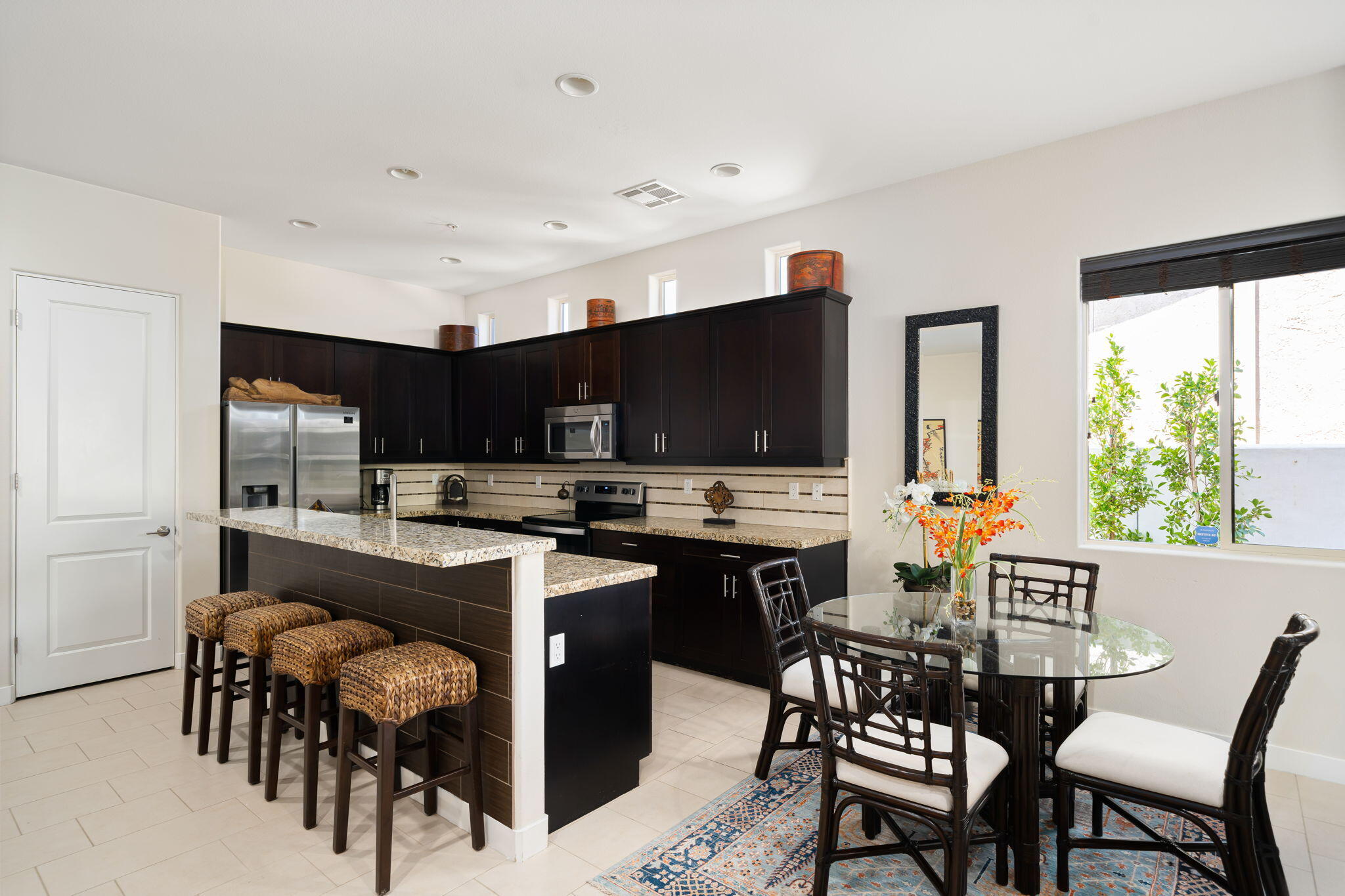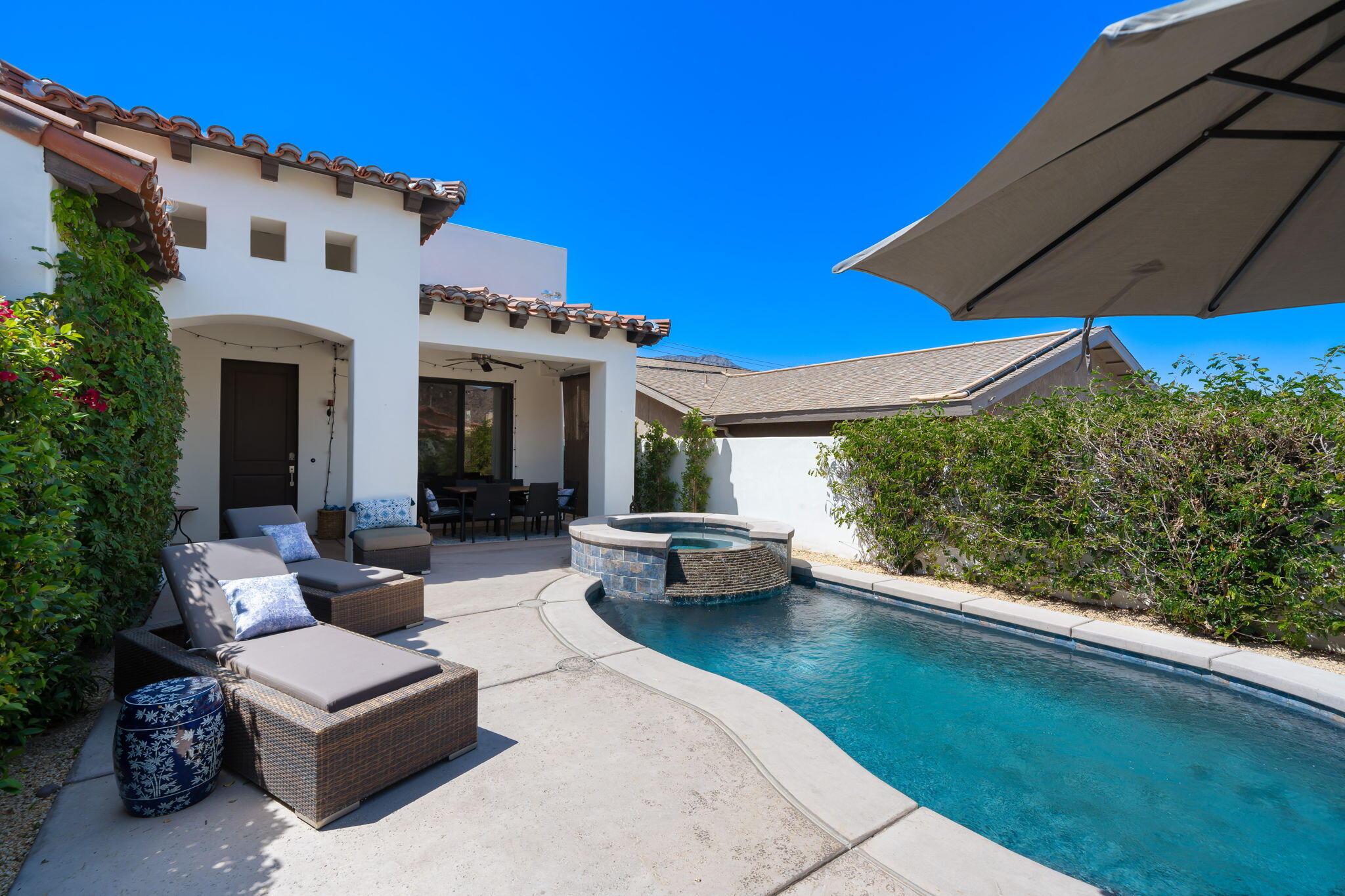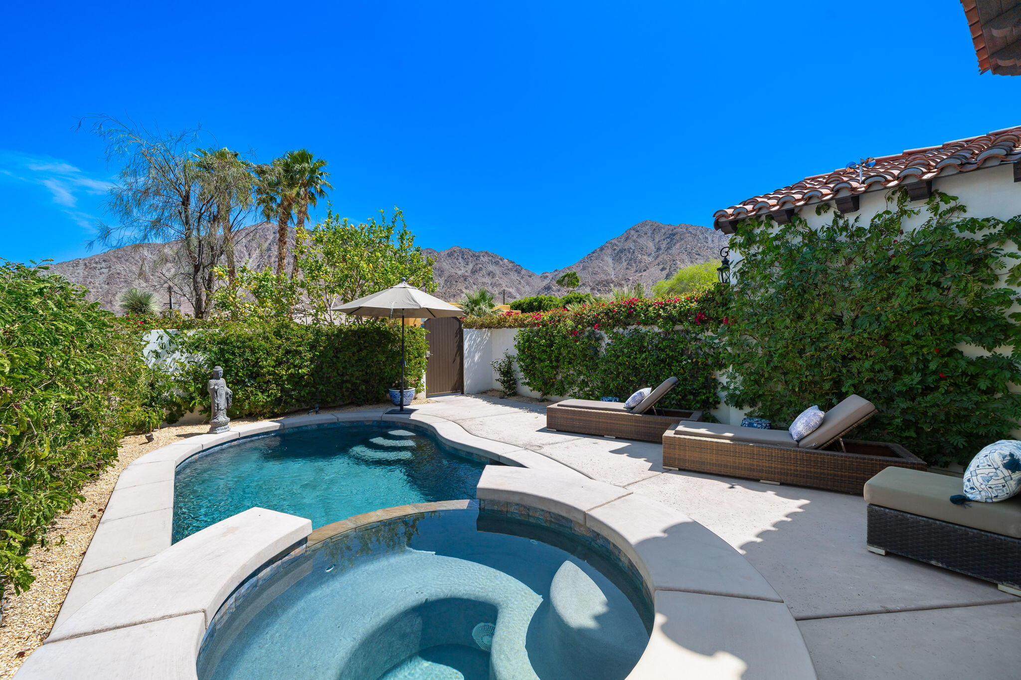 Summer Special $3000/month for summer 2025. $3900/month for long term (1 yr or longer lease). Charming Custom Home in La Quinta Cove - Available for Long-Term or Seasonal Rental!Experience the best of desert living in this beautifully turnkey furnished La Quinta Cove home, ideally located near scenic hiking and biking trails and just minutes from the shops and restaurants of Old Town La Quinta. Enjoy breathtaking mountain views from the front courtyard featuring a private pool, spa, and outdoor dining/lounging area, perfect for relaxing or entertaining and desert lifestyle. Inside, the open-concept floor plan boasts a spacious great room with a comfortable family area, fully equipped kitchen, and dining/entertainment space. The well-separated bedrooms offer privacy and comfort. Primary suite with a king bed, en-suite bath (dual vanities, soaking tub, walk-in shower, and closet), and direct access to the private back patio with sofa seating and dining area. Second bedroom with two twin beds and a desk for a convenient home office setup. Third bedroom with a queen bed. The second and third bedrooms share a dual-vanity bathroom with a separate tub/shower and toilet area. Additional powder room off the great room for guests.Additional features include a laundry room with sink and full-size washer/dryer, attached garage with space for one car, and driveway parking. This home is turnkey furnished and ready to enjoy.Rental Rates: Long-Term (1 year+): $3,900/month, Seasonal/Monthly: May - Oct 2025 - $3000/month, Nov - Dec 2025: $5,000/month, Jan 2026: $5,500/month, Feb 2026: $6,000/month, March-April 2026: $7,000/month, Inquire for multi-month bookings.Interested in this Listing?