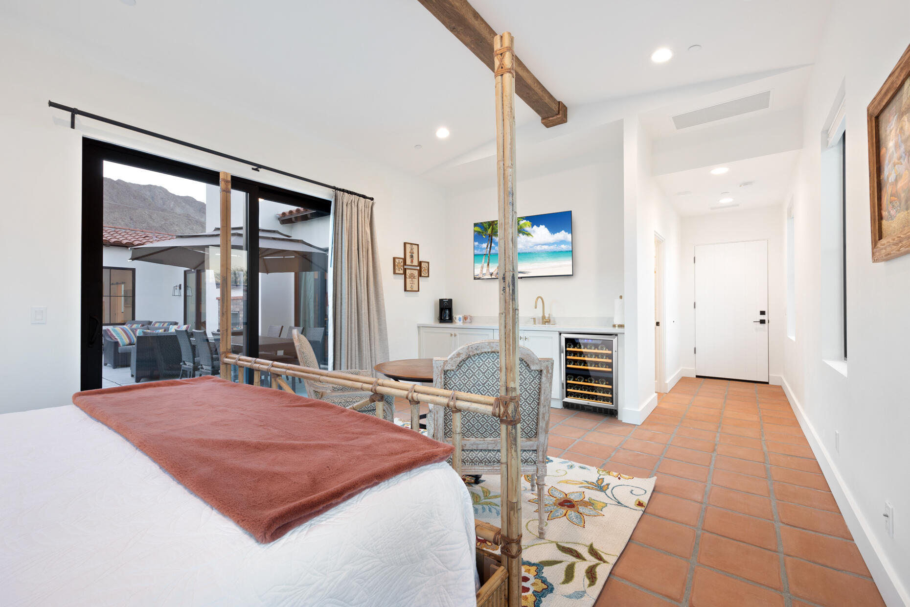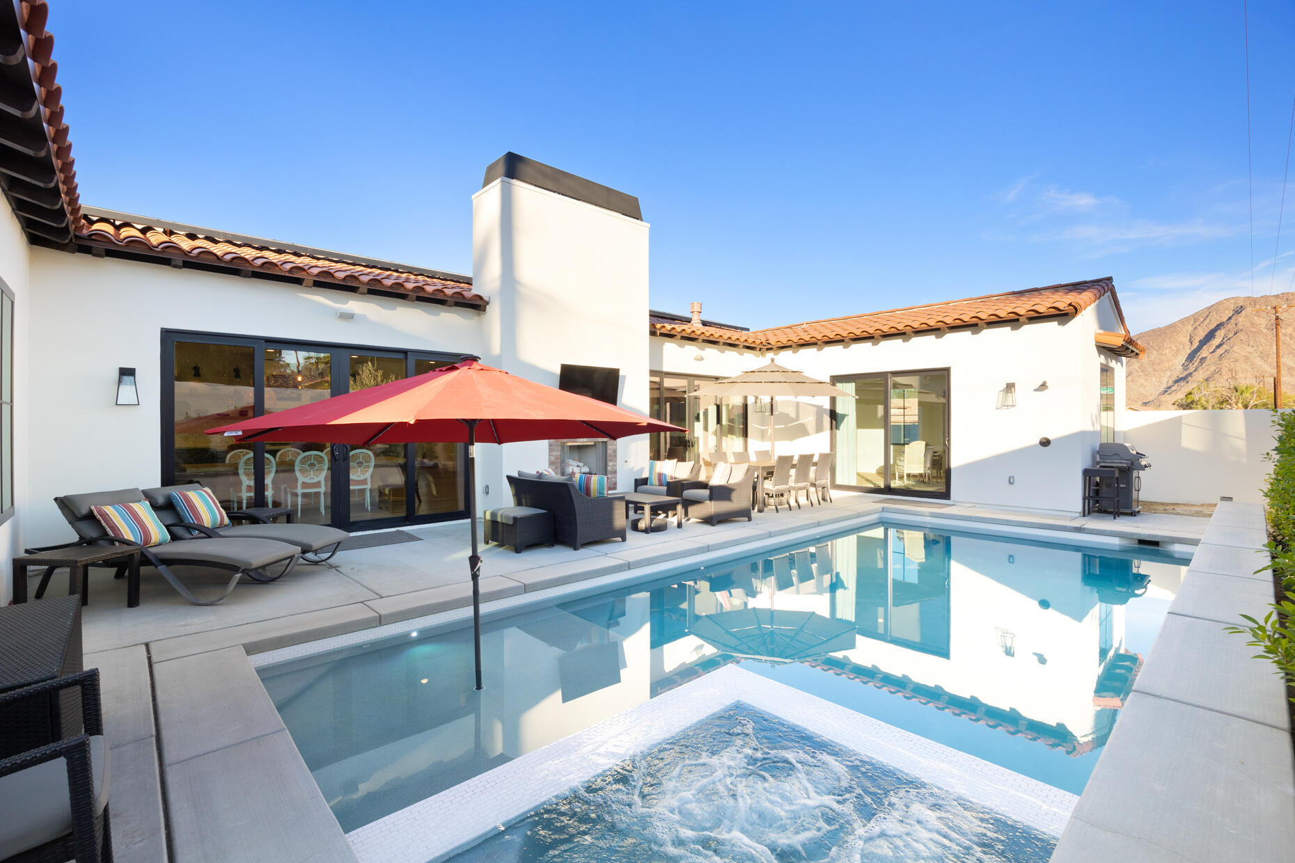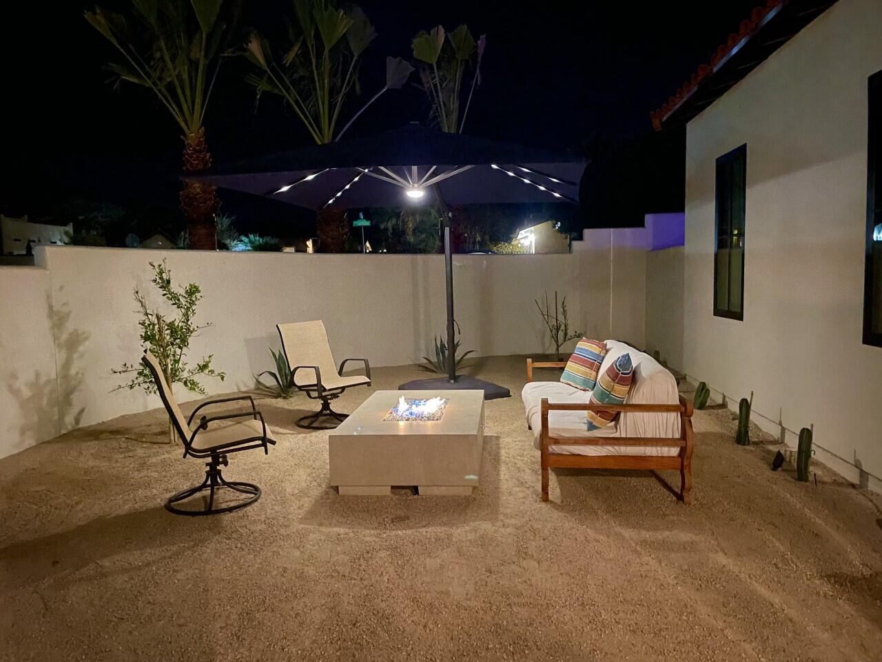 Make your desert stay memorable in this exquisite new modern hacienda construction on a corner lot high in the Cove. Completed in Oct 2022, this 2798 SqFt home offers 4 bedrooms, 4 1/2 baths, an open concept great room and gourmet kitchen, a laundry room with storage, and a powder room/mud room. The outdoor living space is perfect for entertaining with an outdoor shower, gas BBQ, outdoor fireplace with TV, and a salt water pebble tec pool and spa with LED mood lighting. Two of the bedrooms have king-size beds and one has a queen bed. All bedrooms are en suite, and the primary bathroom features a relaxing soaking tub. The Great Room, designer kitchen and dining room all have high ceilings, surround sound and a large dining table that can seat up to 10 people. The attached Casita, which opens up to the pool, has its own entrance and features 450 SqFt of living space with a king-size bed, a sitting area, a kitchenette with beverage fridge, sink, and coffee maker. On Demand water heater, filtration water system on all faucets, surround sound, Eero Mesh Wi-fi, Ring camera, automatic security lighting, landscape lighting, and a privacy wall around the entire perimeter of the property are some of the outstanding features this home offers.Note: The private entry courtyard with seating was completed after the pictures were taken.Bi-weekly house cleaning, pool cleaning and landscaping included.Interested in this Listing?