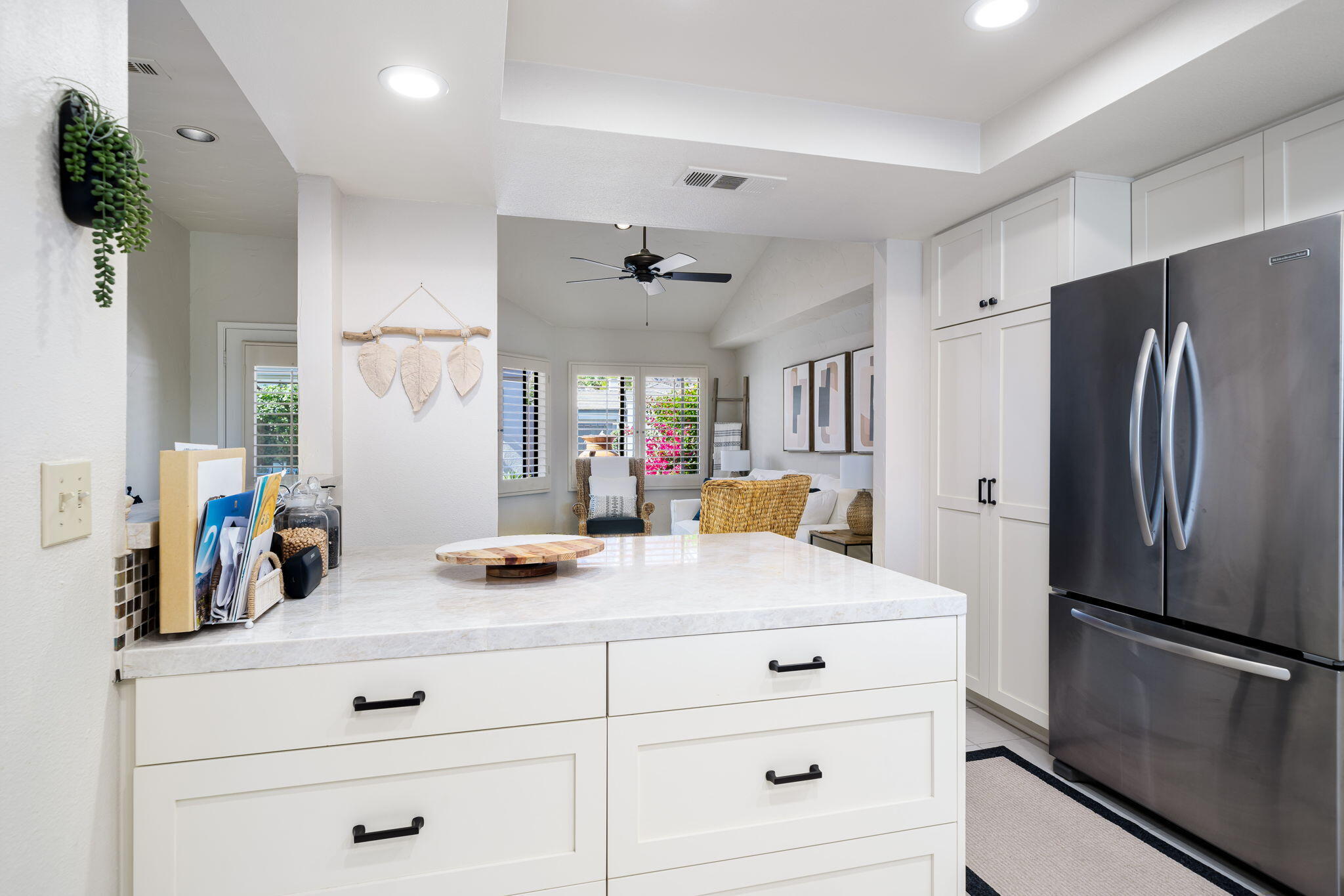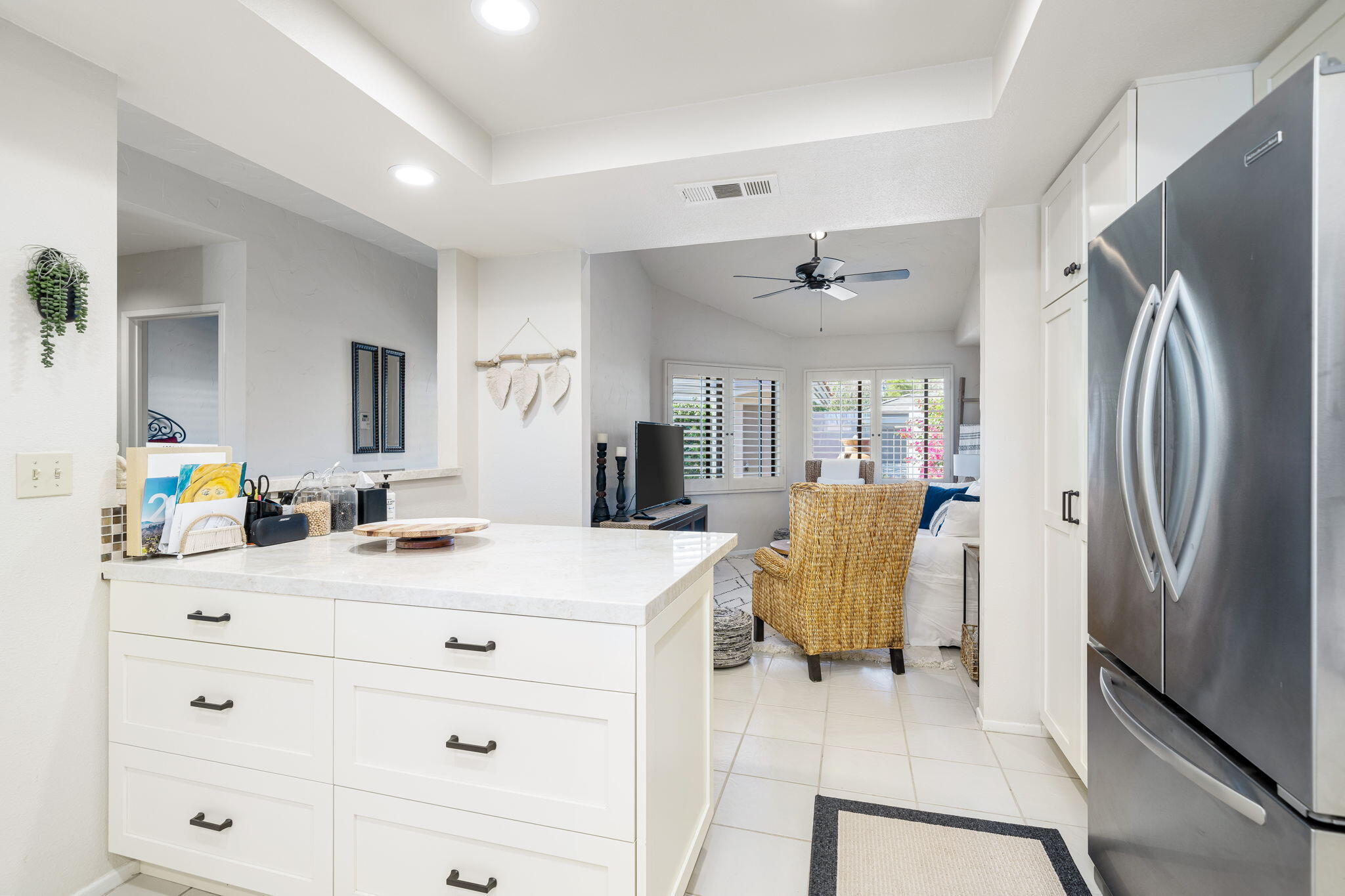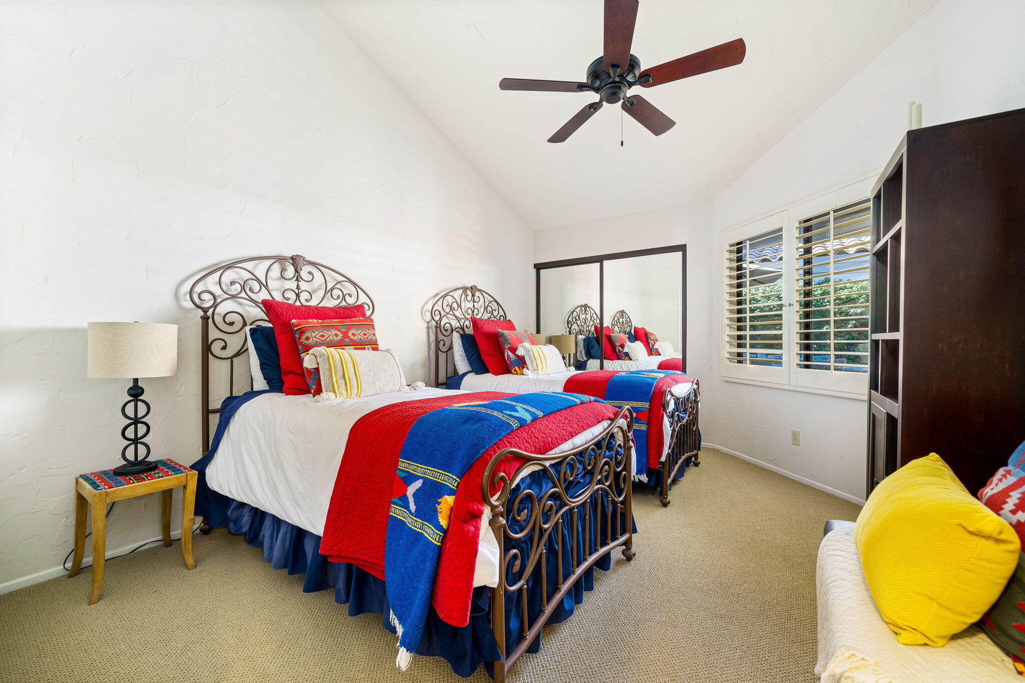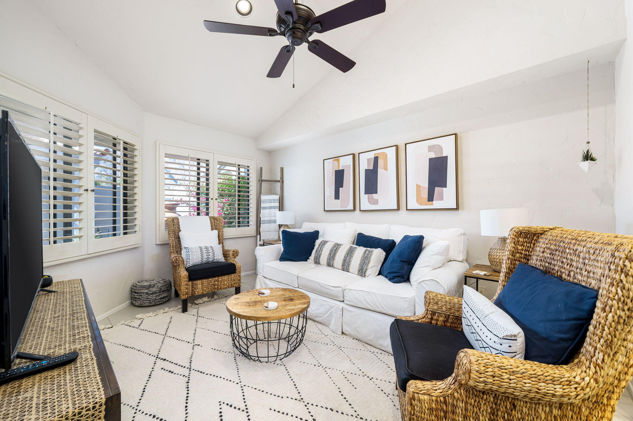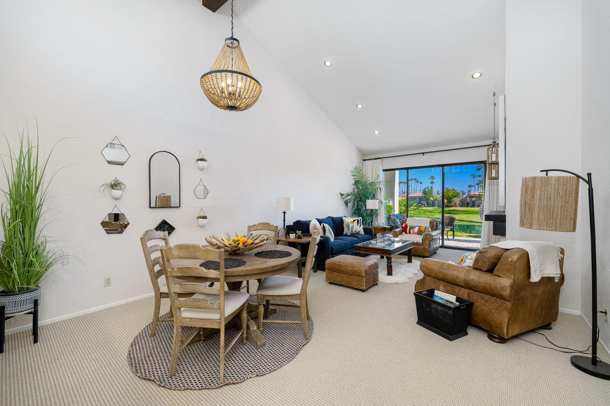 Available for the season. Welcome to your dream getaway nestled on the 7th fairway of the prestigious Arnold Palmer Private Golf Course! This charming 2-bedroom, 2-bath Condo boasts breathtaking views of the Fairway, Lake and Mountains making it a perfect retreat for relaxation and entertainment.As you arrive, you'll be greeted by a private gated courtyard featuring a tranquil fountain, outdoor dining for 6, and a convenient BBQ grill--ideal for al fresco meals. Step inside to a bright and airy open floor plan full of natural light, thanks to the soaring vaulted ceilings. The inviting living room offers a cozy fireplace and a wet bar, creating a perfect setting for unwinding after a day on the course and Dining area comfortably seats 4 and sliding doors that open to the patio, enhancing the seamless indoor-outdoor flow. The well-appointed Kitchen showcases custom cabinetry, modern appliances and a breakfast counter for casual dining. Adjacent to the kitchen, you'll find a cozy den complete with a TV. The Primary Suite includes a King-size bed and 2 closets, 2 sinks and large Shower. The Guest bedroom is warmly appointed with two twin beds and 2nd bath. Laundry inside. The Private Patio is complete with a Firepit and stunning views of the Lake and Mountains. Community pool is just steps away. Conveniently located minutes from the exciting American Express PGA golf tournament, Paribas Tennis, Shopping & Dining options in Old Town La Quinta.Interested in this Listing?