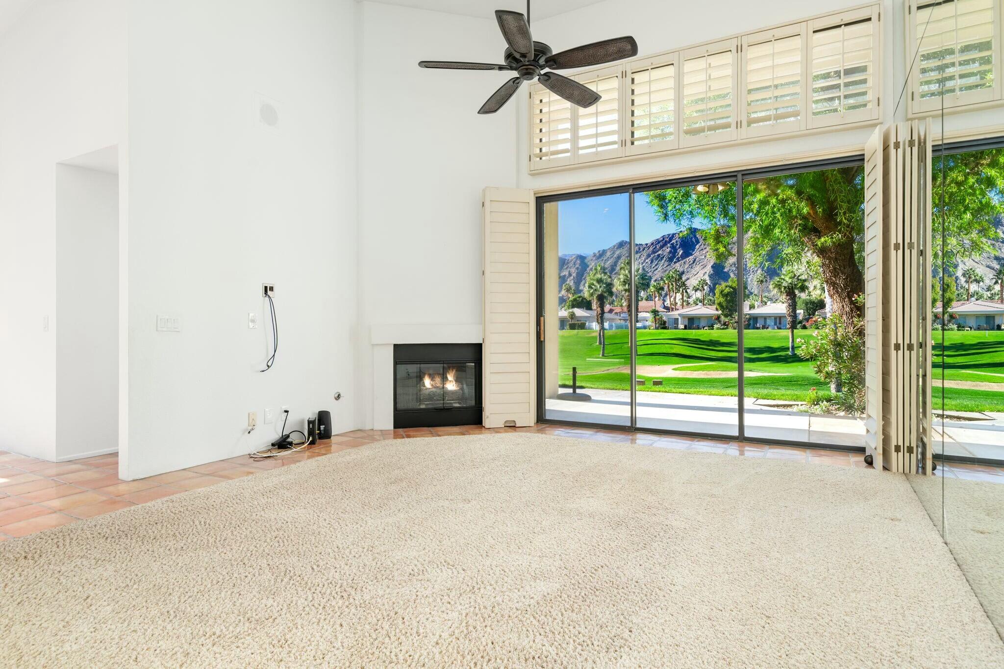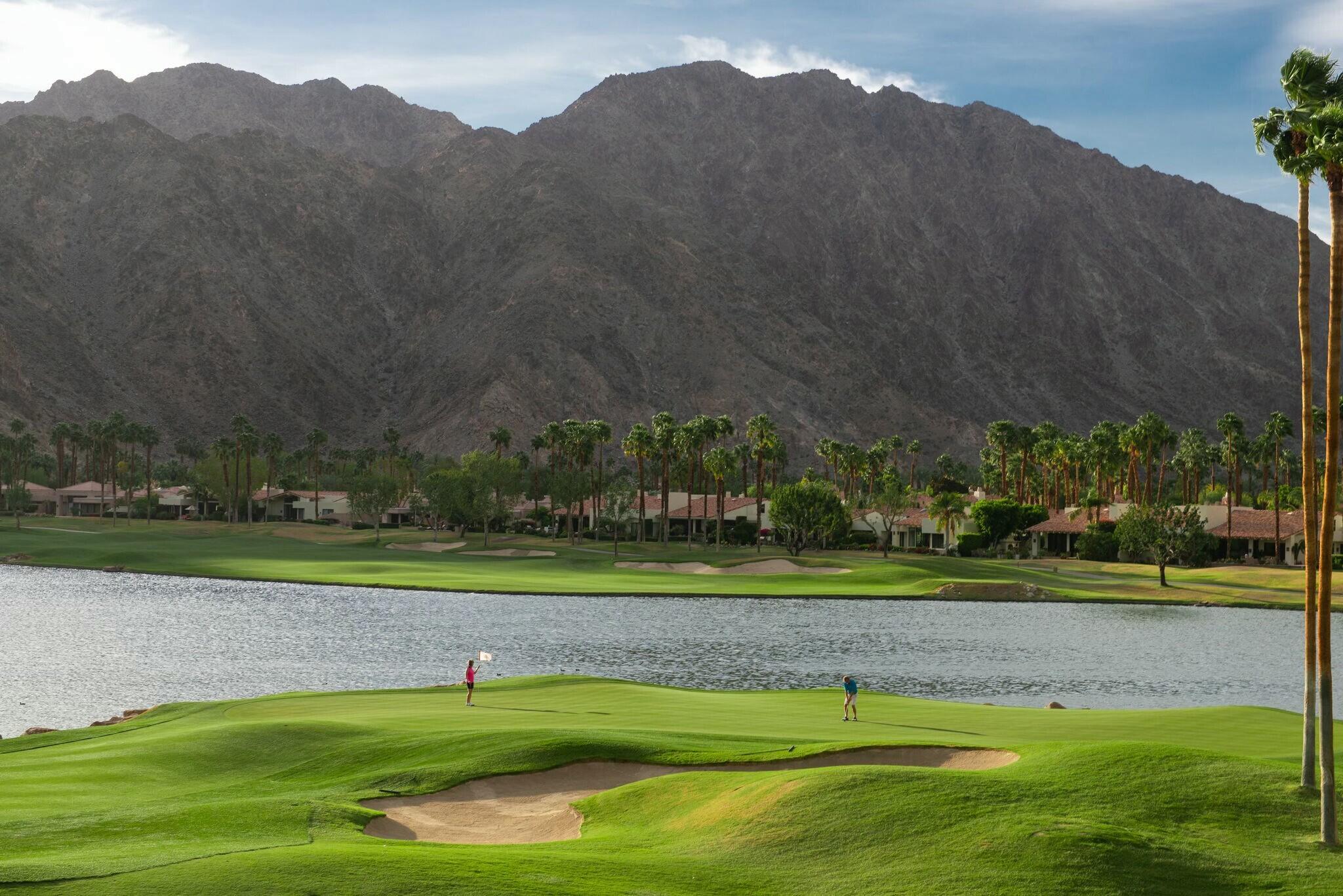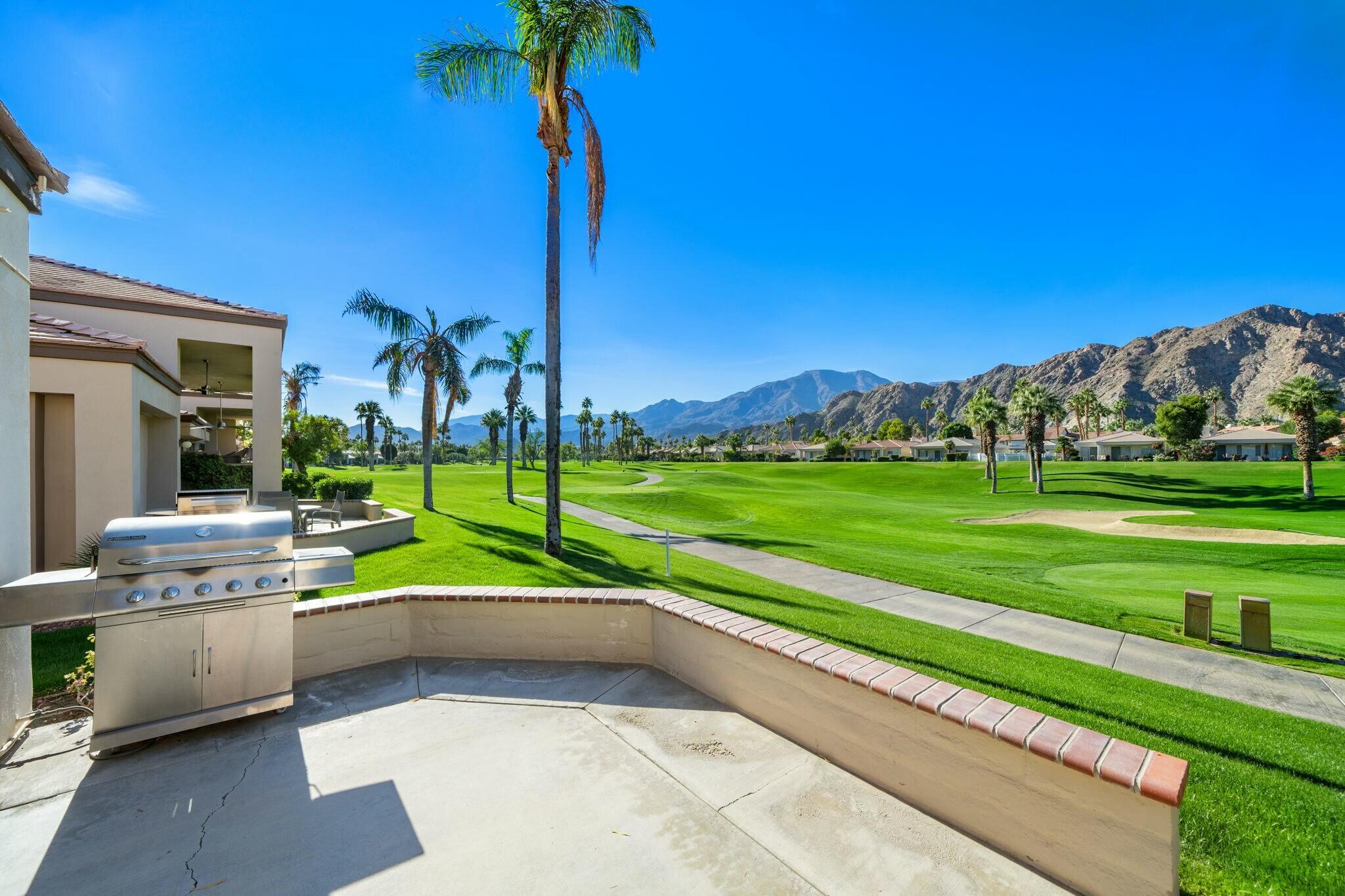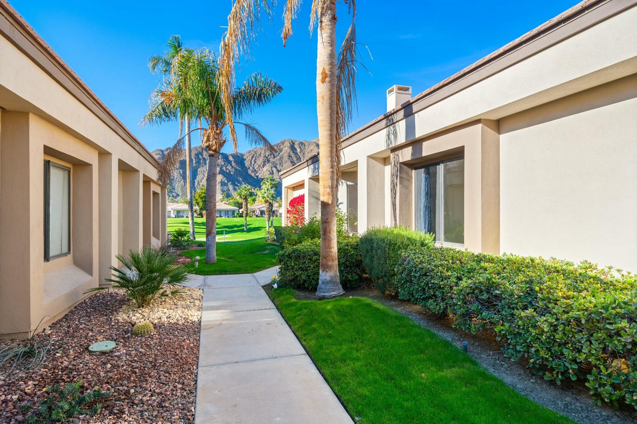 Available IMMEDIATELY UNFURNISHED ON A LONG TERM BASIS. Enjoy PGA's vast accommodations and elite golf tournaments Introducing a three-bedroom, three-bathroom condominium spanning 1918 square feet, conveniently situated on a SINGLE level. Behold the captivating westward vistas of the Santa Rosa mountains, overlooking the scenic par 3 third hole of the renowned Arnold Palmer Private course at PGA West. Step into the inviting living room, adorned with a cozy fireplace and a convenient wet bar. The space seamlessly extends to a serene rear patio boasting a misting system and panoramic views that are nothing short of spectacular. The primary suite is a retreat in itself, offering three closets and a private patio complete with a romantic hot tub. The guest bedroom offers its own en-suite bath, while the third bedroom provides flexibility as a den or family room. A spacious 2-car garage ensures convenience, and just across the street awaits the community pool and spa, promising relaxation and leisure. Embark on a journey to explore the unique charm of this property and delve into the enticing advantages offered by the various levels of PGA West club membership. Don't miss the opportunity to make this exceptional condominium your new home.