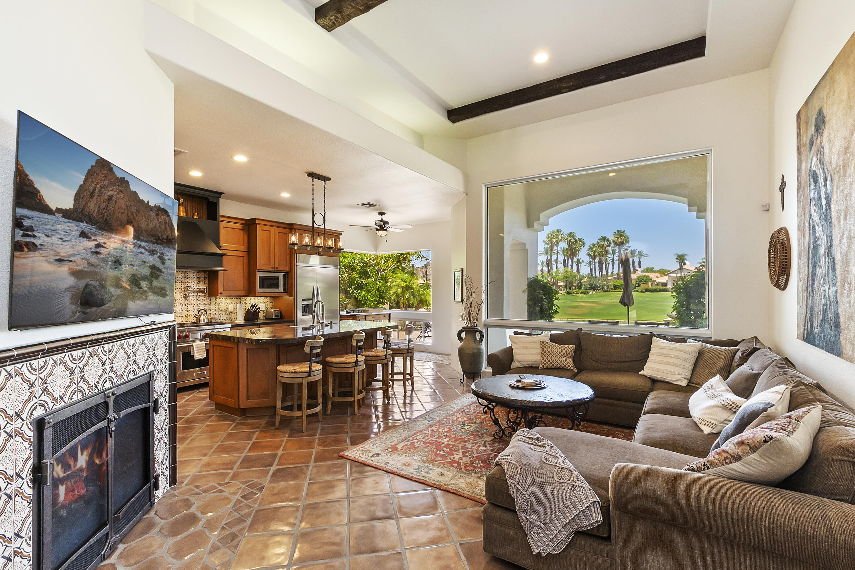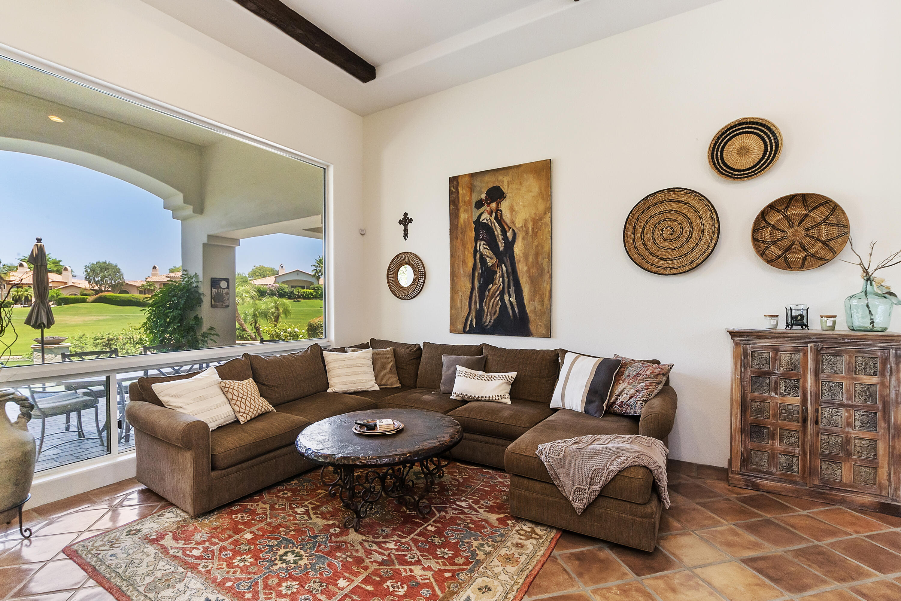 This charming 3 bdrm 3.5 bath property is located in beautiful Rancho La Quinta. Located on the 16th hole of the Jones course this Terrazza II floorplan awaits your arrival! As you enter the courtyard you are welcomed by a cozy outdoor fire pit situated next to the detached 2 room casita. Upon entering this 2648 sq ft home you elegantly enter a space of old world charm with high dramatic cielings adorned with rich beams and Saltillo pavers. Along with the high cielings and large windows that flood the space with natural light this home creates a warm and inviting atmosphere where memories are made! Indoor living extends to the outdoors with an extended patio, infinity pool overlooking the adjacent lake with plenty of space for outdoor dining. Now available for lease!! SPECIAL PRICING FOR LONG TERM!!!Interested in this Listing?