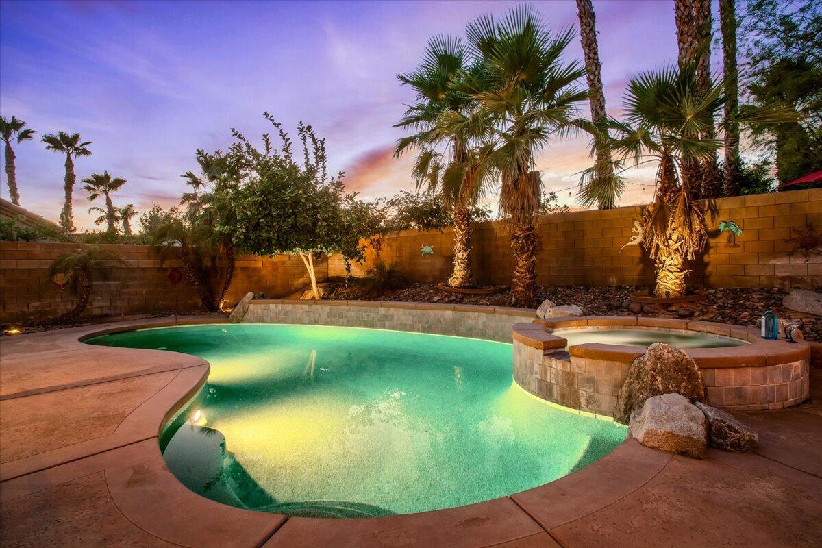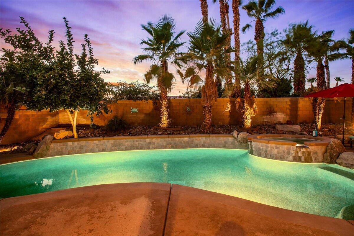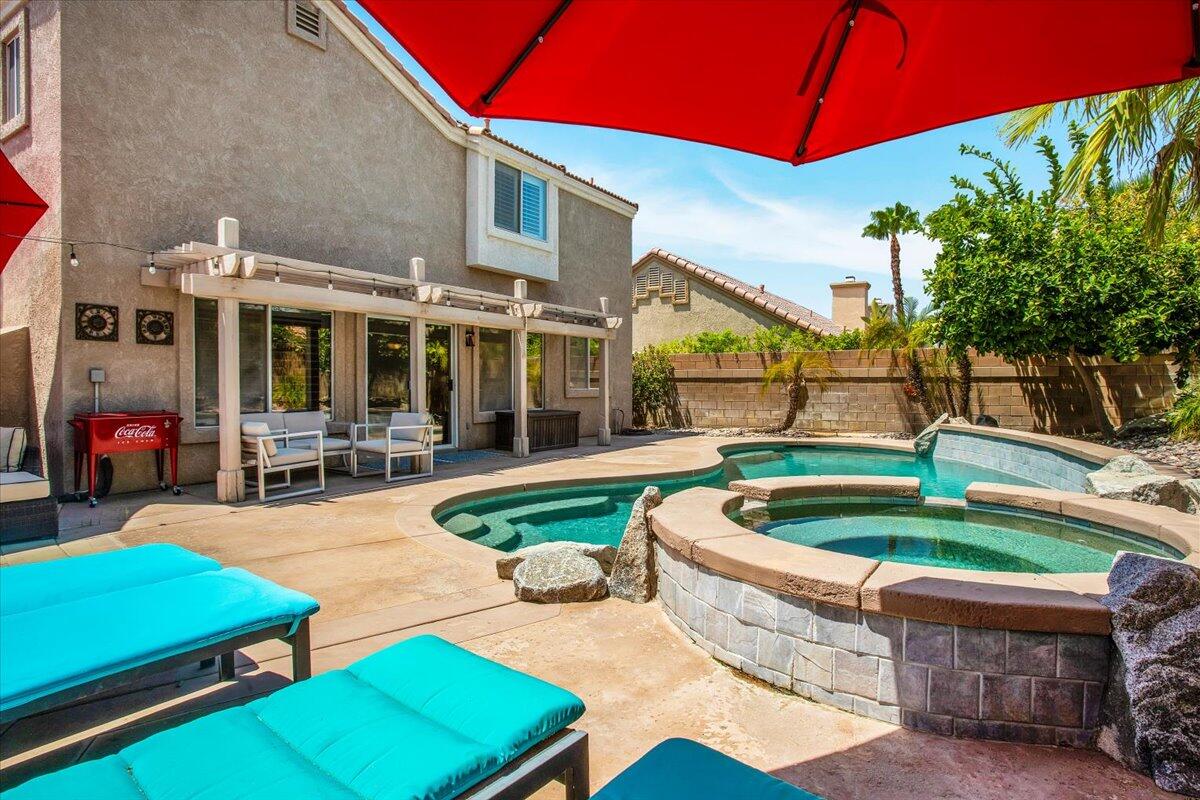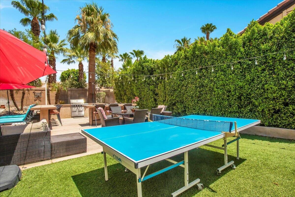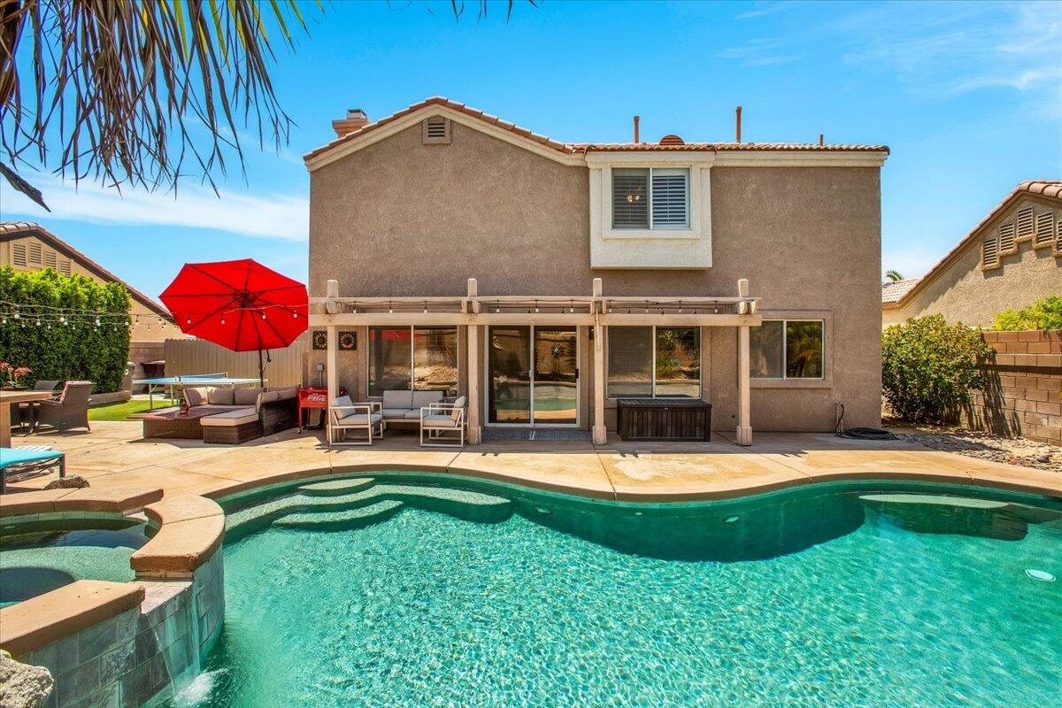 Vacation Rental. Minimum 30 days booking required. Escape to your perfect seasonal retreat in the tranquil Topaz neighborhood of La Quinta. This fully furnished 4-bedroom, 3-bathroom home, including one bed/bath downstairs, is located in a quiet cul-de-sac. Relax by the luxurious saline-pebble tech pool and spa in the expansive backyard, complete with a lush lawn, ping-pong, outdoor games, a built-in BBQ, fire pit, and multiple seating areas.Inside, enjoy the updated kitchen with modern appliances and elegant plantation shutters. Utilities are included, with a cap on pool and gas usage.Monthly Rates: Jan-March: $8500/month, Inquire for April/Coachella. May-Dec: $7500/month. Special Rate: June-Sept 2025 $5000/month. Inquire about annual/unfurnished rates.Additional fees: $495 cleaning, $188 property fee, and a $100 monthly gas cap for pool use (spa complimentary). $8500 refundable security deposit. Booked March 2026. All other dates open.Interested in this Listing?