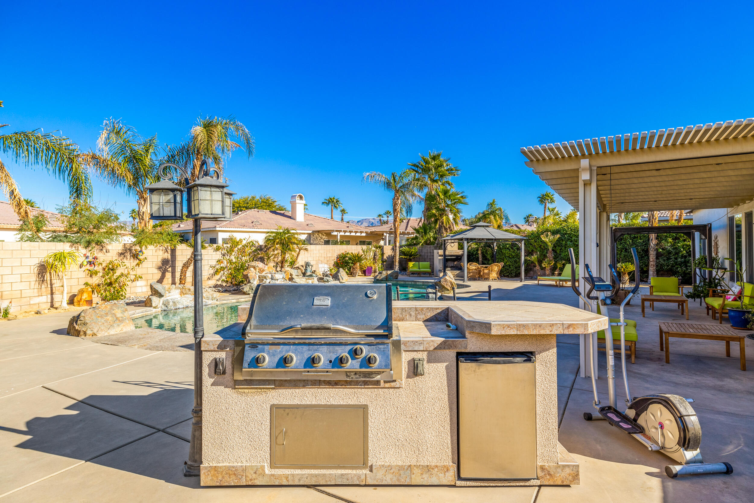 Seasonal is 6500.00 Summer is $4000.00 This beautiful 3 bedrooms Plus den pull out couch. 3 bath home is located heart of La Quinta. The house is turnkey with everything you need to vacation. Open floorpan w/tile through out. In the backyard it has an outdoor Fireplace w/gazebo. Gorgeous, large custom salt water pebble tec pool with waterfalls is the centerpiece, flanked by a generous sized BBQ island, gazebo and gas fireplace! All surrounded by the backdrop of stunning mountain views! Gated community close to shopping, golf and award winning Dining! Just pack your bags and book your stay.Interested in this Listing?