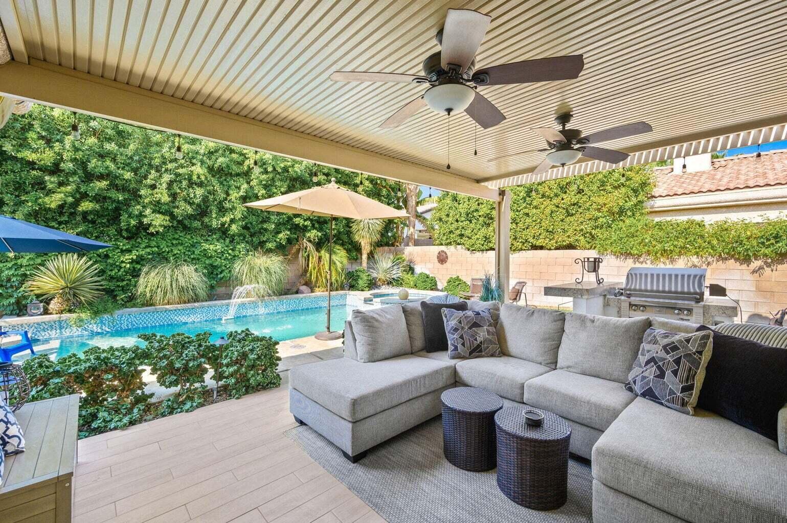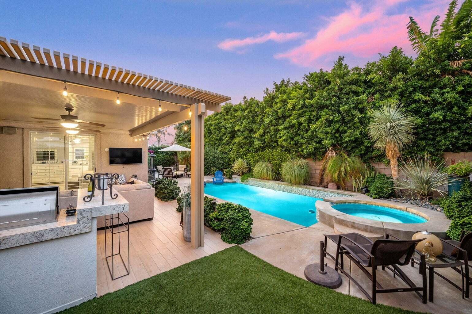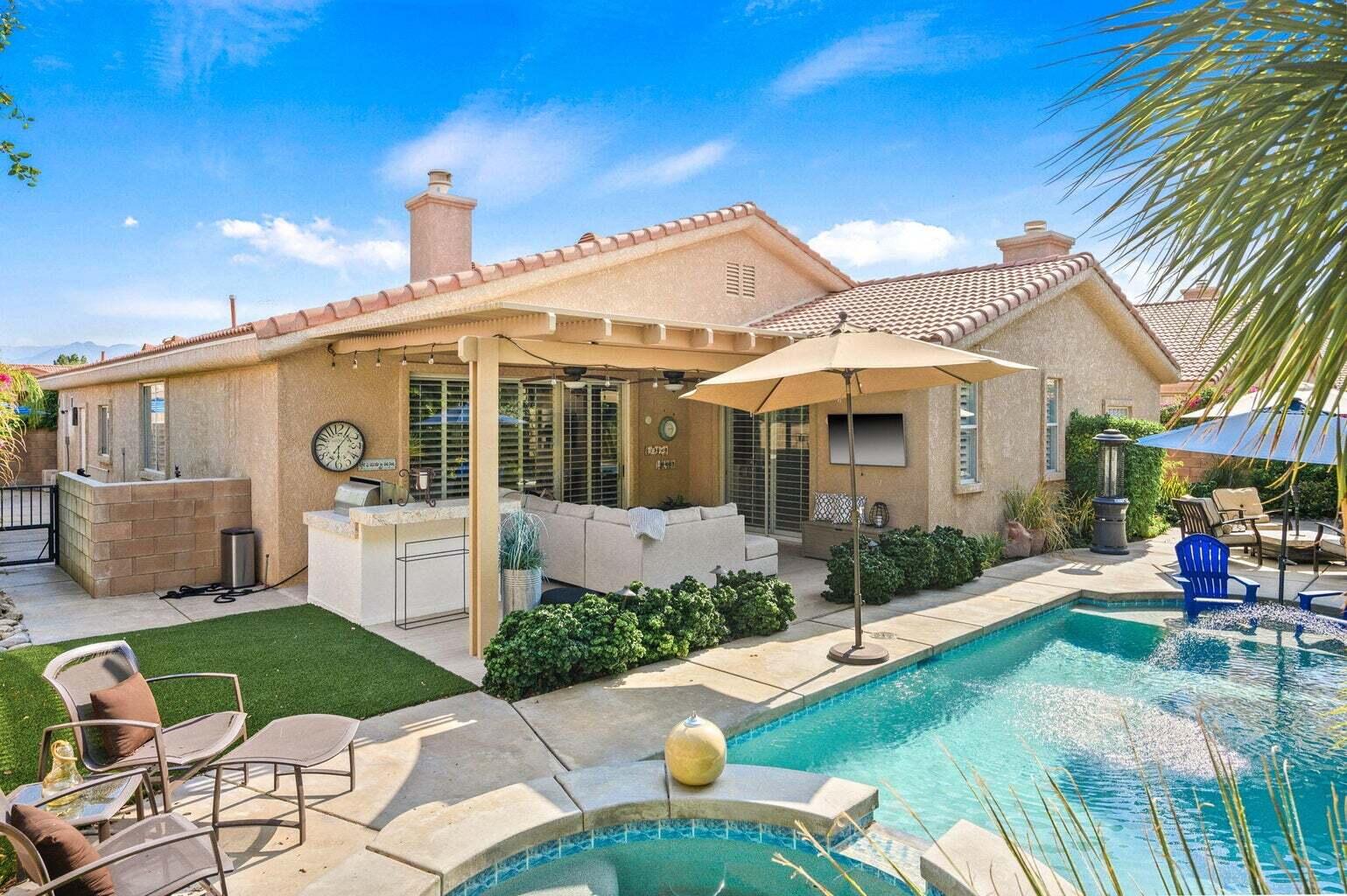 Available October 18, 2024 to January 6, 2025. Monthly cleaning and all utilities. Welcome to your most inviting and amazing getaway. Picture family & friends gathering here. This stunning contemporary/modern, fully remodeled home. Located within the highly desirable area of North La Quinta. Boasts 4 bedrooms + bonus/theatre room, 3 full baths, approx. 2900 Sq. Ft. Upgrades: plank tile flooring, a custom kitchen with Stainless Steel Kitchen Aid, 2 refrigerated drawers inthe island, custom quartz countertops, beautiful tile backsplash, custom cabinets with pull out drawers & soft self-closing, commercial ice maker, dry bar, bathrooms have been beautifully remodeledwith tile showers, glass enclosures, and new vanities. The beautiful master suite includes a gorgeous shiplap decor wall, a dual fireplace, a large with walk-in closet & built-ins, marble vanities, and a large soaking tub & shower enclosure. Highly privateand the perfect entertainer's dream! Inviting living patio area with TV, updated pool/spa with pebble tec & new tiling, a tanning shelf/beach area, a large, covered patio with a built-in gasBBQ & bar. Truly more upgrades than we can list. Location- Location-Location. Close to all the restaurants, shopping & golf/tennis/pickleball. (Lower rate for more than 3-months).Interested in this Listing?