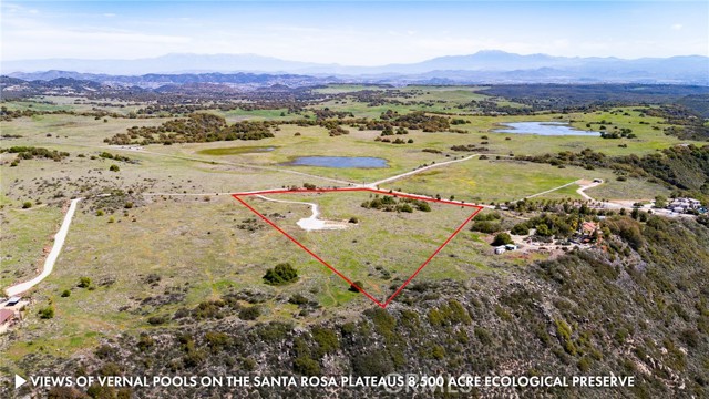 Imagine yourself in the middle of acres of natural beauty, reminiscent of the past forever gone everywhere else! Gaze from your perch at the edge of a Plateau rising 2,000 feet above sea level with 360 degree panoramic views from the shores of Oceanside to the Mountains and the valley with distant city lights. From your secluded home you also have views of the 7,500 acre Reserve and the famous Vernal Pools!! Very few homesites have this incredible view of a huge piece of Southern California while living across street from hiking and down the road from Sylvan Meadows for more hiking, bicycling and horseback riding. Electric, water and phone run alongside the property and there are 3 fire hydrants at various locations at the property boundary. The environmental review is complete and this lot is approved for residential use. Flat gentle topography and easy access to either Murrieta, Temecula or Fallbrook without getting on Interstate 15. No HOA! Come home to Tenaja on the Santa Rosa Plateau for cool coastal breezes, starry nights and open spaces, yet only minutes to award winning restaurants, golf, shopping and Temecula Wine Country!!Interested in this Listing?