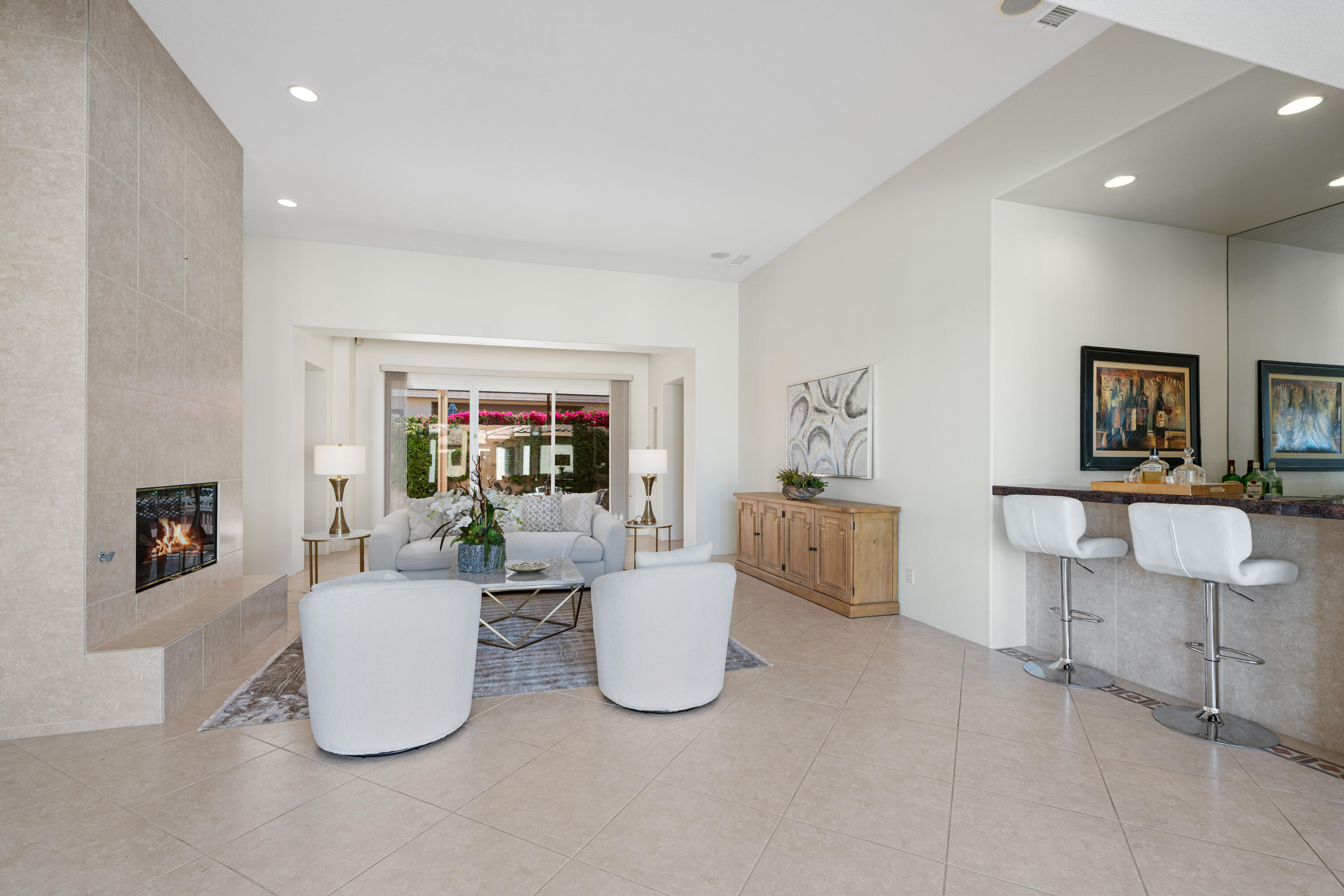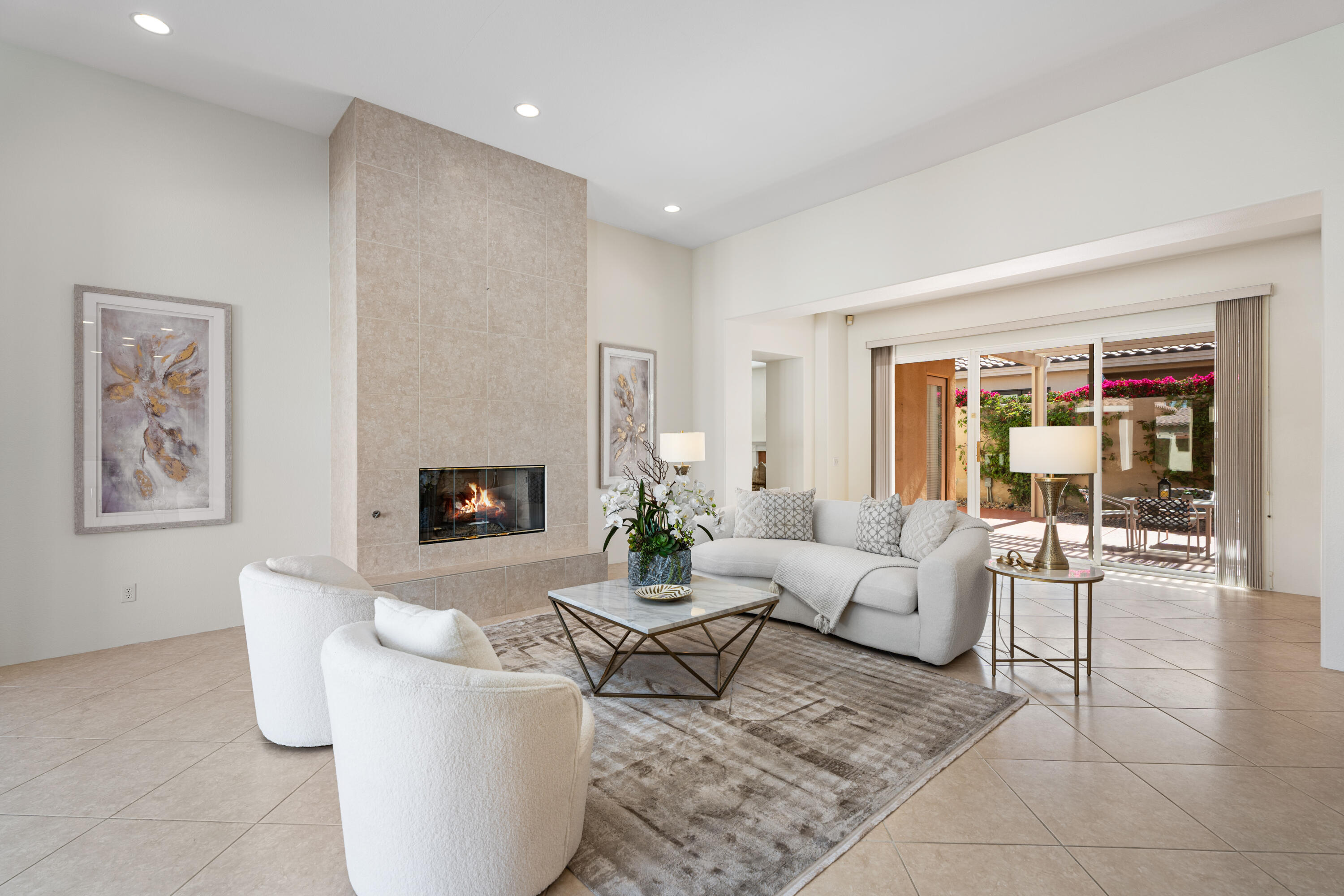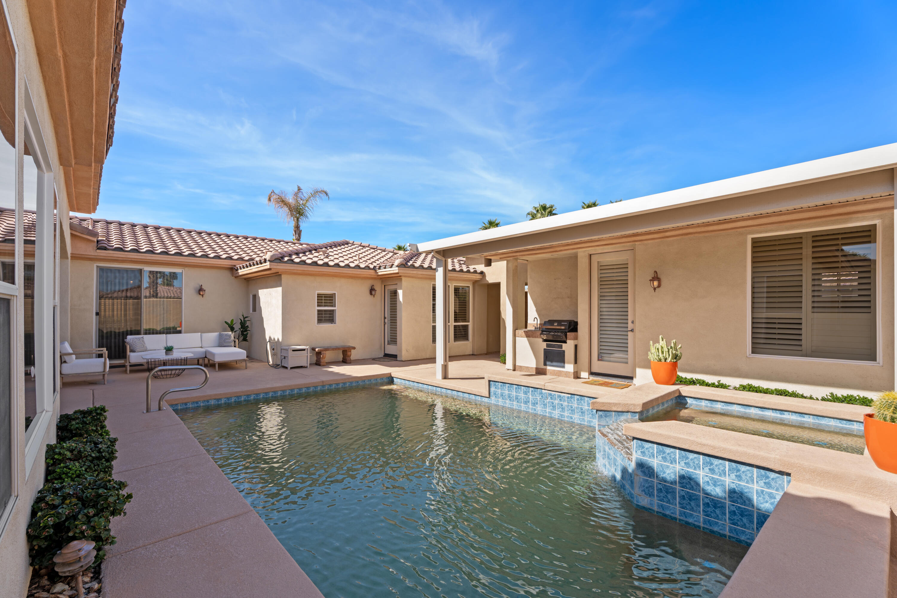 Indoor-outdoor living at its finest! This expanded Plan 4 Villa nestled in the exclusive gated Palmira community of Palm Desert offers ultimate privacy on a large corner lot. Designed for the relaxed Desert Lifestyle. From the private interior courtyard, there's a centerpiece Pebble Tec-style pool with waterfall, flanked by a covered entertainment area, and also a separate casita with its own bath--all framed by breathtaking Santa Rosa Mountain views. Once inside the home the extra high ceilings link the rooms with an open-concept style and easy transition from indoor to outdoor living. The kitchen boasts slab granite counters and a new Bosch dishwasher (2023). The expanded family room creates an airy, welcoming space. The 4th bedroom is an attached casita, while the 5th bedroom, currently used as a den/office, provides flexibility. Recent upgrades include a new HVAC system (Lennox 4 & 5 ton units, 6 years old, warranty remaining), Mitsubishi mini-split A/C in the primary bedroom, fresh interior paint (2025), new recessed lighting, repainted patios, a Wi-Fi-controlled garage door opener (2023), and an AquaLink pool system. Minutes from shopping, dining, golf, McCallum Theatre, and top-rated schools, this move-in ready oasis is an absolute must-see! Actual square footage of Family Room may be almost 300 SqFt larger than the 3401 SqFt shown as Seller had Builder build out the room by 5'; Buyer to verify square footage.Interested in this Listing?
