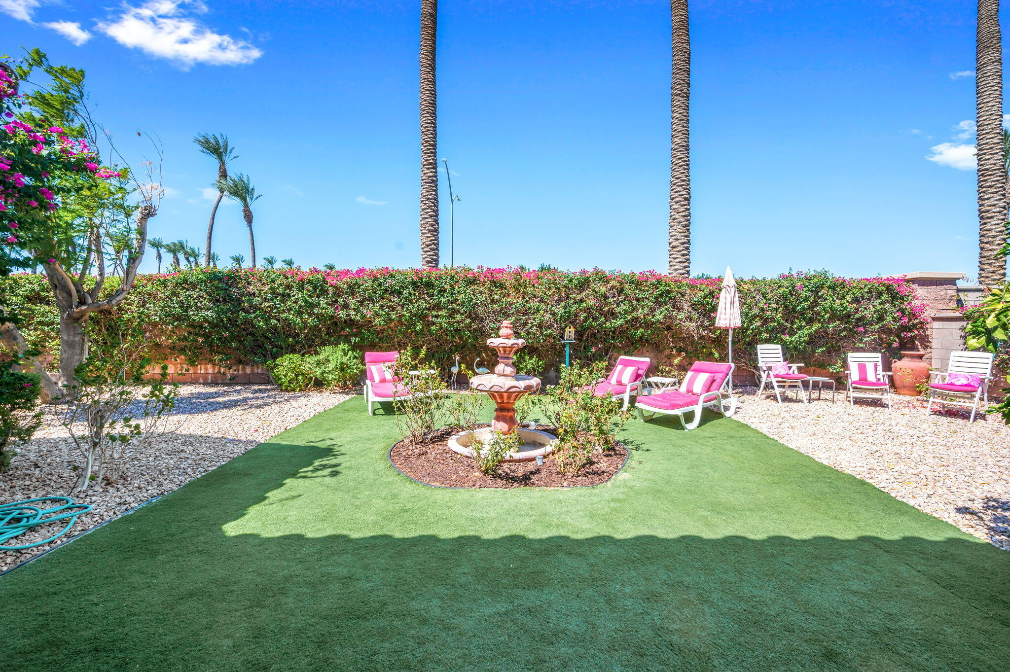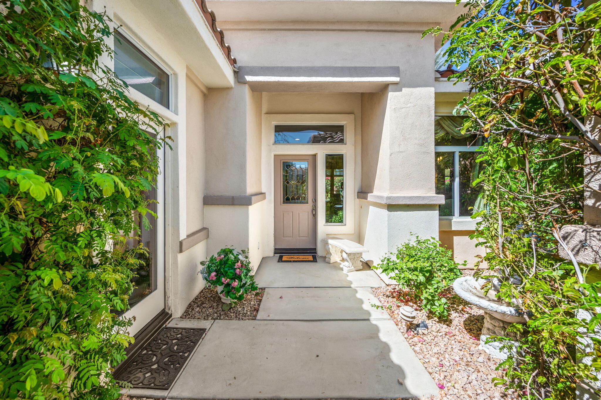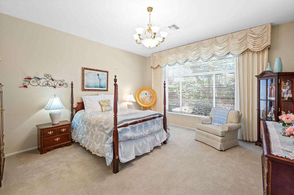 LOWEST PRICE: Monterey floor plan nestled in the highly sought-after guard gated (55) Sun City Palm Desert community. This magnificent home is perfectly situated between the Lakeview and Sunset View clubhouses, allowing you easy access to a variety of amenities and activities. It's time to start the next chapter of your life with LOW HOA's and tons of Amenities! As you approach, a charming gated front courtyard greets you, providing both curb appeal and privacy. Step inside to find a spacious, open layout featuring tile flooring throughout, except in the cozy bedrooms. High ceilings and abundant natural light create an inviting atmosphere, making this home an entertainer's paradise.The expansive great room seamlessly connects to the elegant formal dining area, providing a perfect space for gatherings. The chef's kitchen is equipped with Corian countertops, a generous island, a breakfast bar, and a sunny nook--ideal for casual dining. Ample storage is provided by a large pantry, ensuring you have everything you need at your fingertips.Retreat to the primary suite, which offers direct access to the west-facing rear yard through a sliding door, allowing for tranquil evenings by the serene fountain surrounded by vibrant Bougainvillea. The suite features a spacious walk-in closet and a luxurious bathroom complete with dual sinks, an oversized tub, and a stall shower.Your guests will appreciate the privacy of the guest suite, which includes its own bath and a separate entrance to the front courtyard. Additionally, the versatile utility room, designed as extra living space, can function as an office or additional sleeping area, making it ideal for visitors.The property boasts a two-car garage with a dedicated golf cart garage, and the best part? A golf cart is included with your purchase! Enjoy low HOA fees while taking advantage of the extensive amenities Sun City Palm Desert has to offer, including golf courses, tennis courts, swimming pools, fitness centers, and numeroInterested in this Listing?