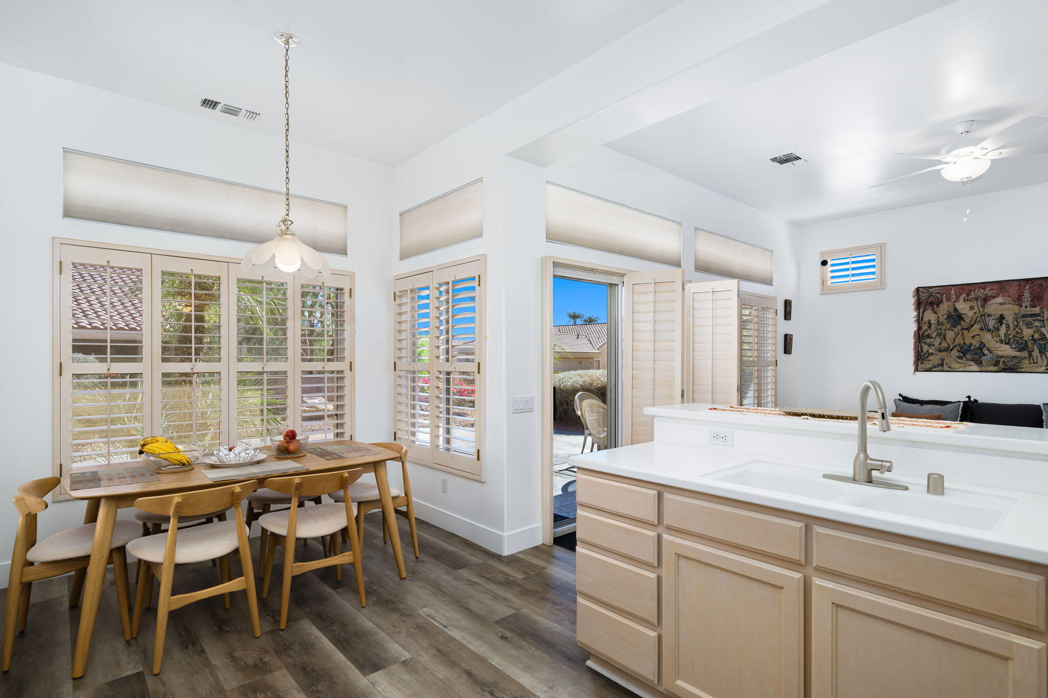 This charming home in Sun City Palm Desert is ideally situated near the Mountain View Clubhouse, fitness center, indoor pool, and golf course. A Lalique plan on a corner lot, it is surrounded by low-maintenance desert landscaping for effortless outdoor living. The east-facing rear of the home features a spacious salt-finished patio, while the slightly elevated courtyard entry and updated paint scheme enhance its curb appeal. With an air conditioning system replaced in 2020, comfort is assured year-round.Inside, the home boasts 10-foot ceilings, transom windows, rounded hallway entryways, and art niches, creating a bright and elegant atmosphere. Extensive tile flooring and plantation shutters throughout add both style and practicality. The kitchen is outfitted with Corian countertops and an updated wall oven, making it perfect for everyday living and entertaining.The primary suite is a peaceful retreat, featuring a bay window and a large walk-in closet. The en-suite bathroom offers dual sinks, a stall shower with a textured glass enclosure, and a skylight that adds natural light. The guest bedroom is located on the opposite side of the home for privacy, and the guest bathroom includes a tub/shower combination with another skylight.The laundry room is spacious enough to function as a home office. The 2-car garage includes built-in storage and a convenient nook for golf cart parking, making it ideal for those who enjoy both storage and outdoor activities.Del Webb is a perfect community for a peaceful, yet active lifestyle.Interested in this Listing?