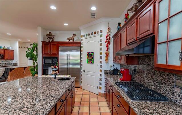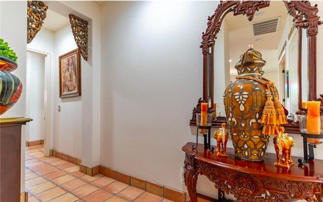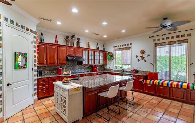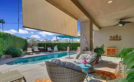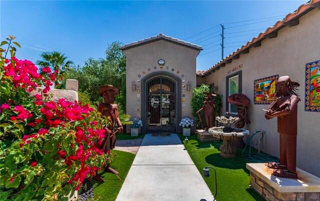 Resort style living in this exquisite Spanish style oasis, ideally situated on the most desirable lot at the end of the culdesac. As you step inside, the timeless elegance of Spanish tile flooring welcomes you, leading you through warm and inviting spaces. Entertain with ease at the wet bar, adorned with stunning granite countertops. The spacious kitchen, featuring a walk-in pantry and captivating views of the backyard, is perfect for culinary enthusiasts. Two bedrooms share a beautifully designed Jack and Jill bathroom, while the laundry room conveniently connects to the expansive threecar garage. The master suite serves as a private retreat, offering breathtaking views and a luxurious ensuite bathroom, complete with two walkin closets and upgraded amenities like a self flushing toilet and a bidet. A cozy fireplace enhances the living area's ambiance, and a versatile office/den space can easily transform into an additional bedroom. Step outside to your sprawling backyard, featuring a charming gazebo for family gatherings and a tranquil courtyard with a soothing water fountain. Dive into the generous pool or rinse off with the outdoor shower. With eight fruit trees including plum, fig, and grapefruit you can enjoy fresh produce year round. This property also includes a separate Casita, ideal for guests or rental opportunities. Centrally located near El Paseo's shopping, world class golf courses and entertainment options this home embodies luxury and convenience. PricedToSellInterested in this Listing?