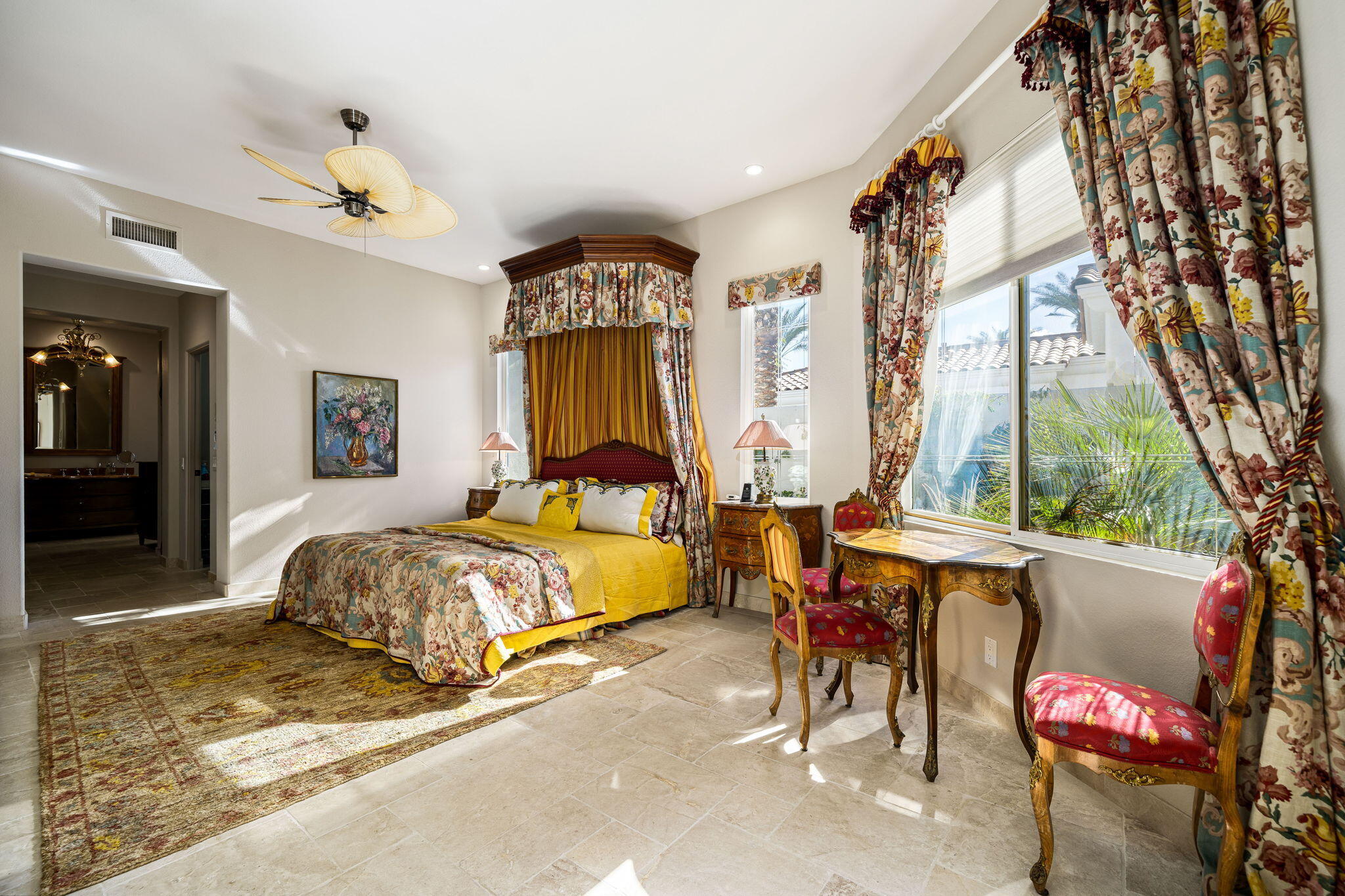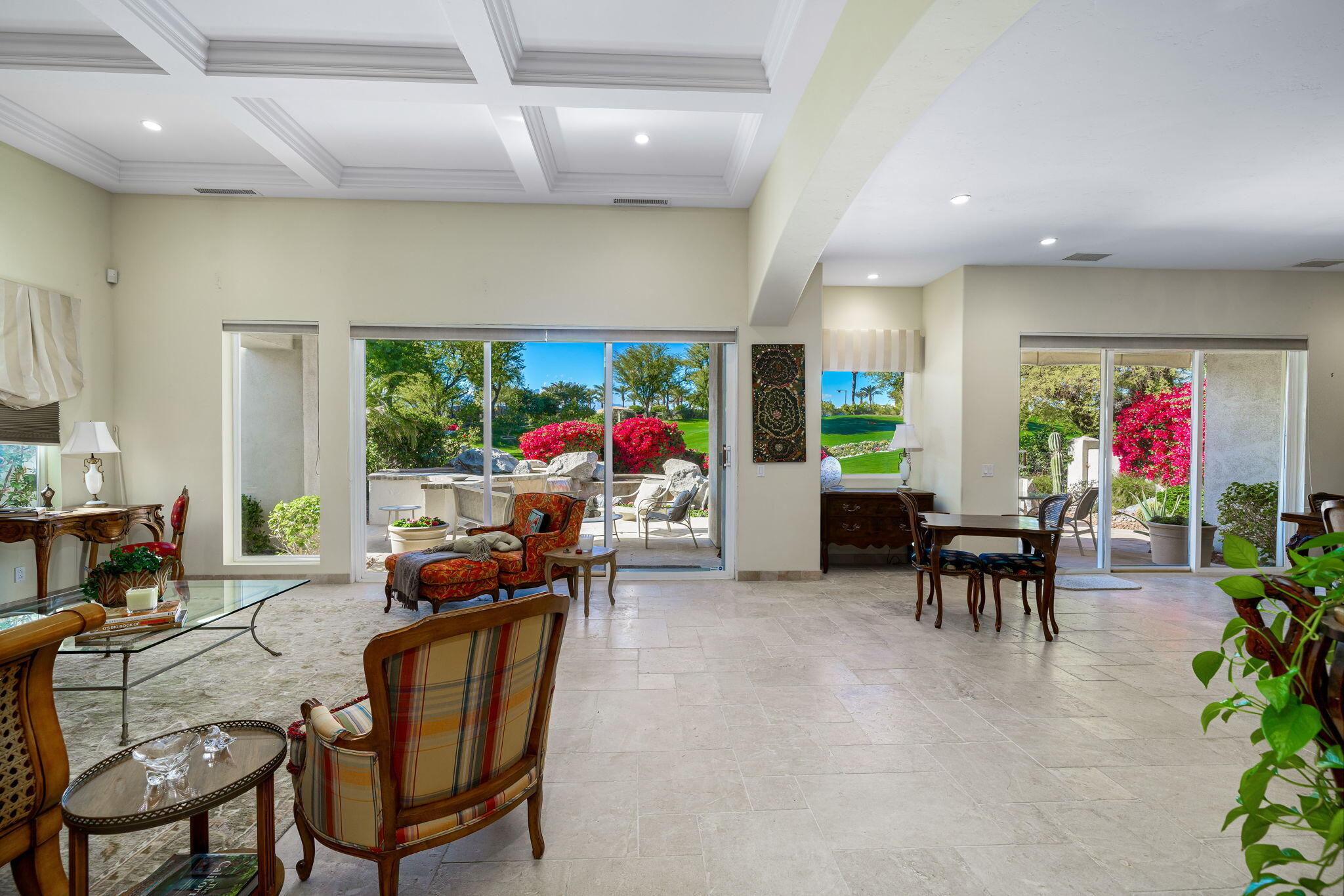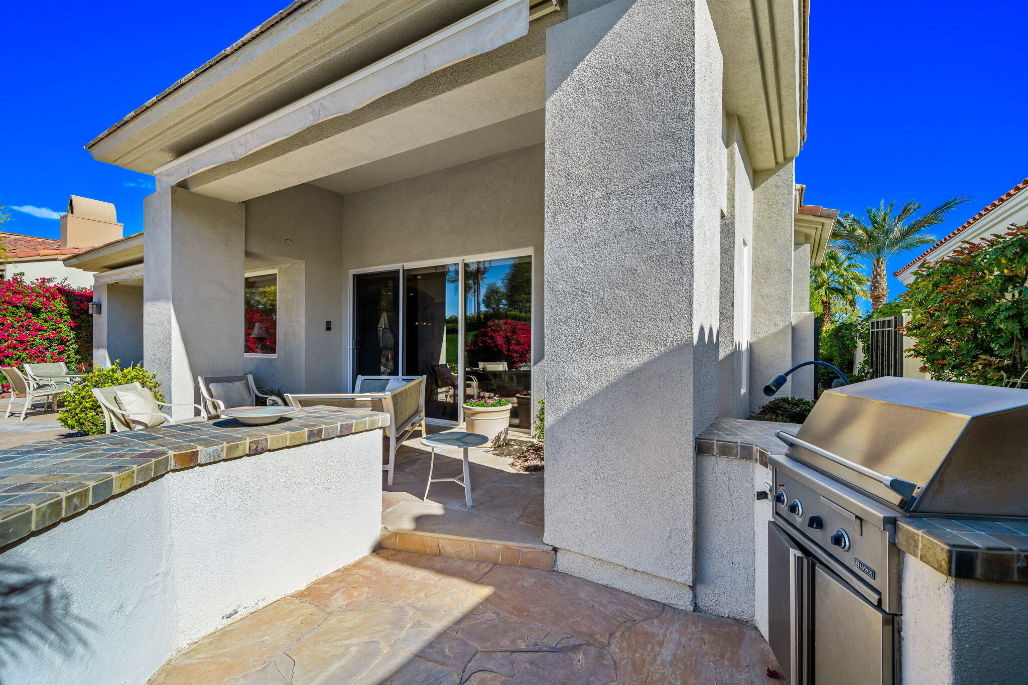 Elegant Spa Bougainvillea 2! Featuring 3 bedrooms & 3.5 bathrooms, with an open floor plan, this beautiful home has west views of the mountains and Grove #1. Offered furnished per inventory. Upon entering the foyer, there is a private den/library with built-ins. The living room, dining area, and open kitchen all have views of the patio pool area. The fairway patio is very private, offering several dining and lounging spaces, awnings, spa with water features and a built-in BBQ area. The kitchen feels like you are in Europe! Beautiful woodwork, a large island with seating, an enclosed pantry, and a gorgeous La Cornue CornuFe range! The large Primary suite features 2 closets (1 large walk-in) and a totally remodeled bathroom with a tub & open shower. There are 2 ensuite guest rooms - one is currently used as an office. Both en suite guest bathrooms have been updated. This home has a gated front courtyard and attached 2-car + golf cart garage. Close to the Clubhouse and all that Indian Ridge CC has to offer! Club Membership available to the Buyer with no wait!Interested in this Listing?