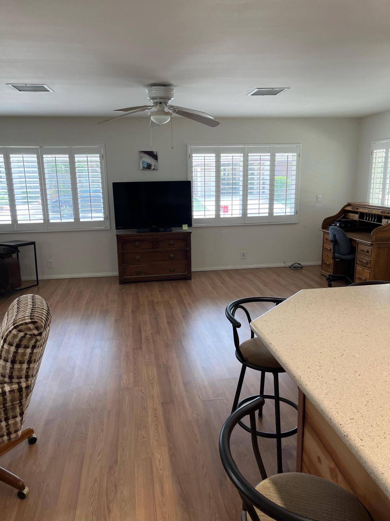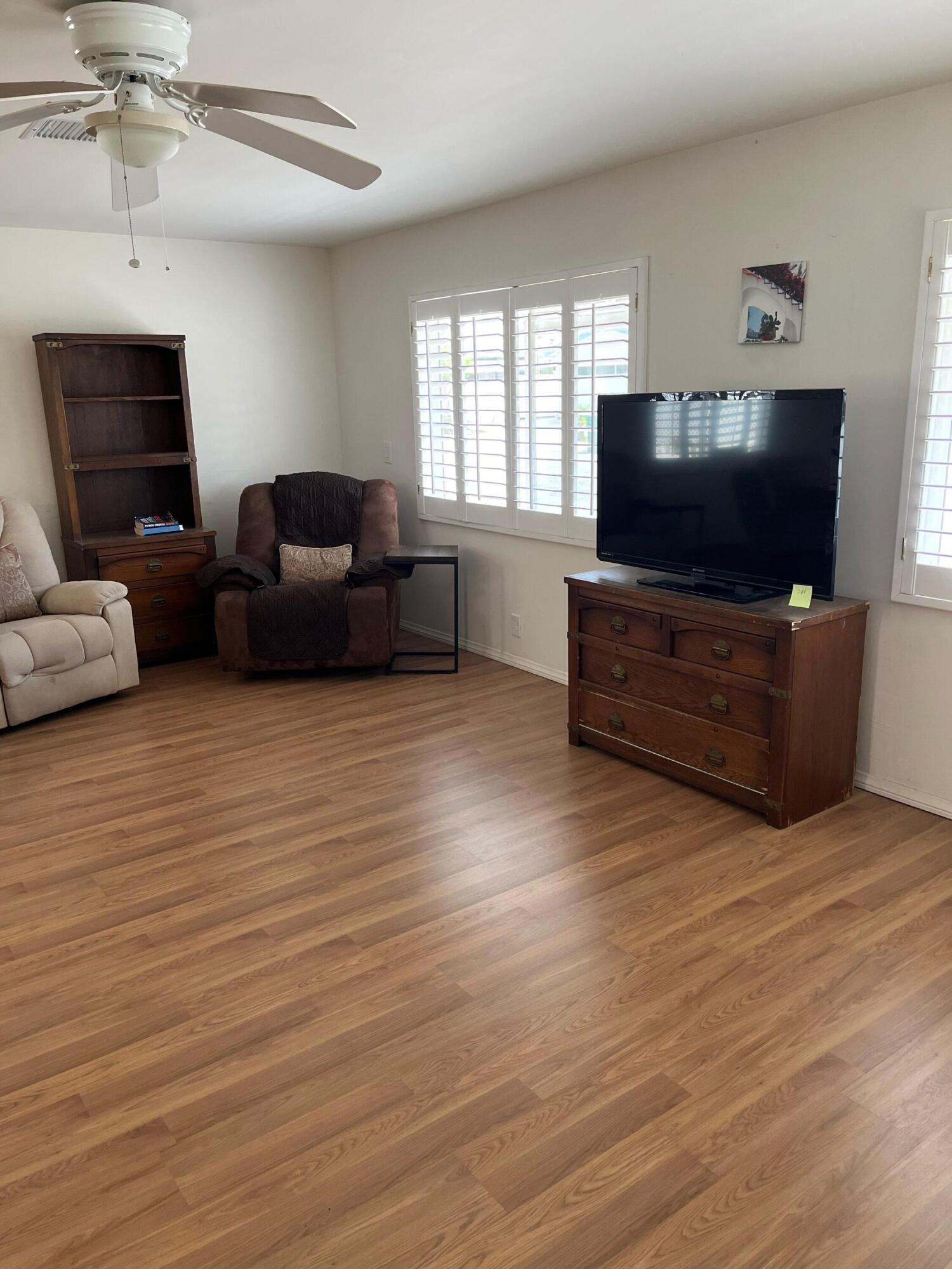 Looking for a nice quiet neighborhood with easy access to the back gate? This is it! With an open floor plan, this is a great home for entertaining family and friends. The living, dining, and family rooms are all conveniently located off the updated kitchen which has a large breakfast bar for cozy dining. The home is dry walled throughout, has plantation shutters and laminate floors in living, dining, and family rooms. The guest bathroom has recently been remodeled with a large walk in tile shower. The master bedroom is spacious with a walk-in closet. The master bath has a newly installed walk-in tub with an overhead shower head and jets for a great relaxing bath. Both the hot water heater and air conditioner have been recently replaced for more efficient energy along with a rooftop evaporative cooling system. The home comes with a golf cart and an insulated, air conditioned shed. There is carport parking for one with an additional driveway for two, tandem style. The current HOA fees of $400 include FREE golf, trash, cable TV, internet, guarded gate and roaming patrols. Our community has a beautiful clubhouse, banquet facilities, pools, fitness center, sport courts and numerous social clubs available.Interested in this Listing?