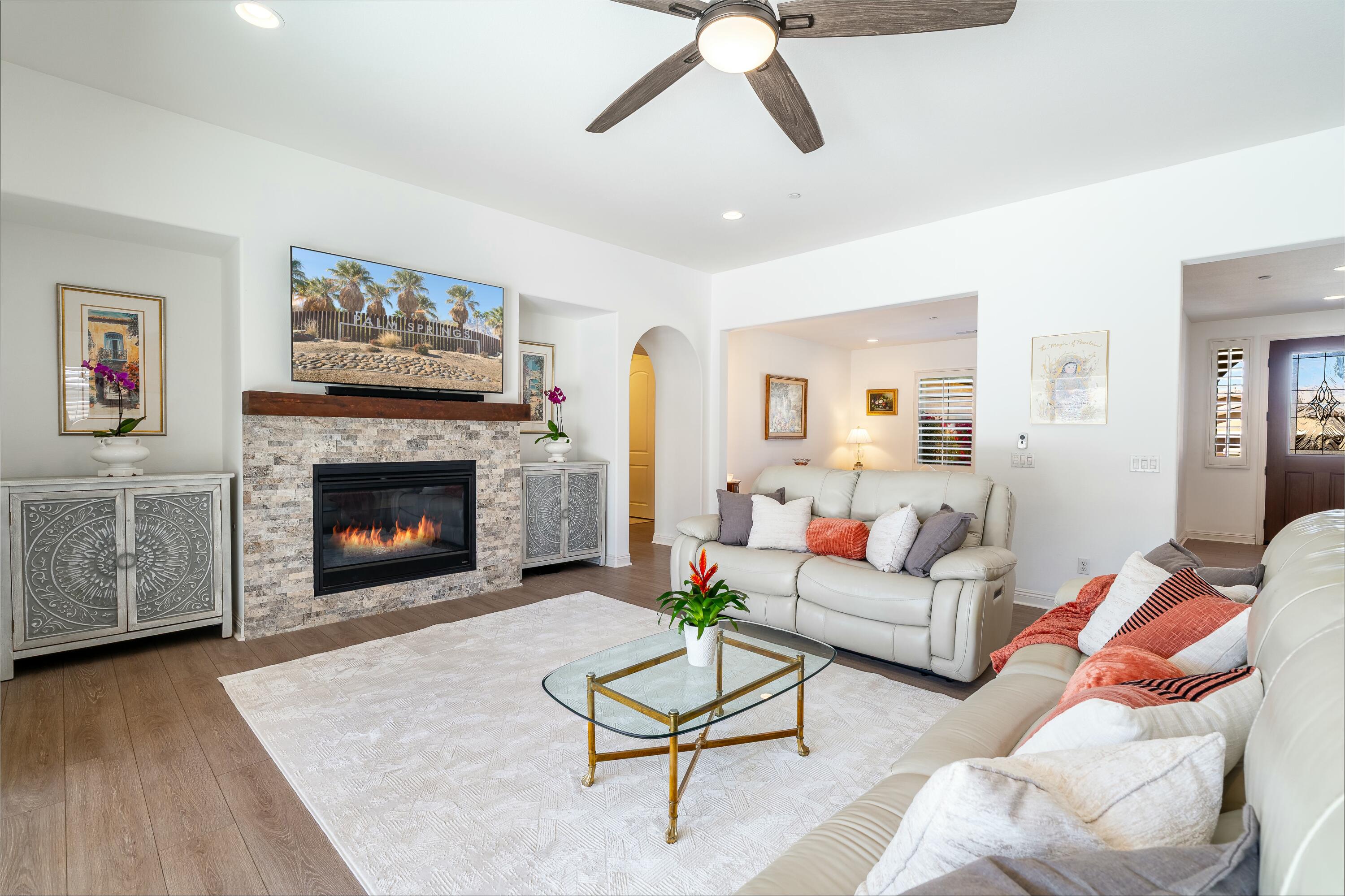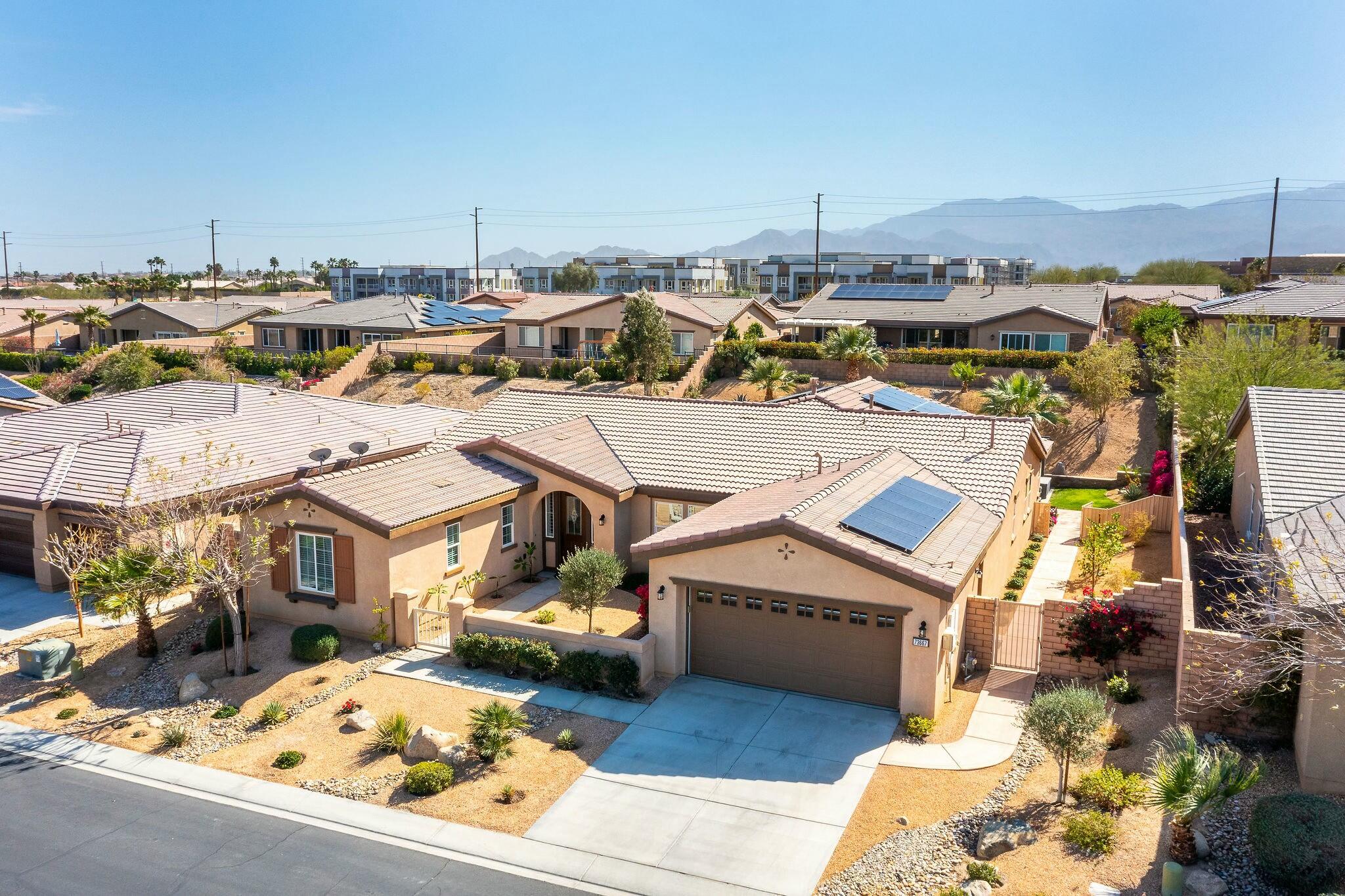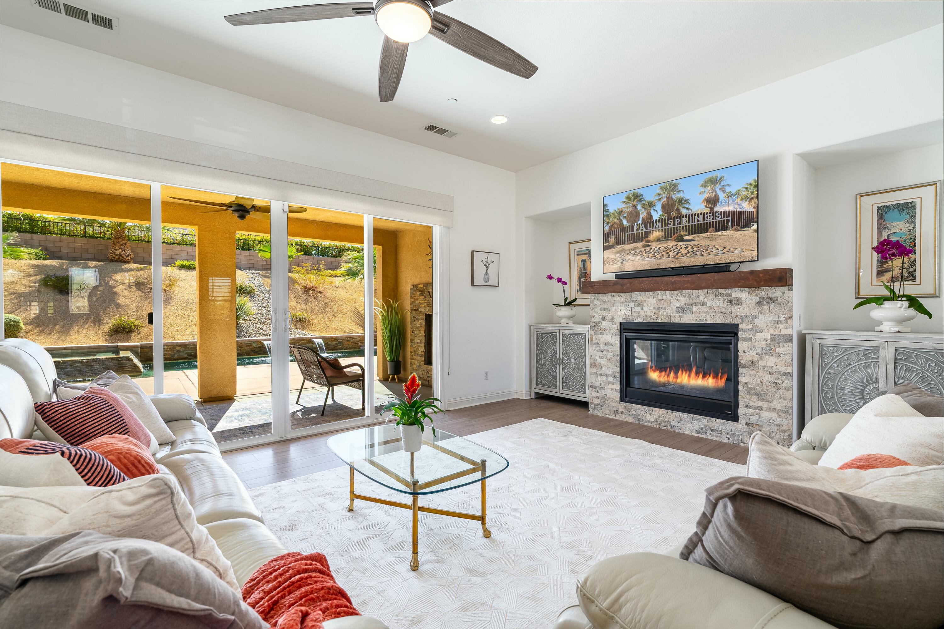 PRICE IMPROVEMENT! Located in the highly desirable community of The Gallery, this stunning home is centrally situated in Palm Desert, just minutes from El Paseo, premier shopping, dining, entertainment, and the highly anticipated Disney Cotino neighborhood.Nestled on an oversized lot, the backyard is a true oasis, featuring a Pebble Tec saltwater pool, a misting system, a spacious outdoor patio, and a cozy outdoor fireplace, perfect for entertaining or unwinding under the desert sky. OWNED solar panels provide energy efficiency and savings.Inside, the home showcases plantation shutters, new flooring, a whole-home water softener, and a custom front door, along with many other thoughtful upgrades that highlight true pride of ownership.Furnishings are negotiable to help ensuring an effortless transition. Plus, enjoy low HOA dues, which include cable and internet.Don't miss this incredible opportunity--schedule your showing today!Interested in this Listing?