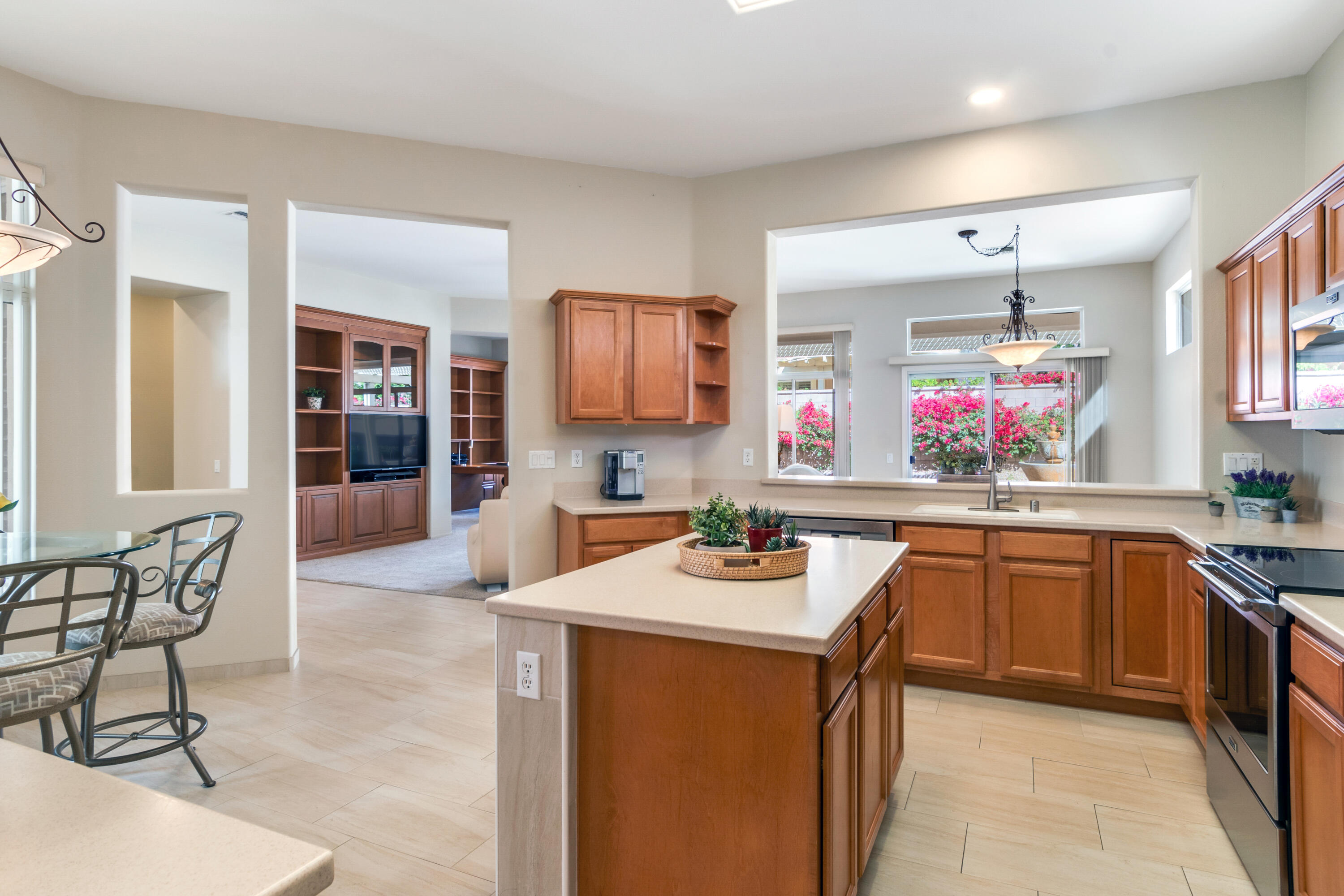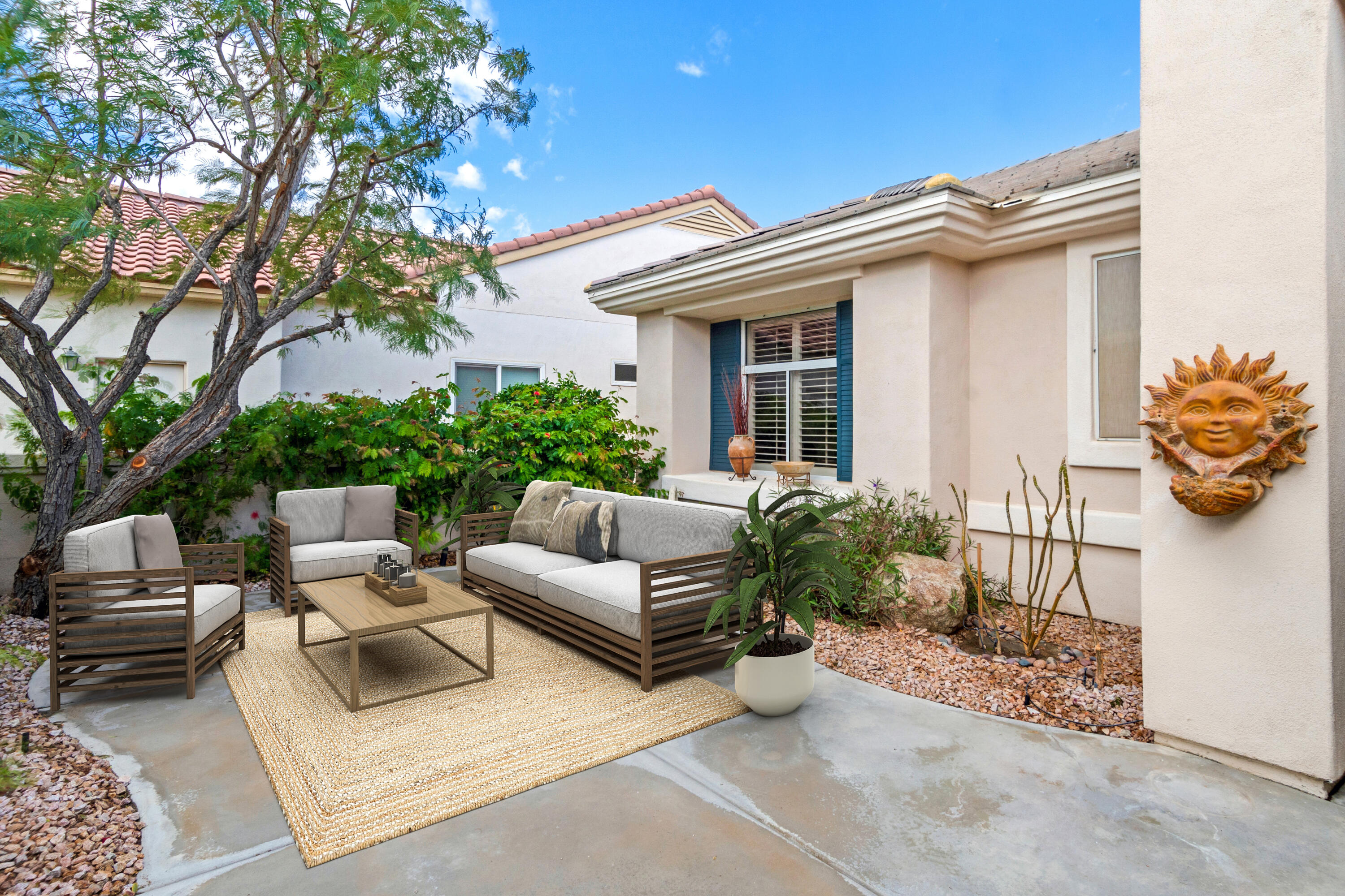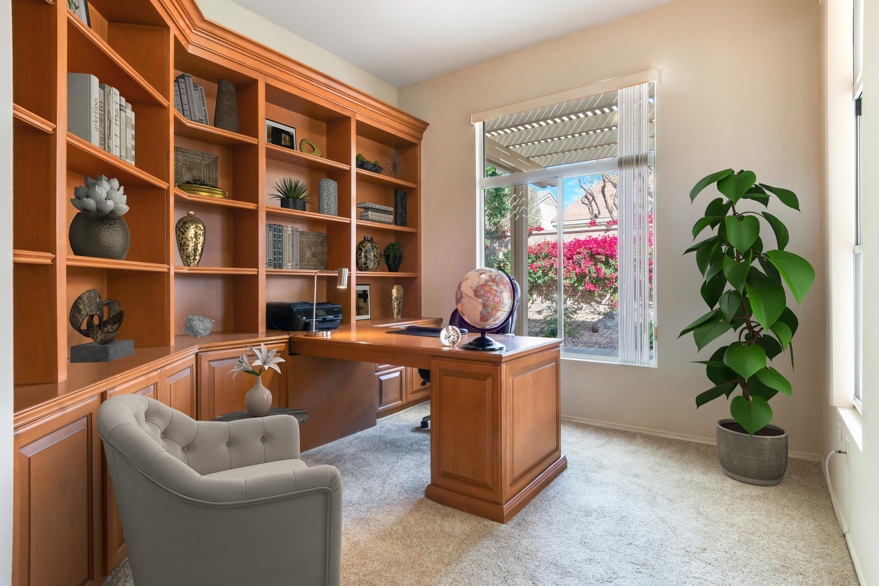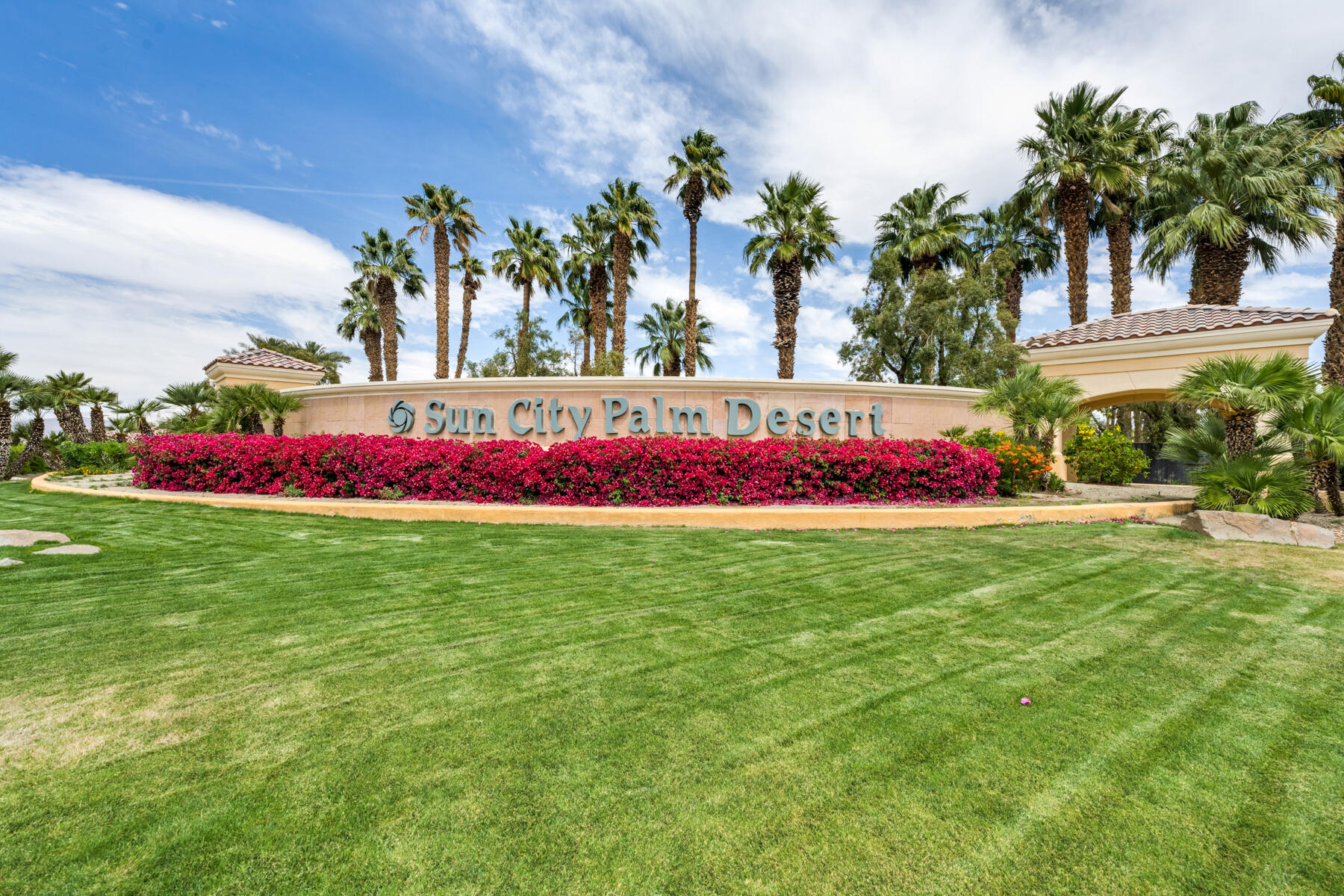 Sun City Palm Desert - Morocco. This popular great room, 2 bedroom, 2 bath plus den home features a north facing backyard with a spacious patio and an Aluma-wood cover. A private gated front courtyard provides a large south facing patio. Inside, 10ft ceilings and transom windows allows indirect natural light. The den has a built-in desk and cabinetry. The kitchen has Corian counters, new stainless appliances and a chef's island. Maple cabinetry adorns the kitchen, linen and bathrooms. Double doors lead to the primary suite with a bay window and a walk-in closet. The primary bath has dual sinks and a beautifully custom tiled shower. The indoor laundry room has a utility sink. The extended 2 car garage has a nook for golf cart parking. HVAC 2015.Interested in this Listing?